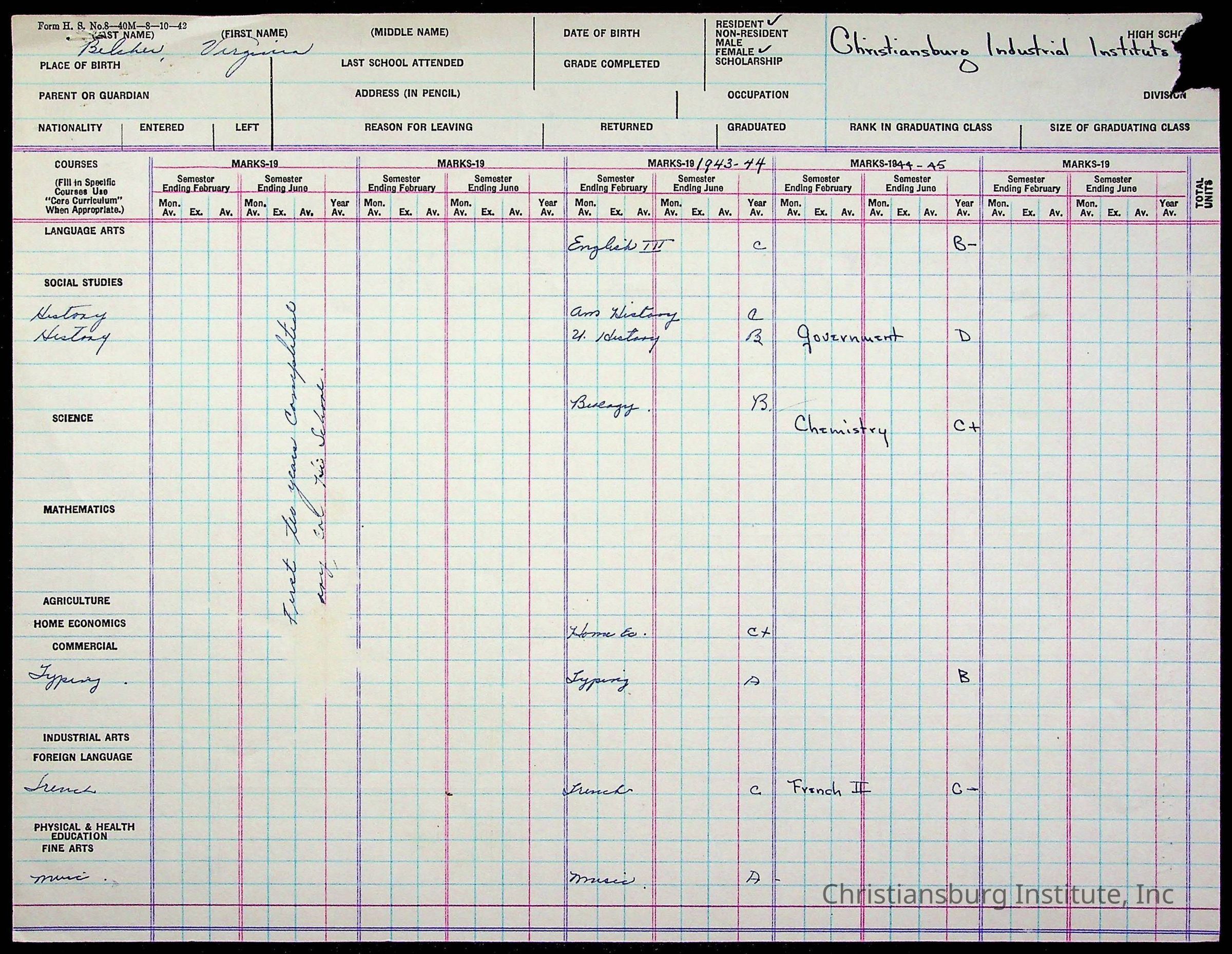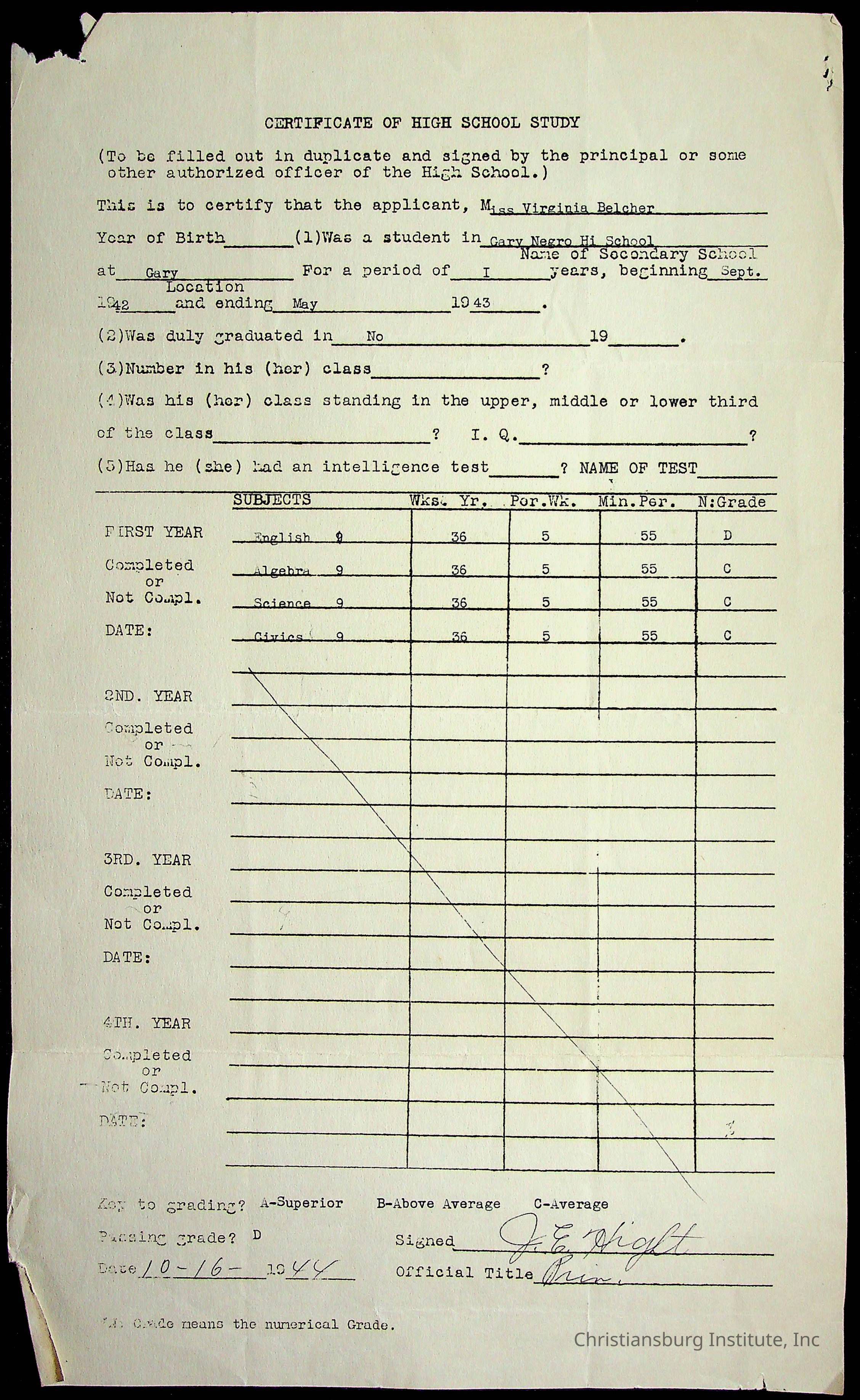 The student file for the Christiansburg Institute student, Virginia Belcher circa 1940s.