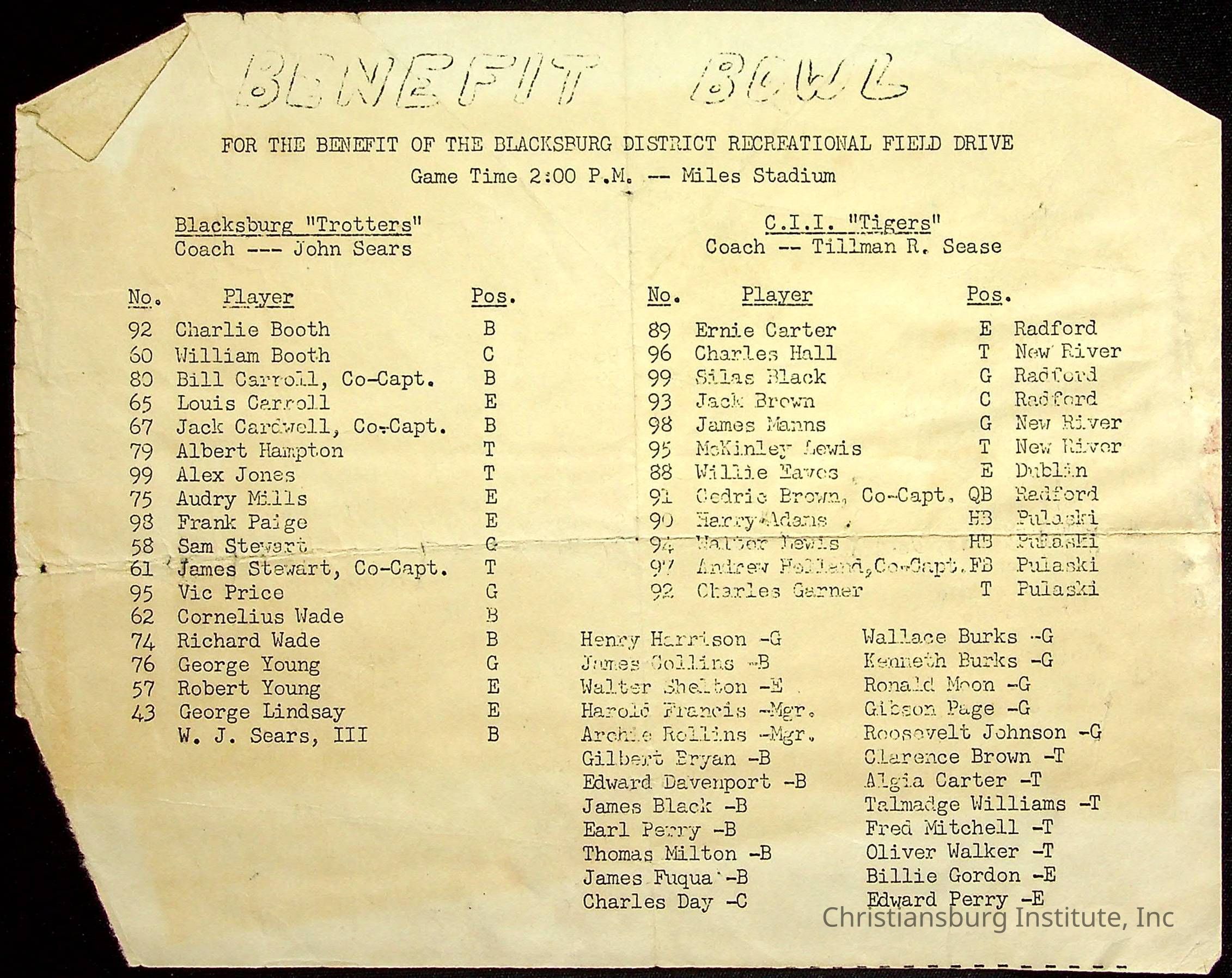 An event flyer for the Benefit Bowl for the benefit of the Blacksburg District recreational field drive, a game between the Blacksburg Trotters and the Christiansburg Industrial Institute Tigers at Miles Stadium, undated.Subjects
