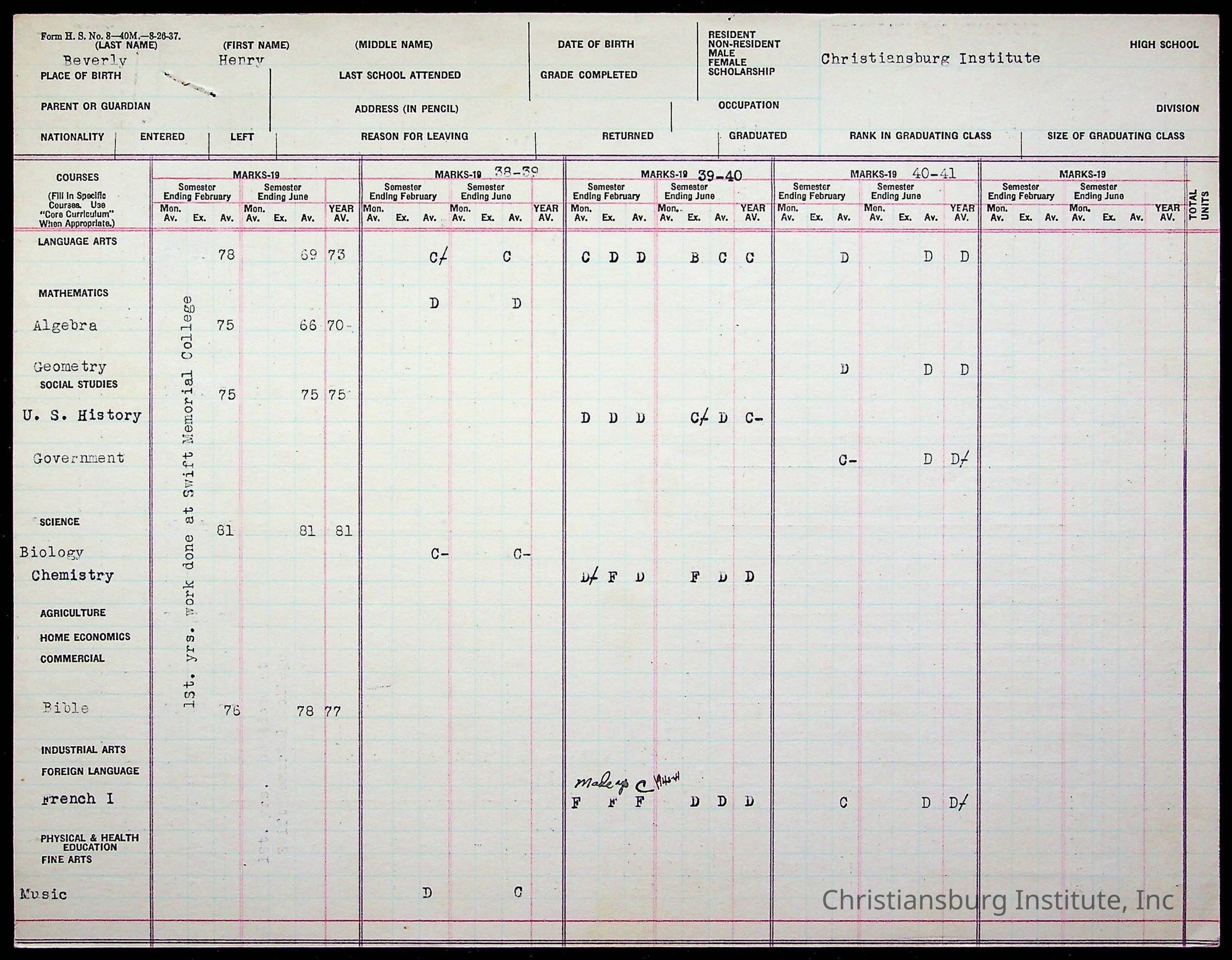 The student file for the Christiansburg Institute student, Henry Beverly circa 1940s.