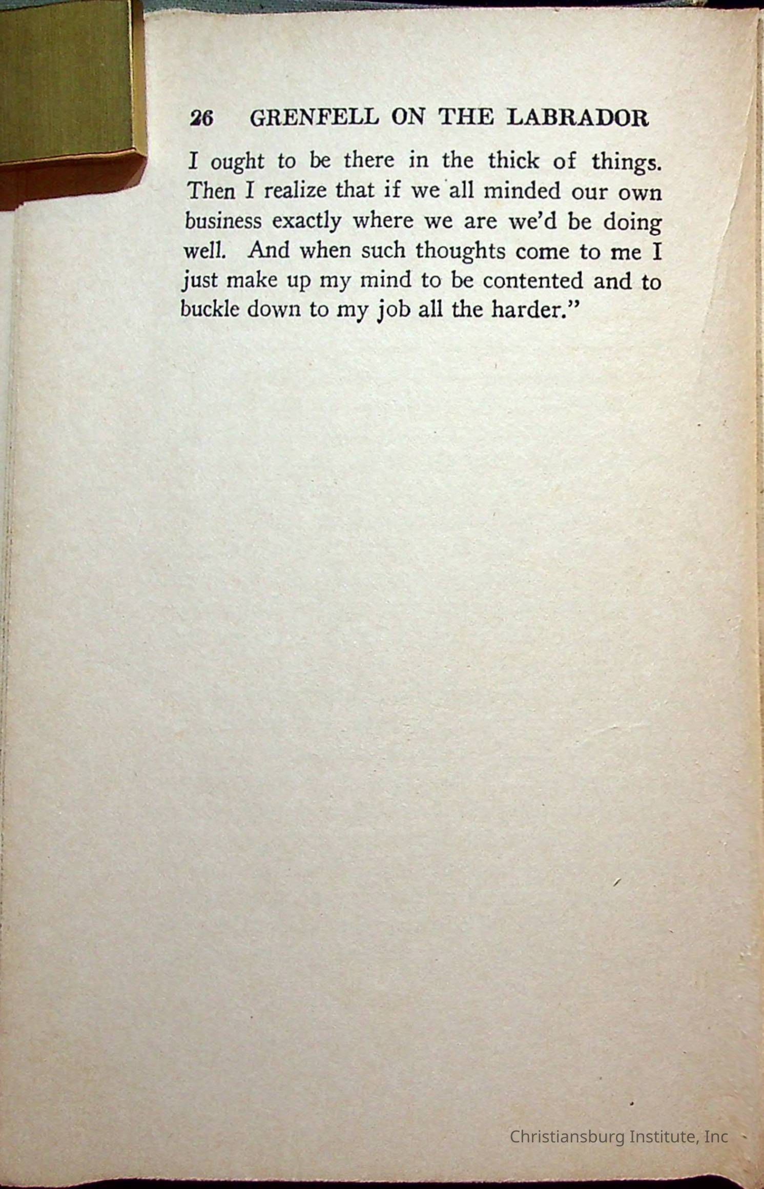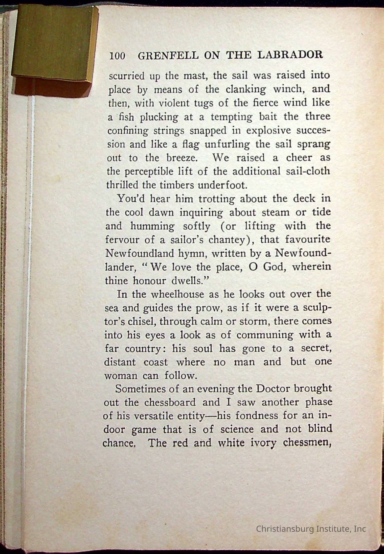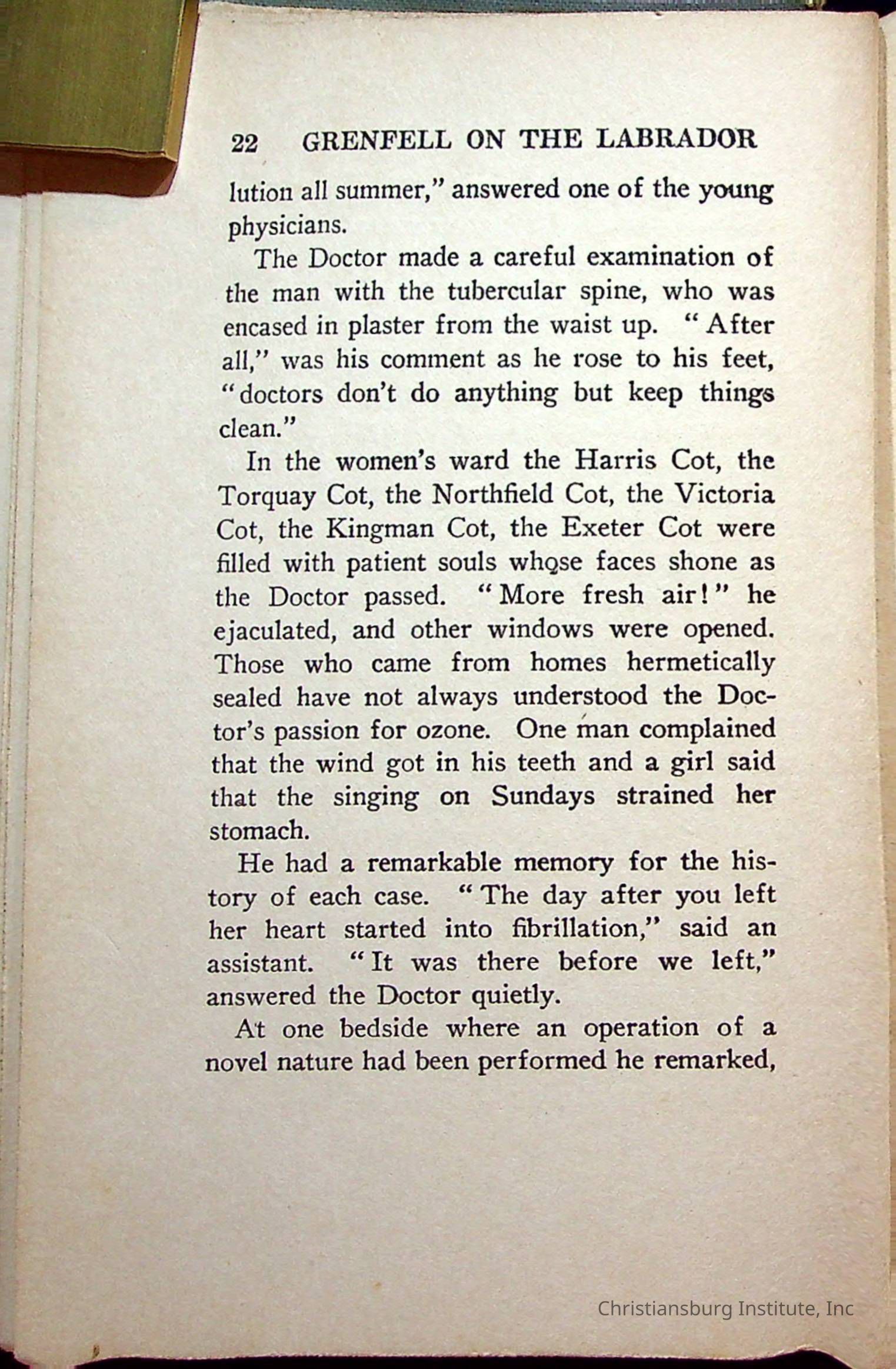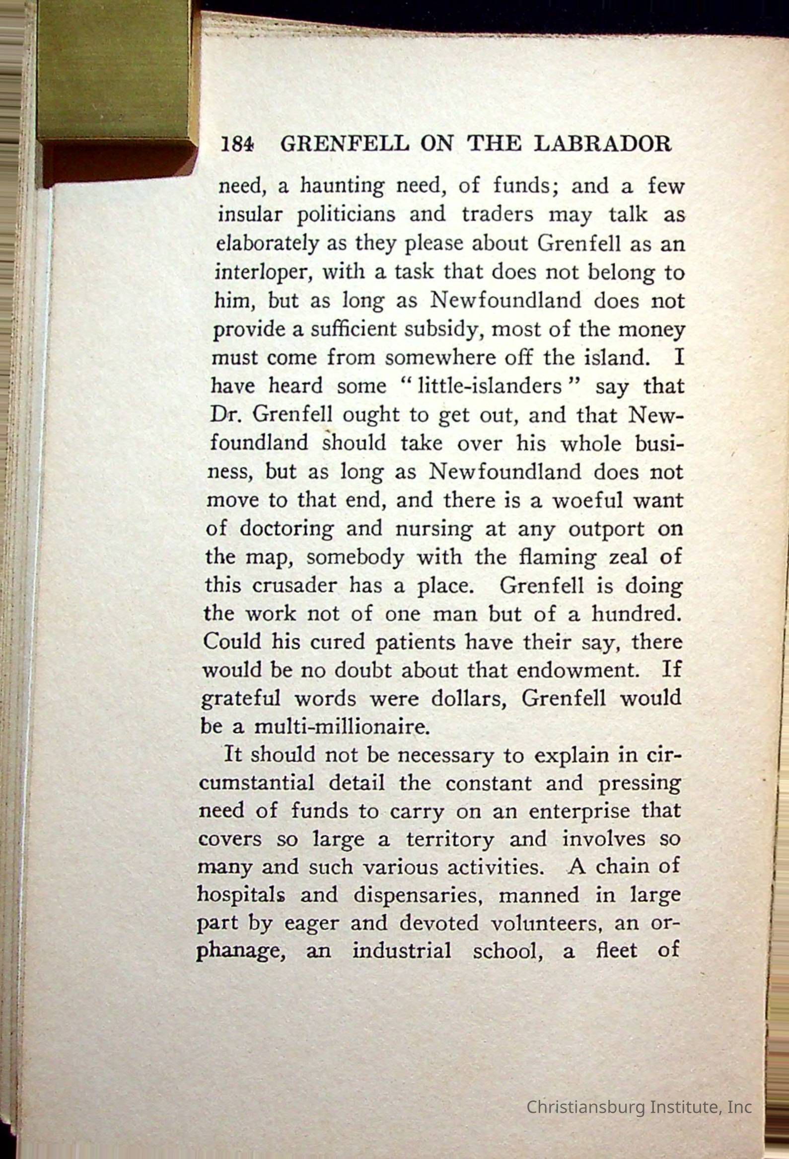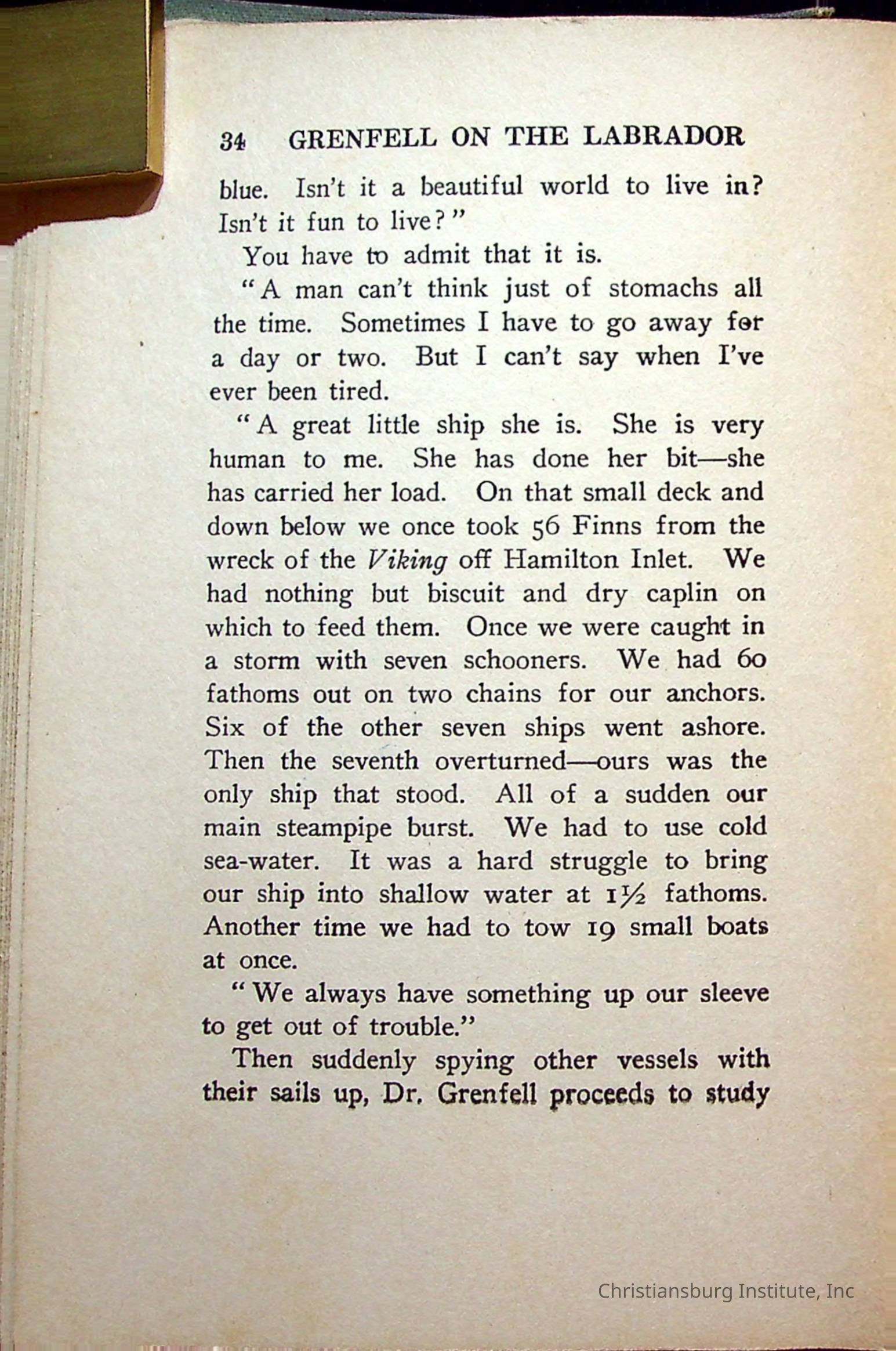 "With Grenfell on The Labrador" written by Fullerton L. Waldo and published by the Fleming H. Revell Company in the year 1920. The book was in the Christiansburg Institute library.