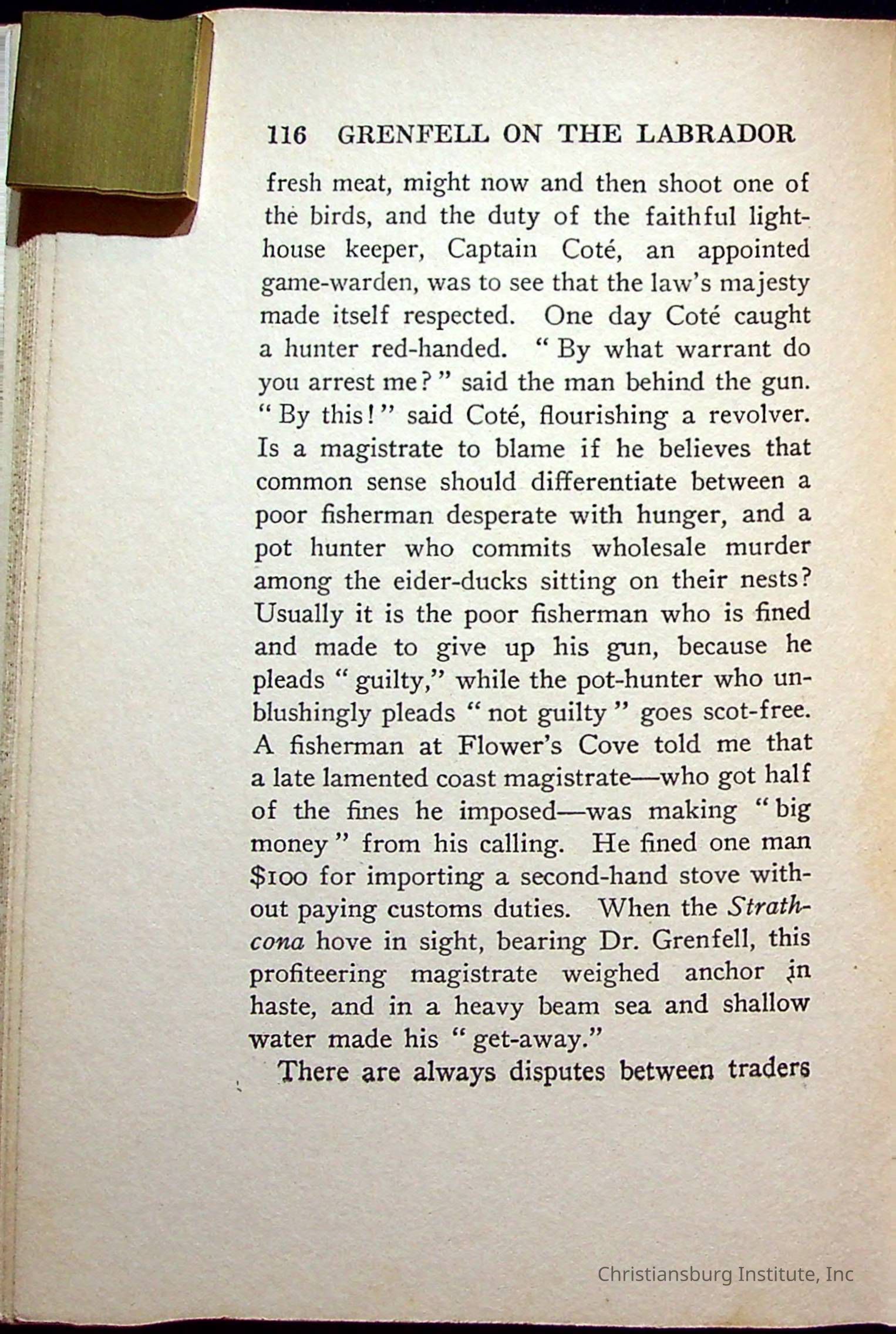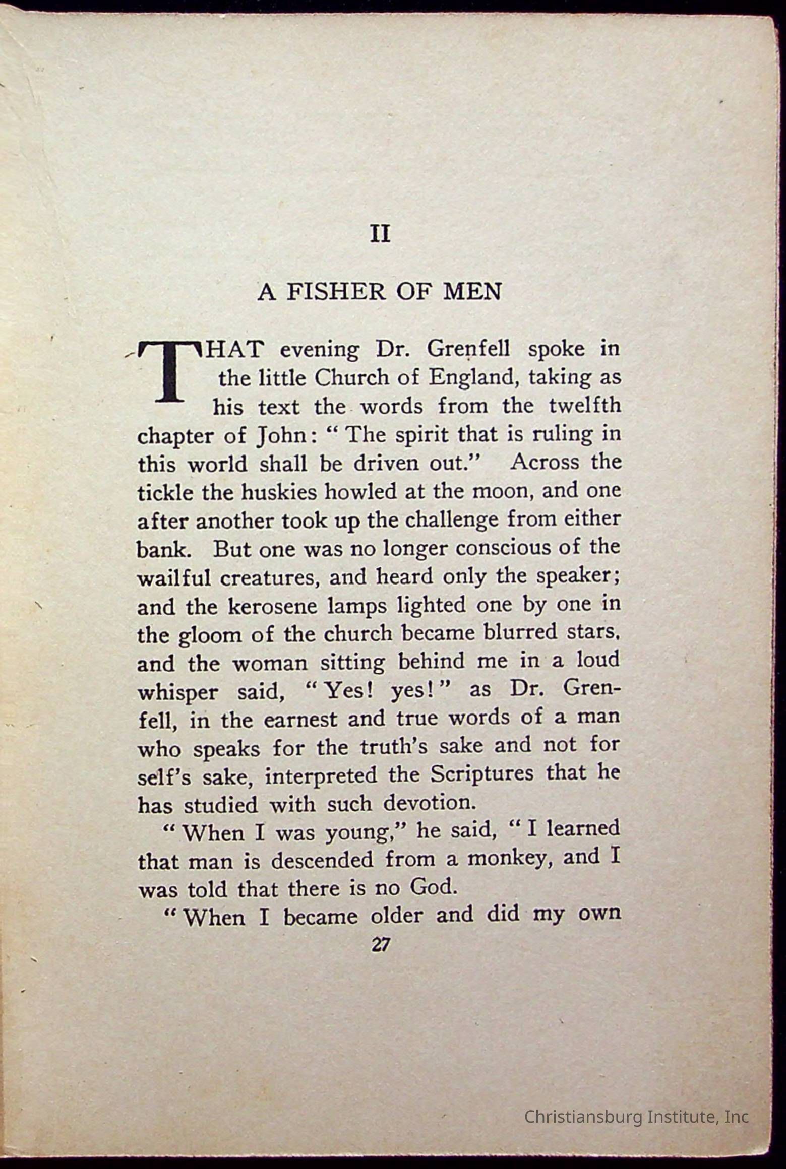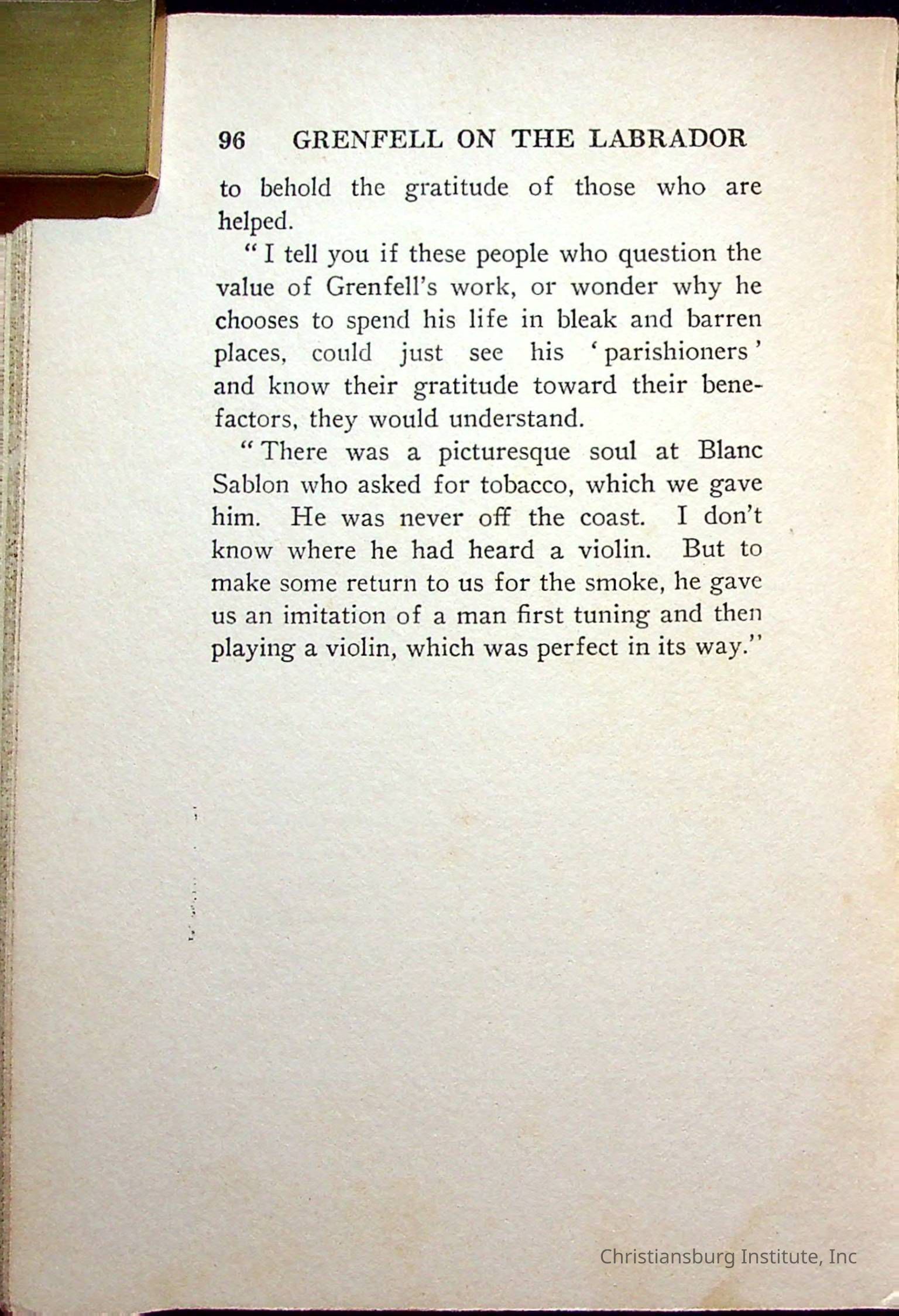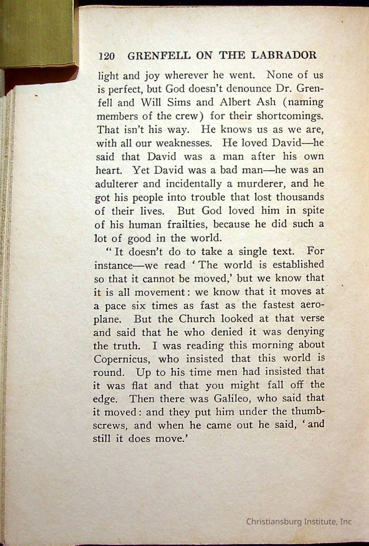 "With Grenfell on The Labrador" written by Fullerton L. Waldo and published by the Fleming H. Revell Company in the year 1920. The book was in the Christiansburg Institute library.