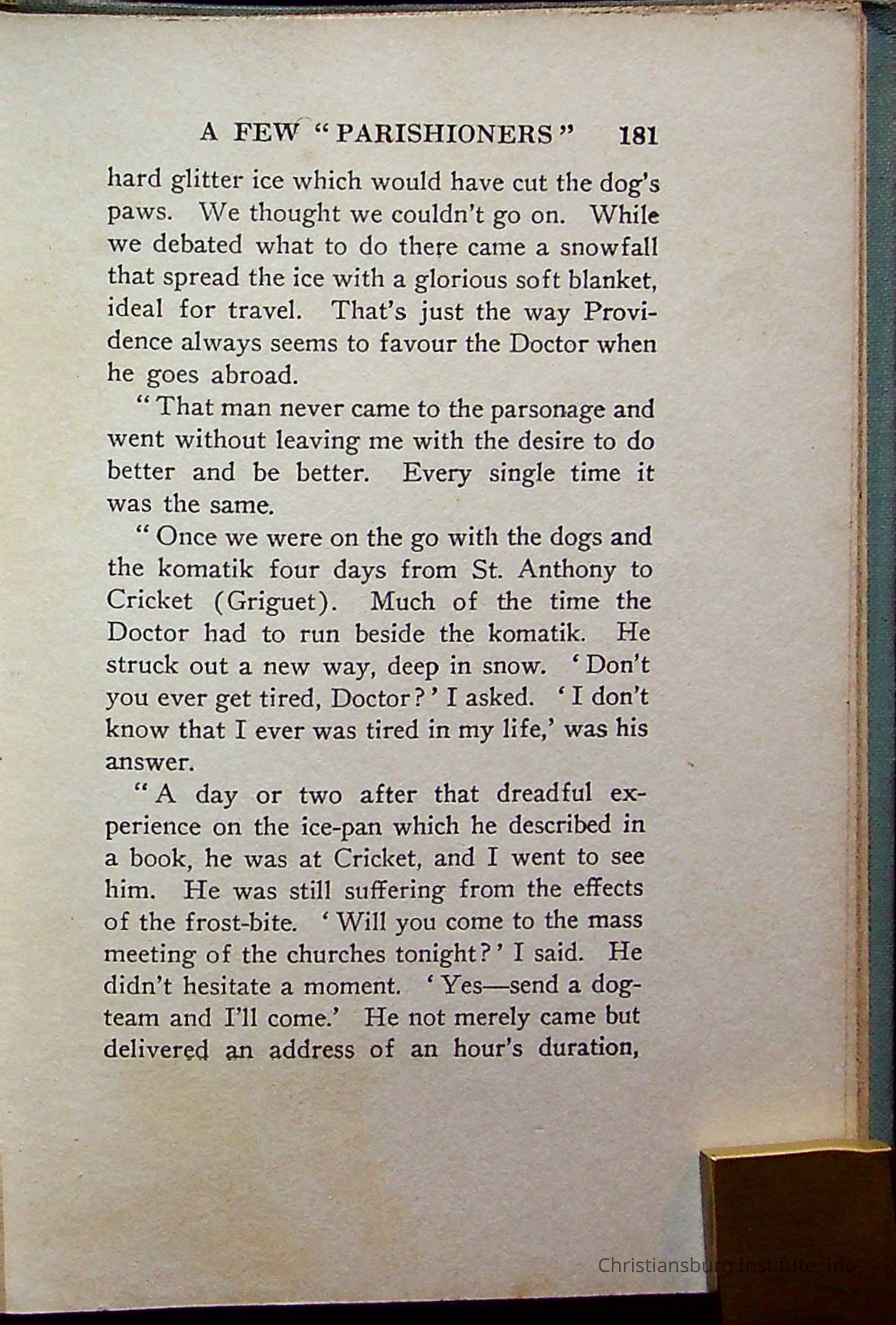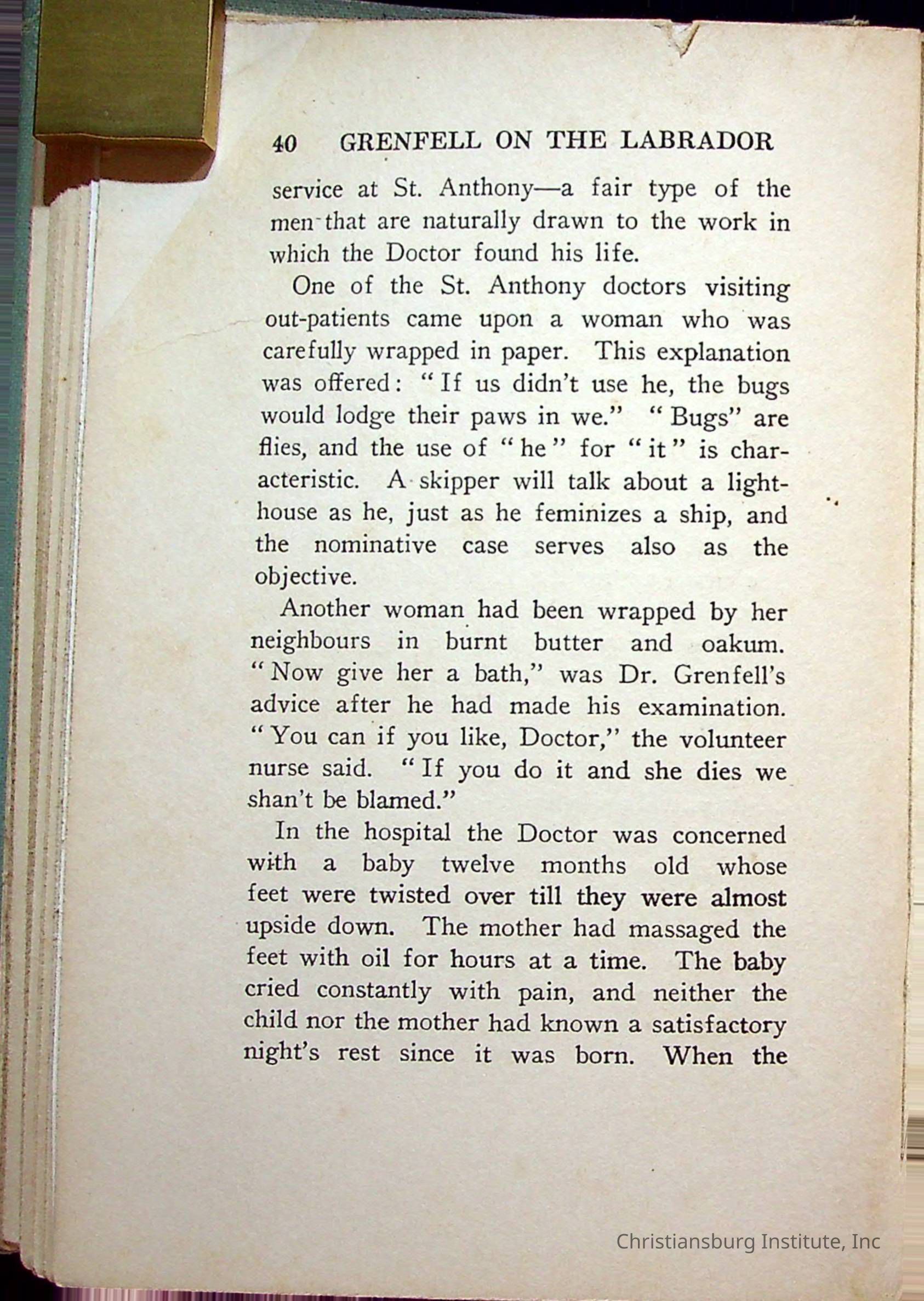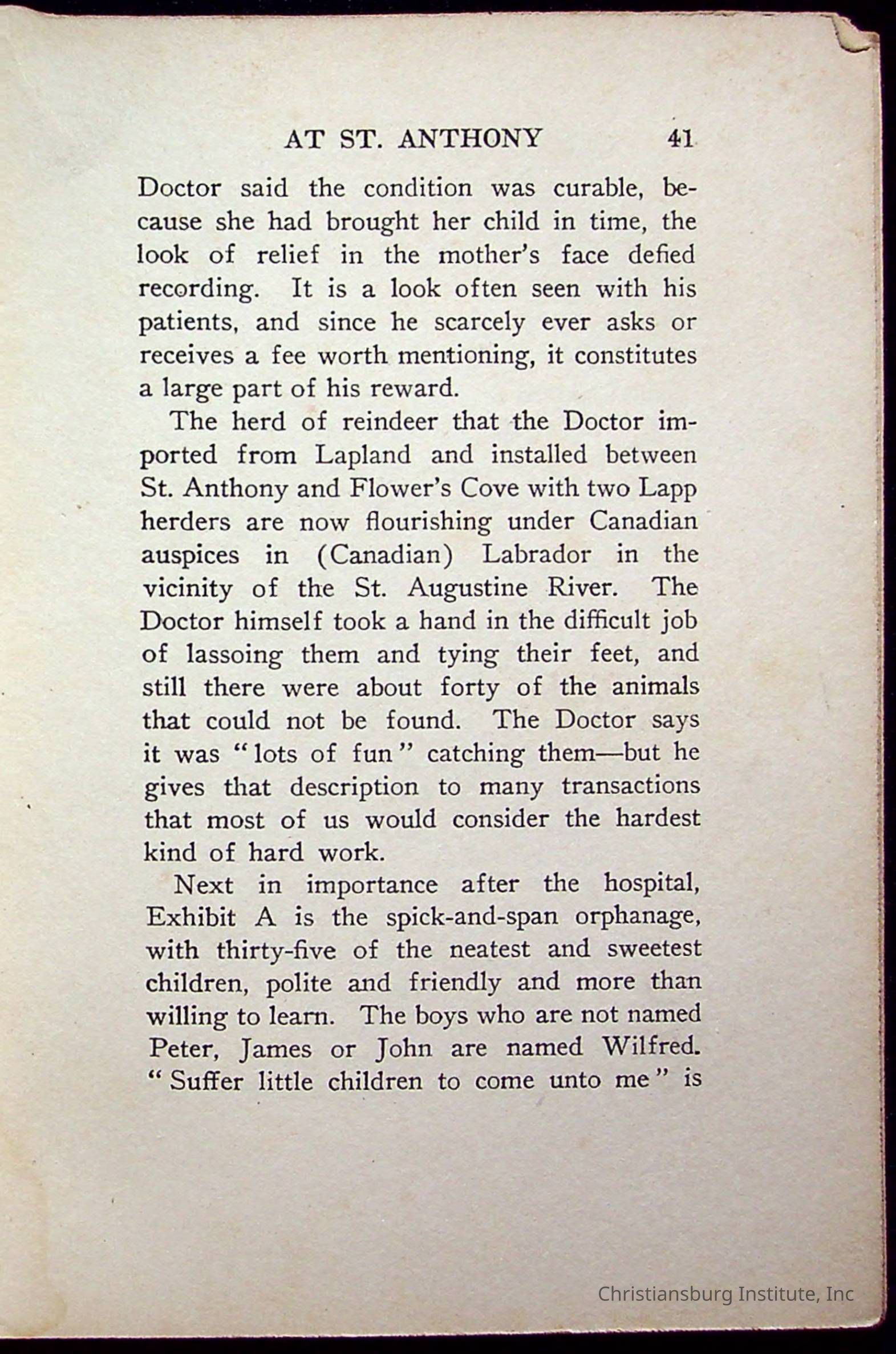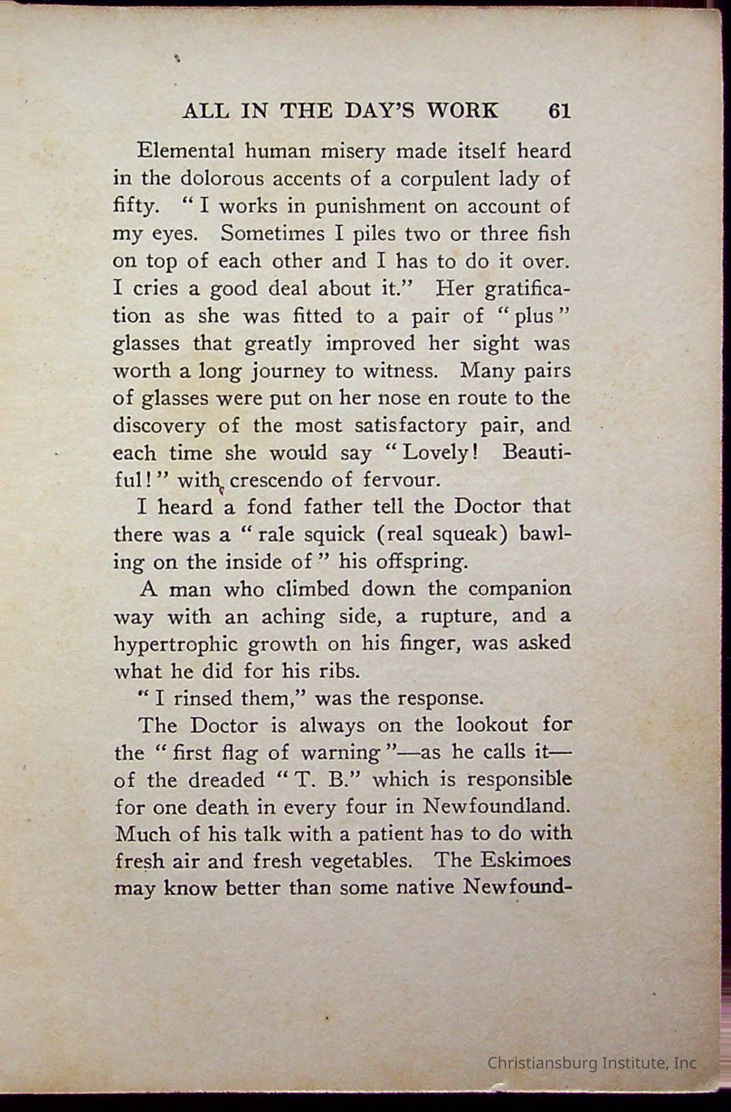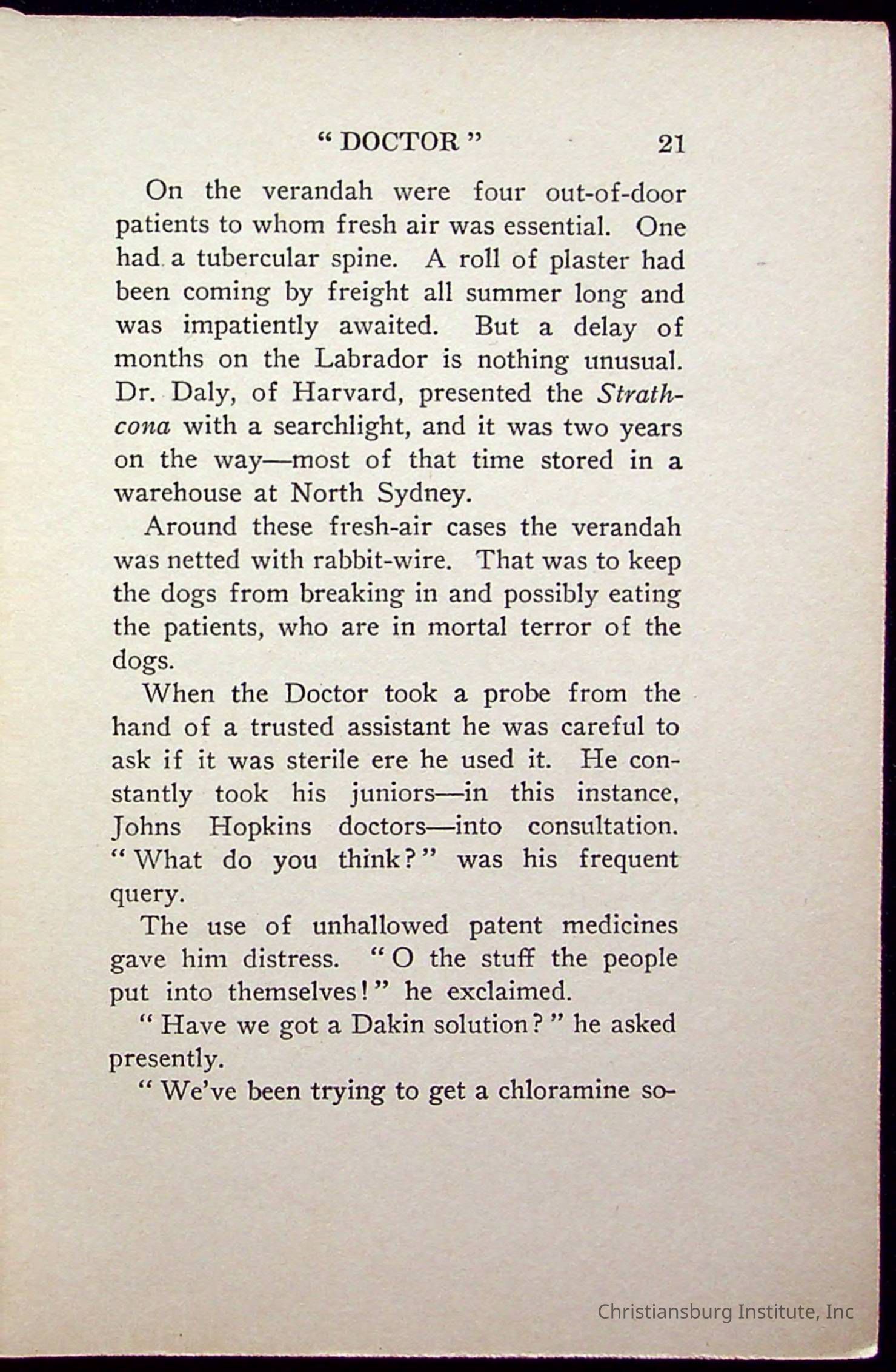 "With Grenfell on The Labrador" written by Fullerton L. Waldo and published by the Fleming H. Revell Company in the year 1920. The book was in the Christiansburg Institute library.