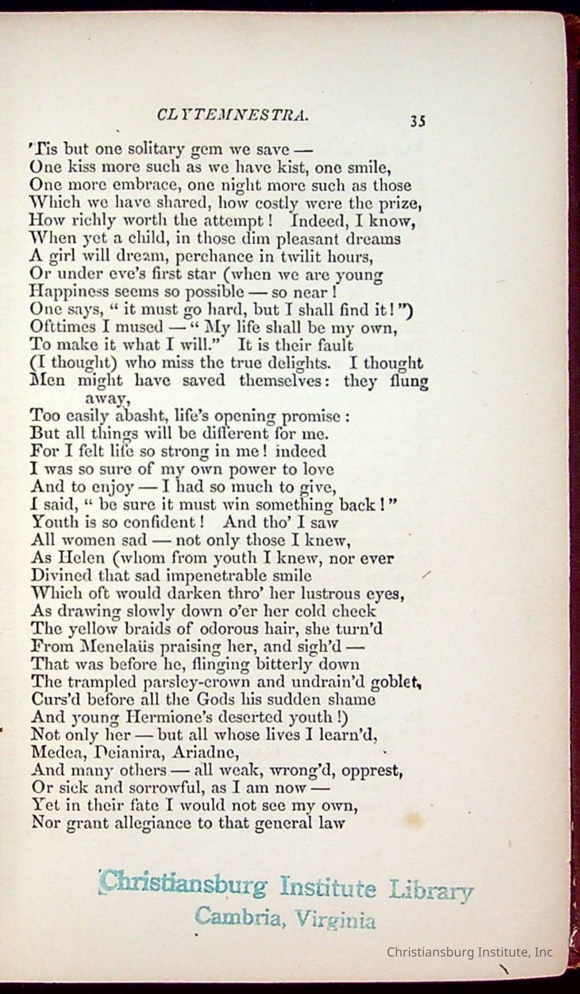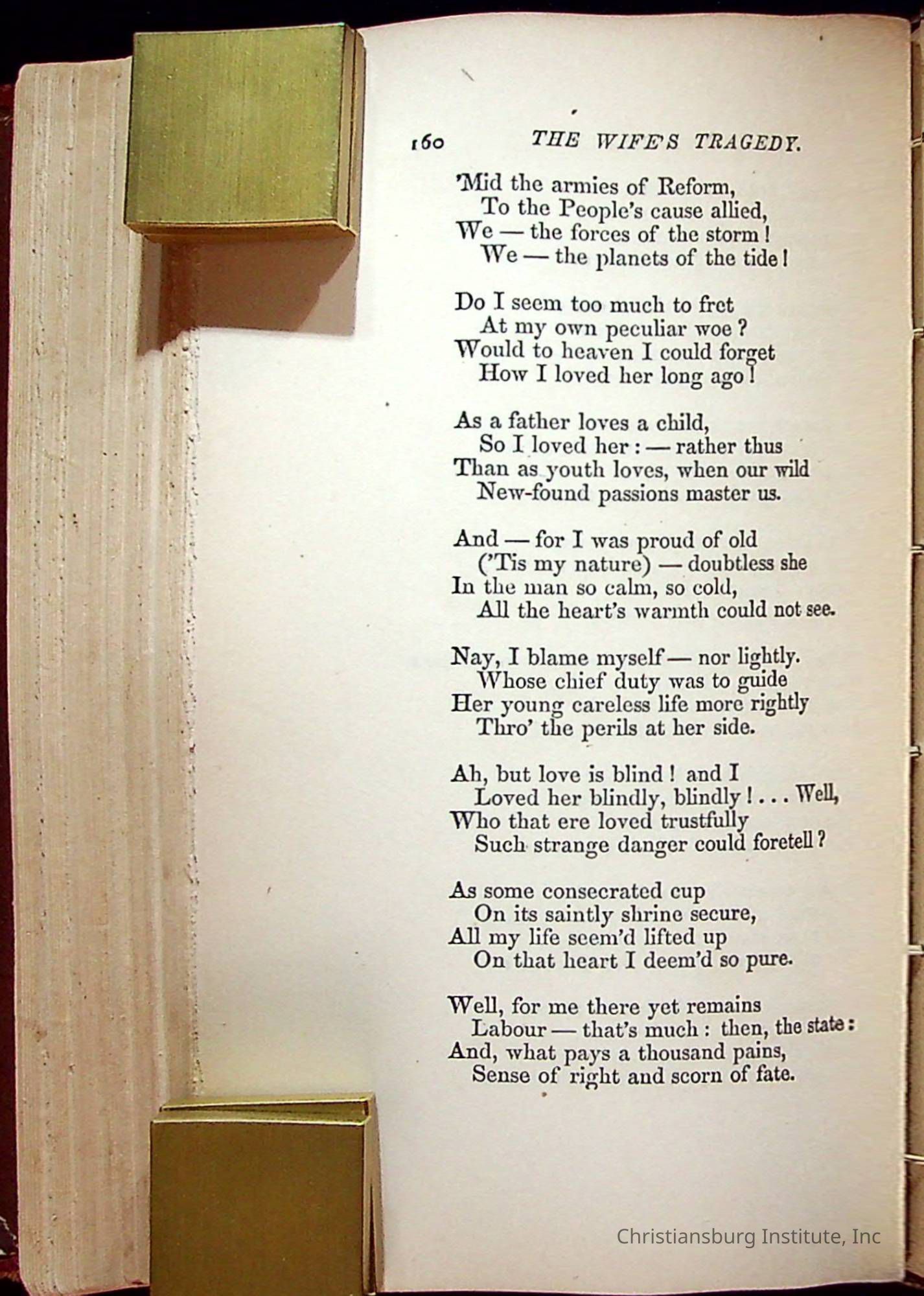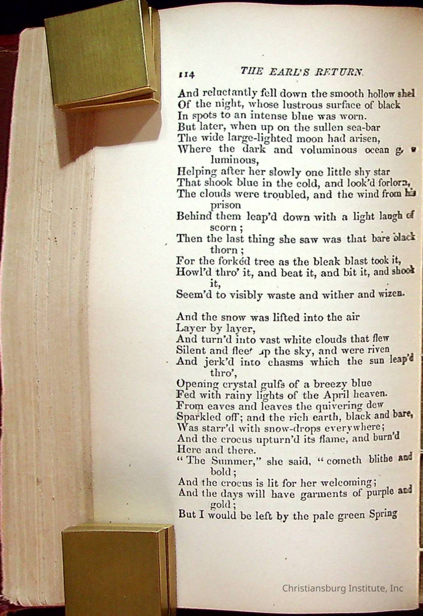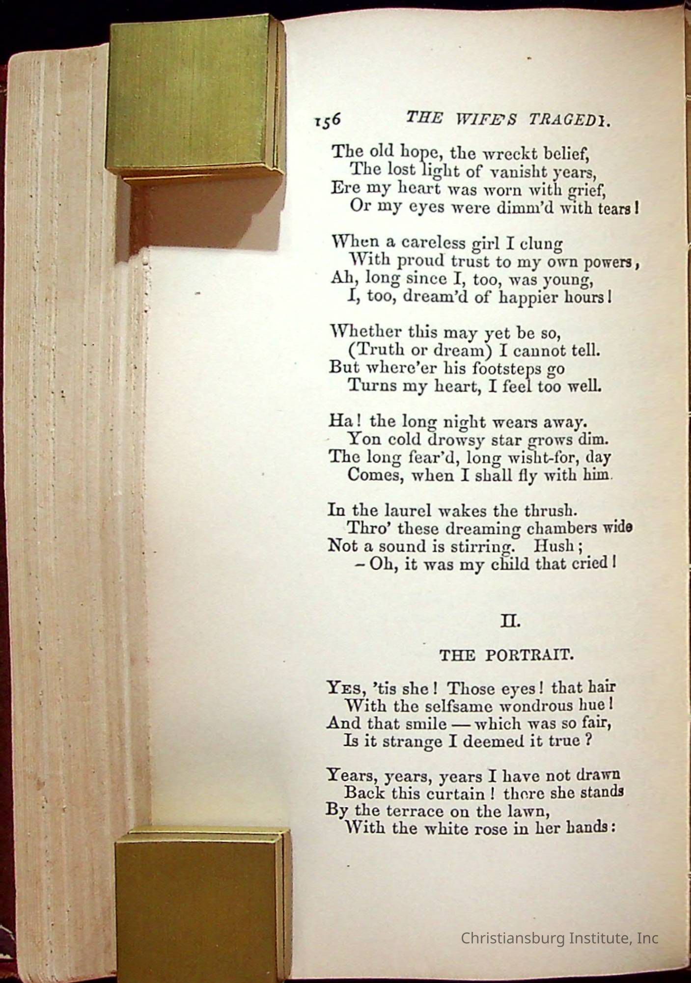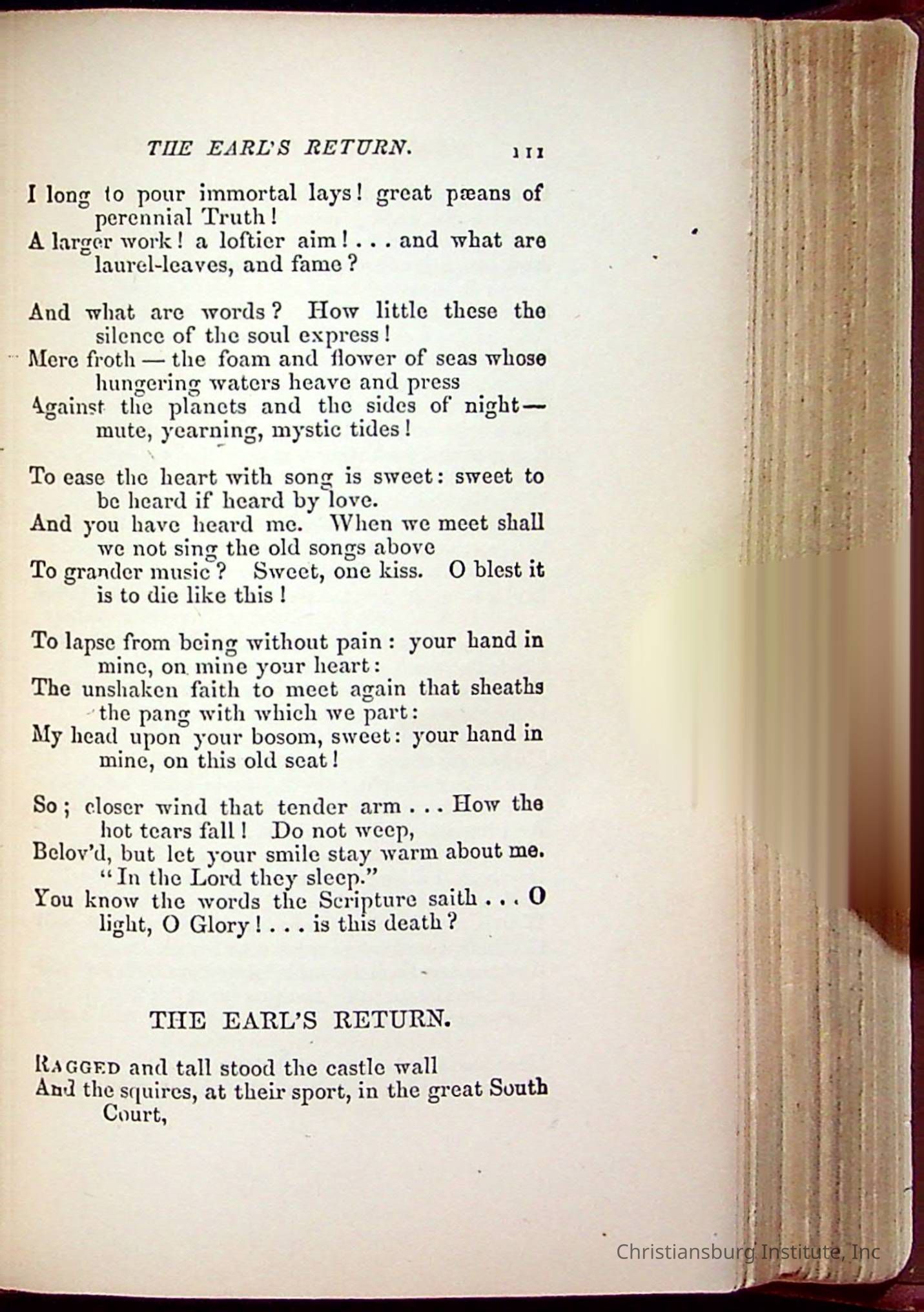 "Poems" written by Owen Meredith and published by James R. Osgood and Company in the year 1875. This book was in the Christiansburg Institute library.