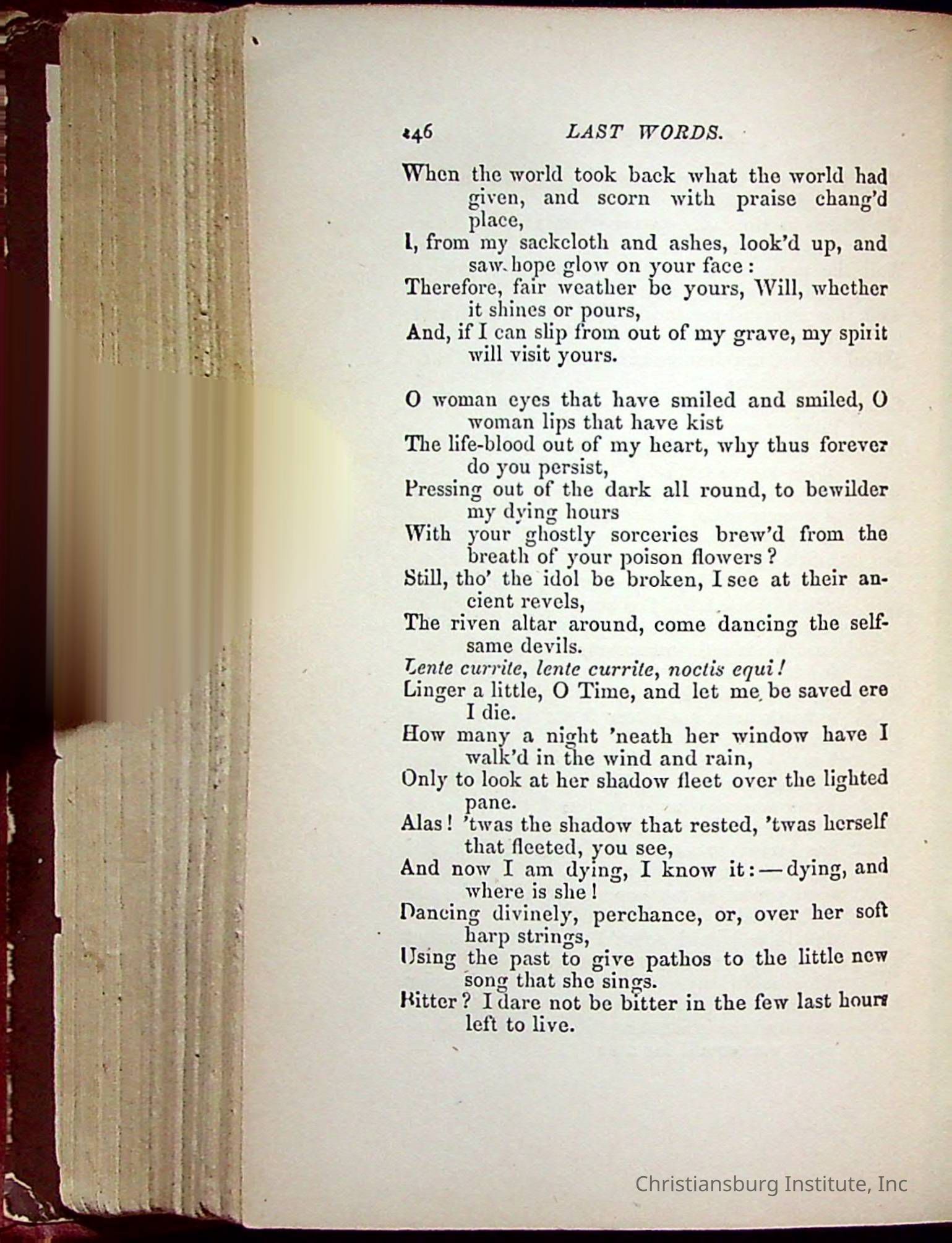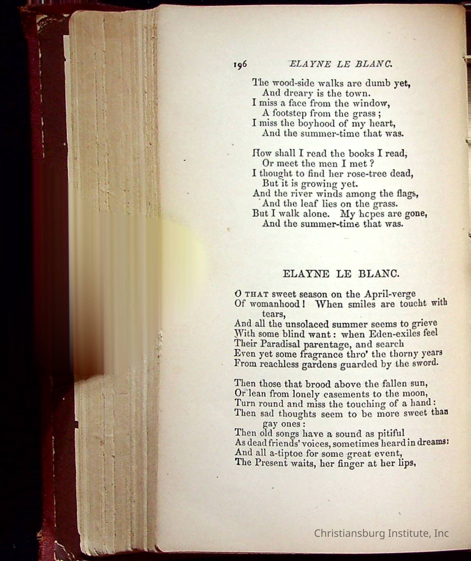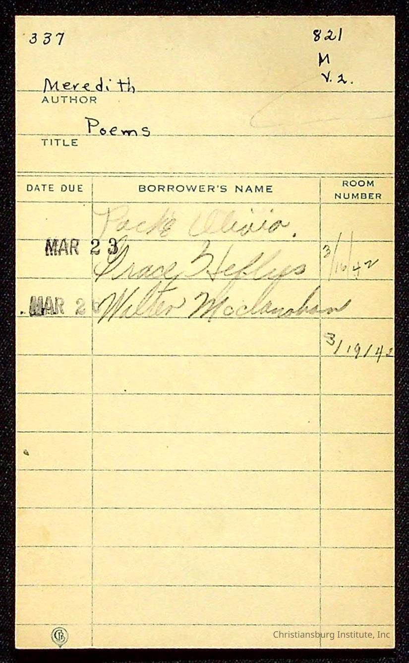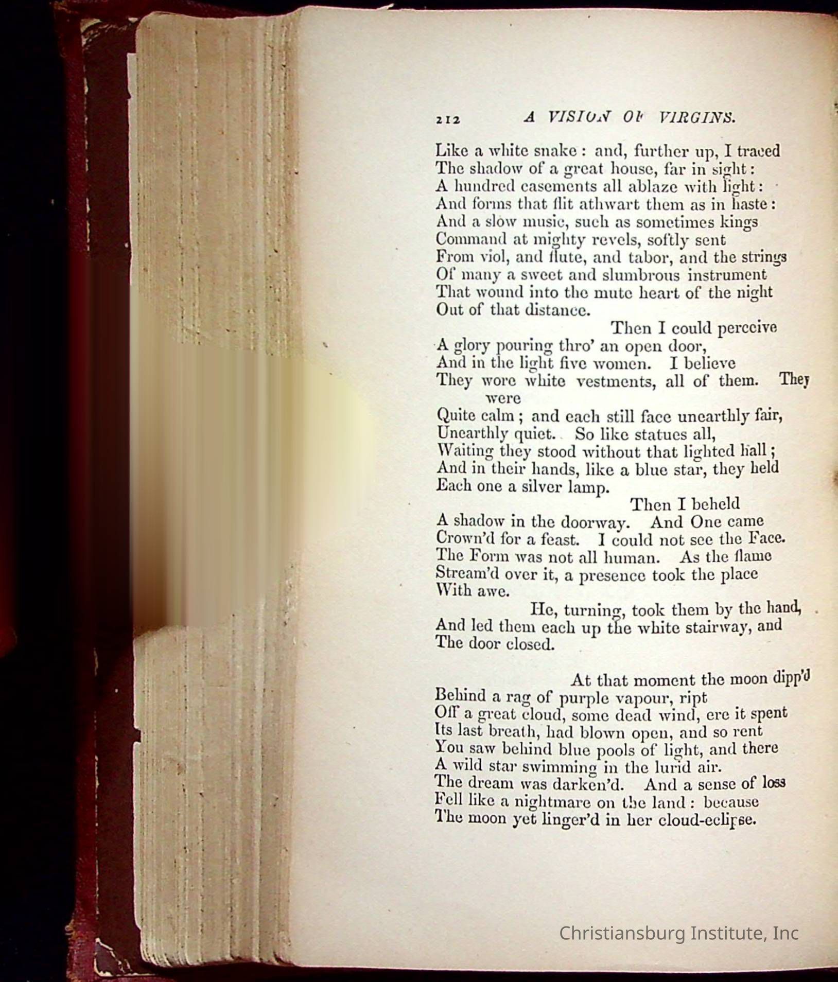 "Poems" written by Owen Meredith and published by James R. Osgood and Company in the year 1875. This book was in the Christiansburg Institute library.