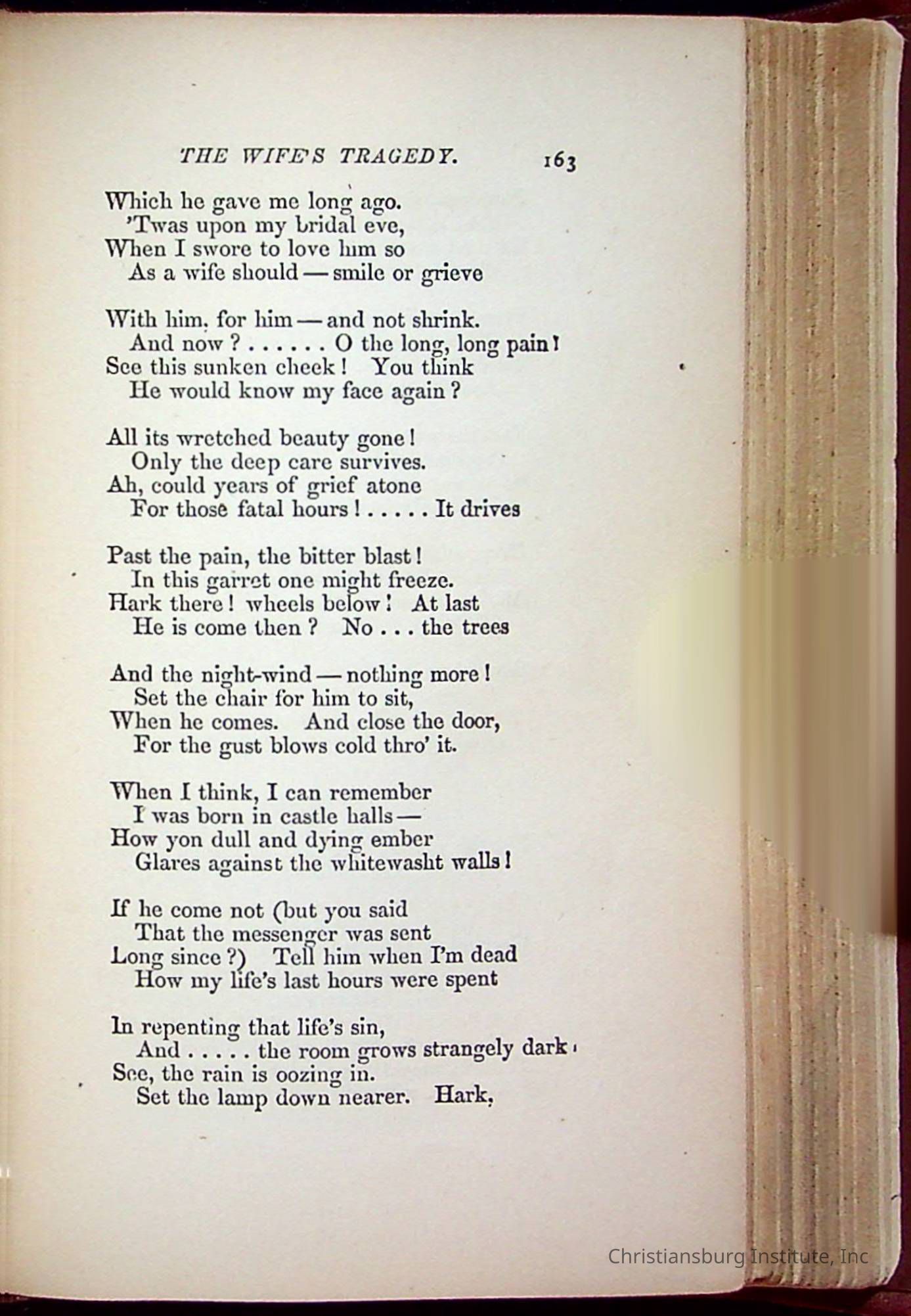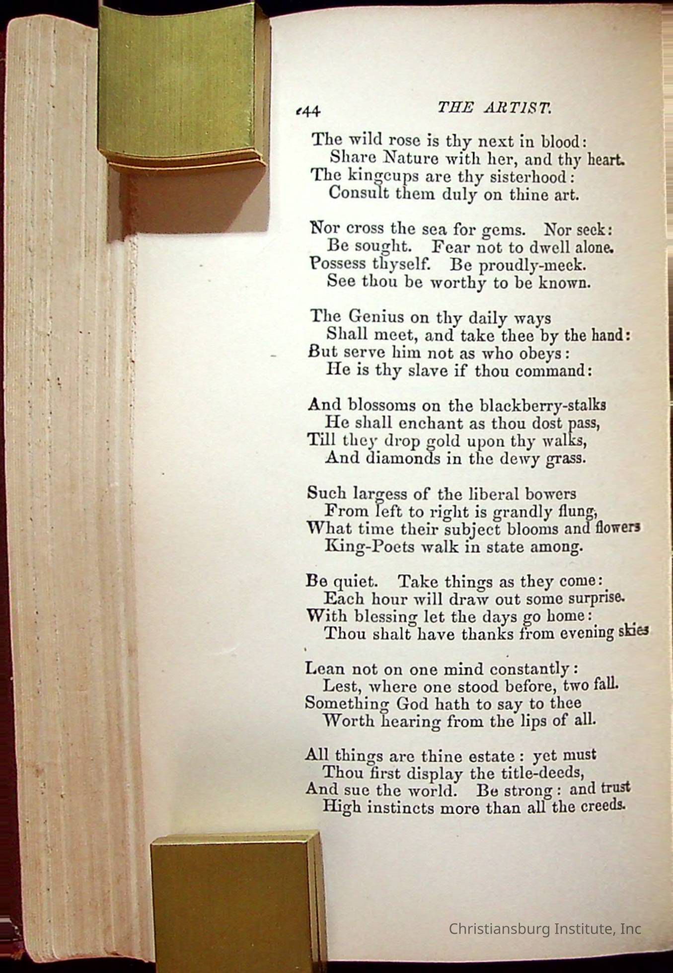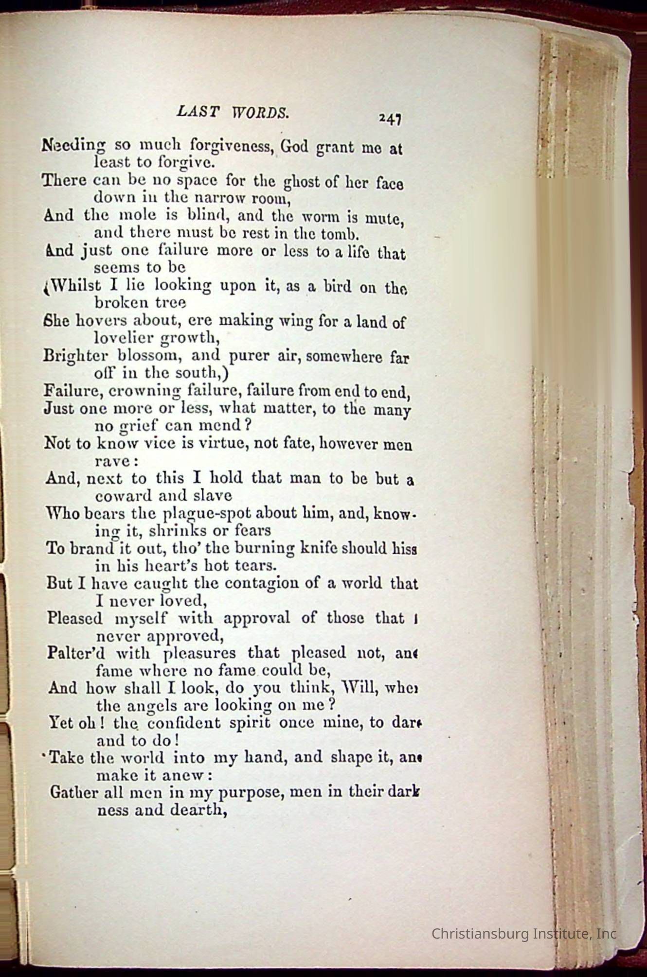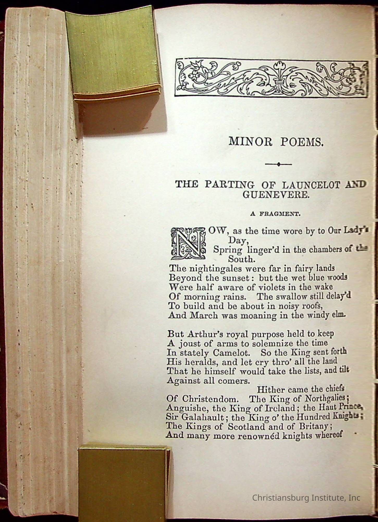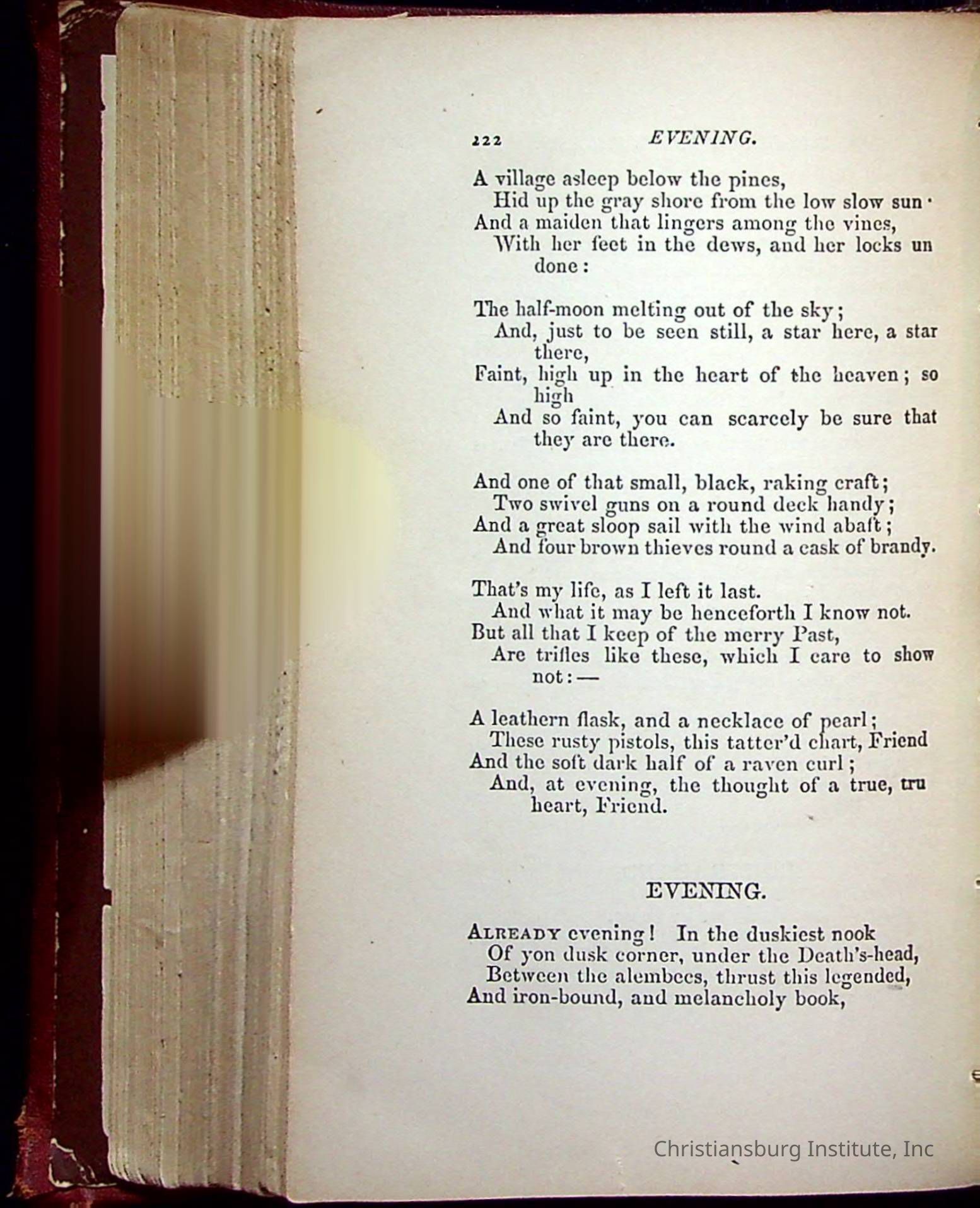 "Poems" written by Owen Meredith and published by James R. Osgood and Company in the year 1875. This book was in the Christiansburg Institute library.