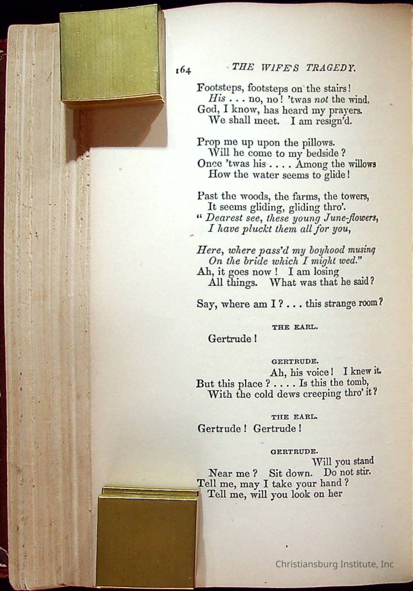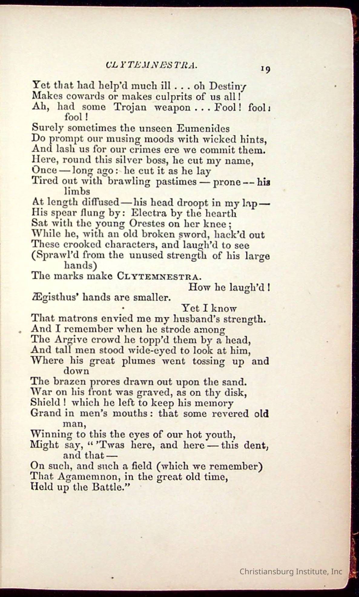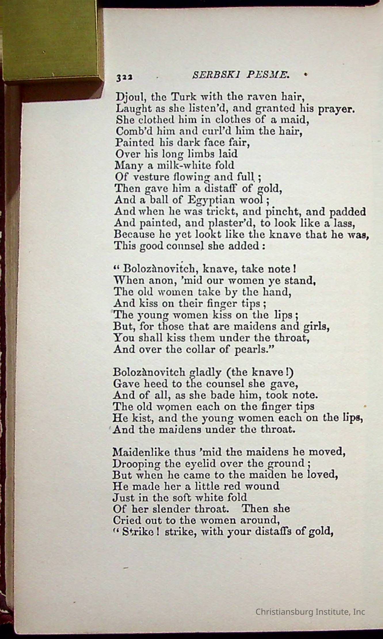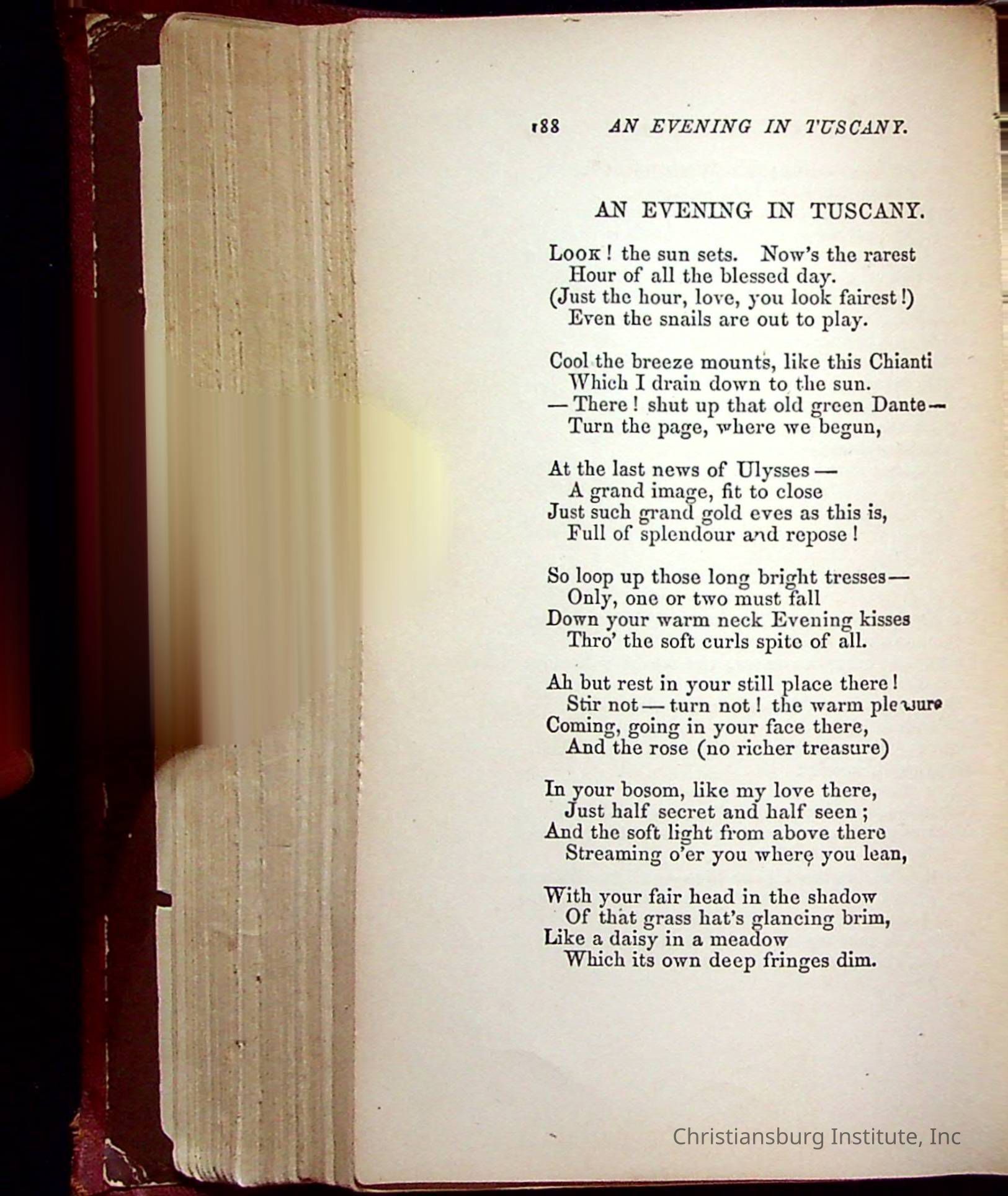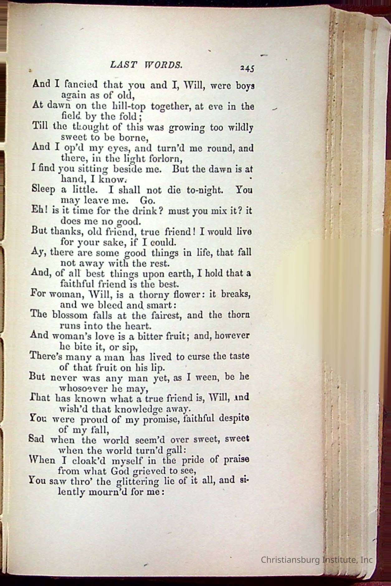 "Poems" written by Owen Meredith and published by James R. Osgood and Company in the year 1875. This book was in the Christiansburg Institute library.