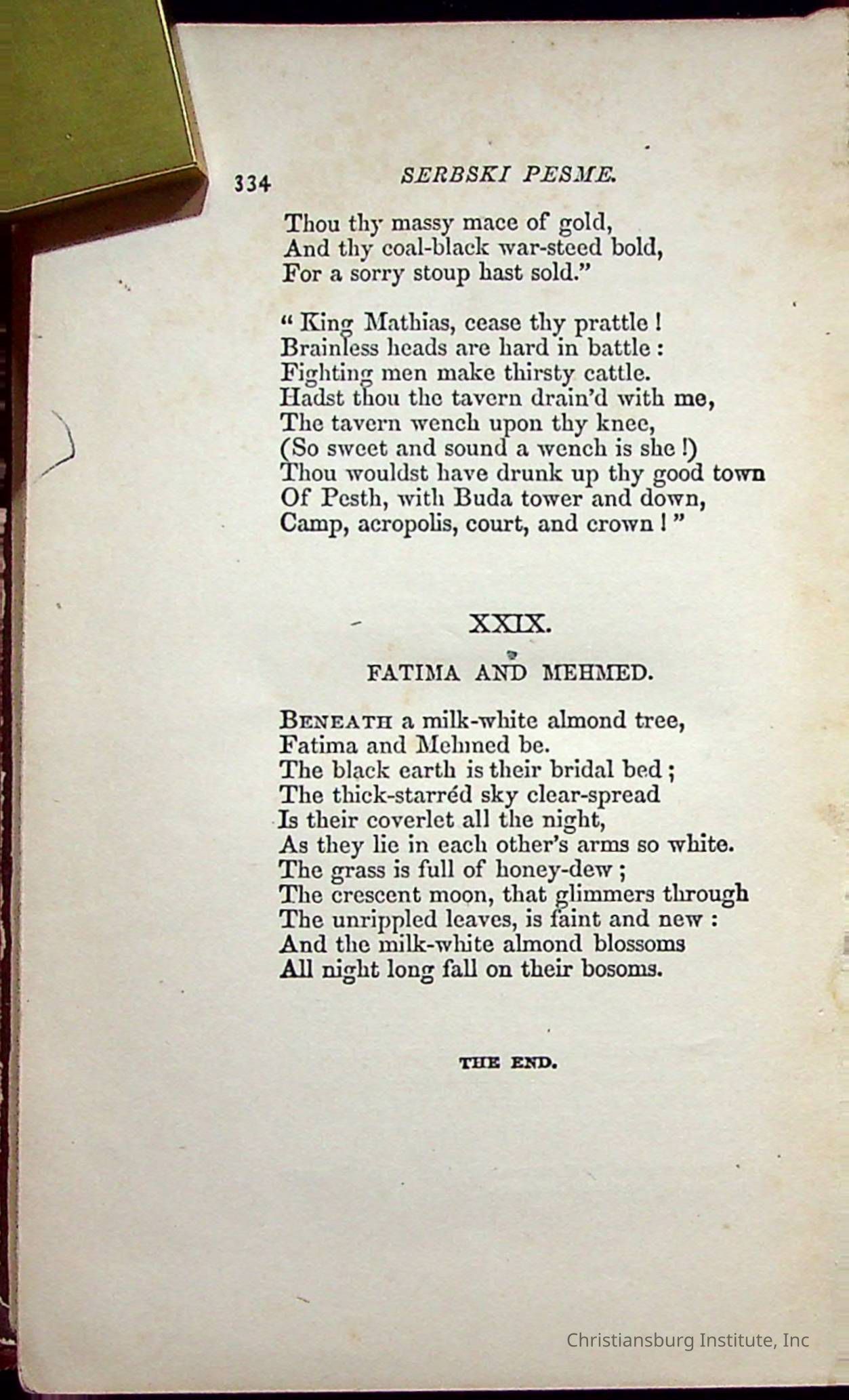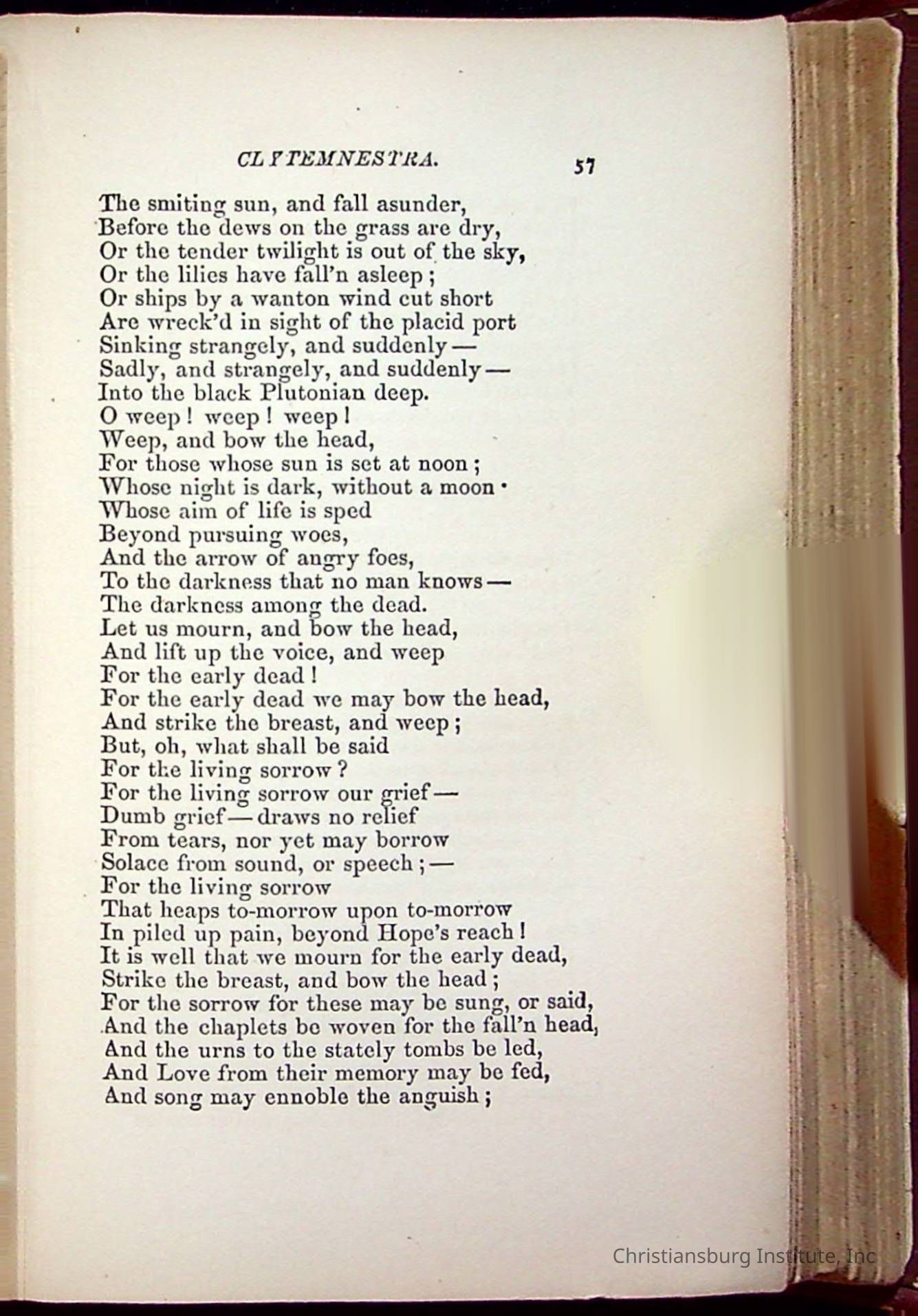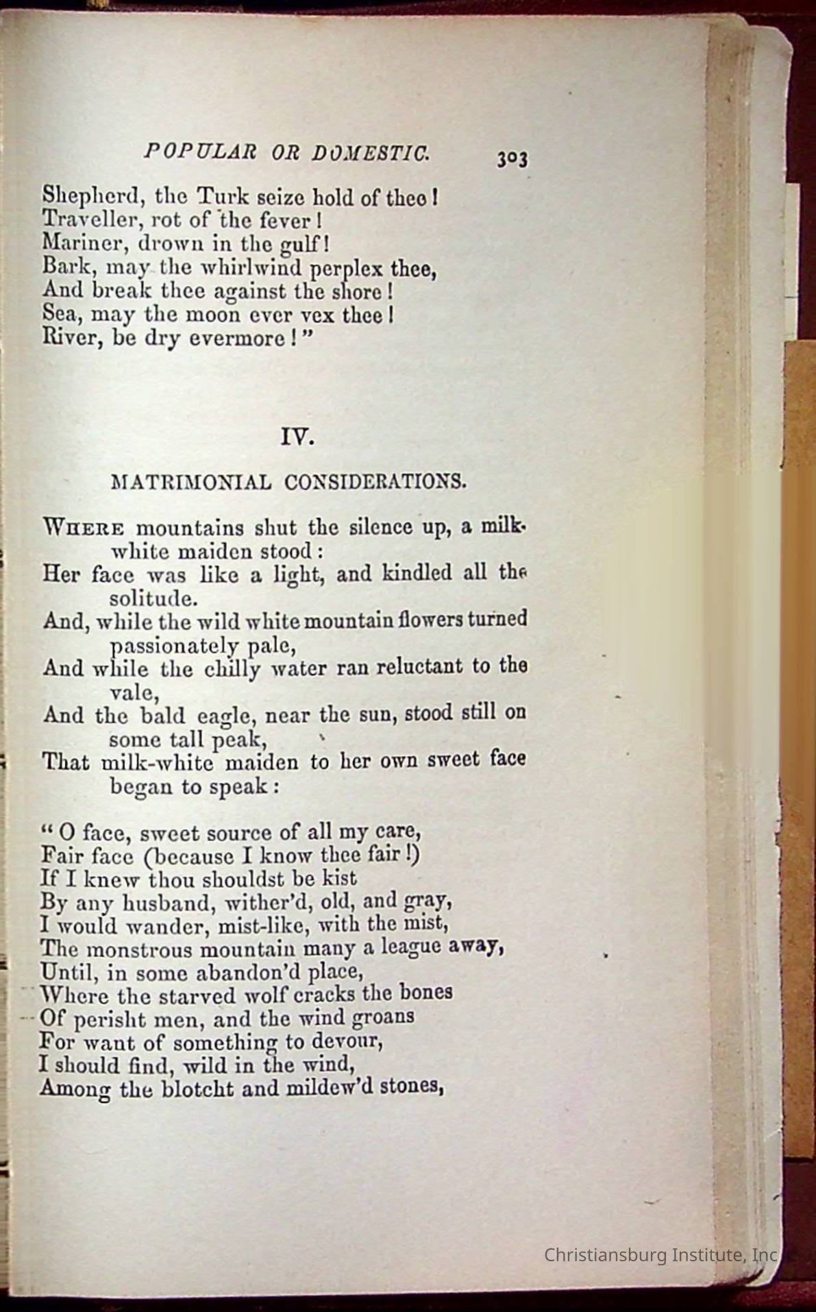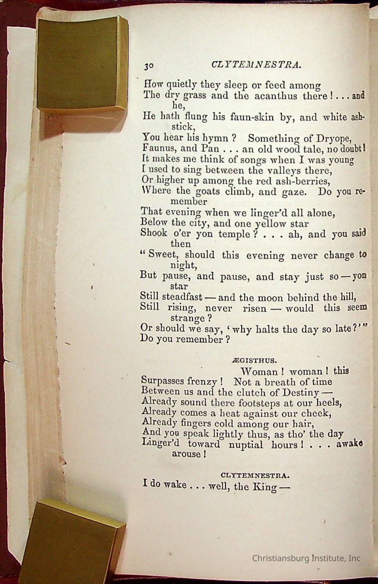 "Poems" written by Owen Meredith and published by James R. Osgood and Company in the year 1875. This book was in the Christiansburg Institute library.