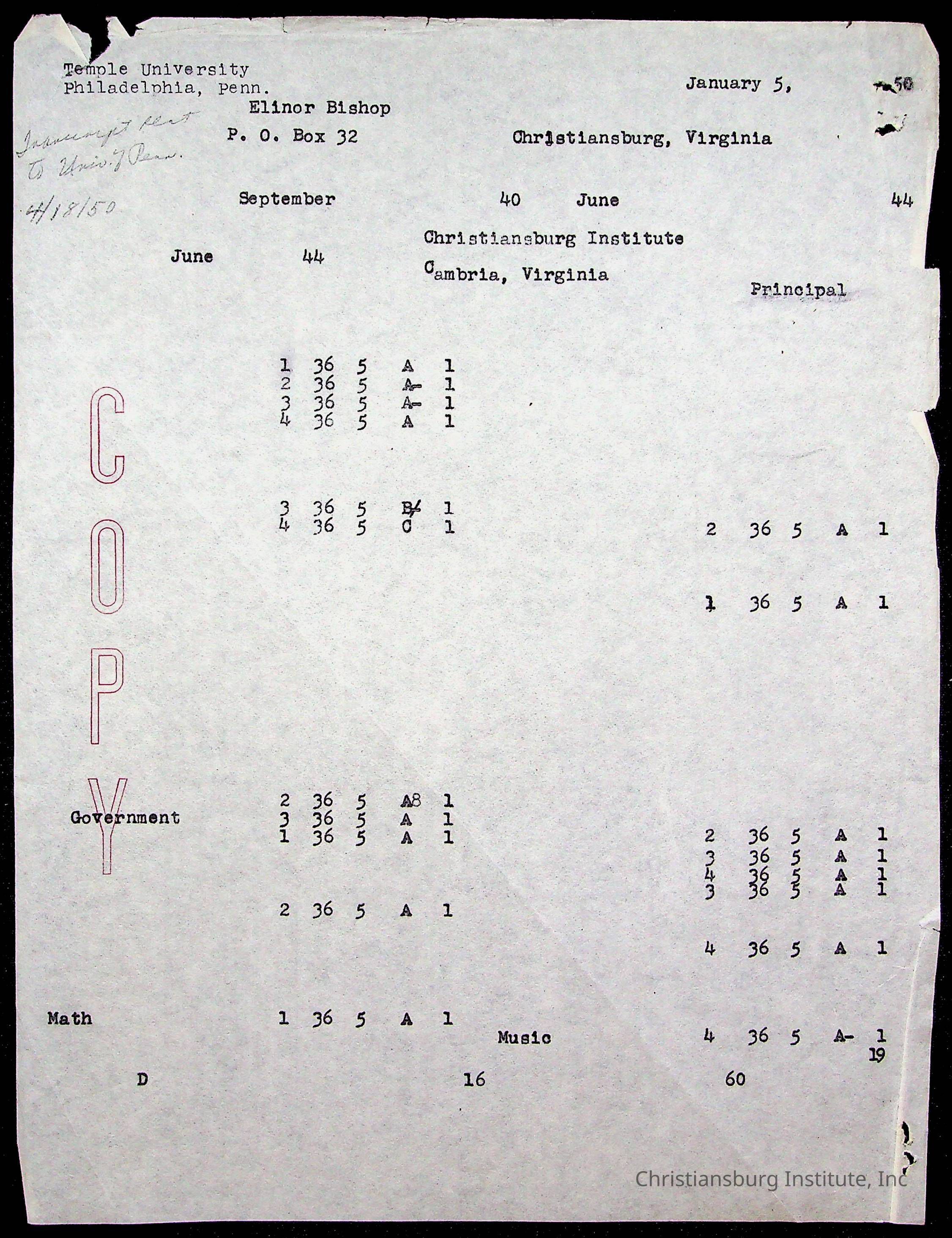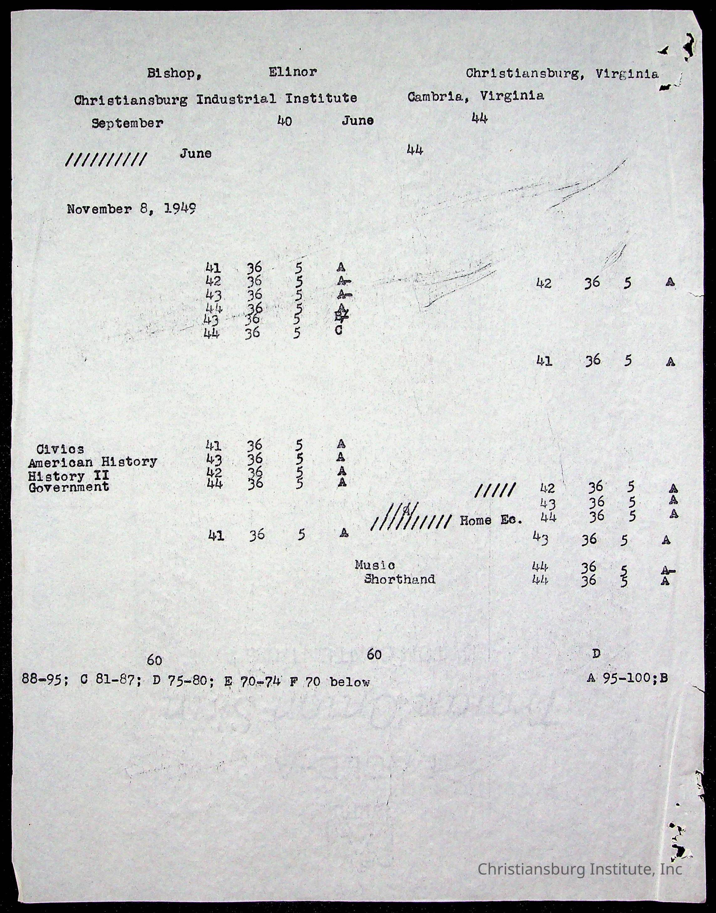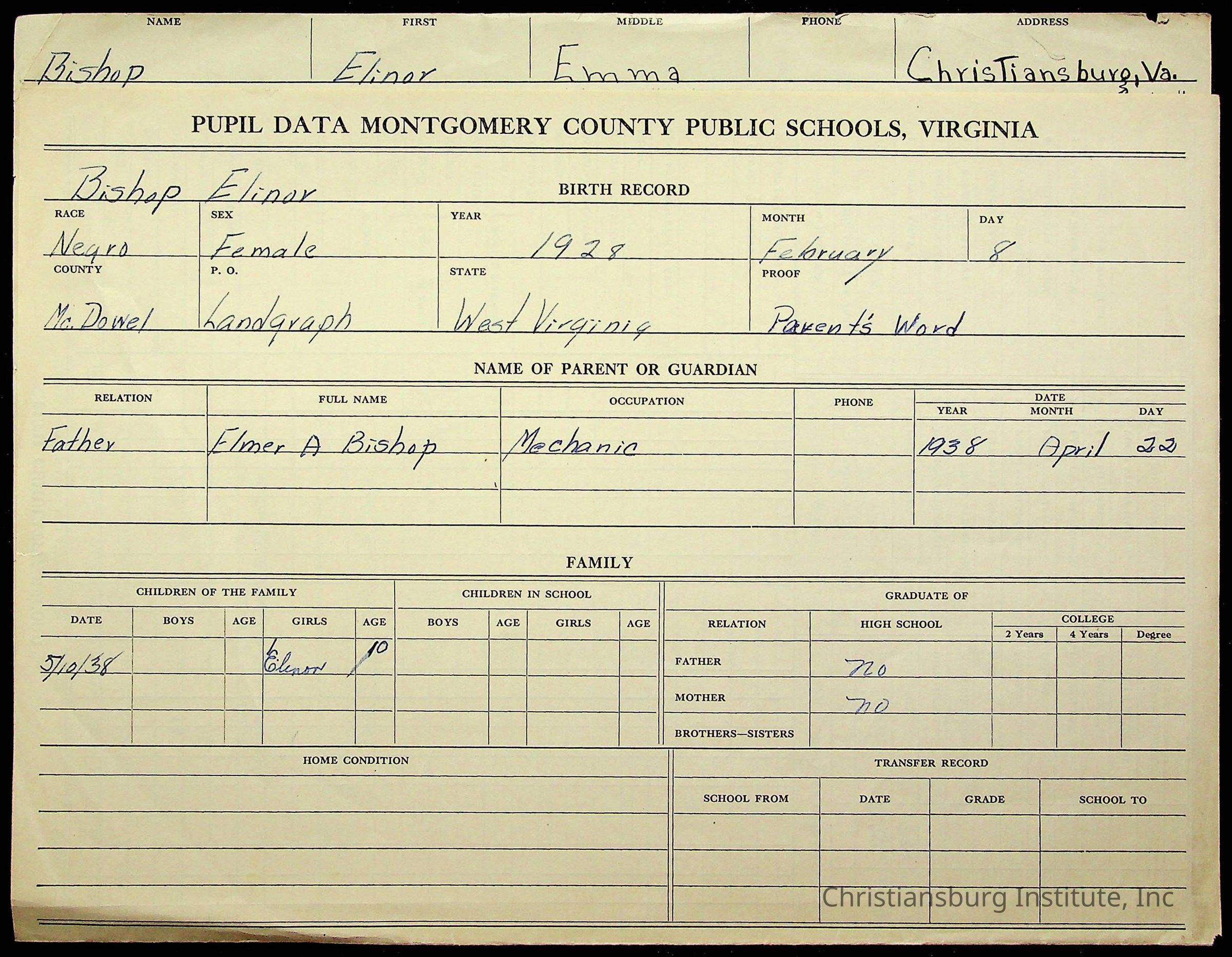 Montgomery County Public Schools, Christiansburg Institute, Bishop, Elinor Emma