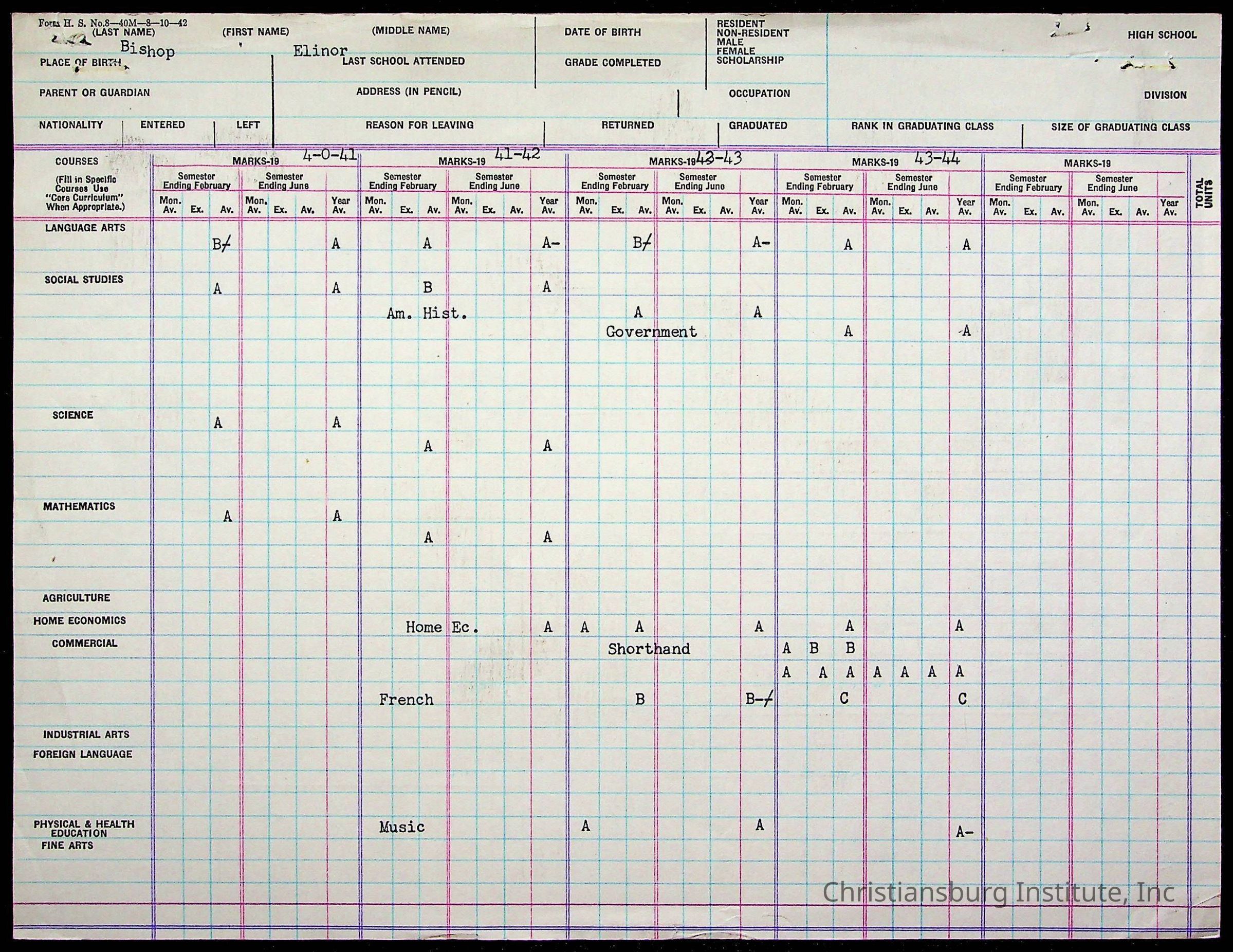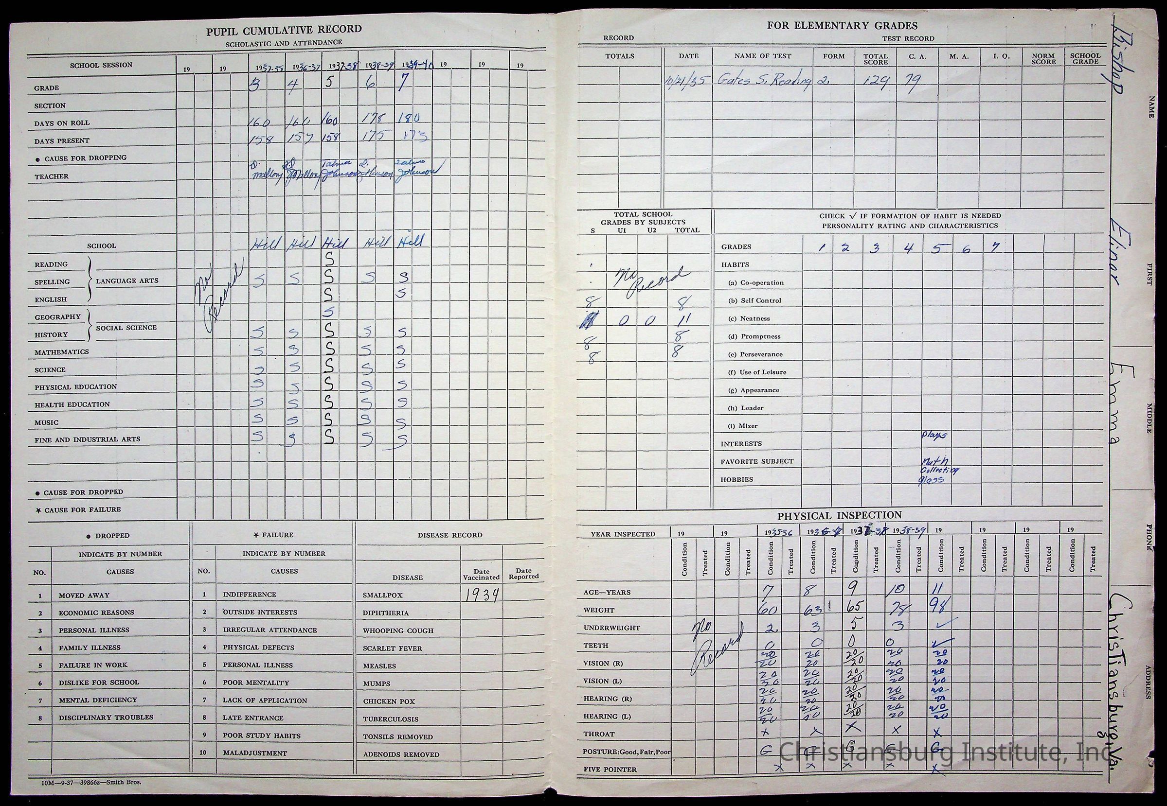 The student file for the Christiansburg Institute student, Elinor Emma Bishop circa 1930s.