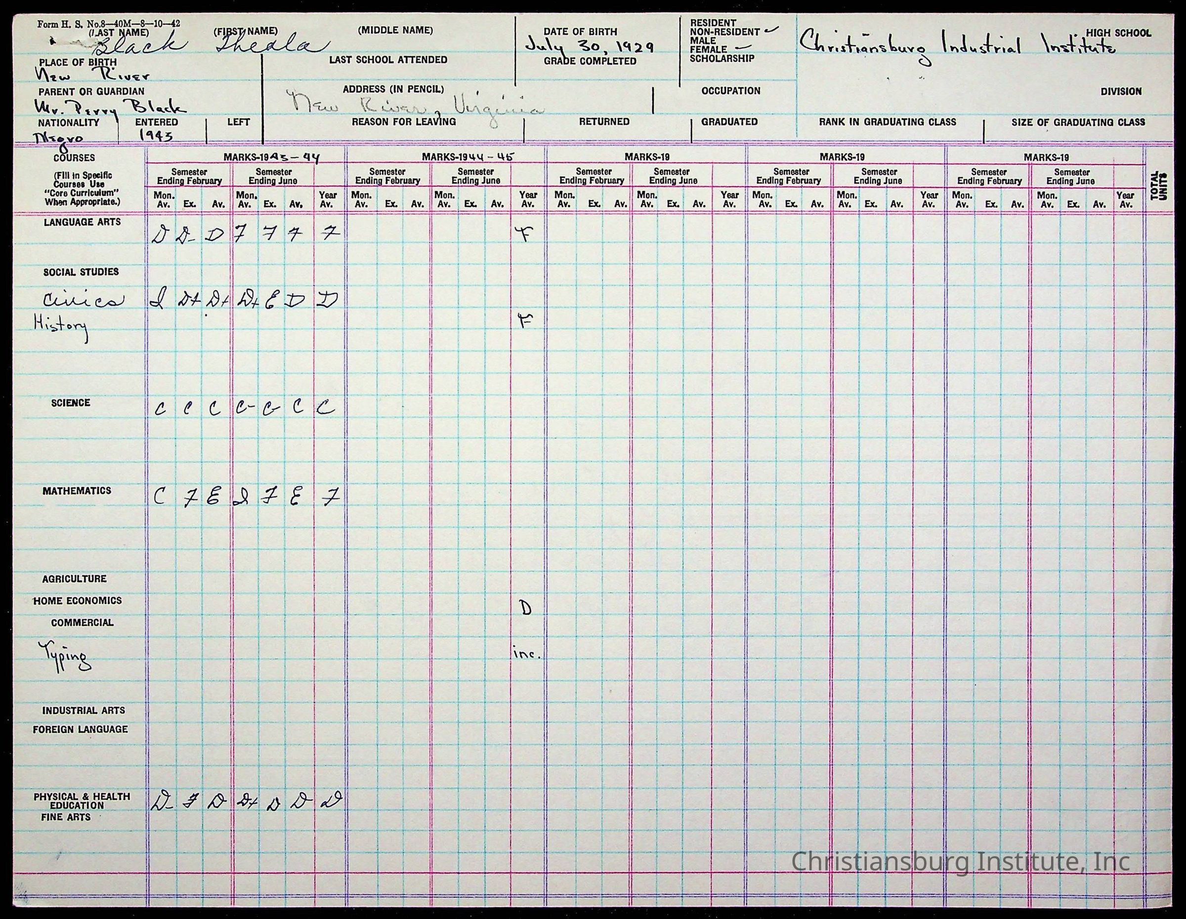 The student file for the Christiansburg Institute student, Thela Black circa 1940s.