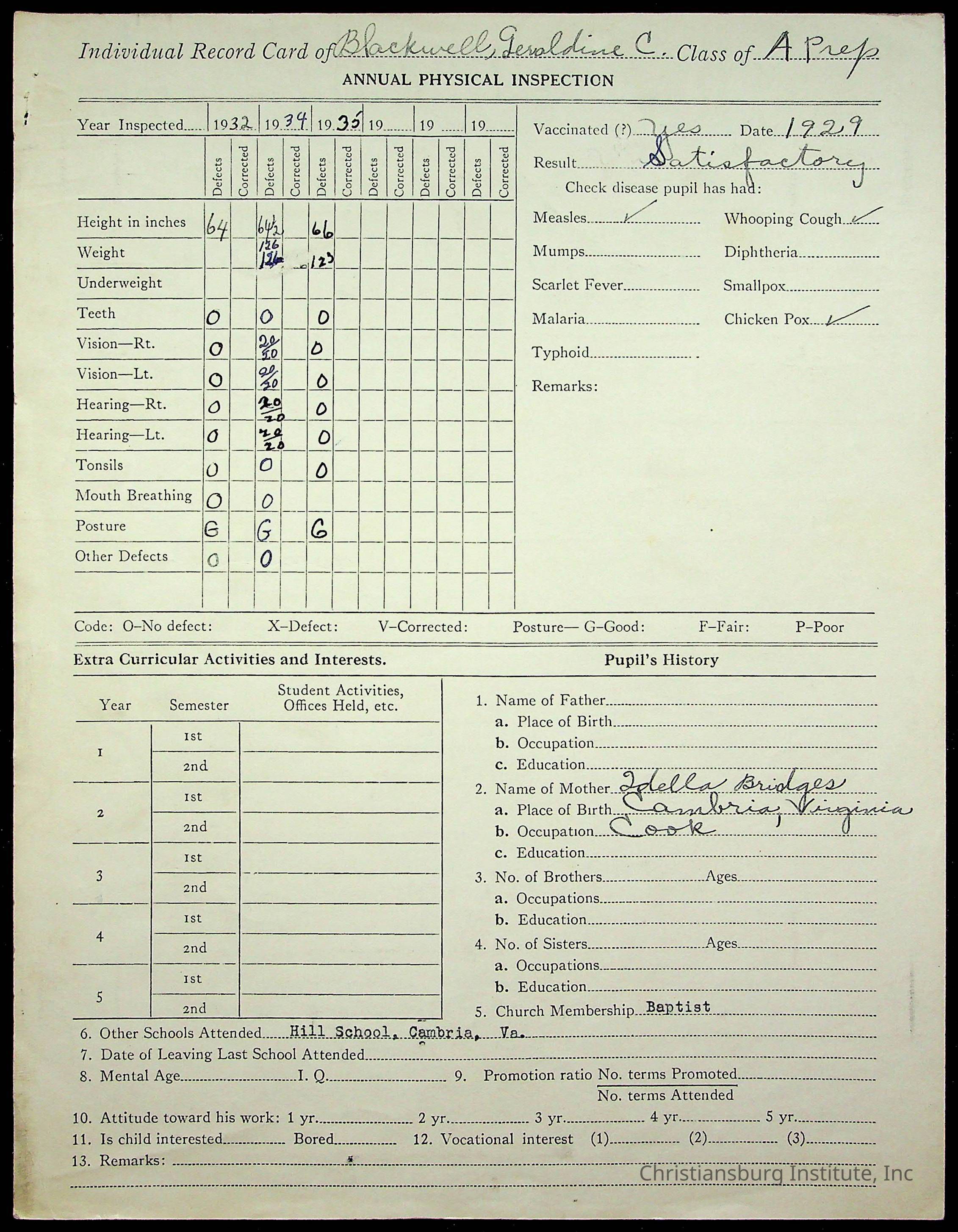 The student file for the Christiansburg Institute student, Geraldine Blackwell circa 1930s.