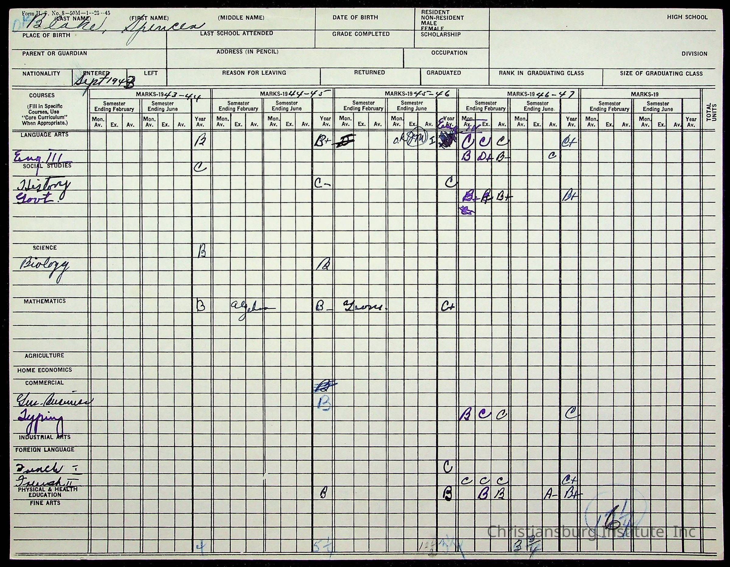 The student file for the Christiansburg Institute student, Spencer Blake circa 1940s.