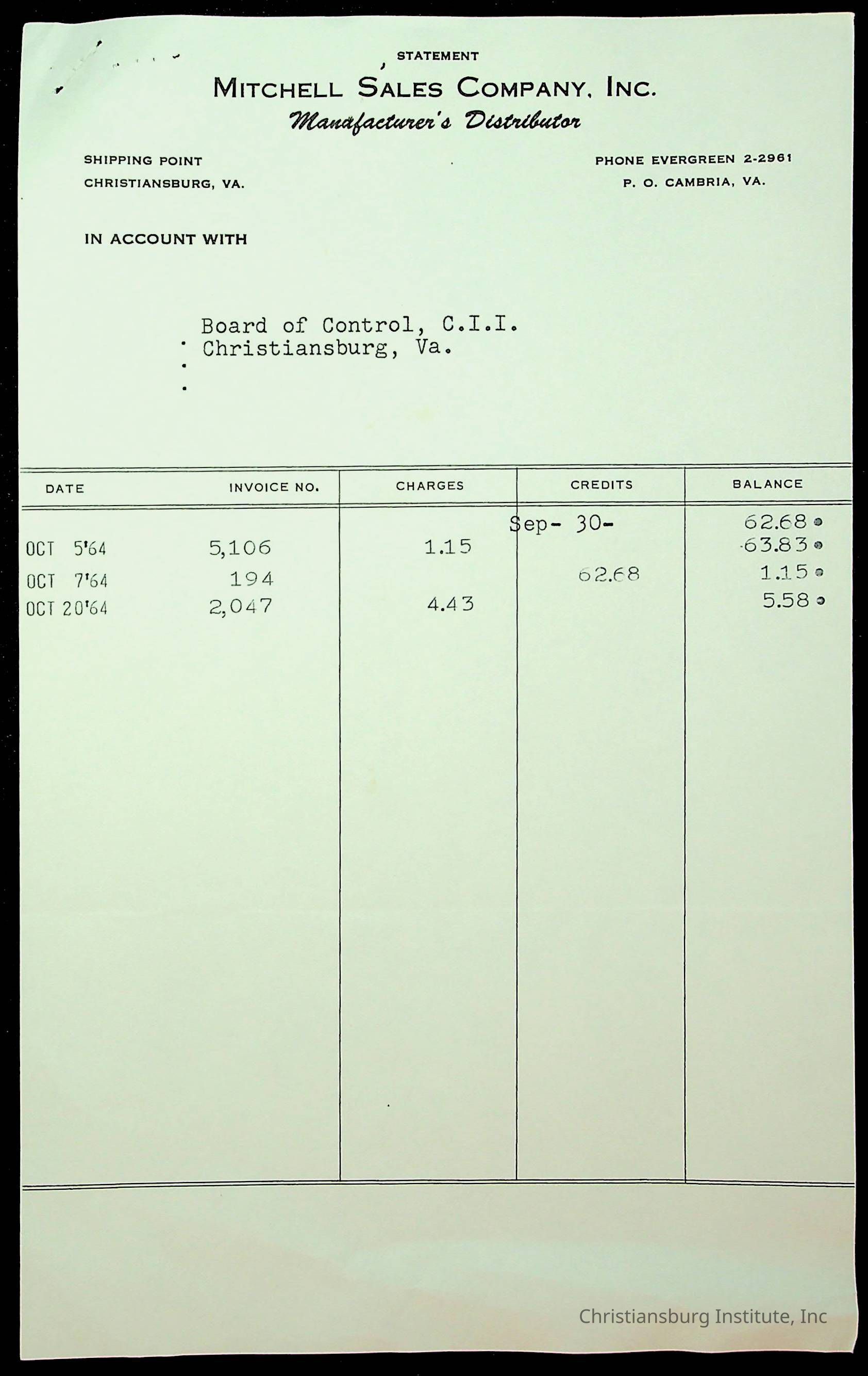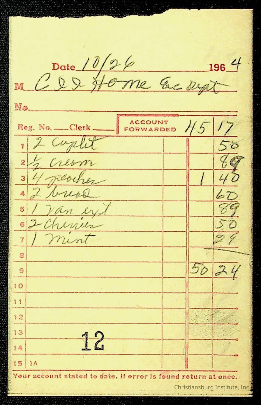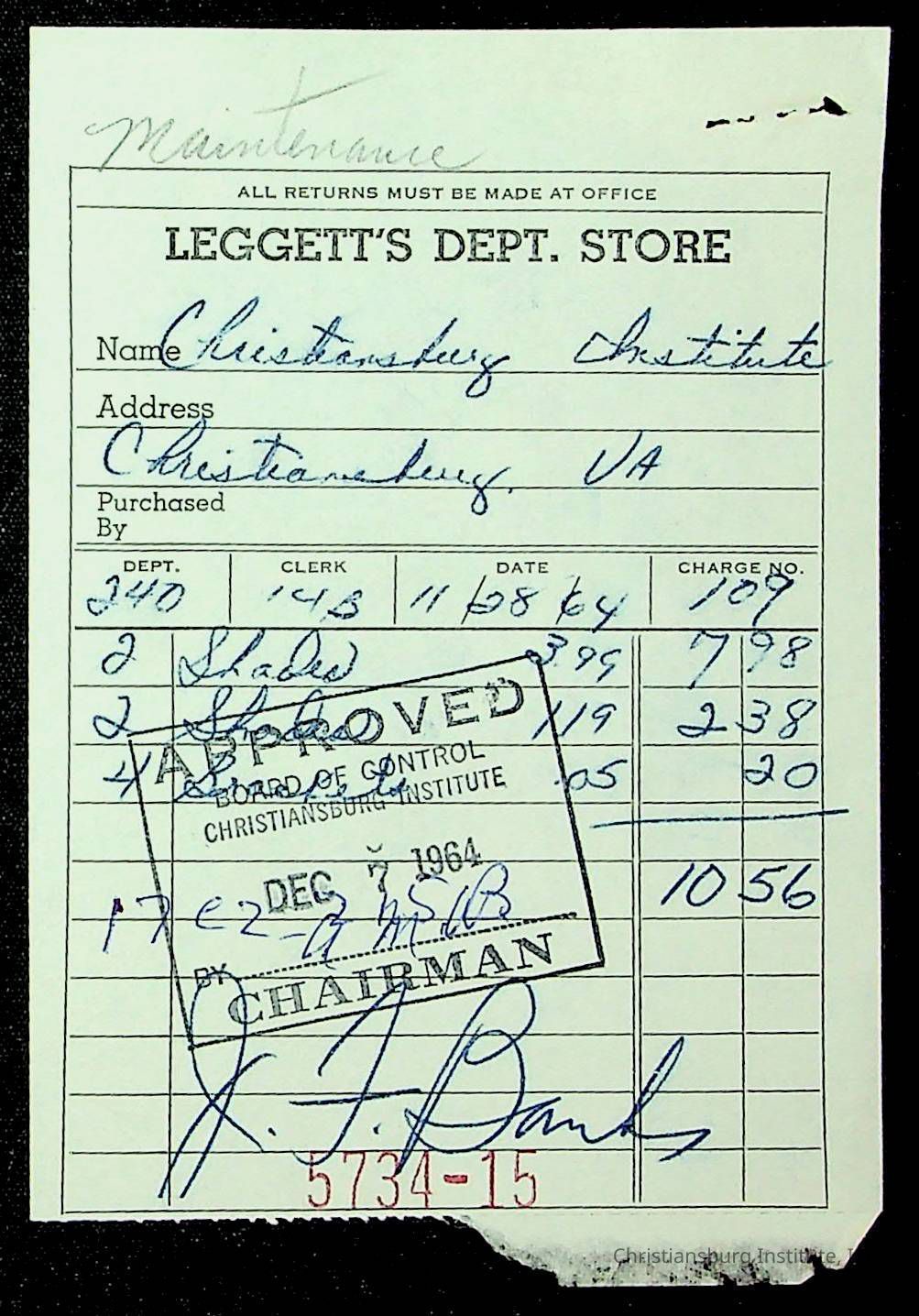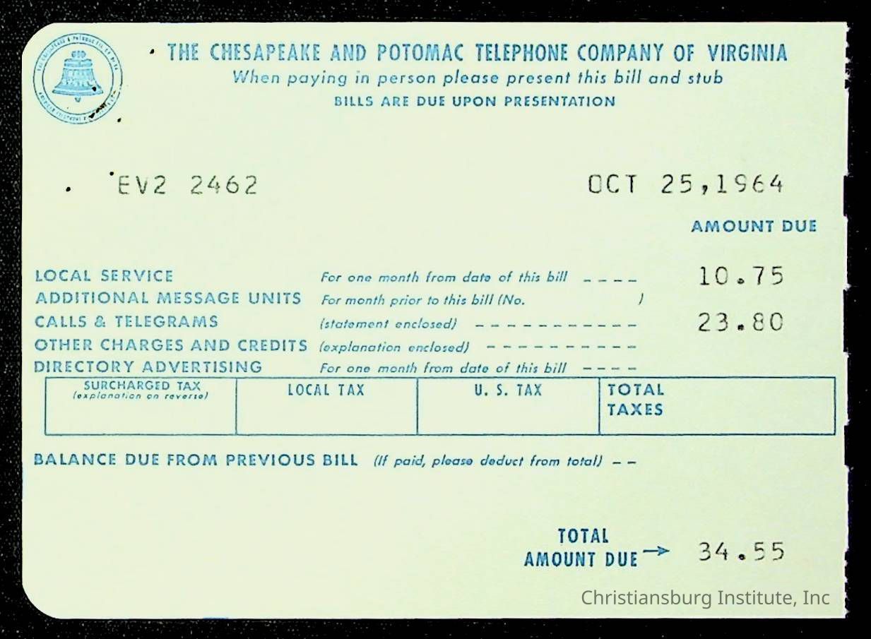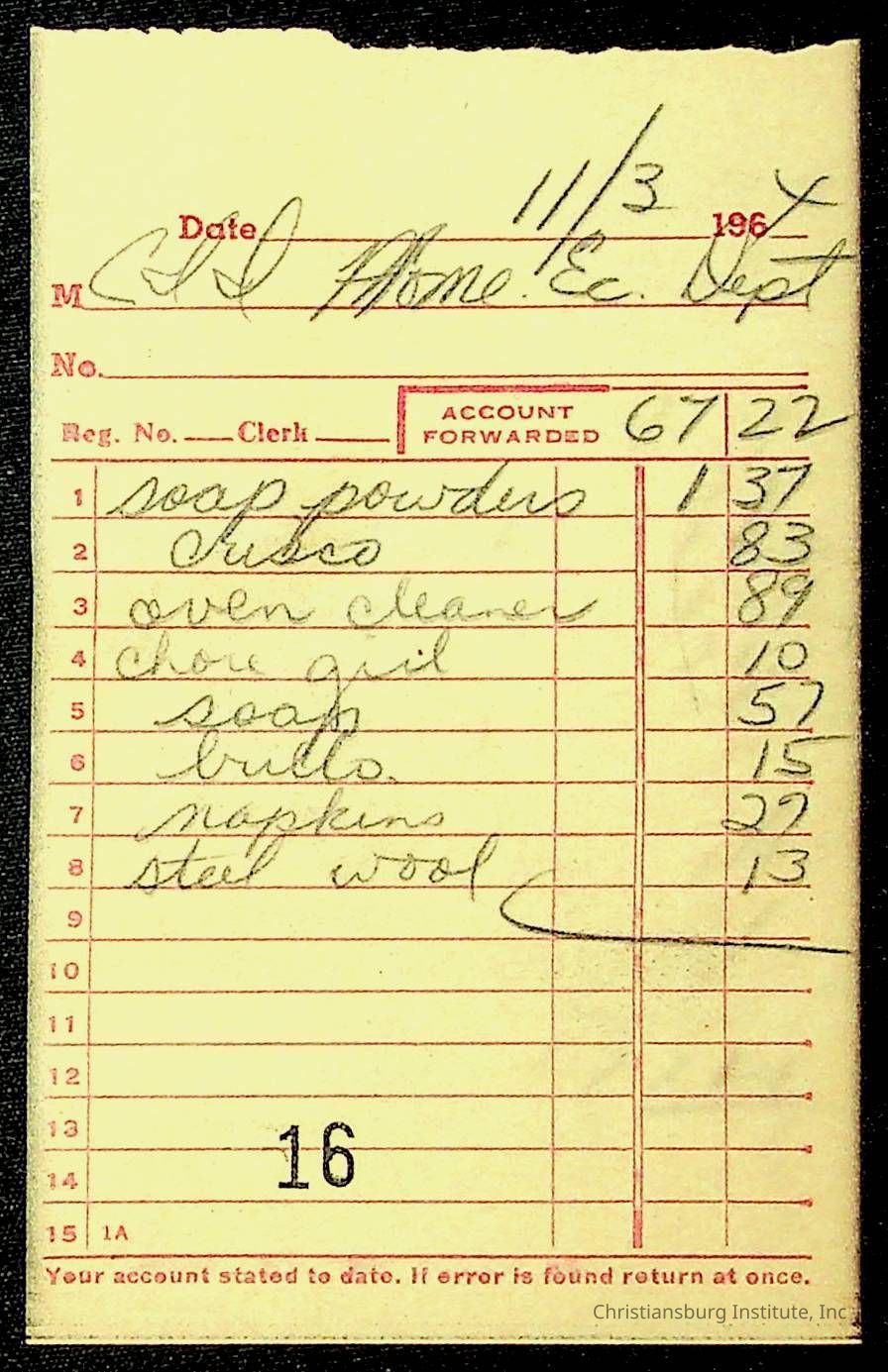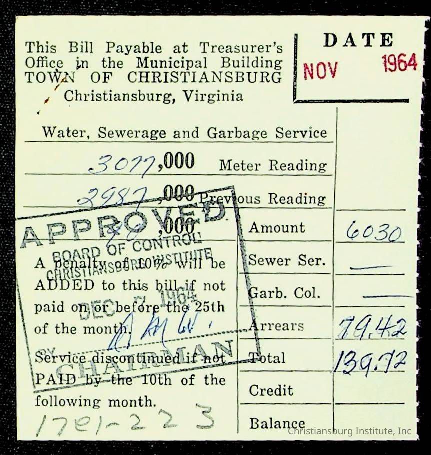 An archive of financial documents relating to the Board of Control for Christiansburg Institute dated 1964-1965. Documents include; bills, statements, and receipts.