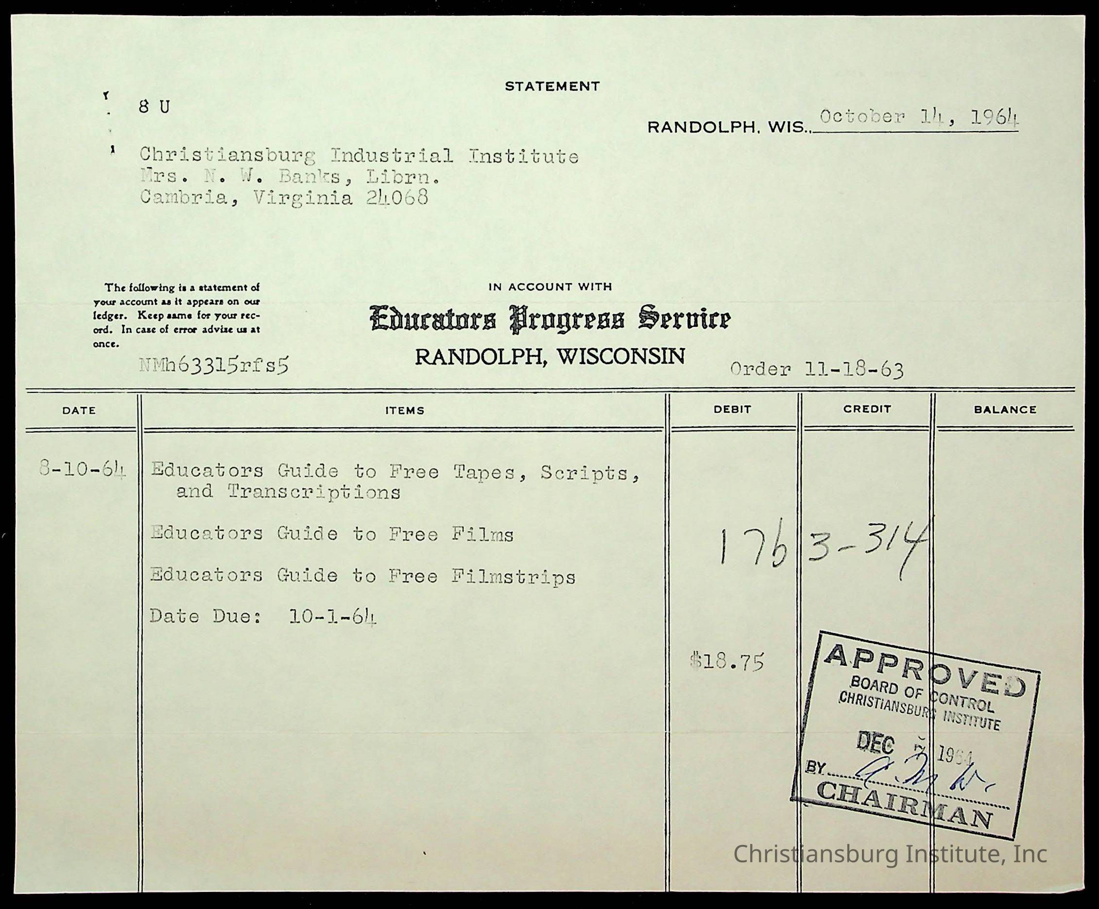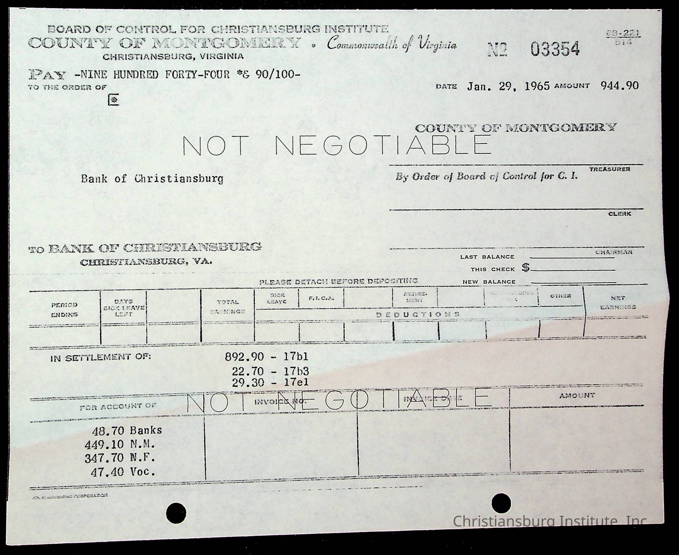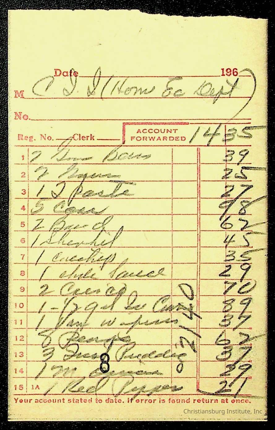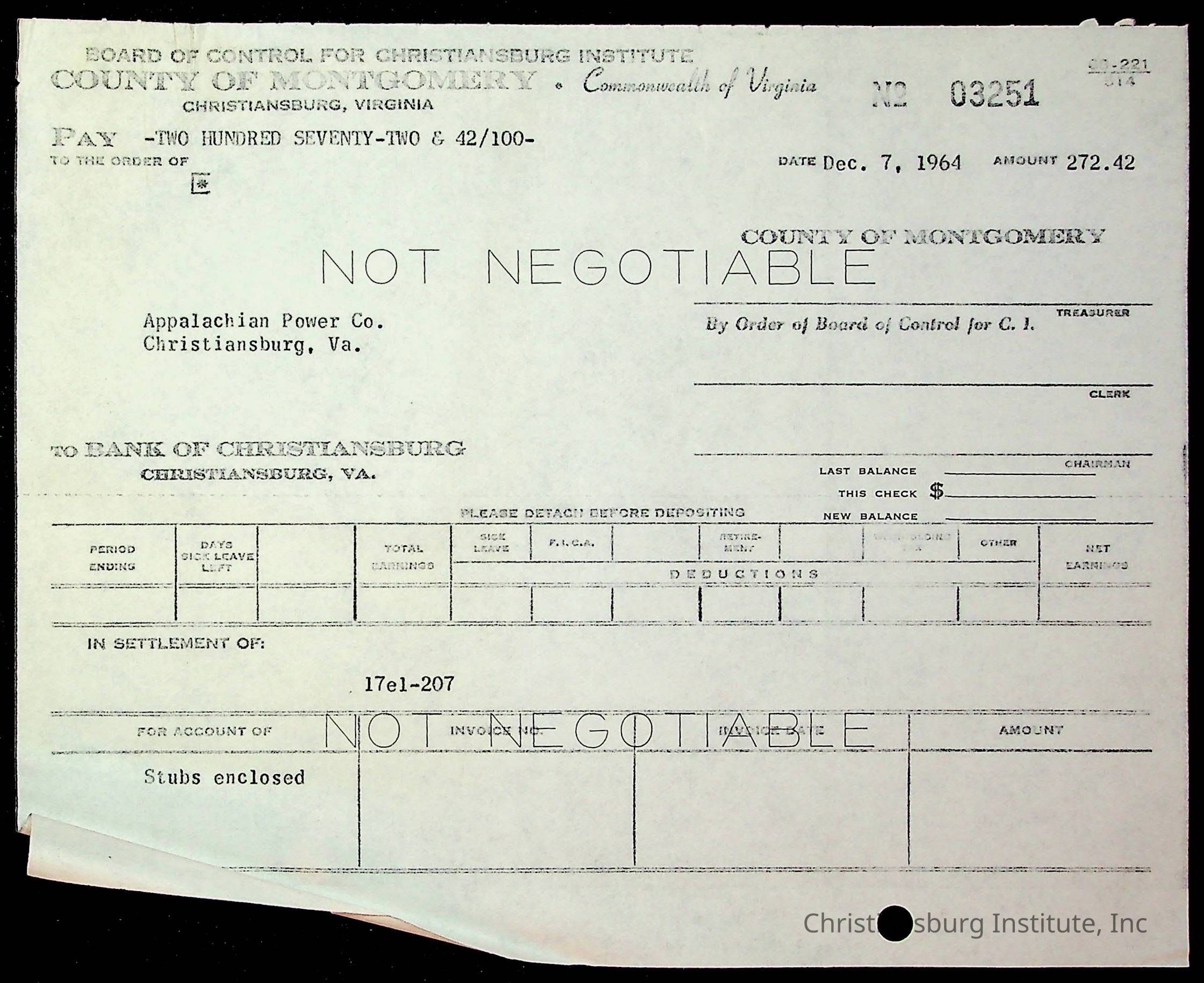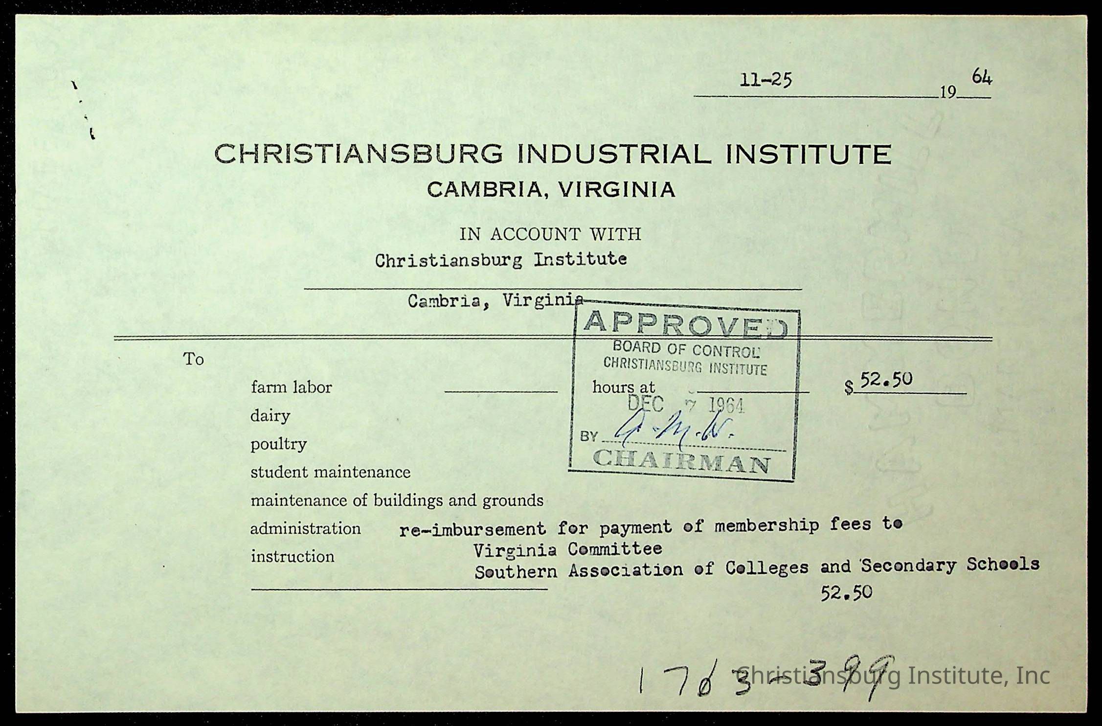 An archive of financial documents relating to the Board of Control for Christiansburg Institute dated 1964-1965. Documents include; bills, statements, and receipts.
