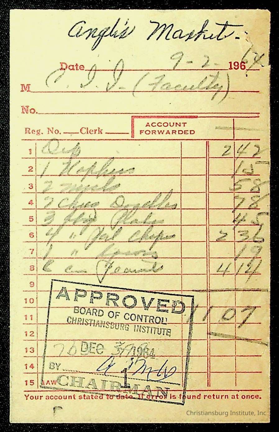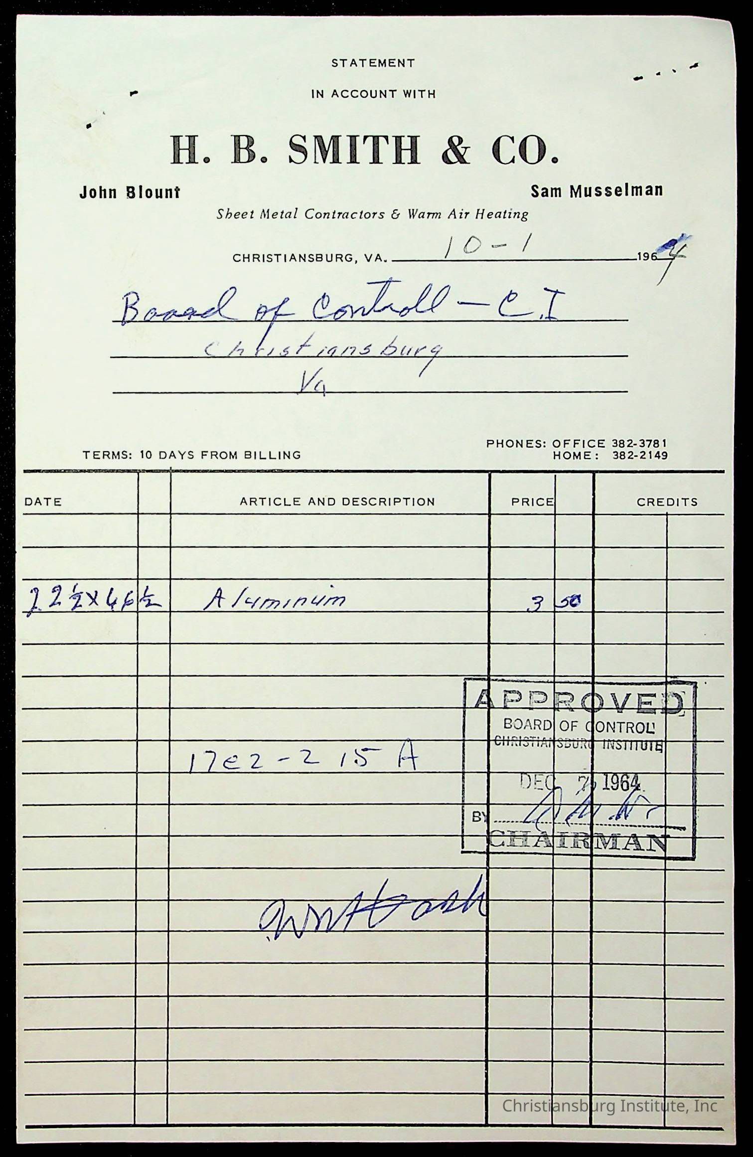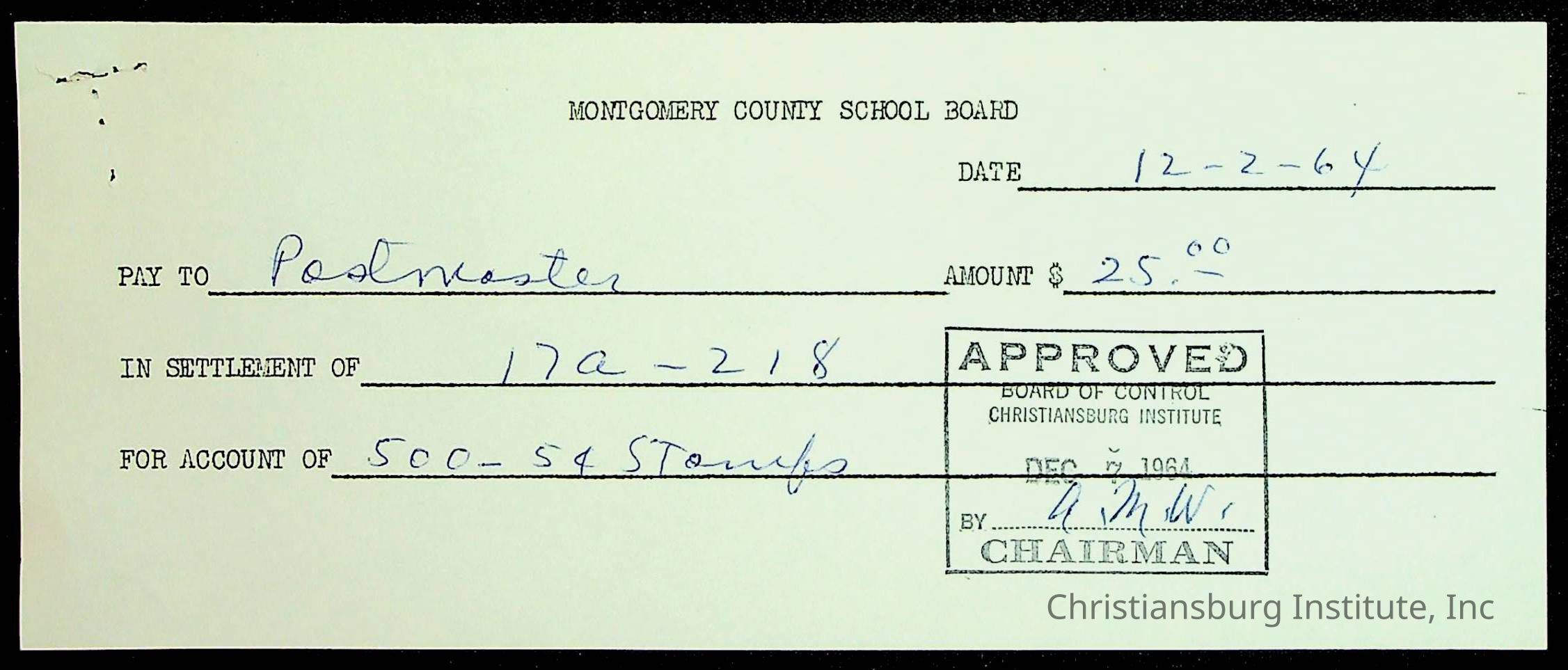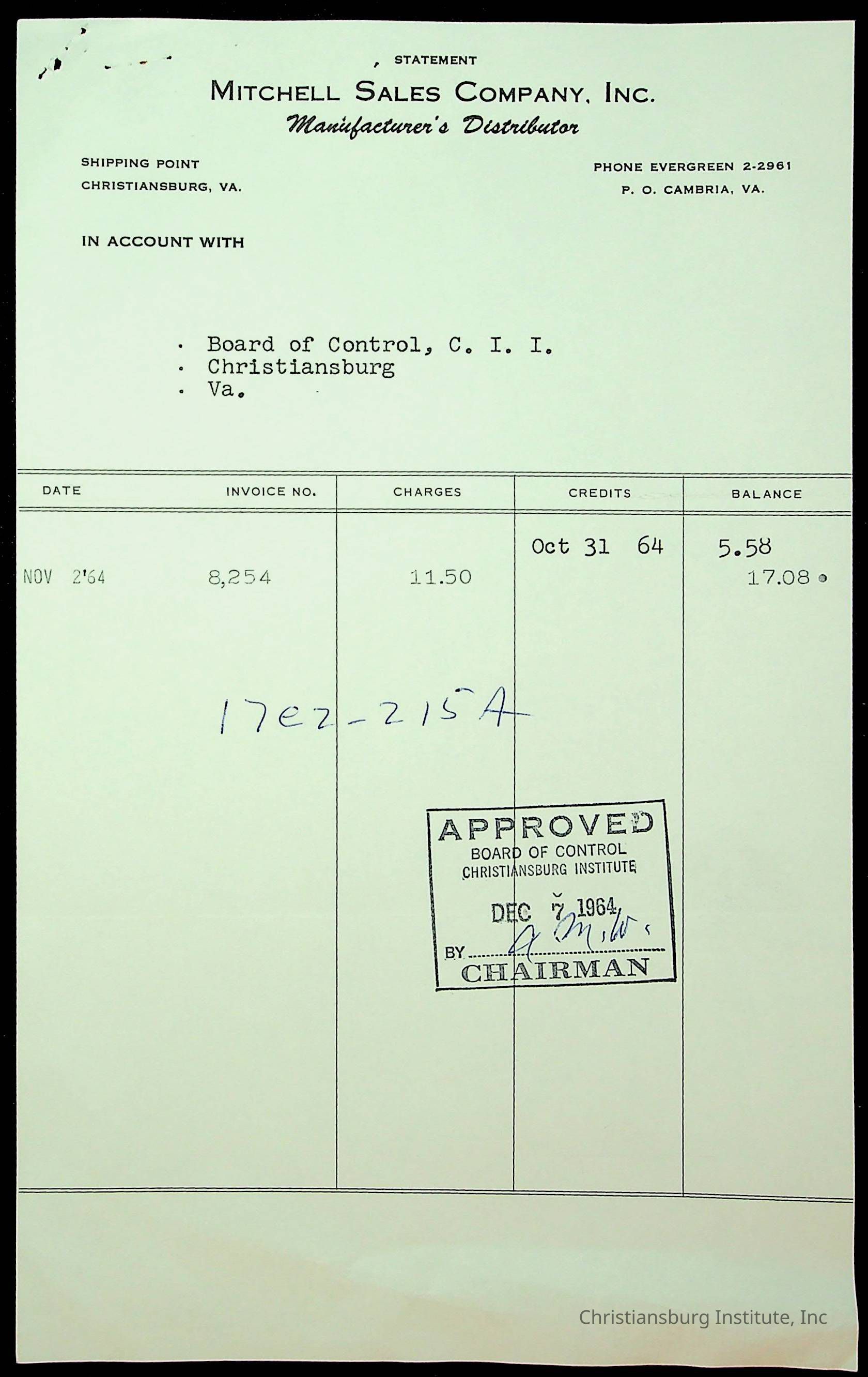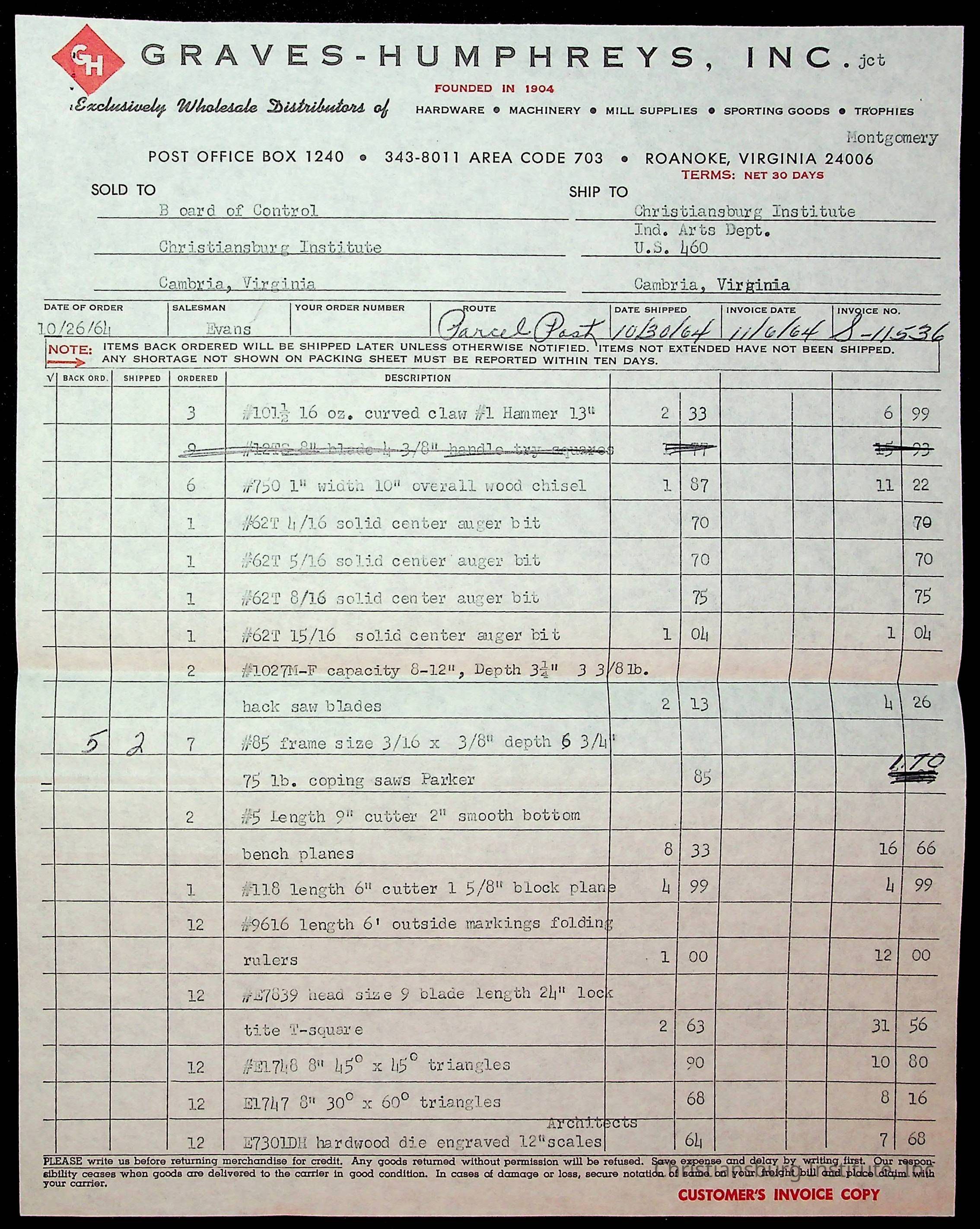 An archive of financial documents relating to the Board of Control for Christiansburg Institute dated 1964-1965. Documents include; bills, statements, and receipts.