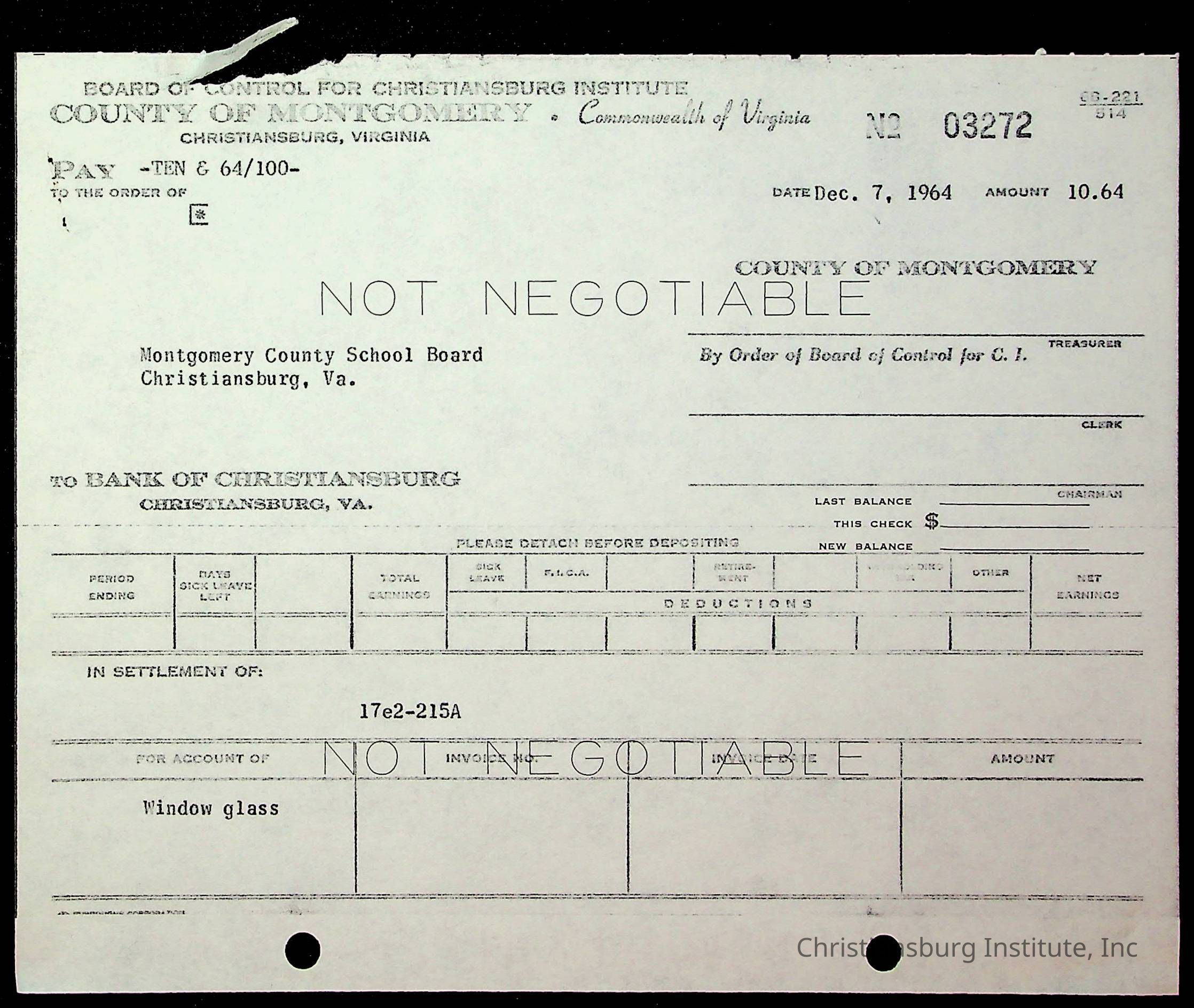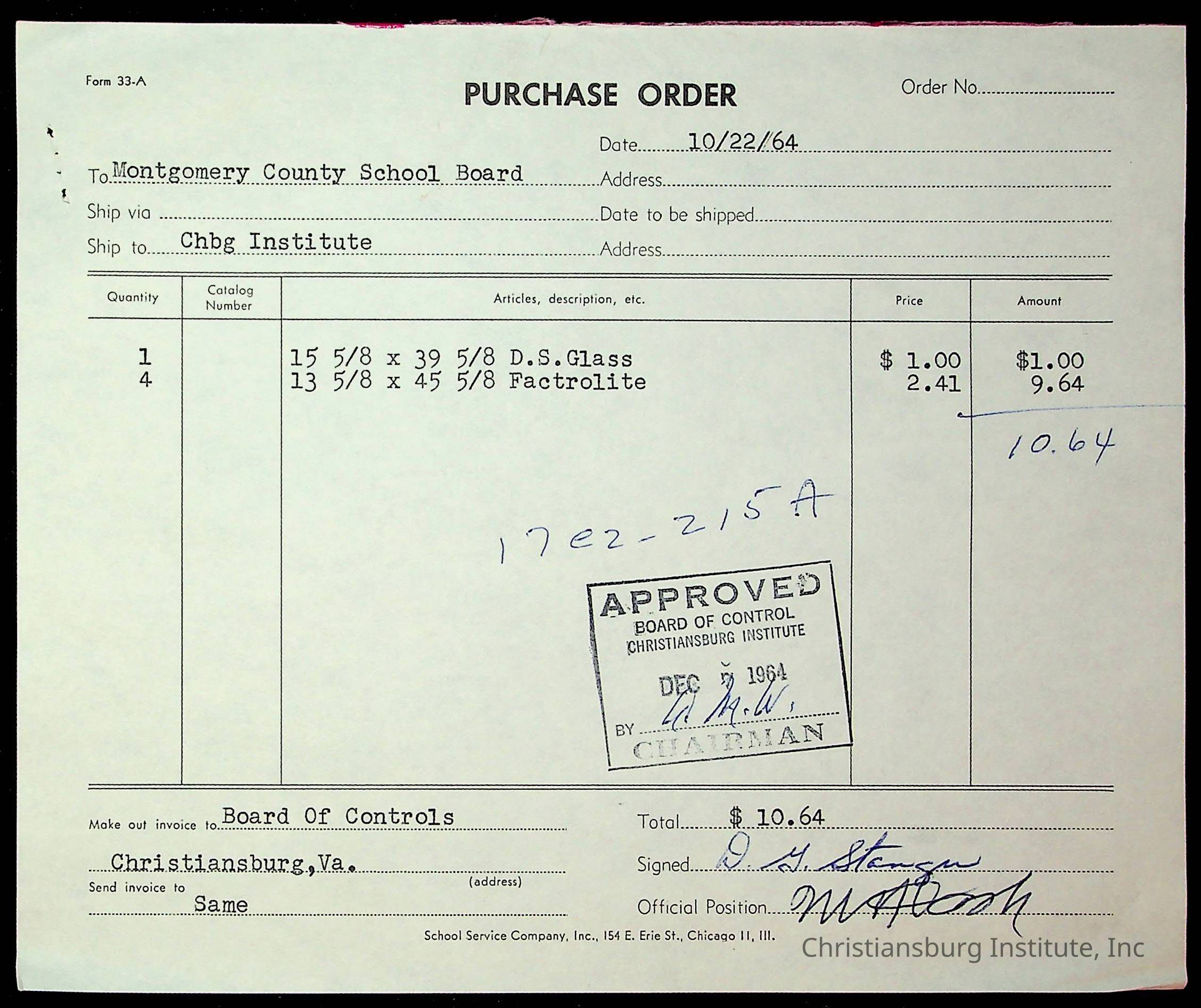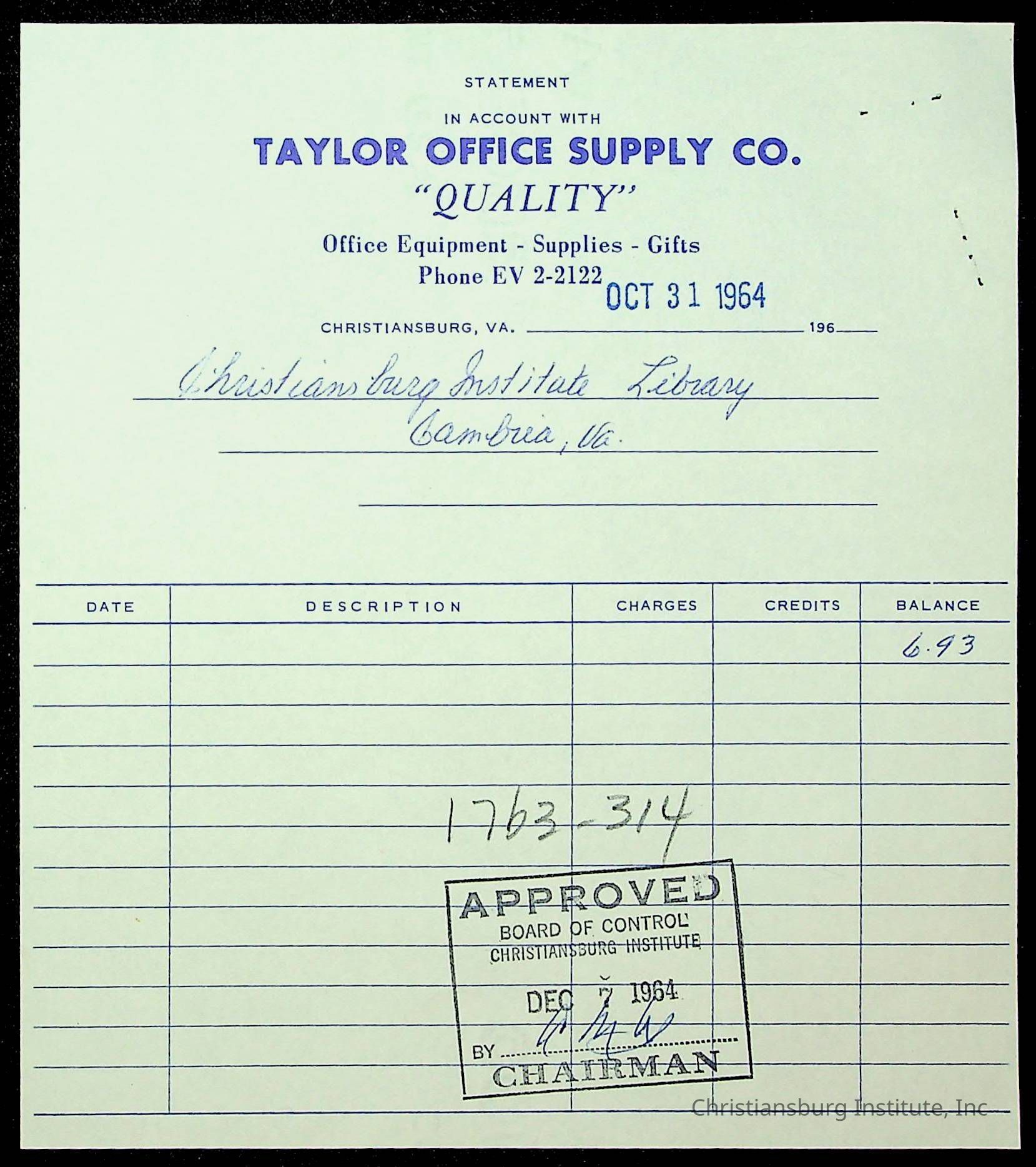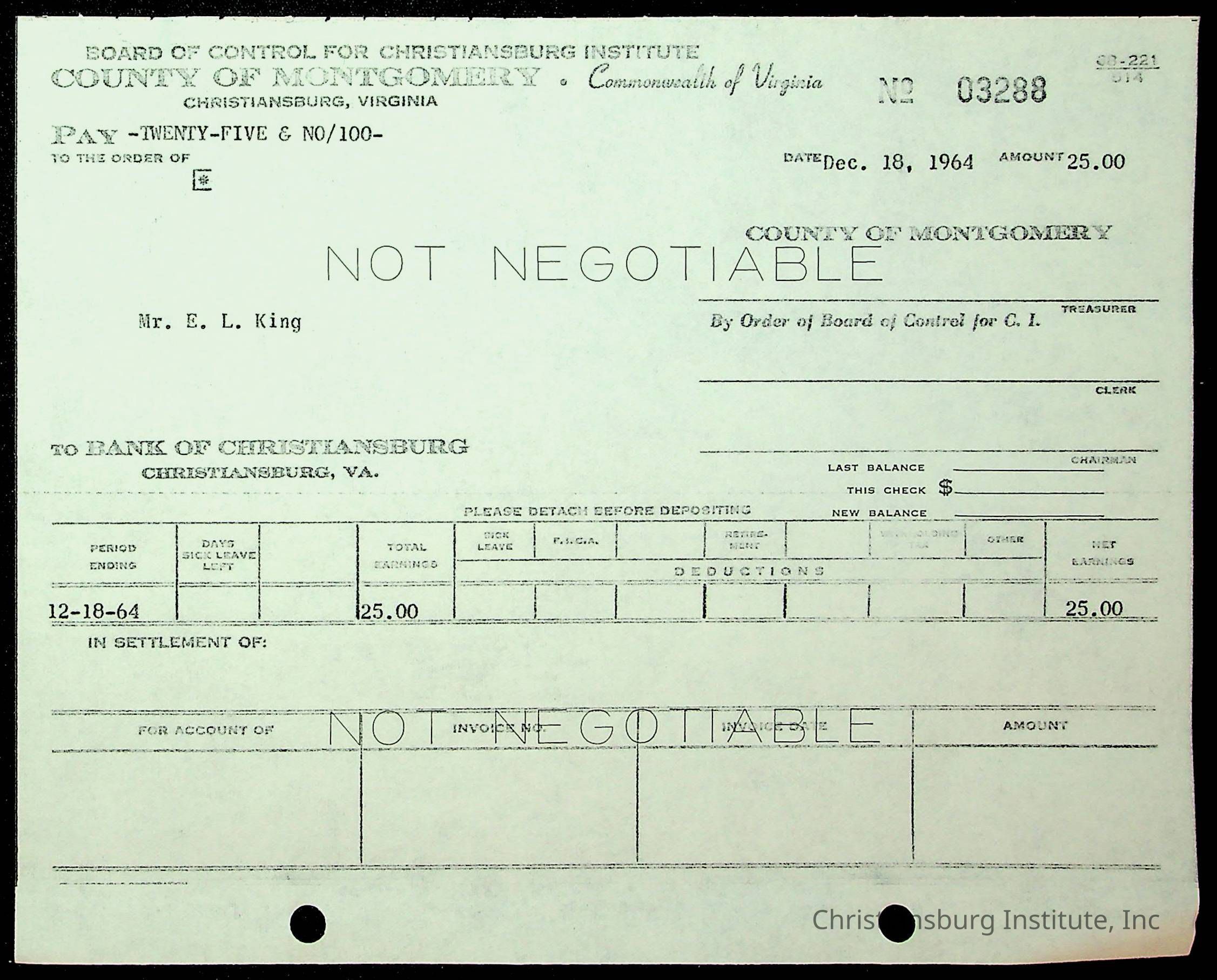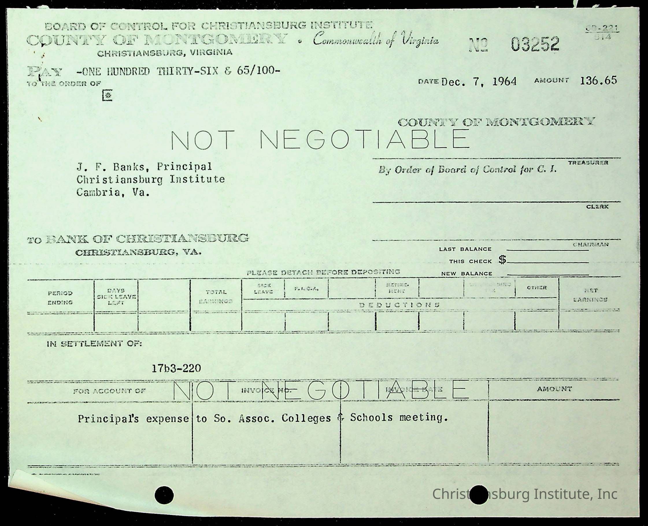 An archive of financial documents relating to the Board of Control for Christiansburg Institute dated 1964-1965. Documents include; bills, statements, and receipts.