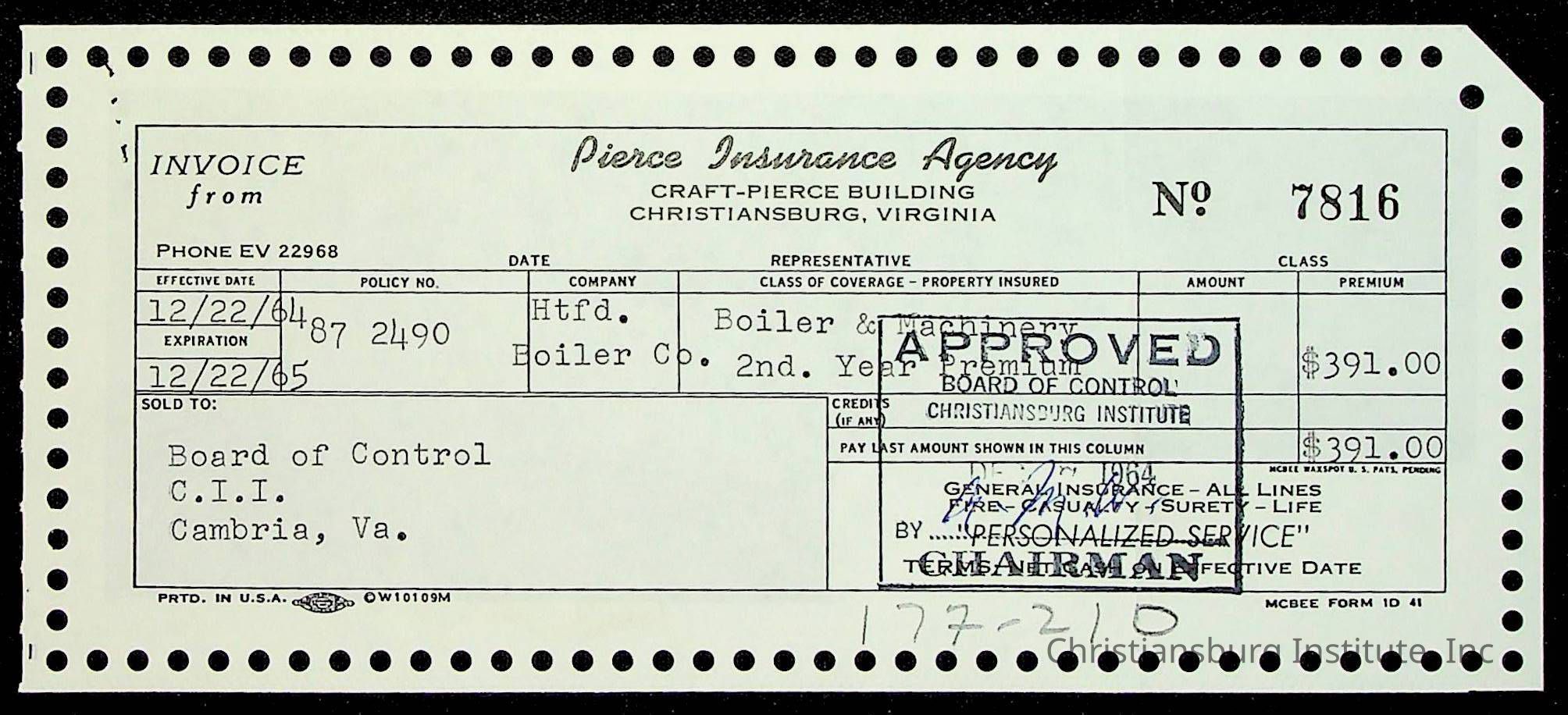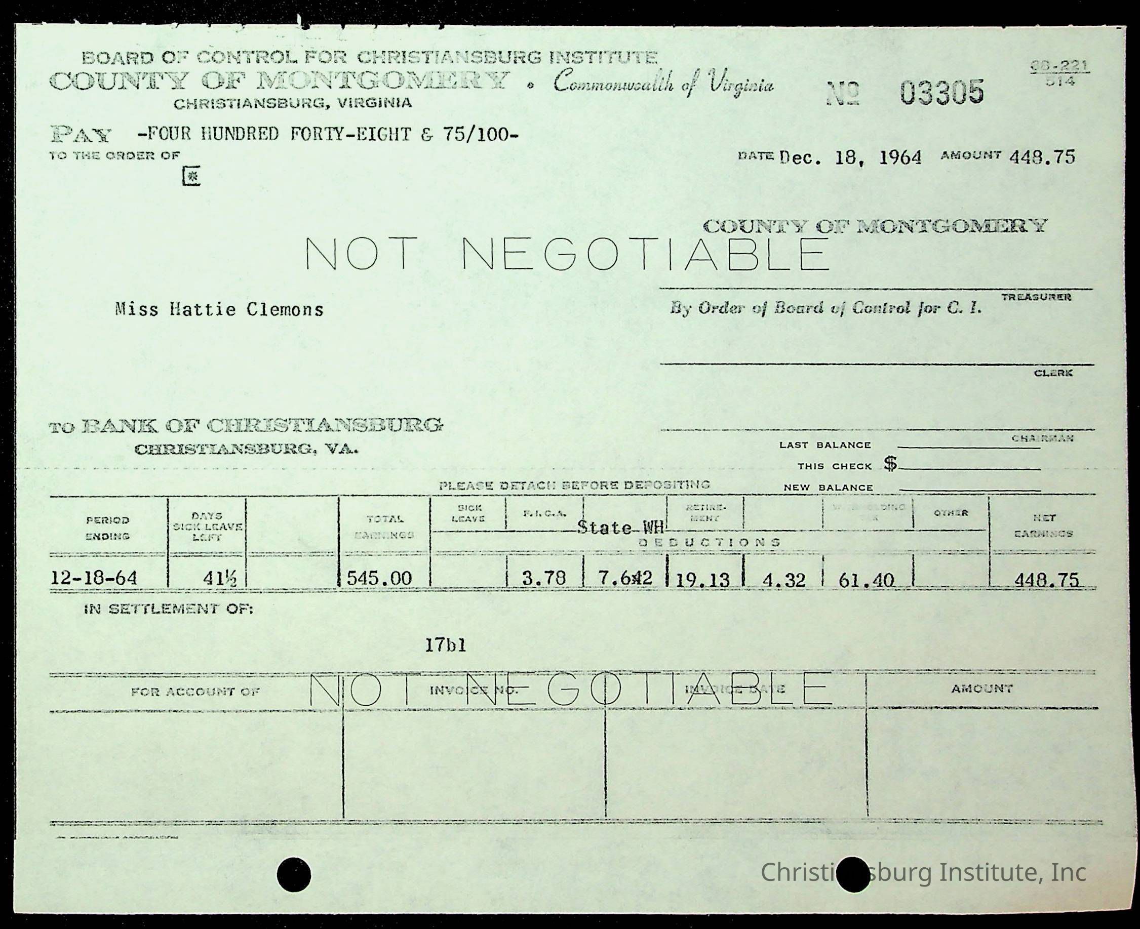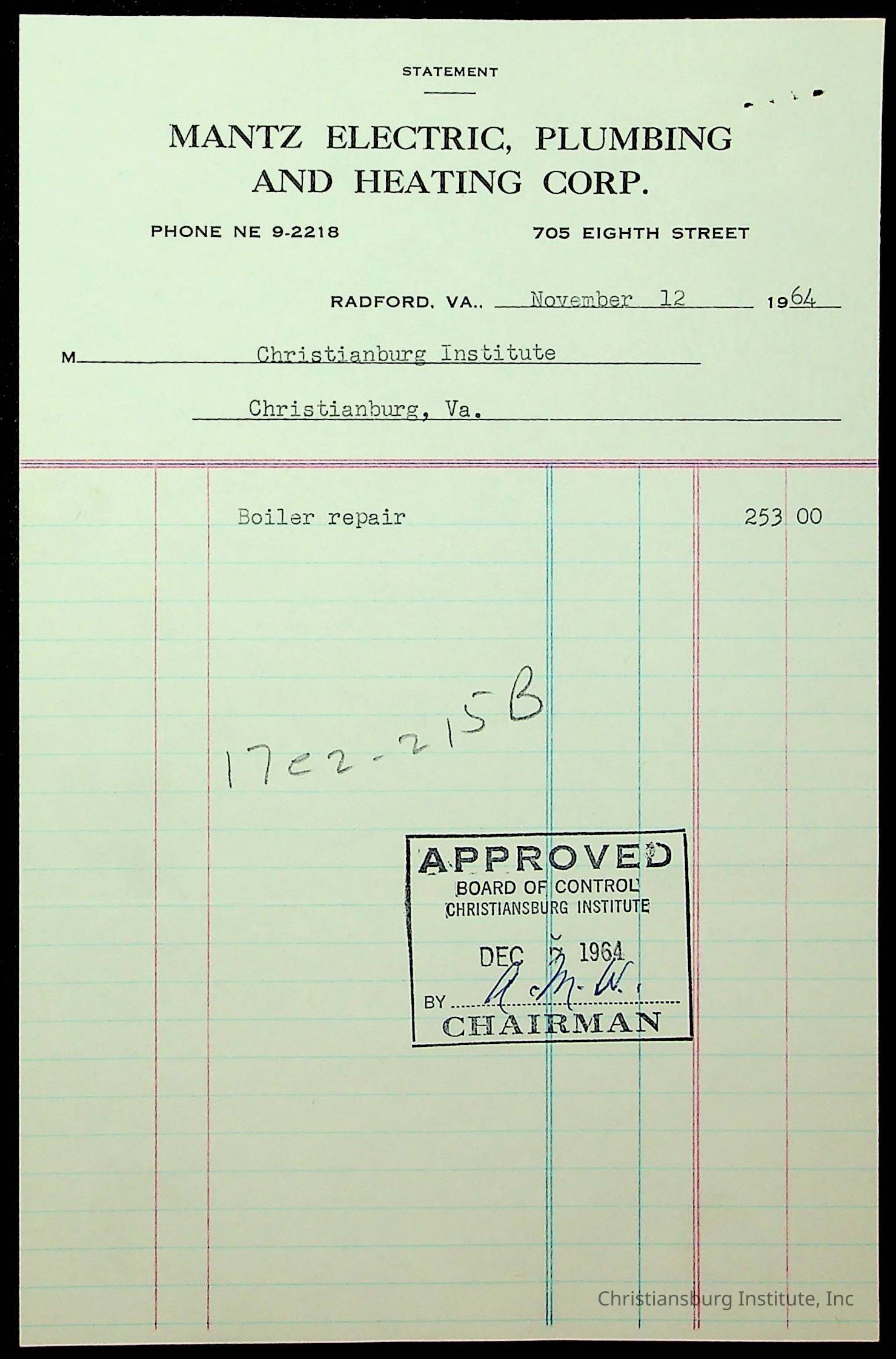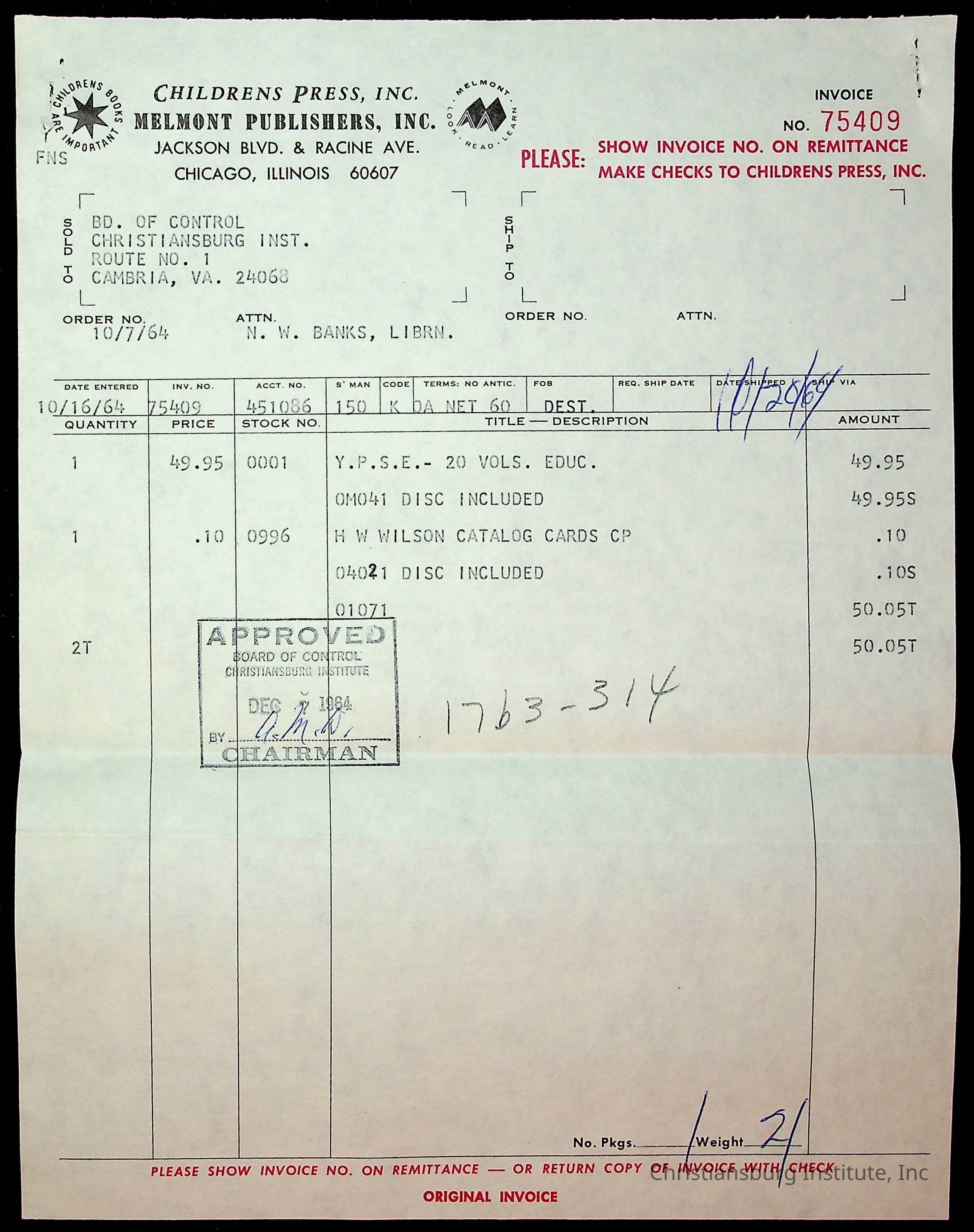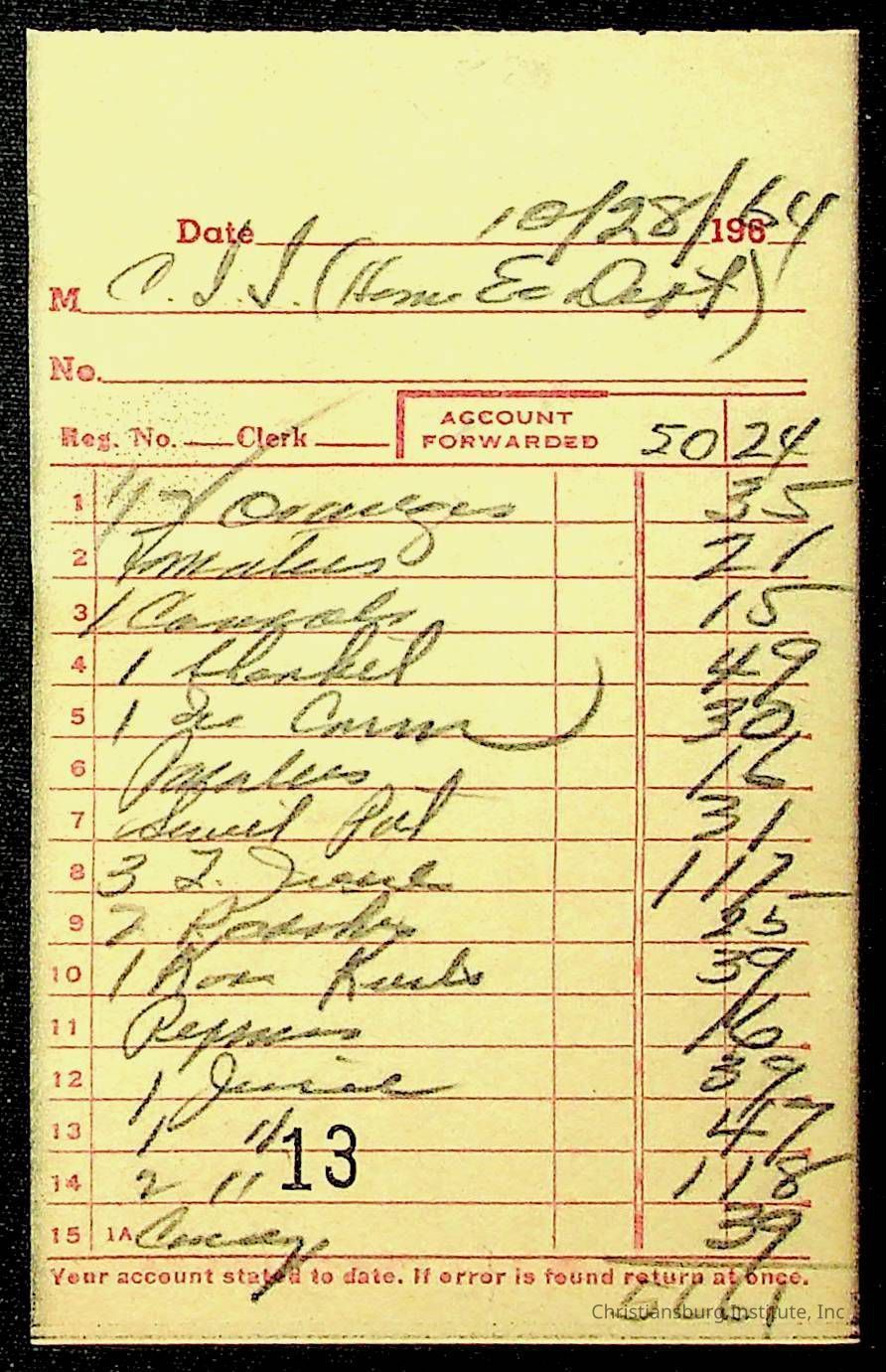 An archive of financial documents relating to the Board of Control for Christiansburg Institute dated 1964-1965. Documents include; bills, statements, and receipts.