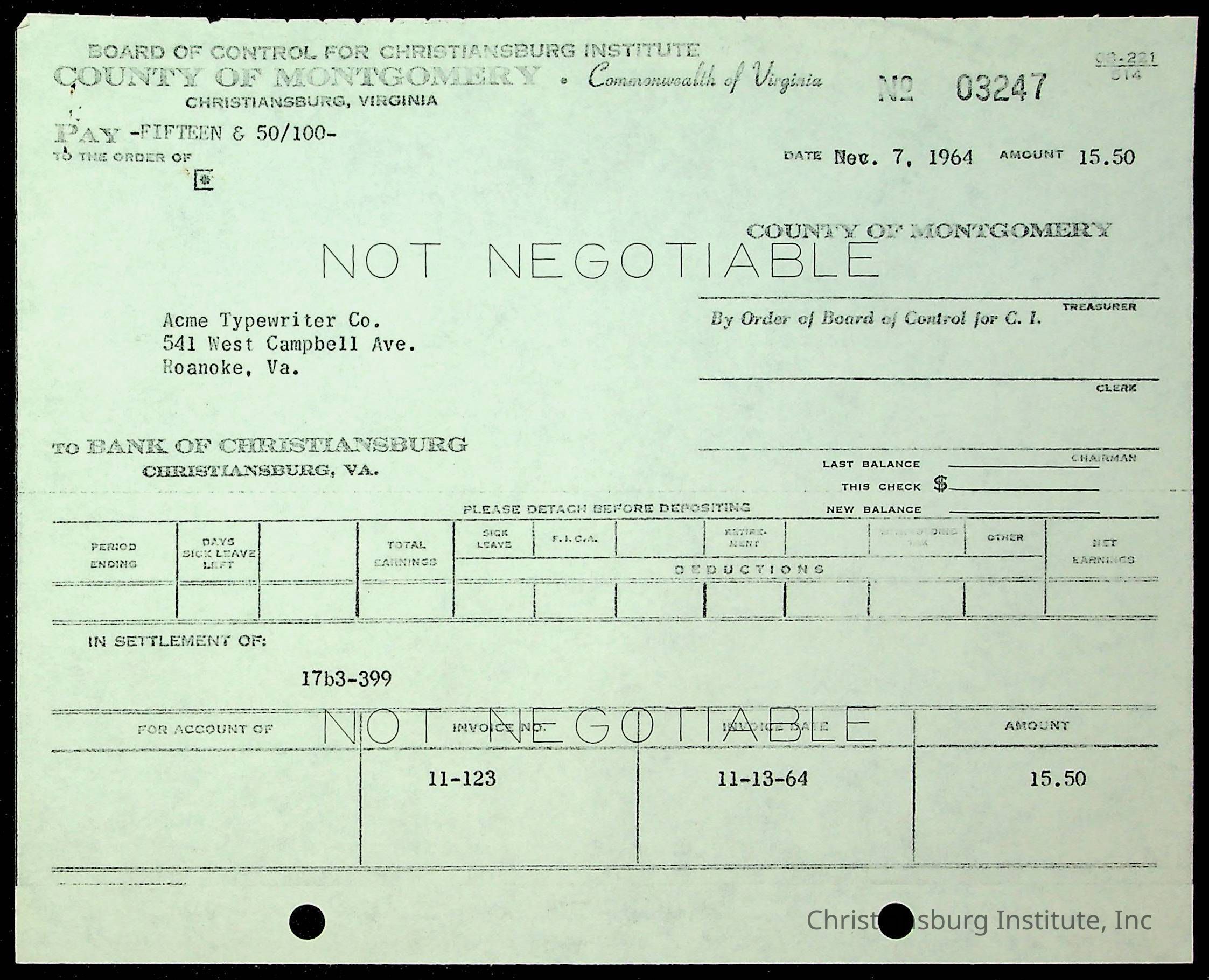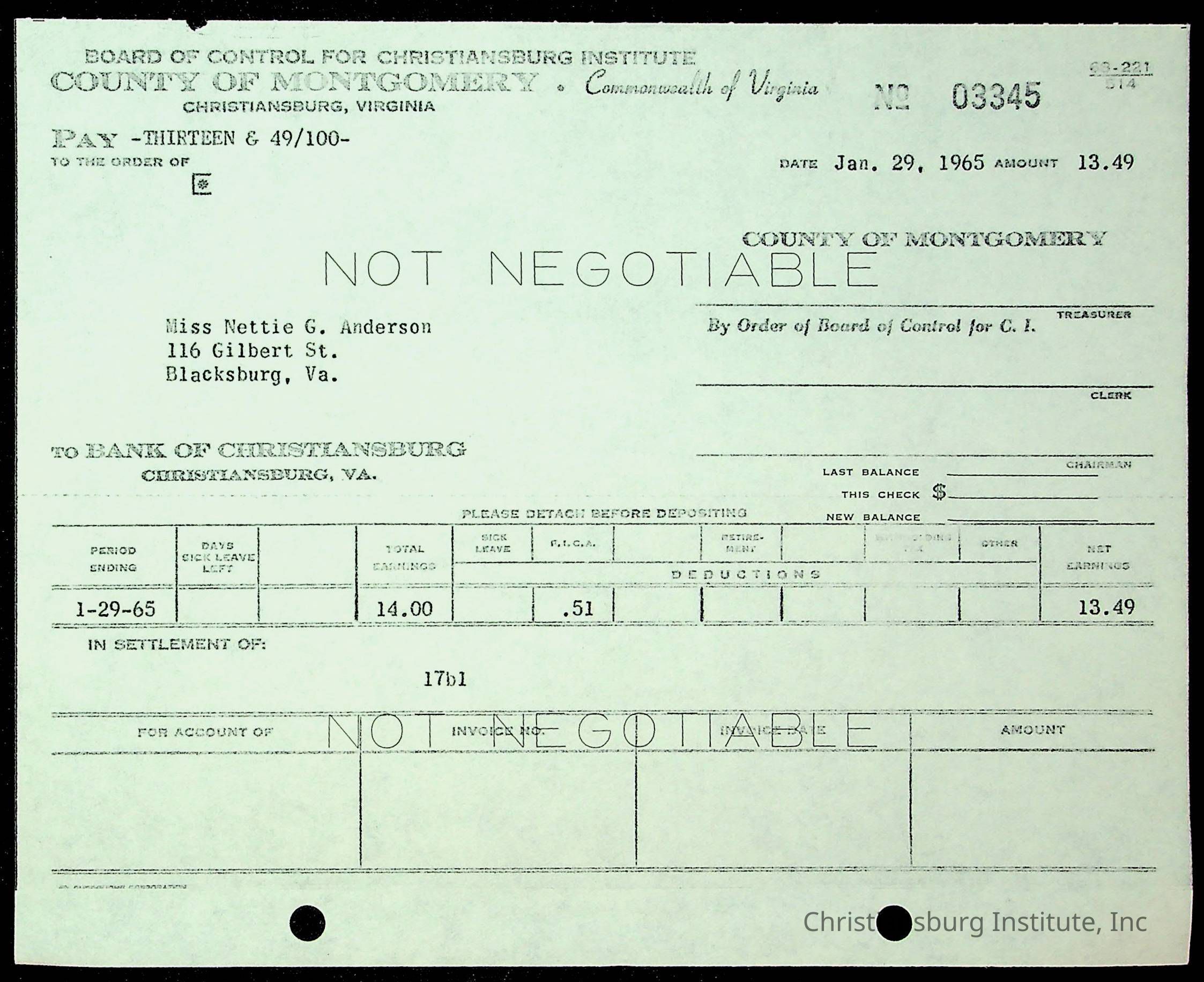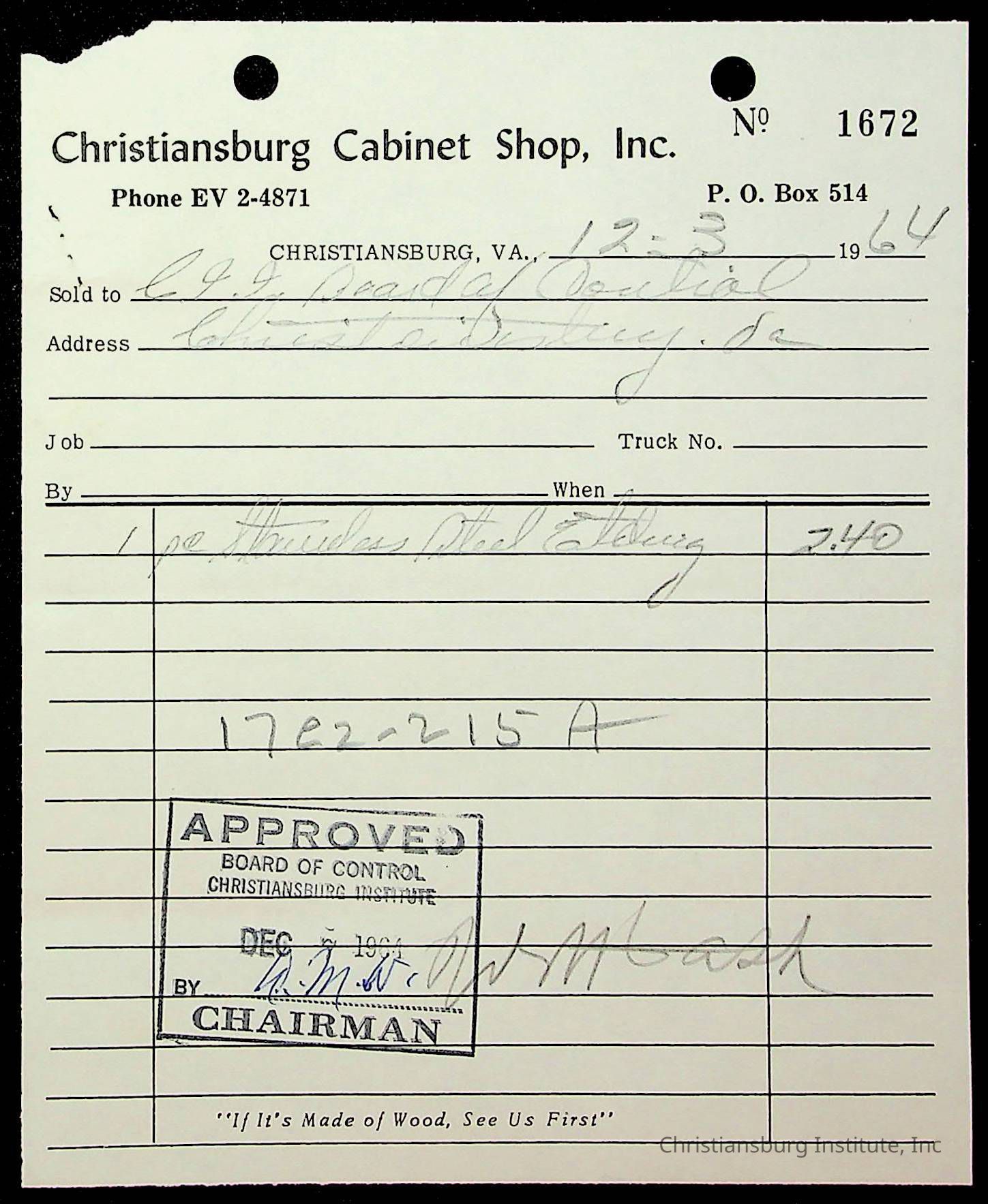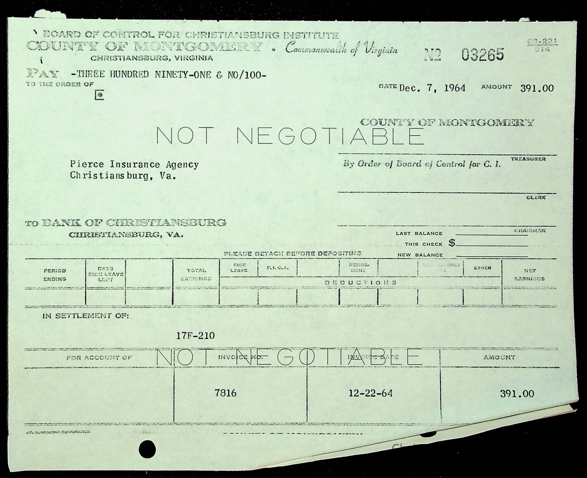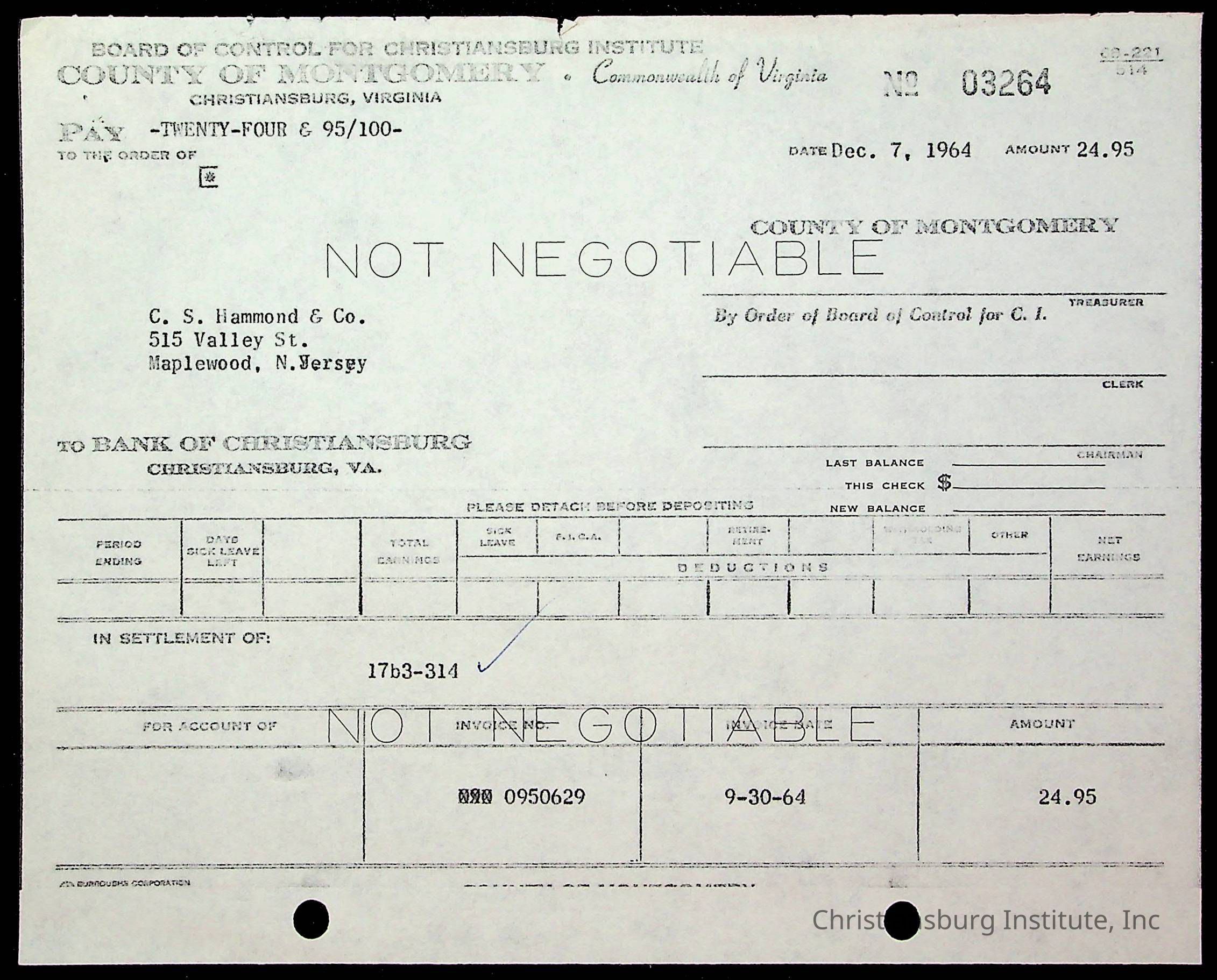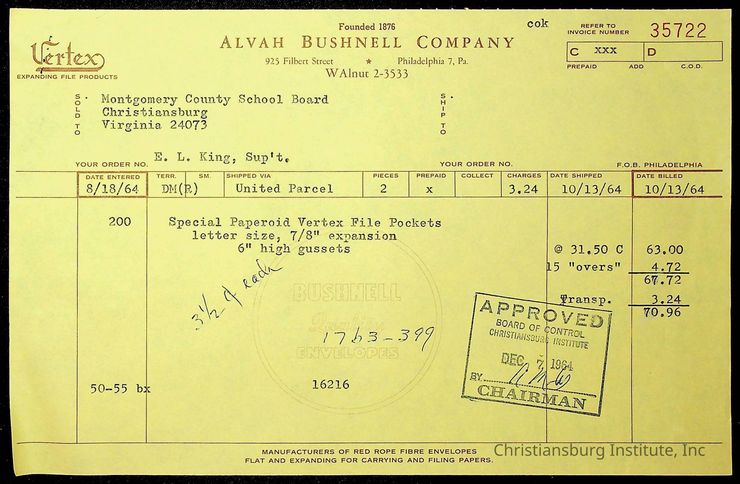 An archive of financial documents relating to the Board of Control for Christiansburg Institute dated 1964-1965. Documents include; bills, statements, and receipts.