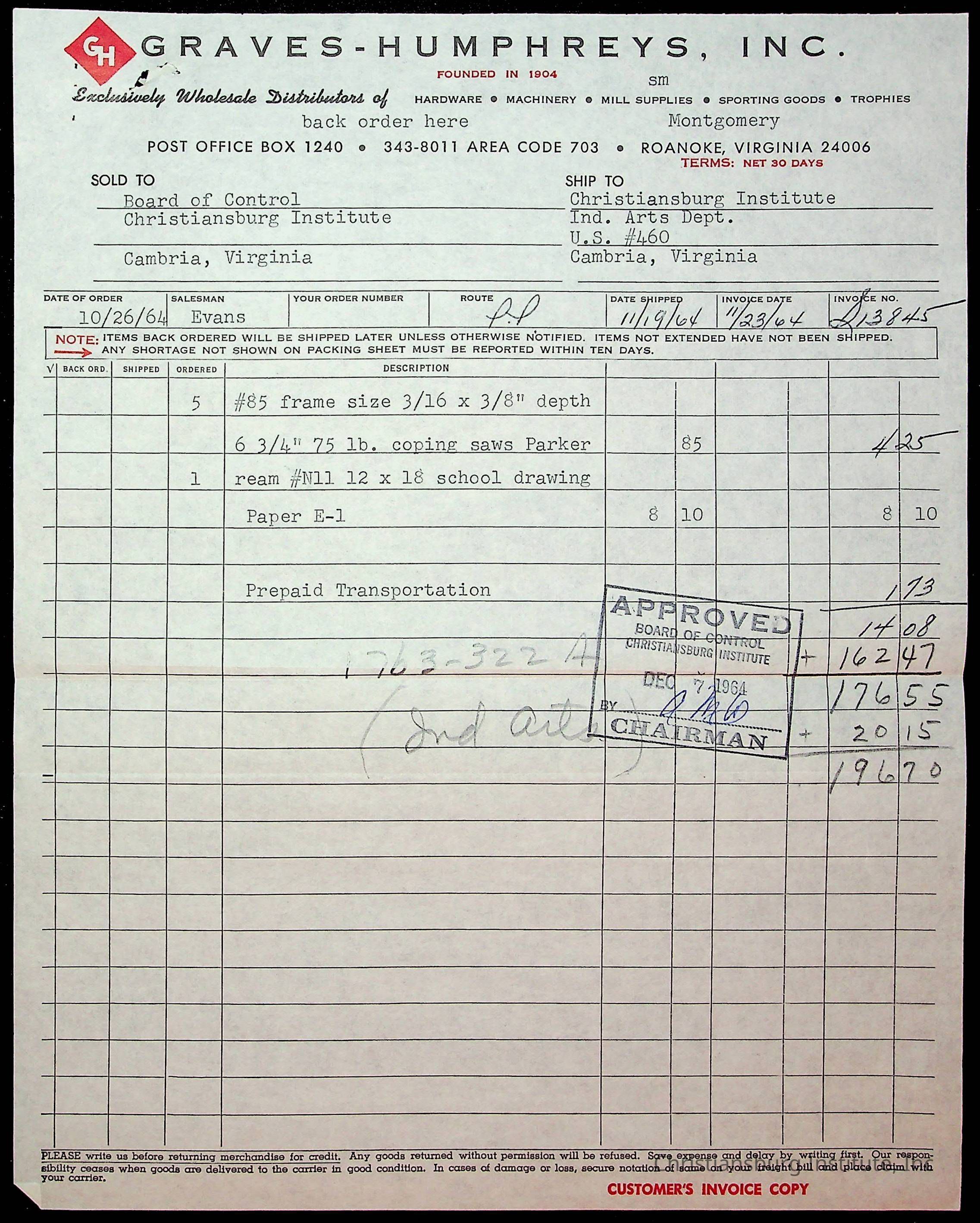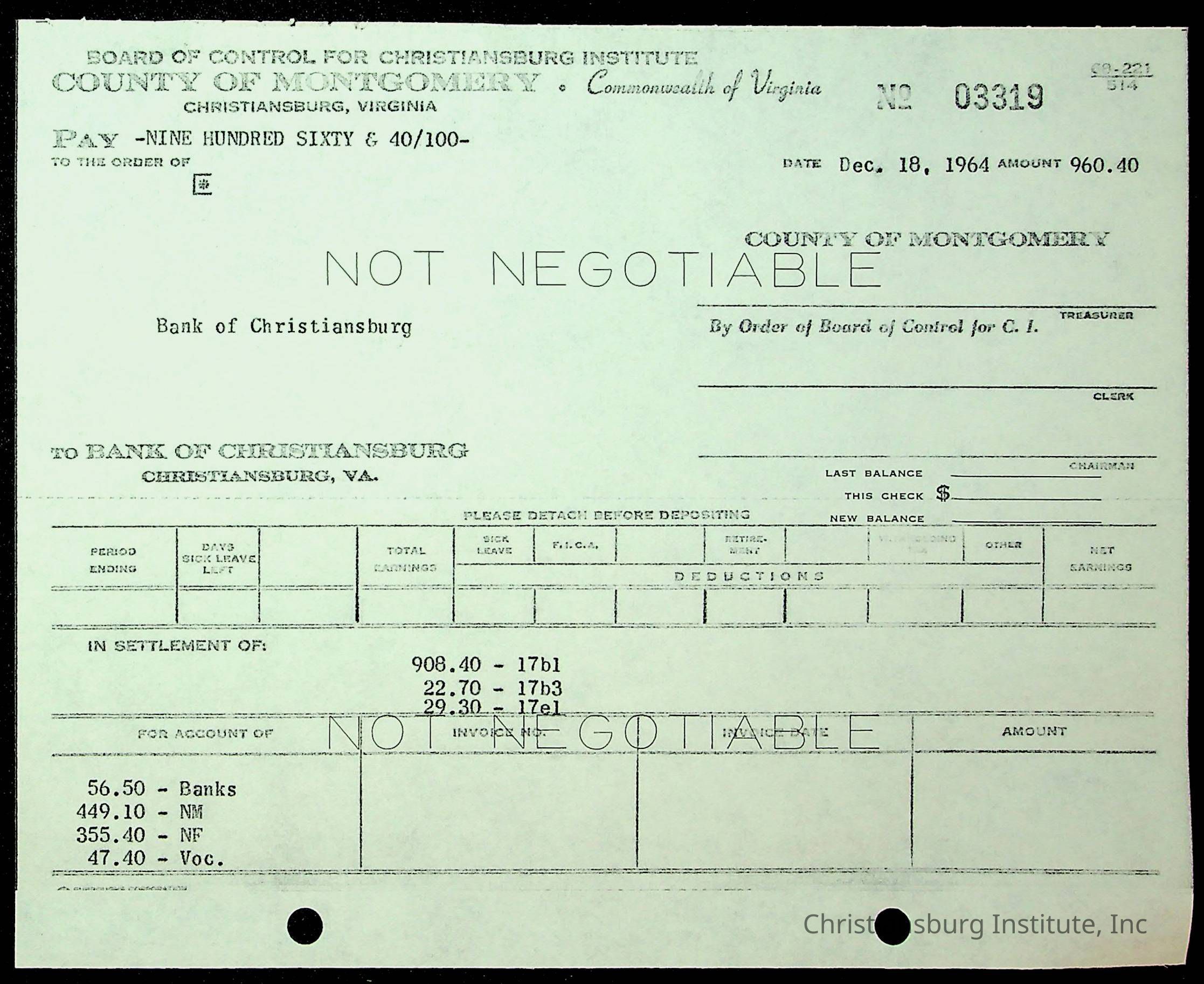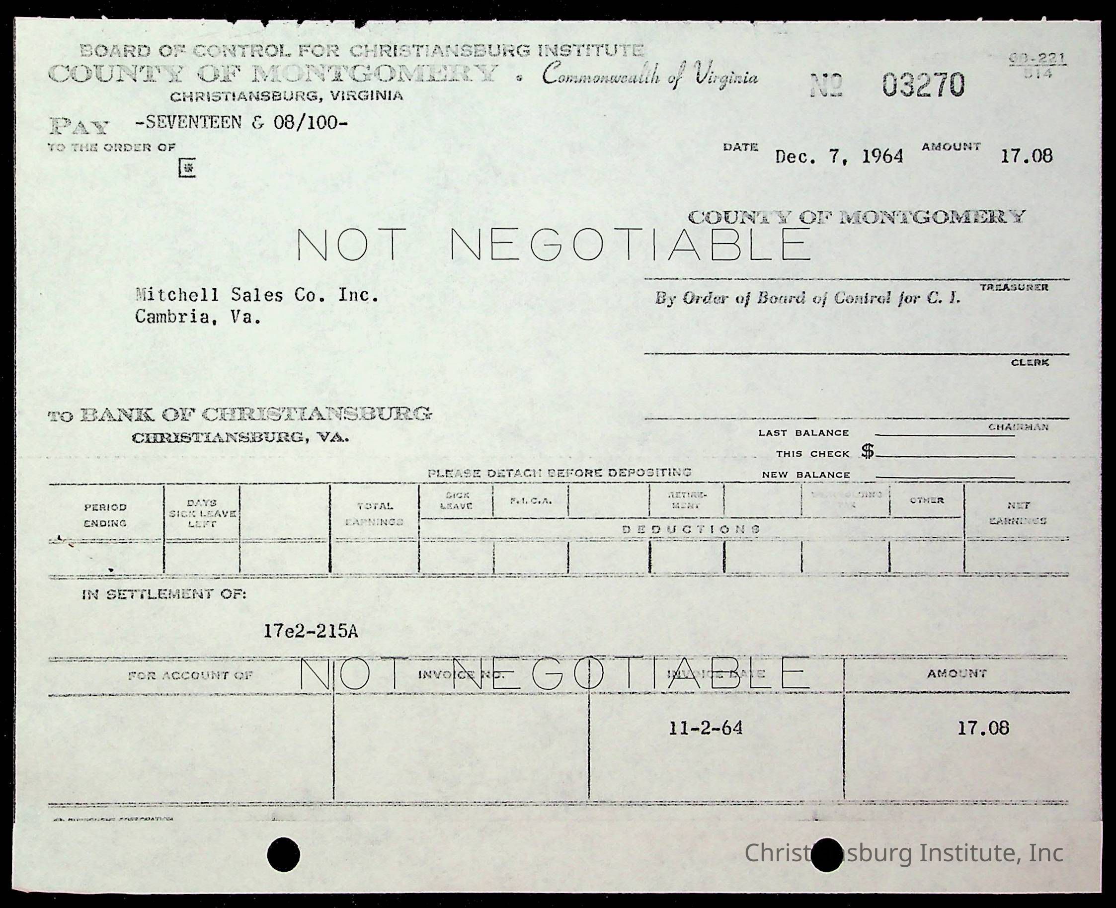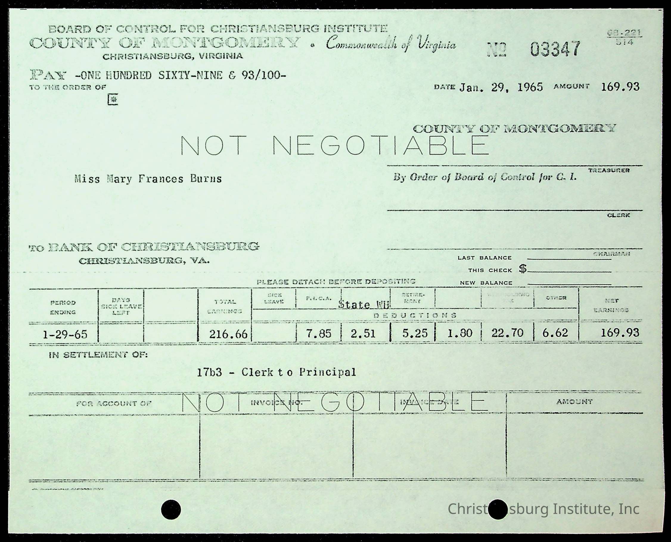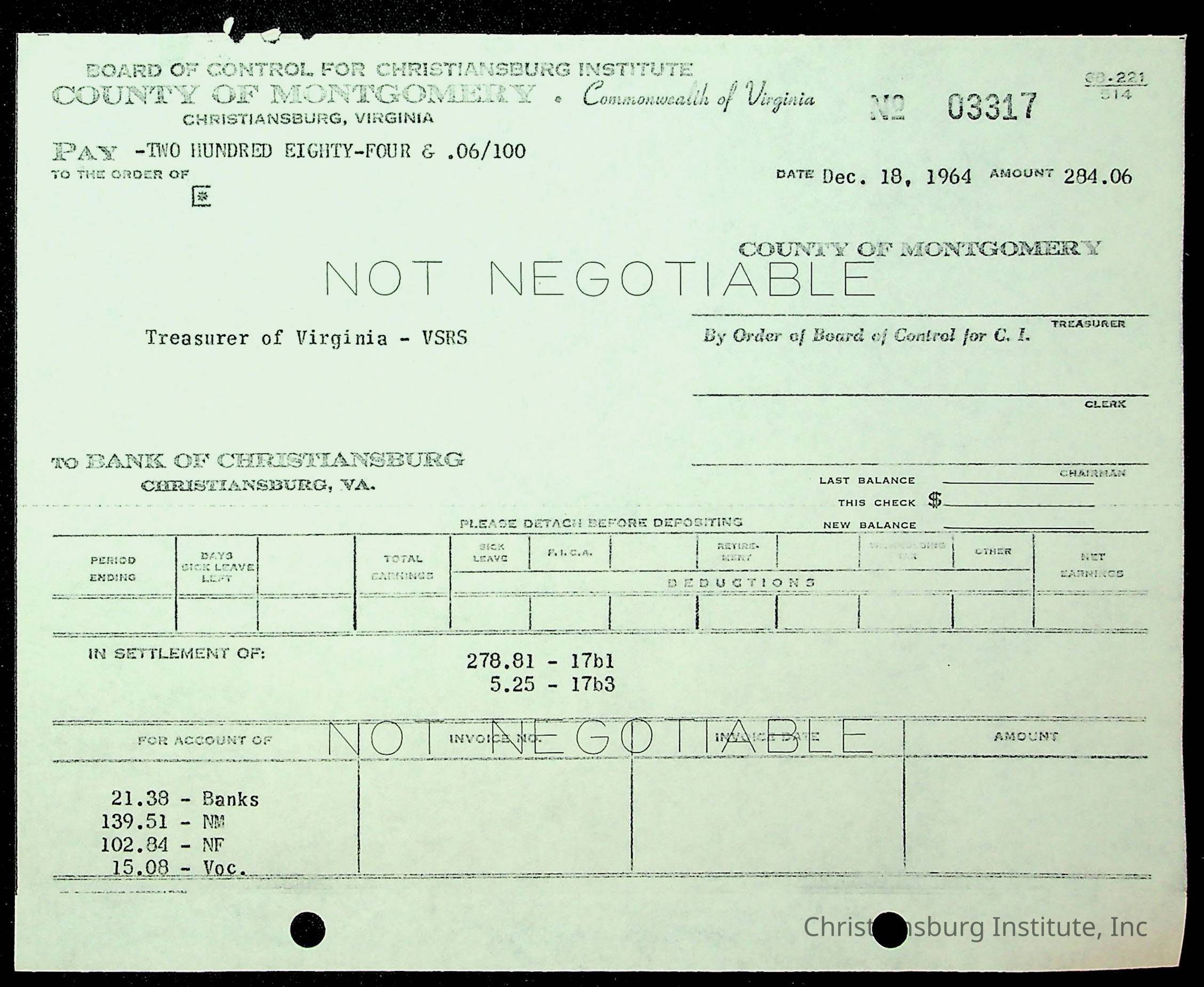 An archive of financial documents relating to the Board of Control for Christiansburg Institute dated 1964-1965. Documents include; bills, statements, and receipts.