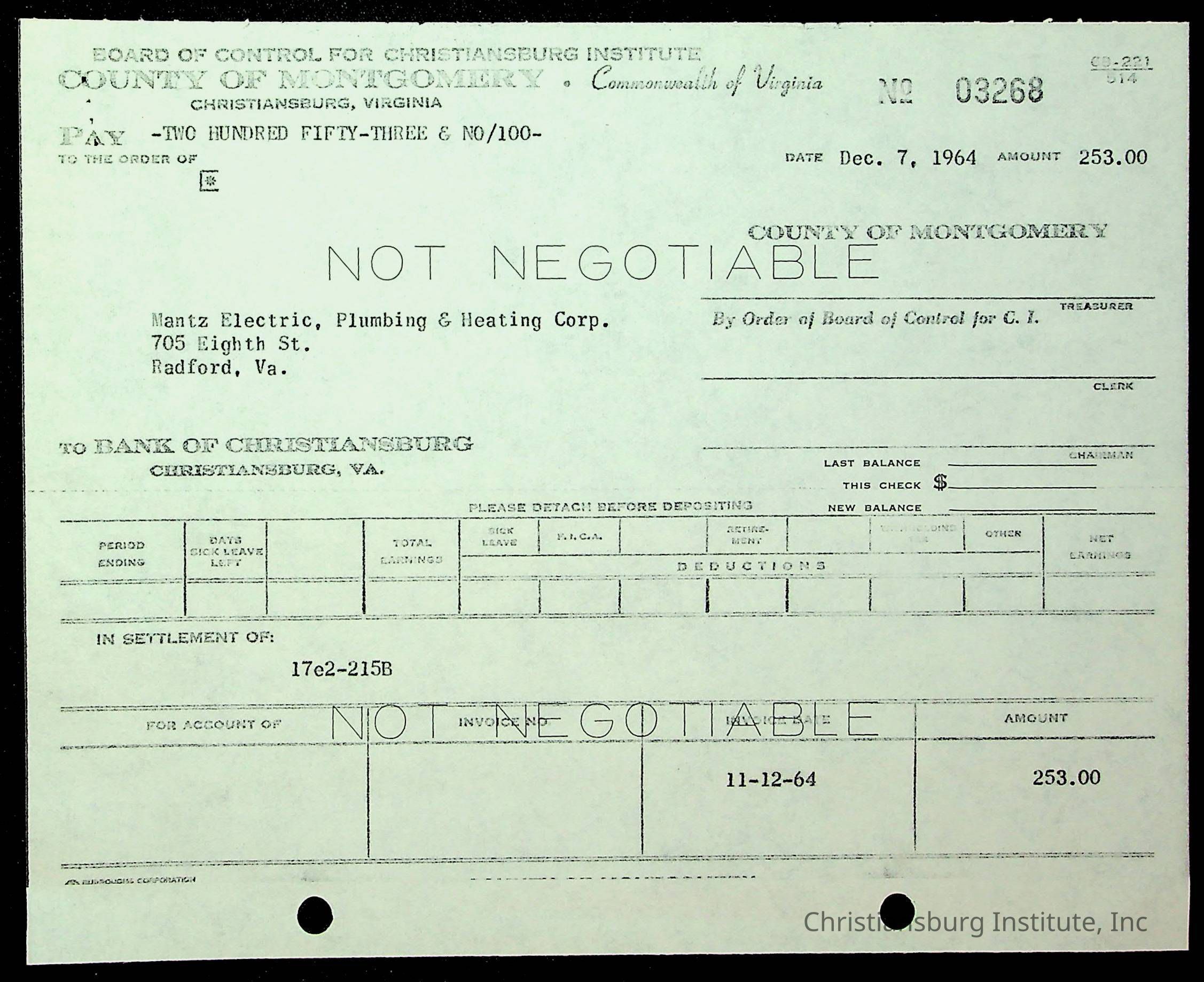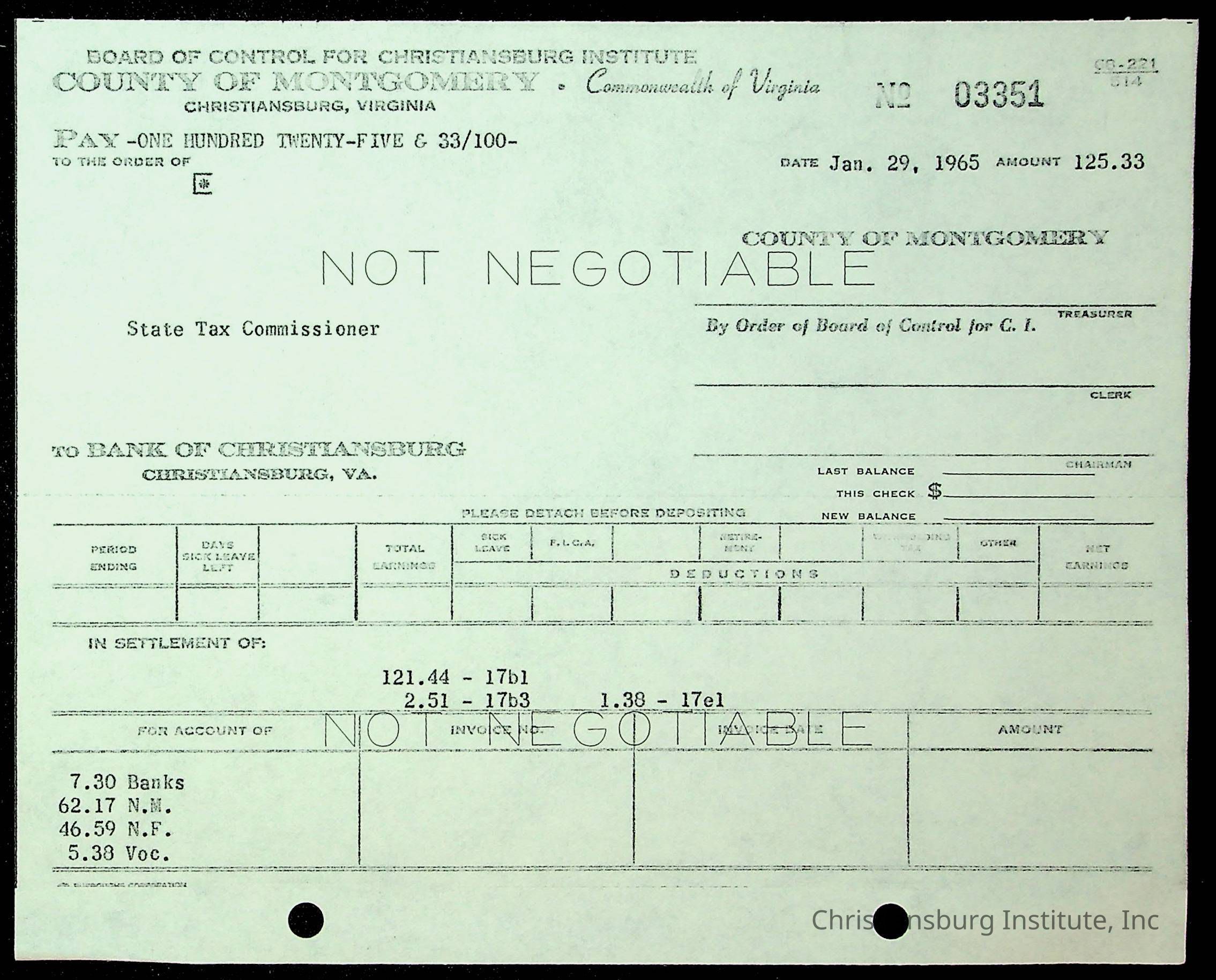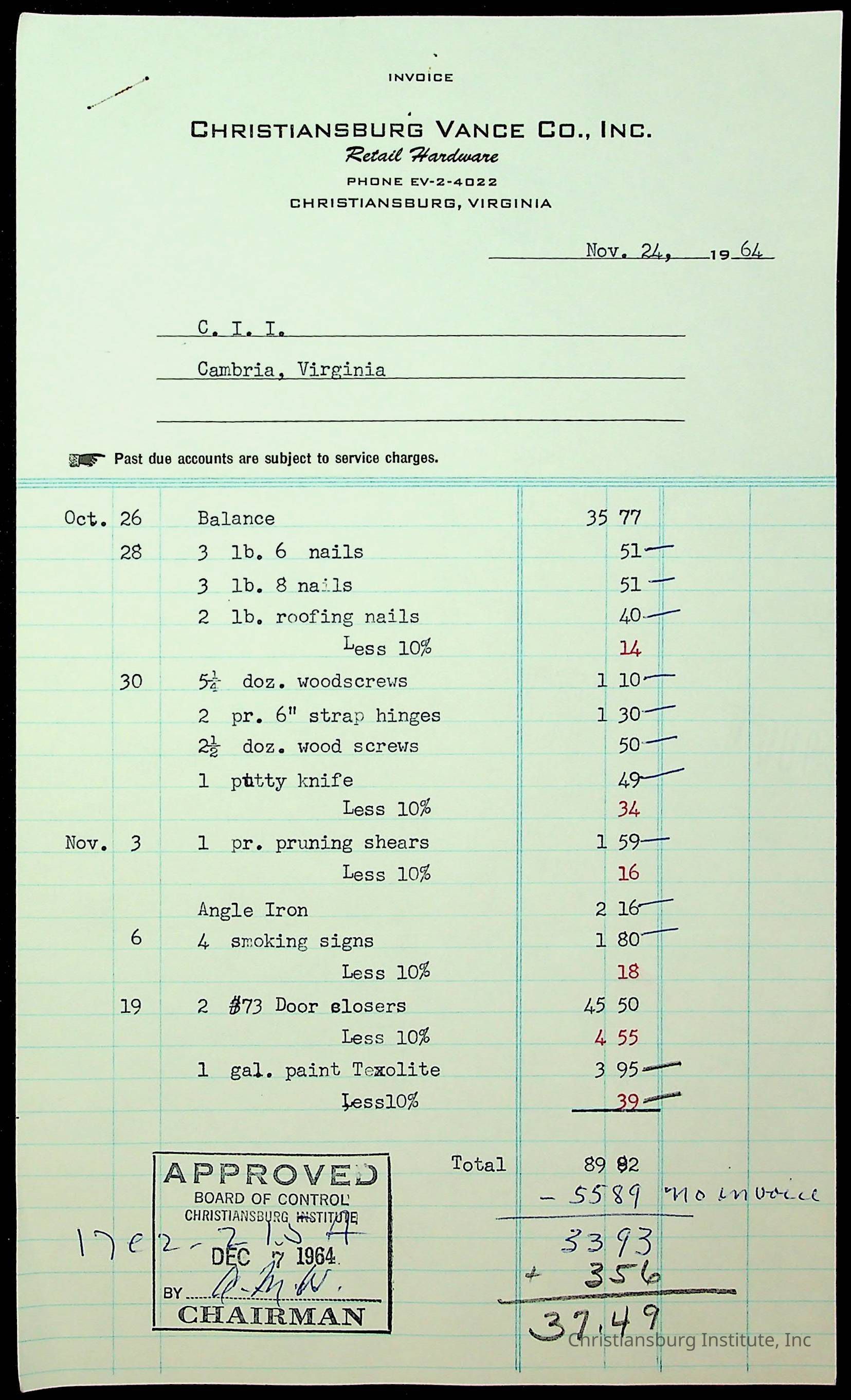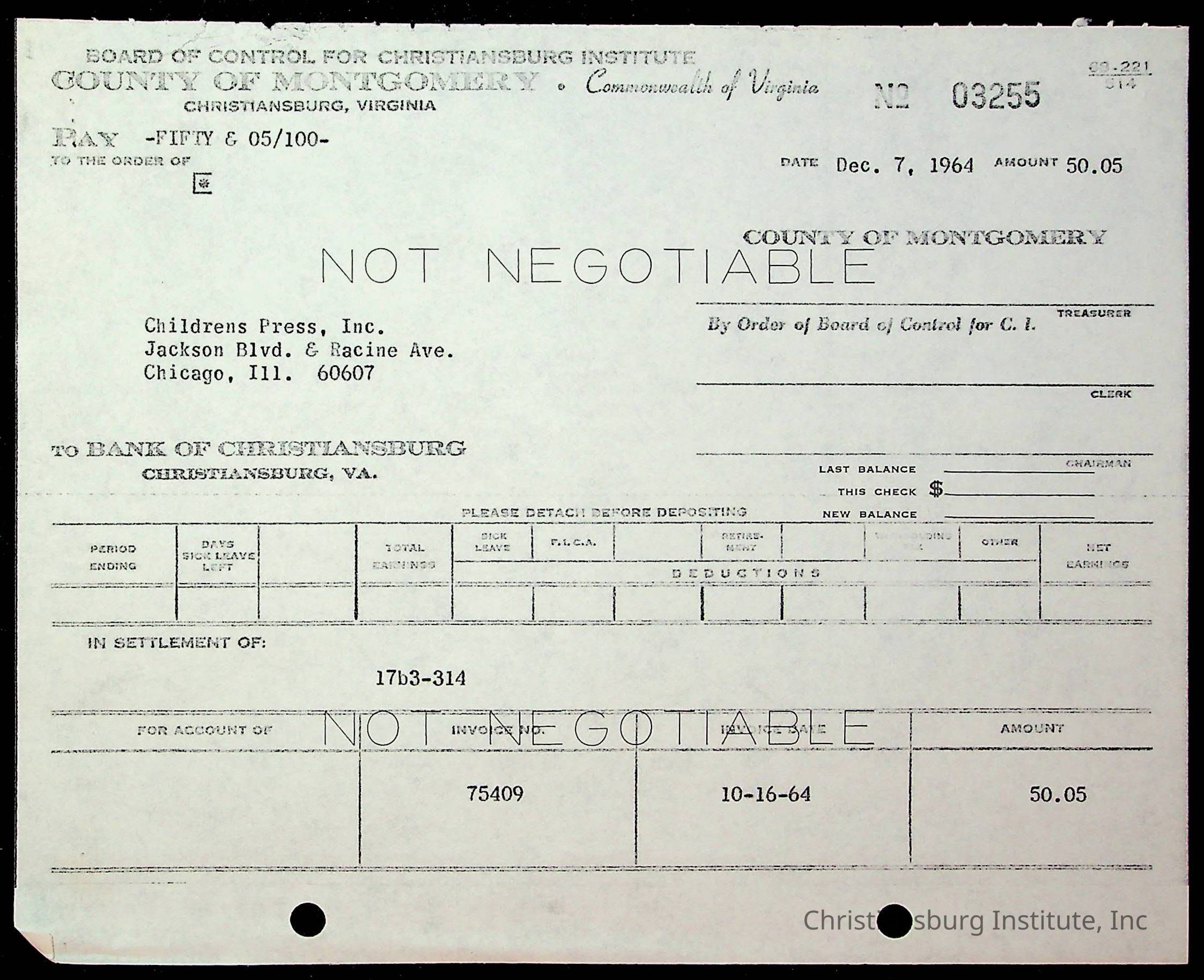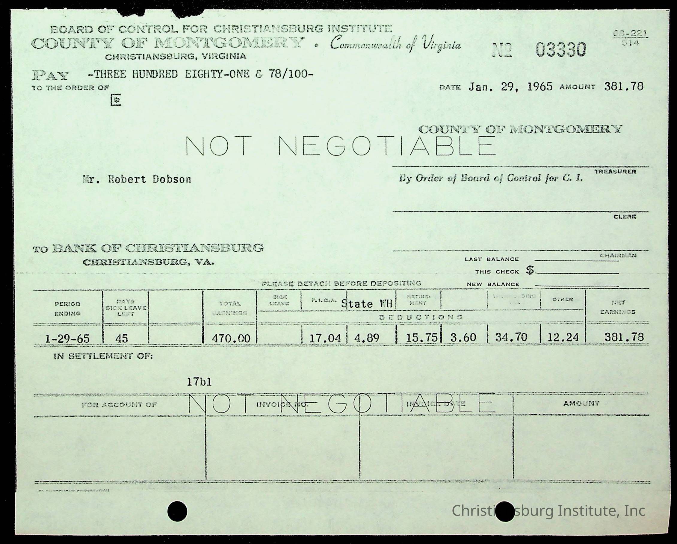 An archive of financial documents relating to the Board of Control for Christiansburg Institute dated 1964-1965. Documents include; bills, statements, and receipts.