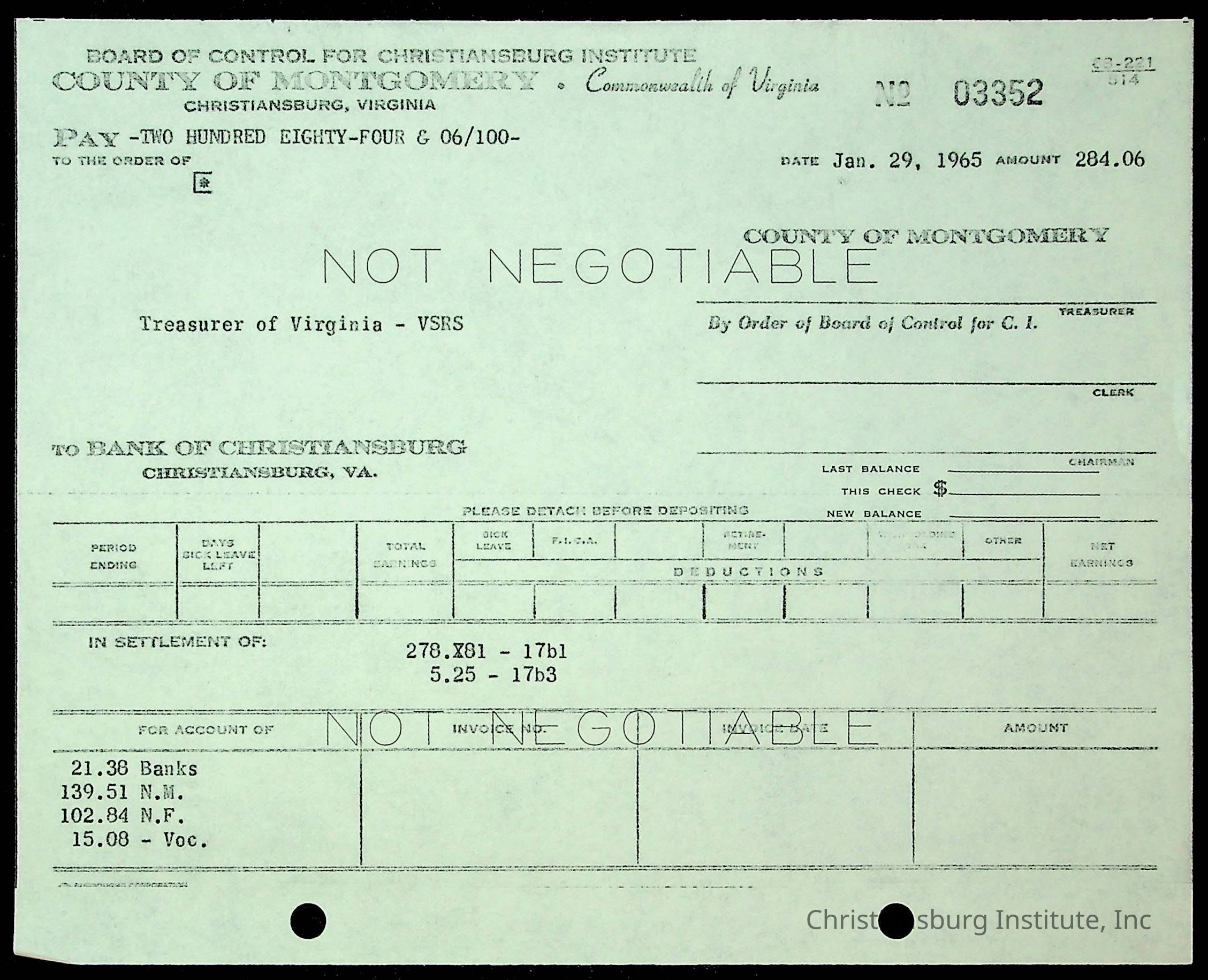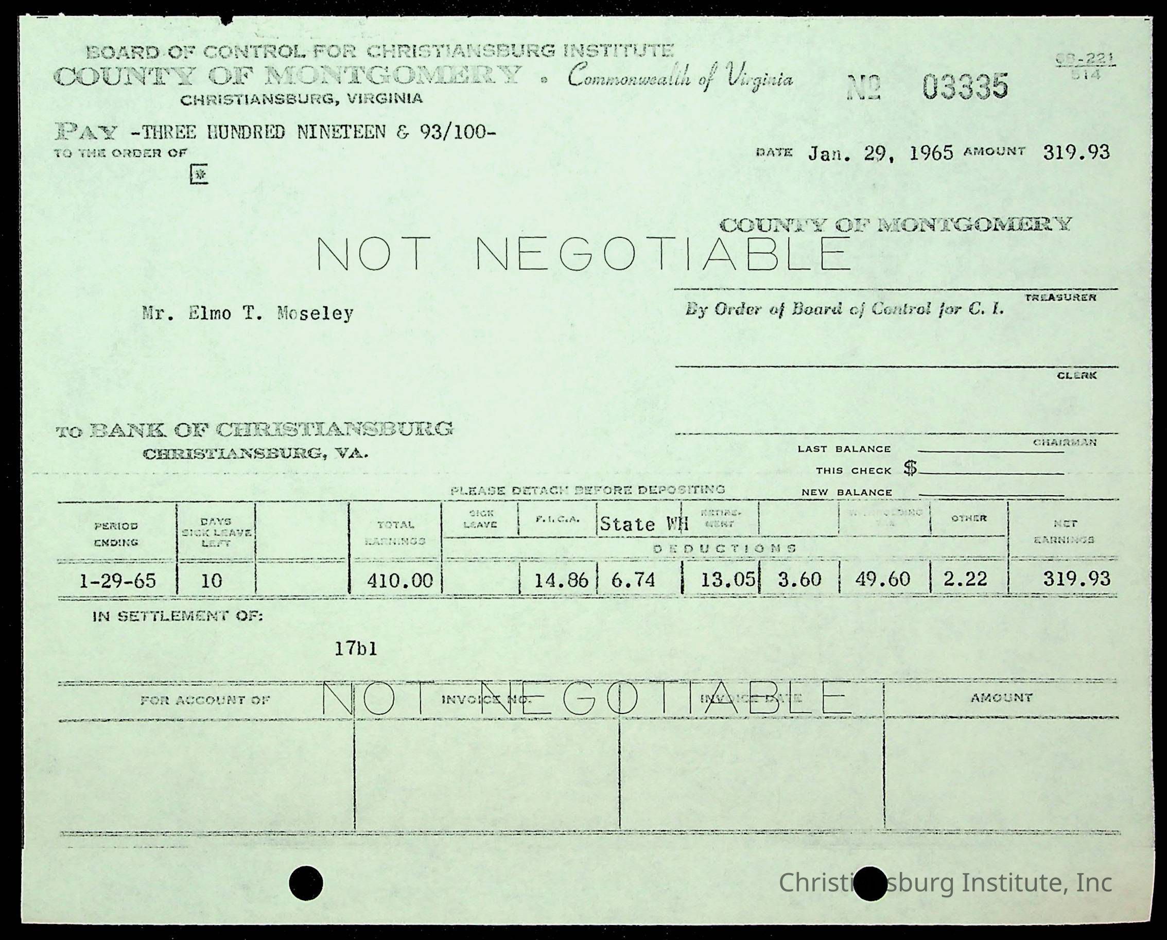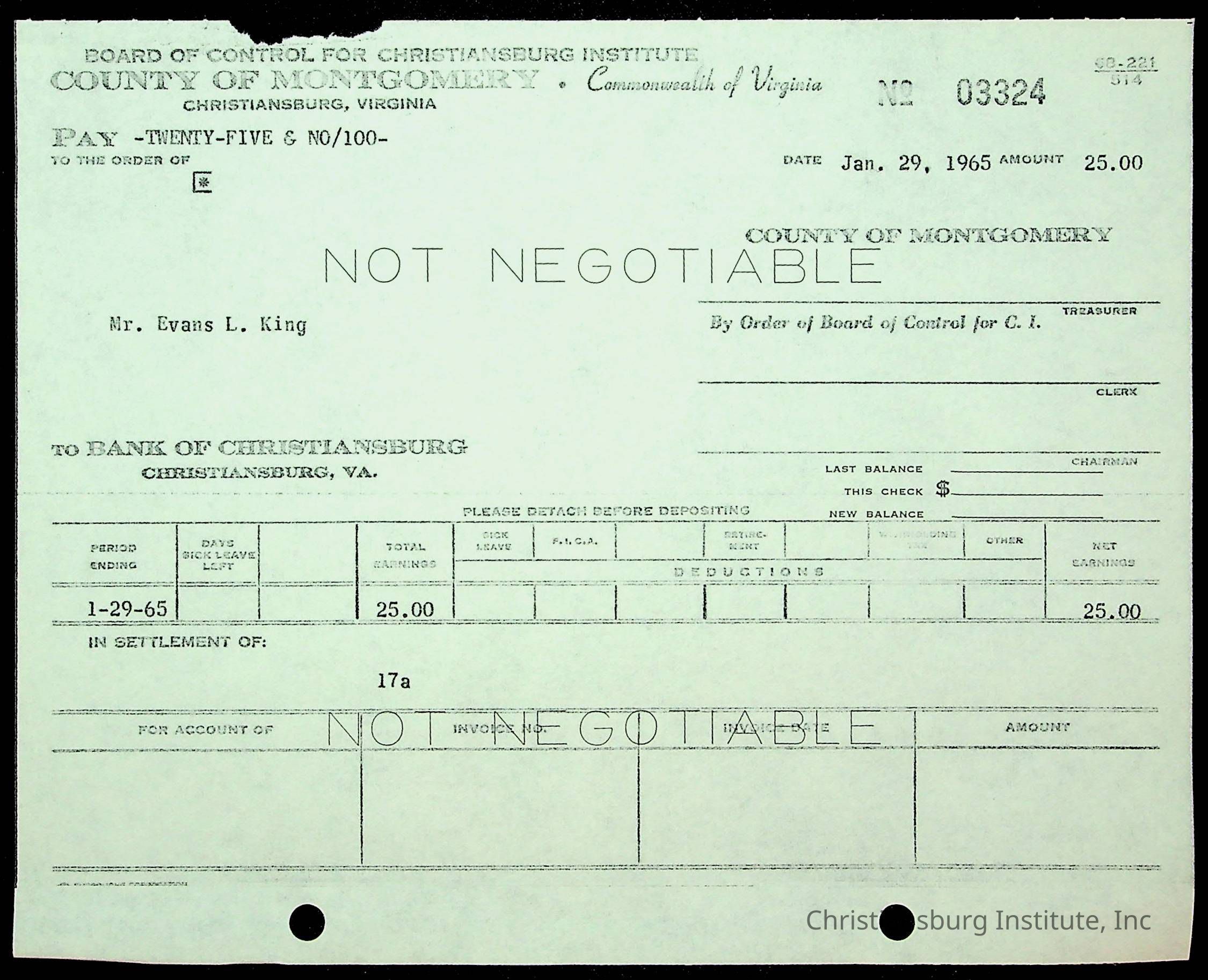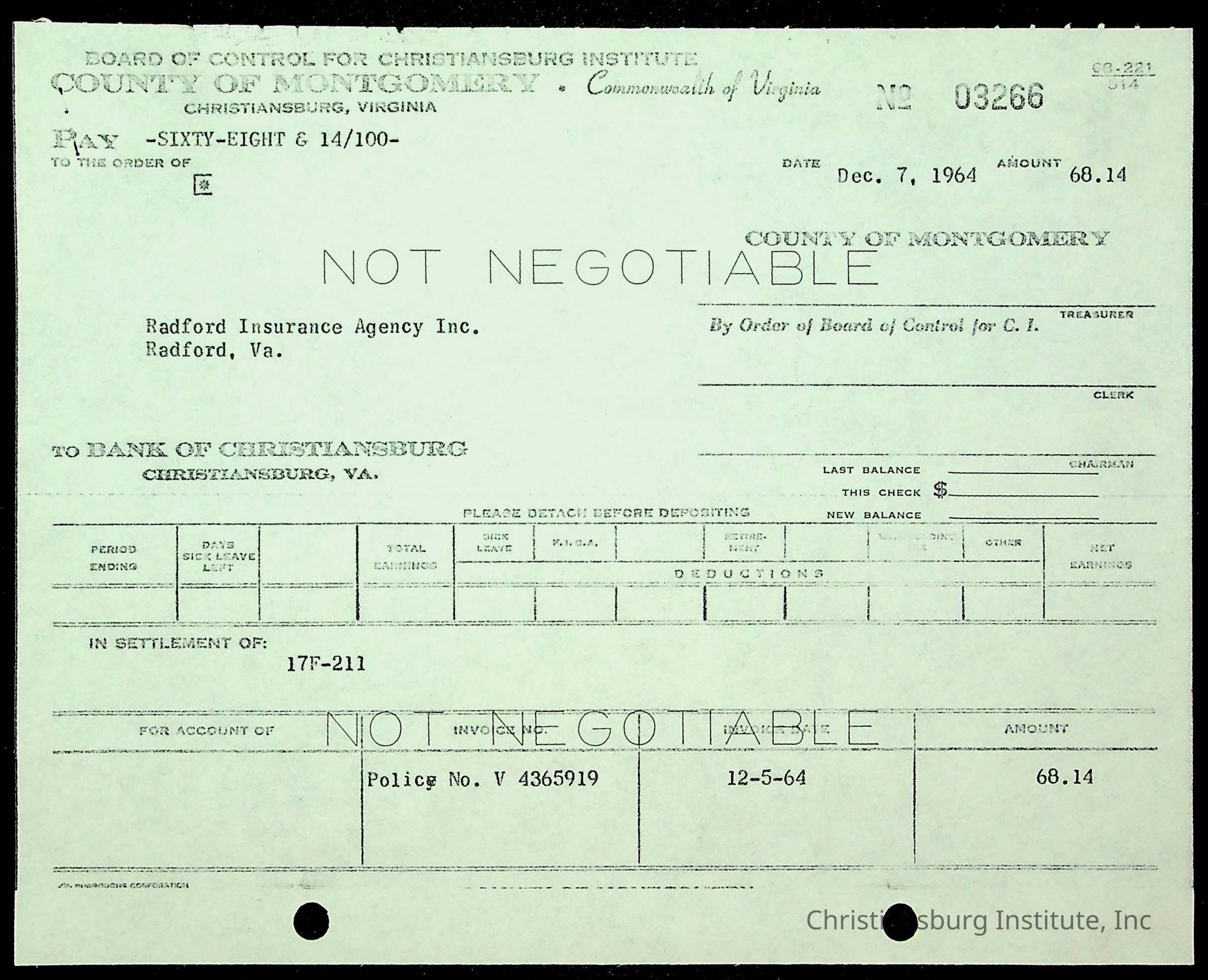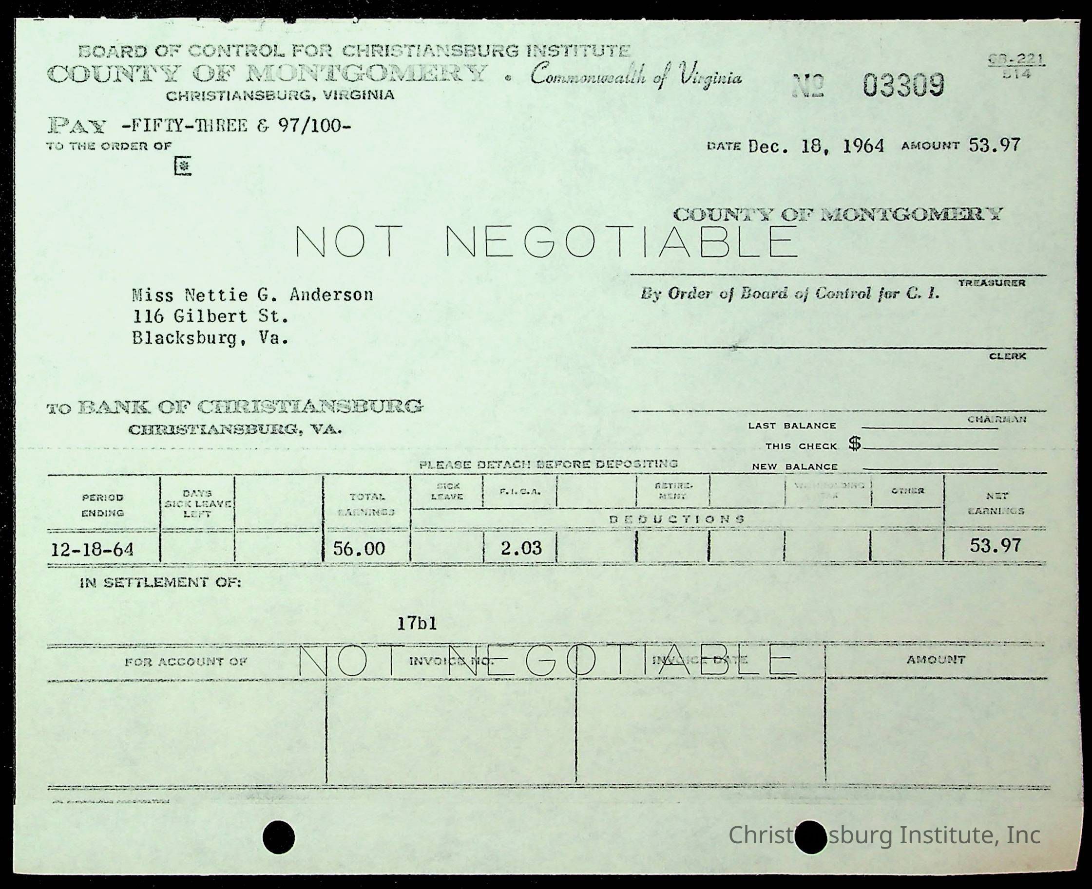An archive of financial documents relating to the Board of Control for Christiansburg Institute dated 1964-1965. Documents include; bills, statements, and receipts.