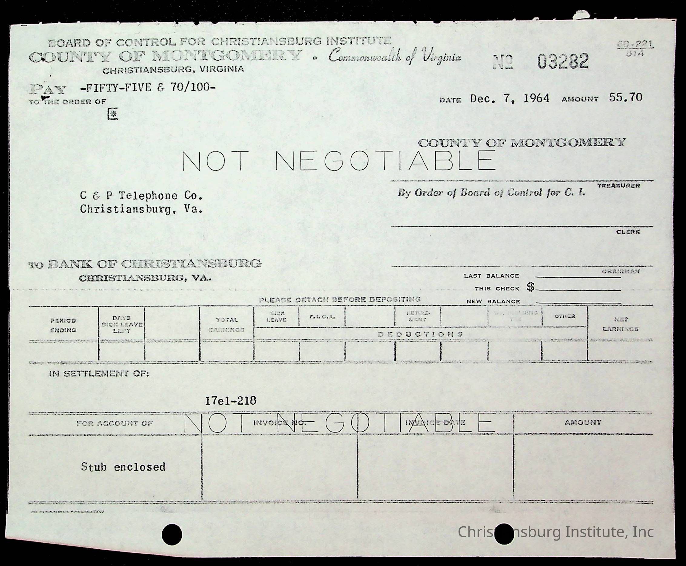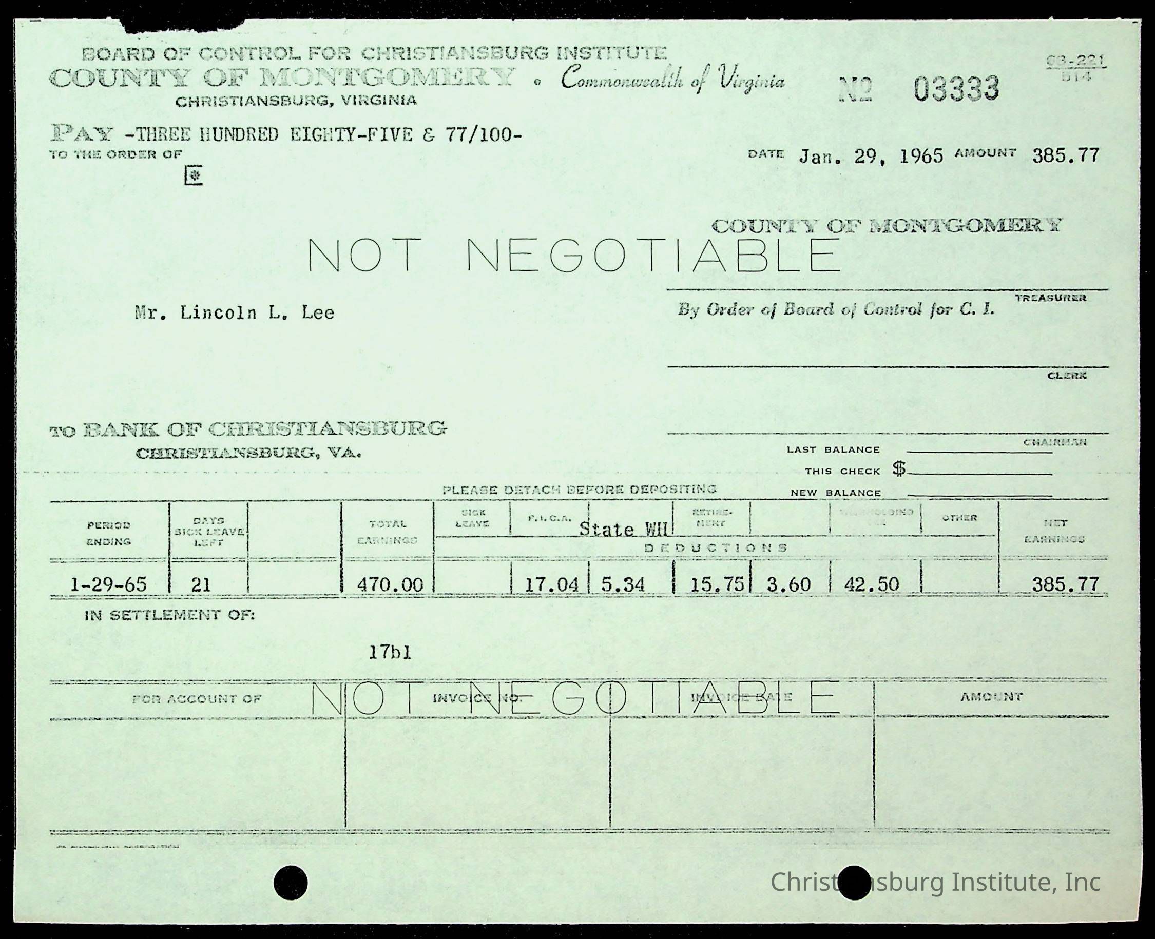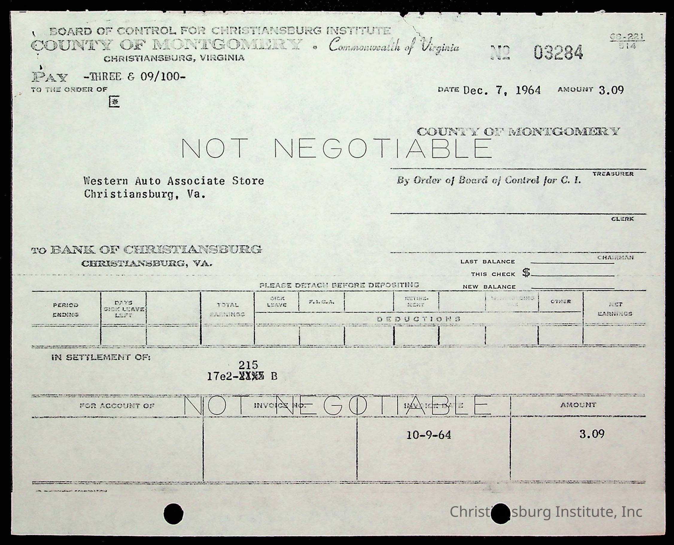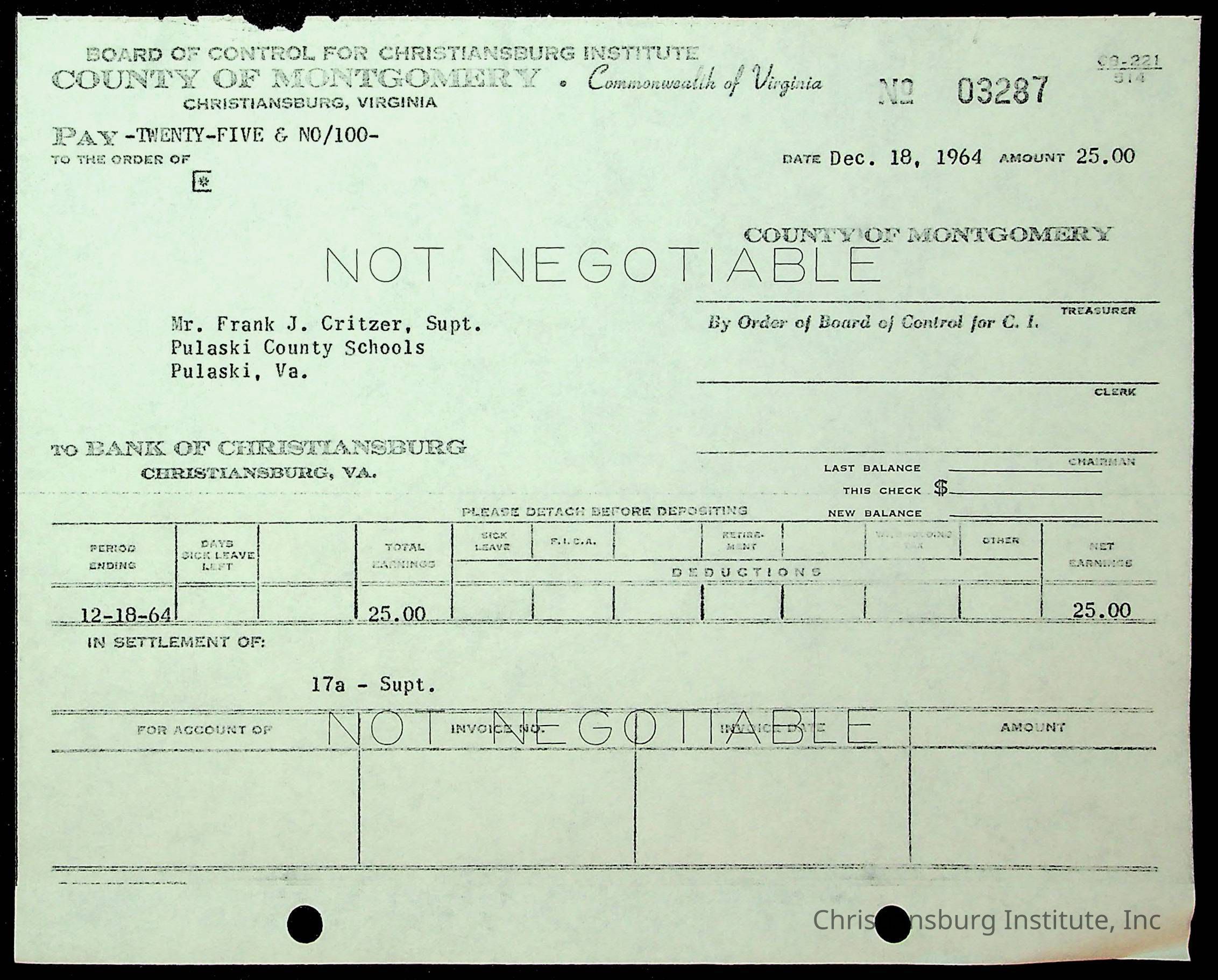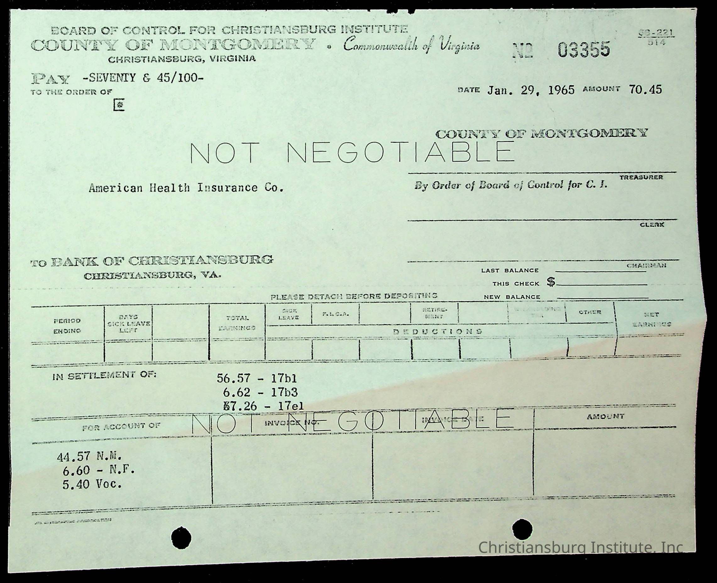 An archive of financial documents relating to the Board of Control for Christiansburg Institute dated 1964-1965. Documents include; bills, statements, and receipts.