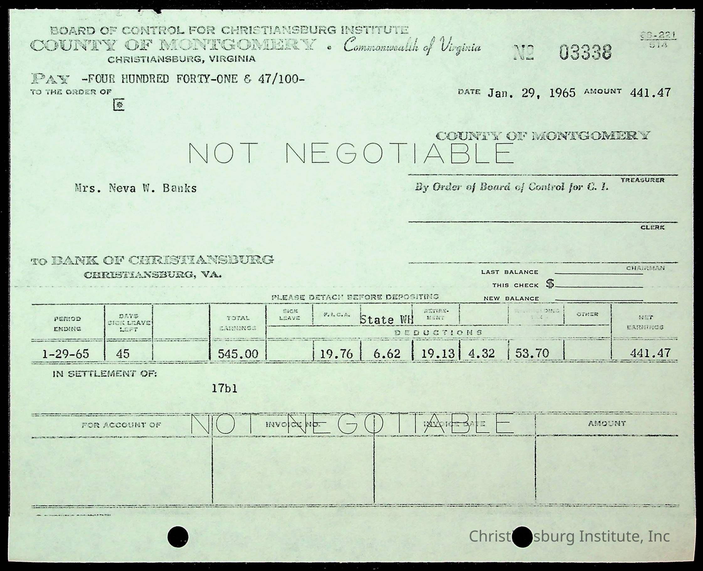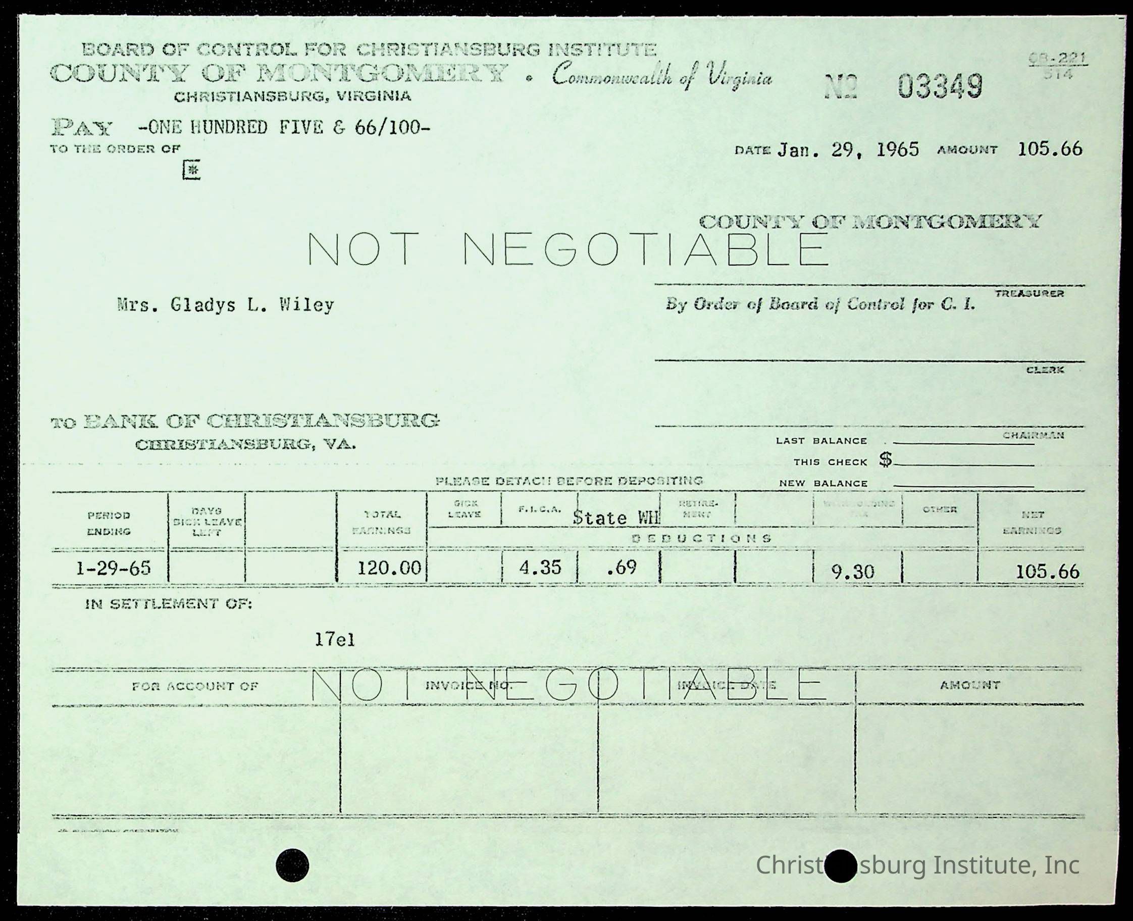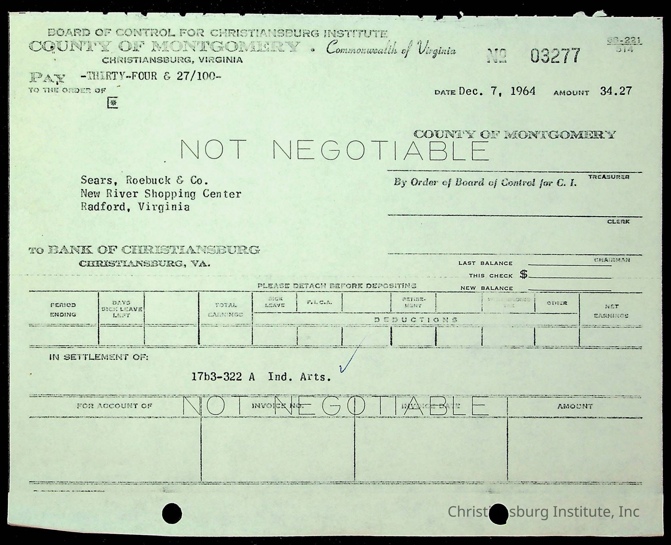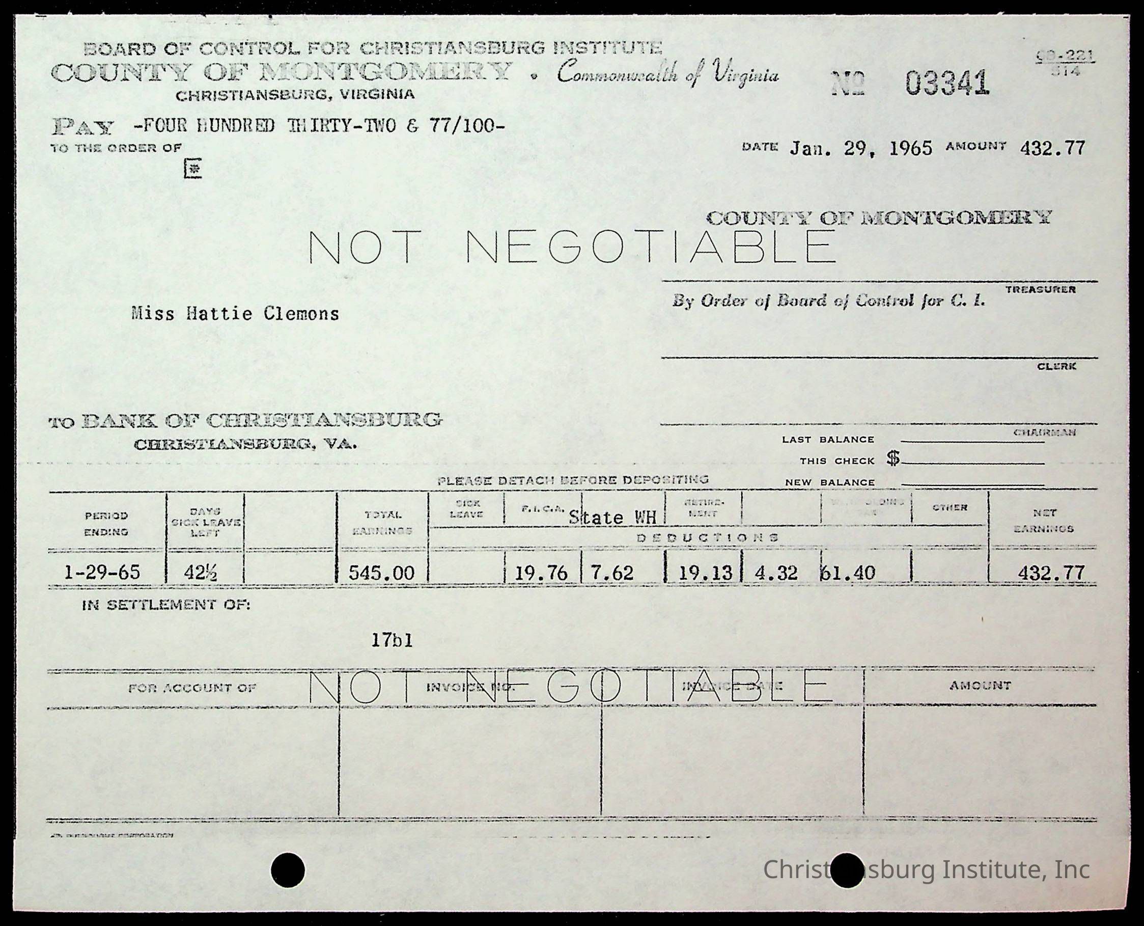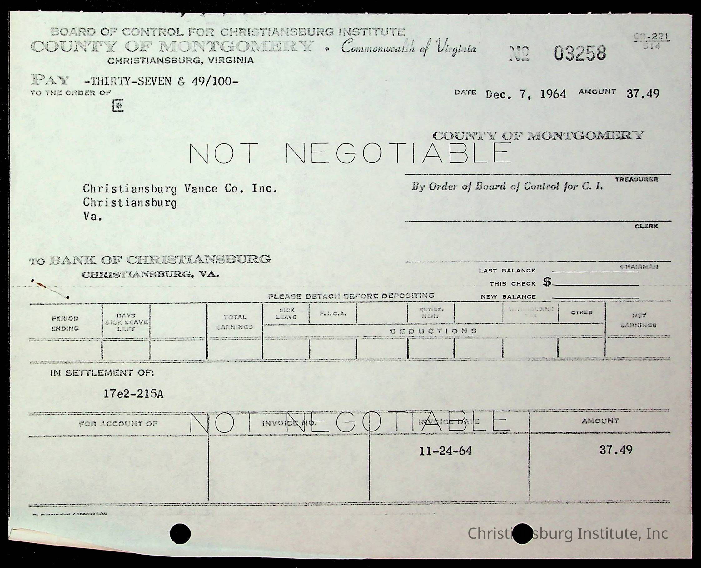 An archive of financial documents relating to the Board of Control for Christiansburg Institute dated 1964-1965. Documents include; bills, statements, and receipts.