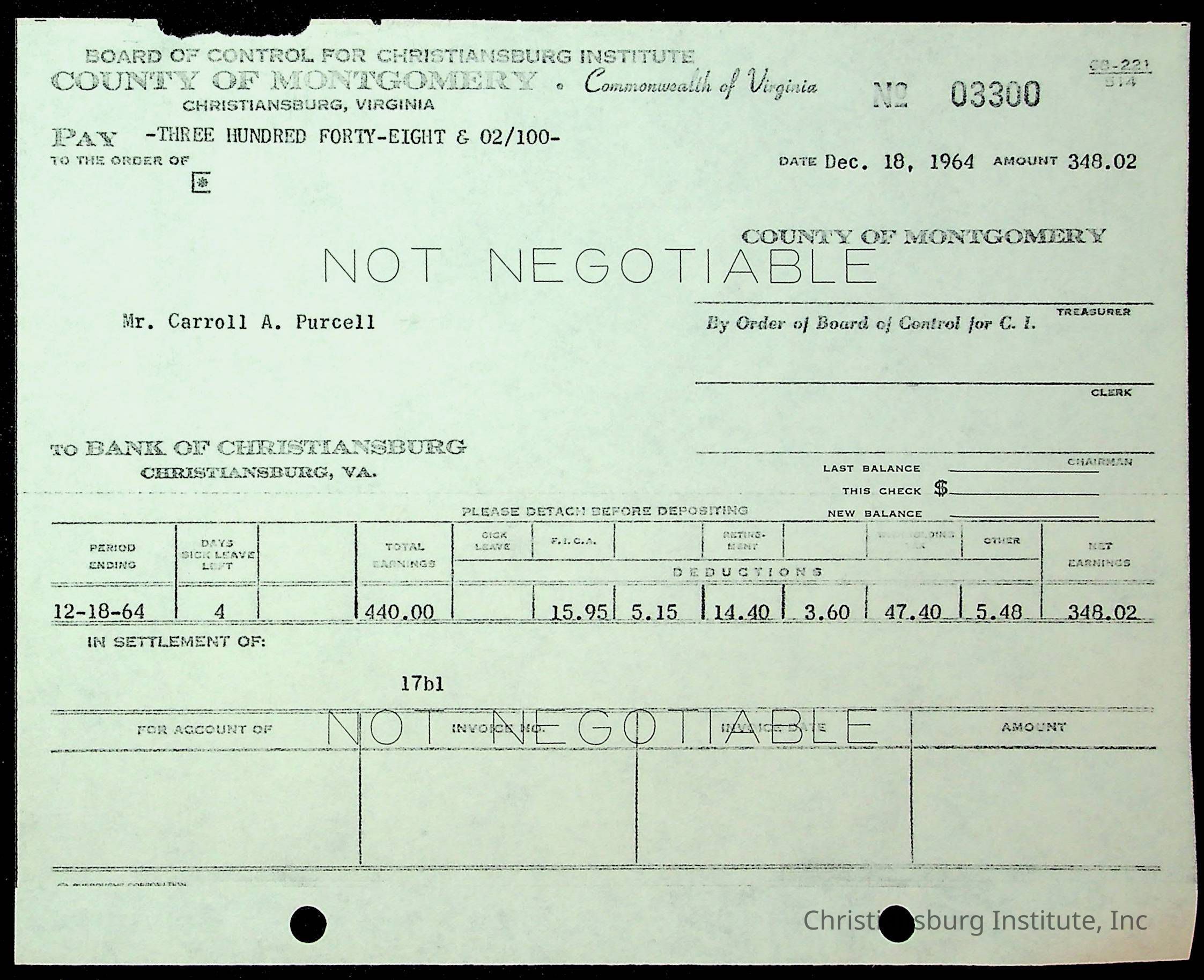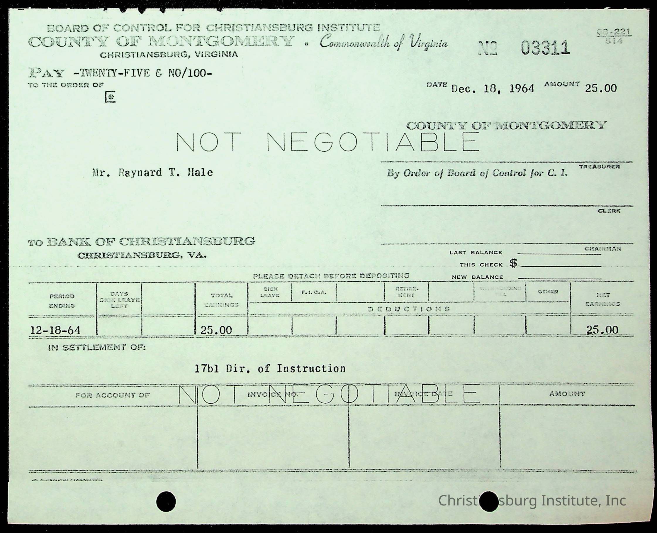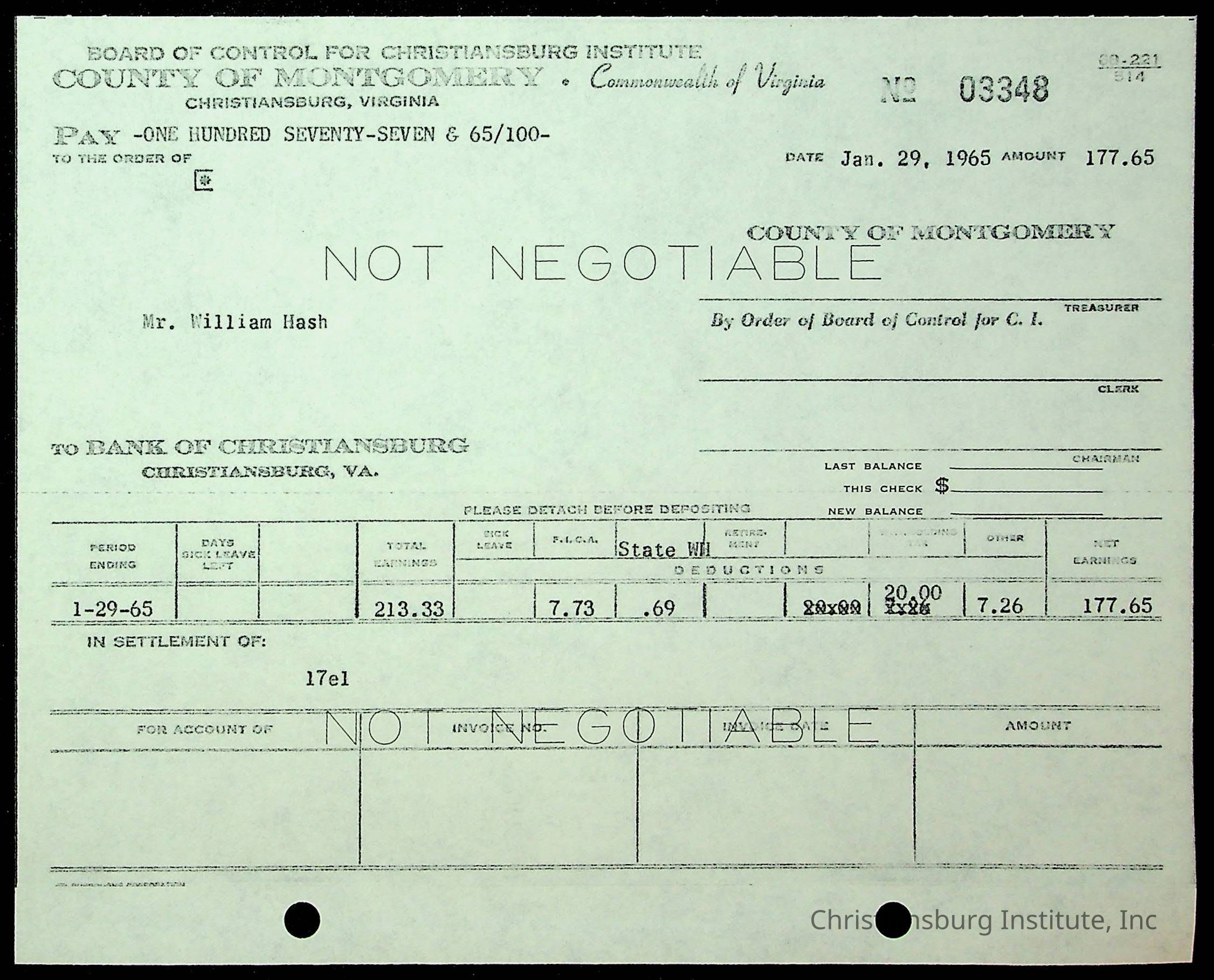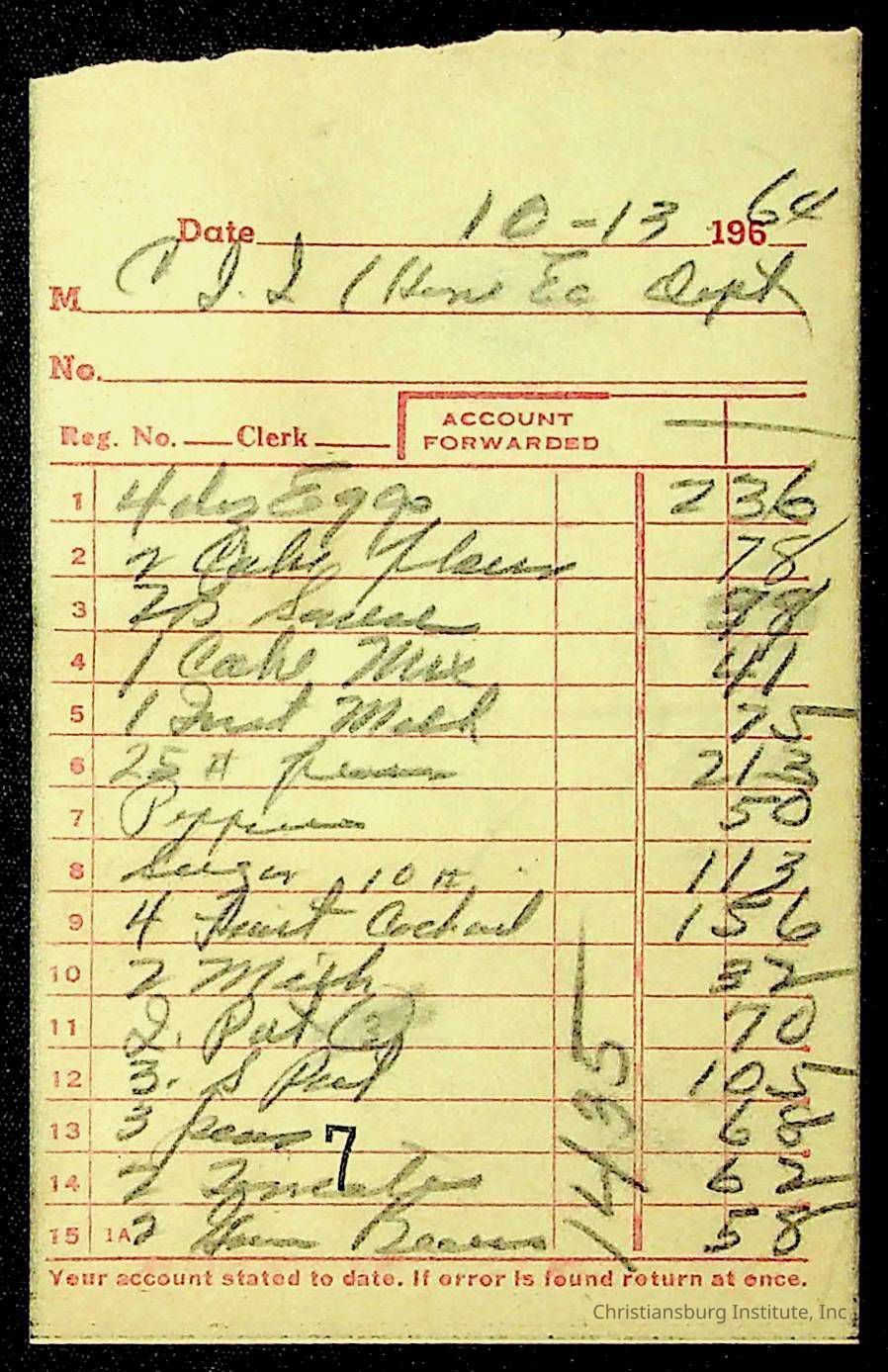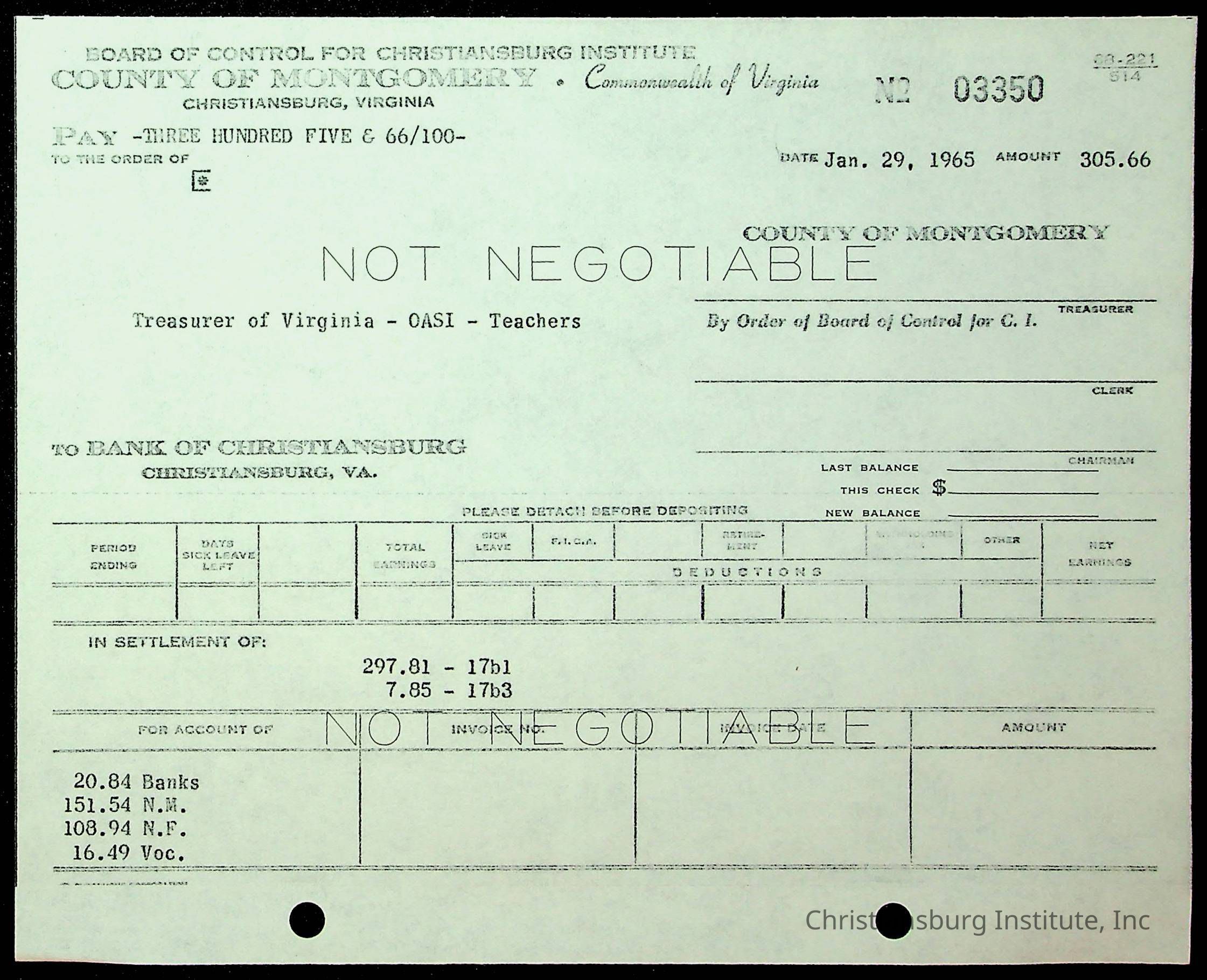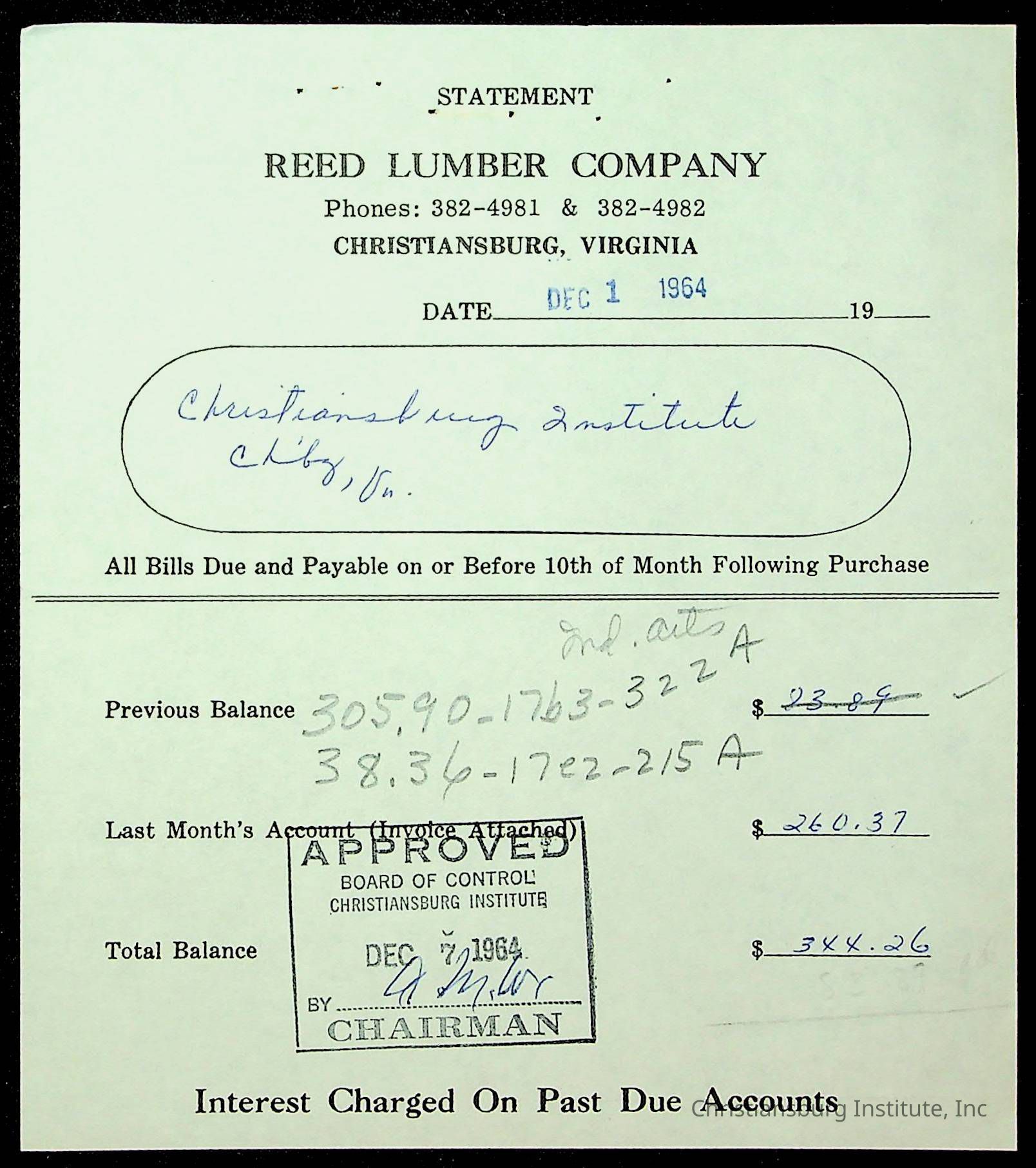 An archive of financial documents relating to the Board of Control for Christiansburg Institute dated 1964-1965. Documents include; bills, statements, and receipts.