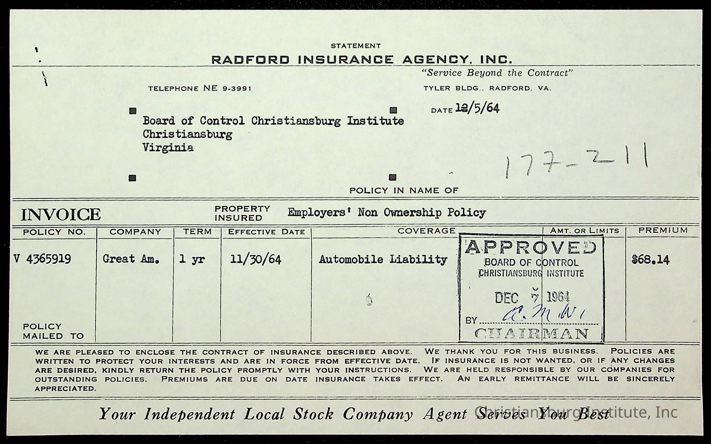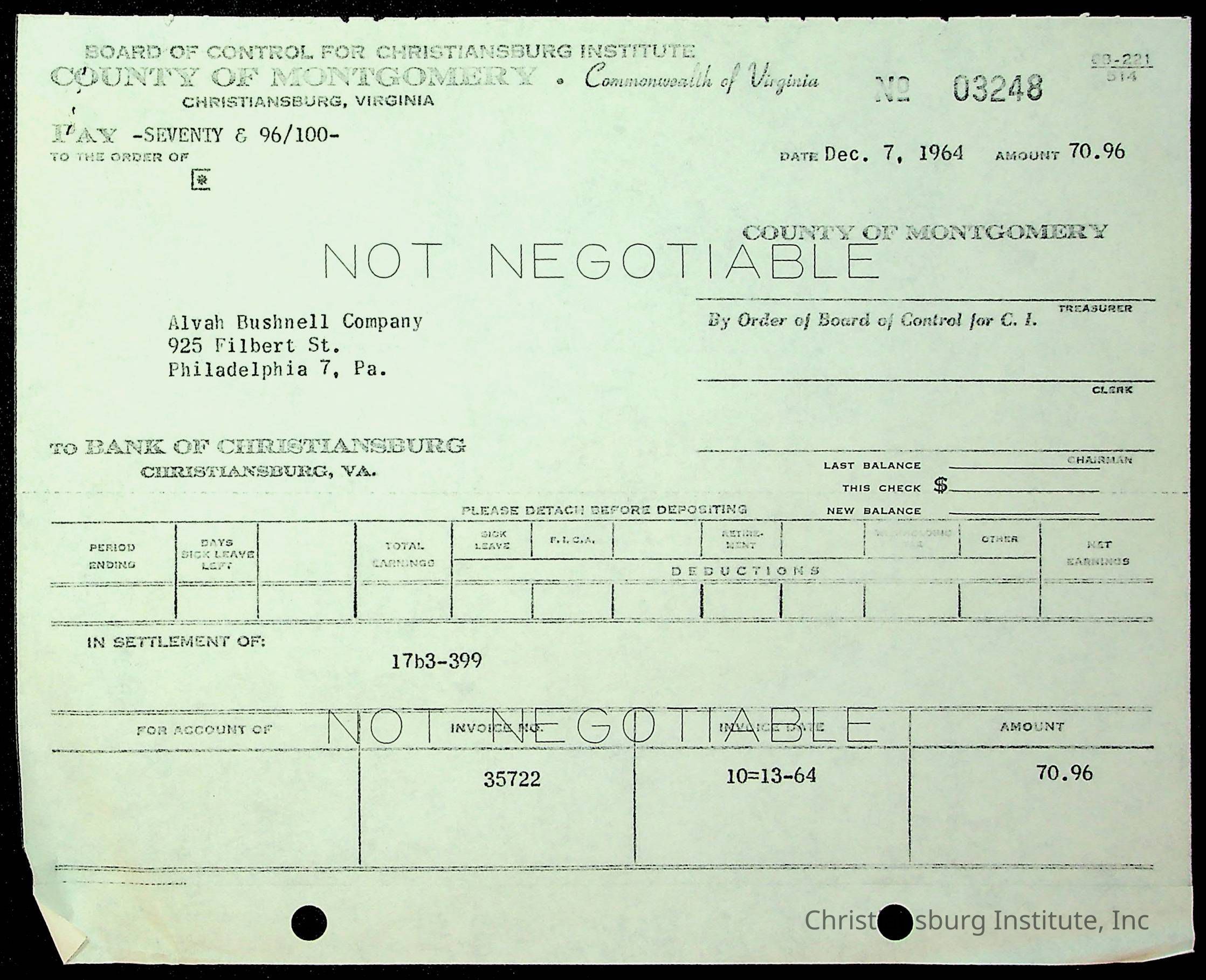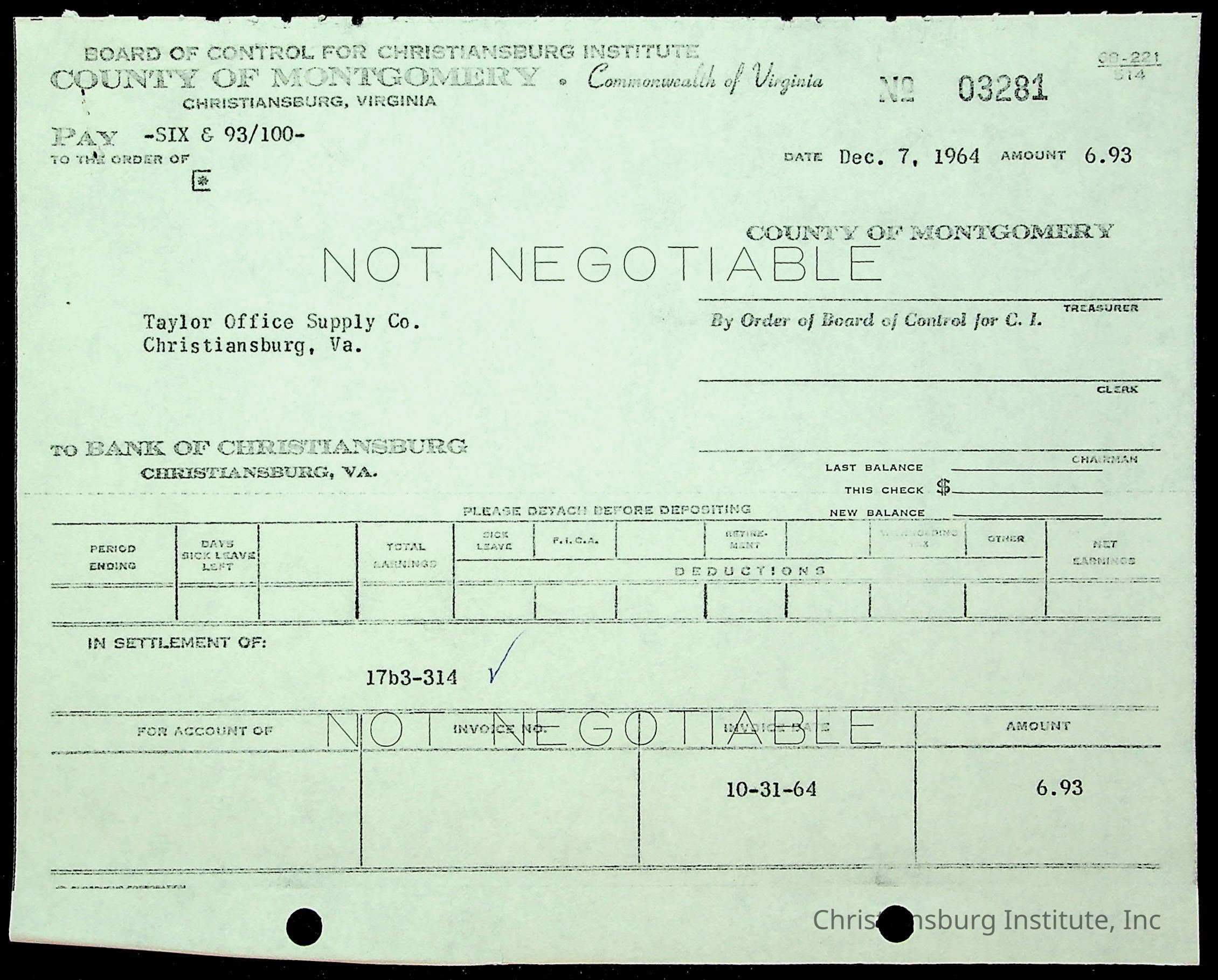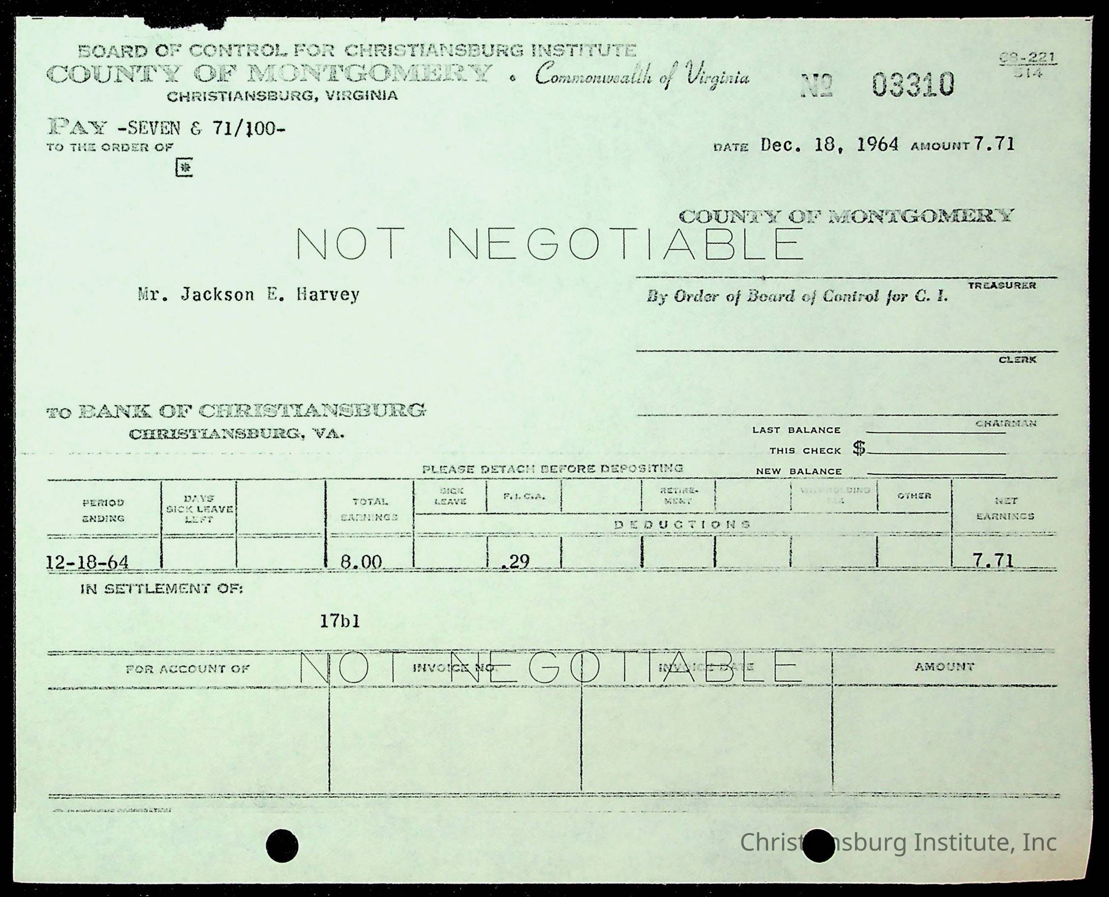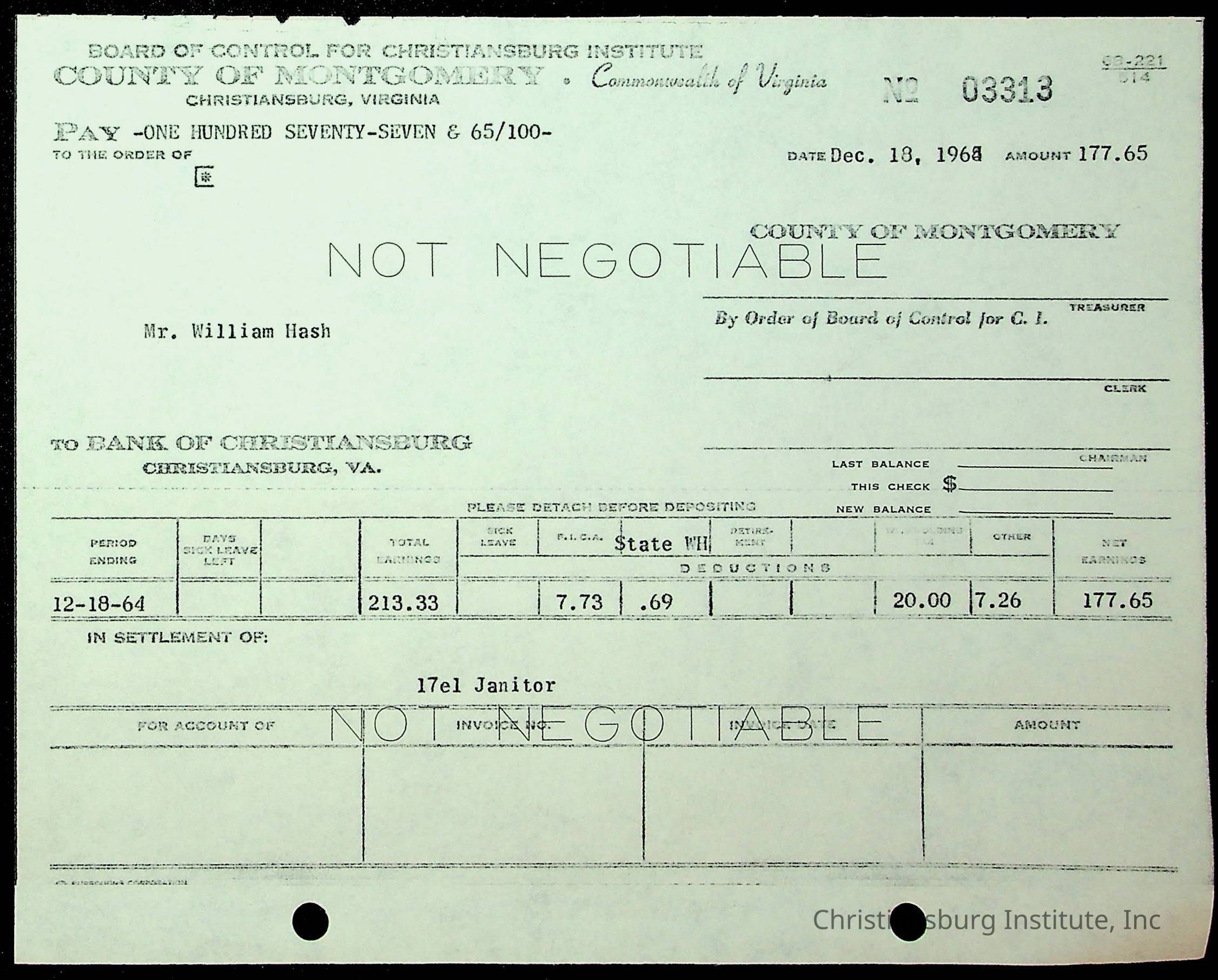An archive of financial documents relating to the Board of Control for Christiansburg Institute dated 1964-1965. Documents include; bills, statements, and receipts.