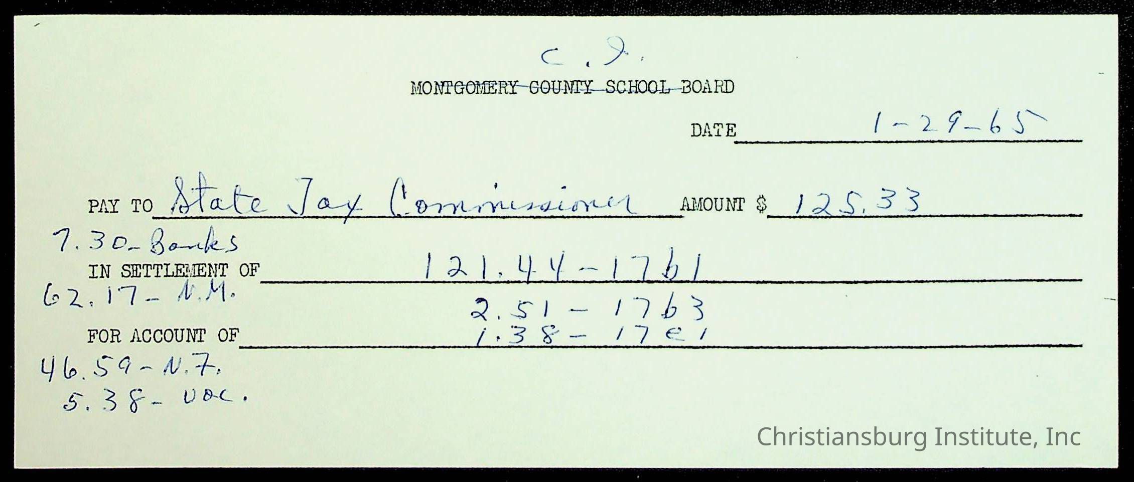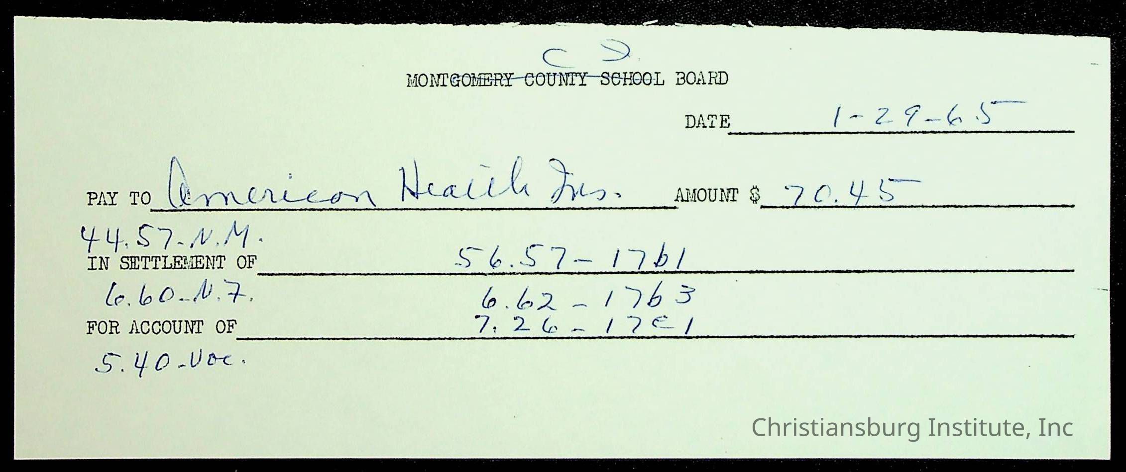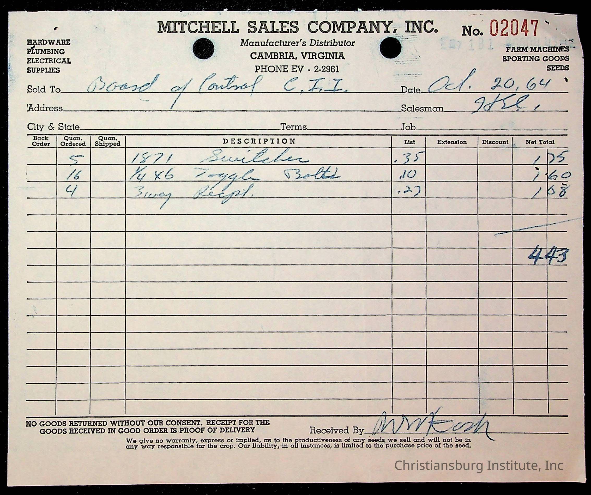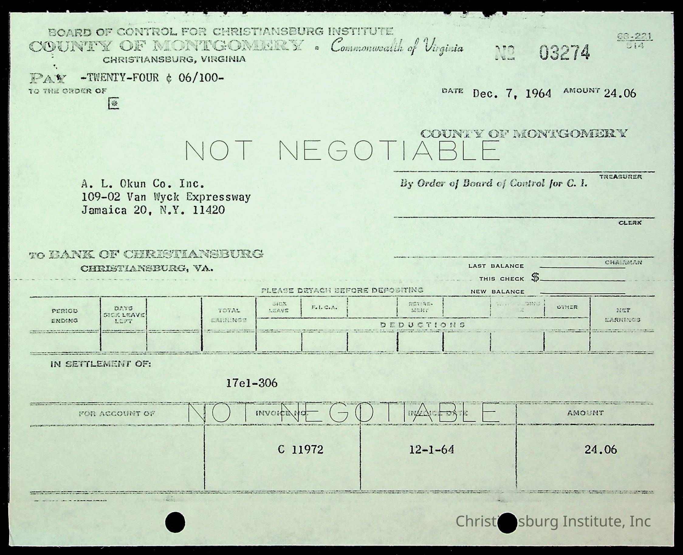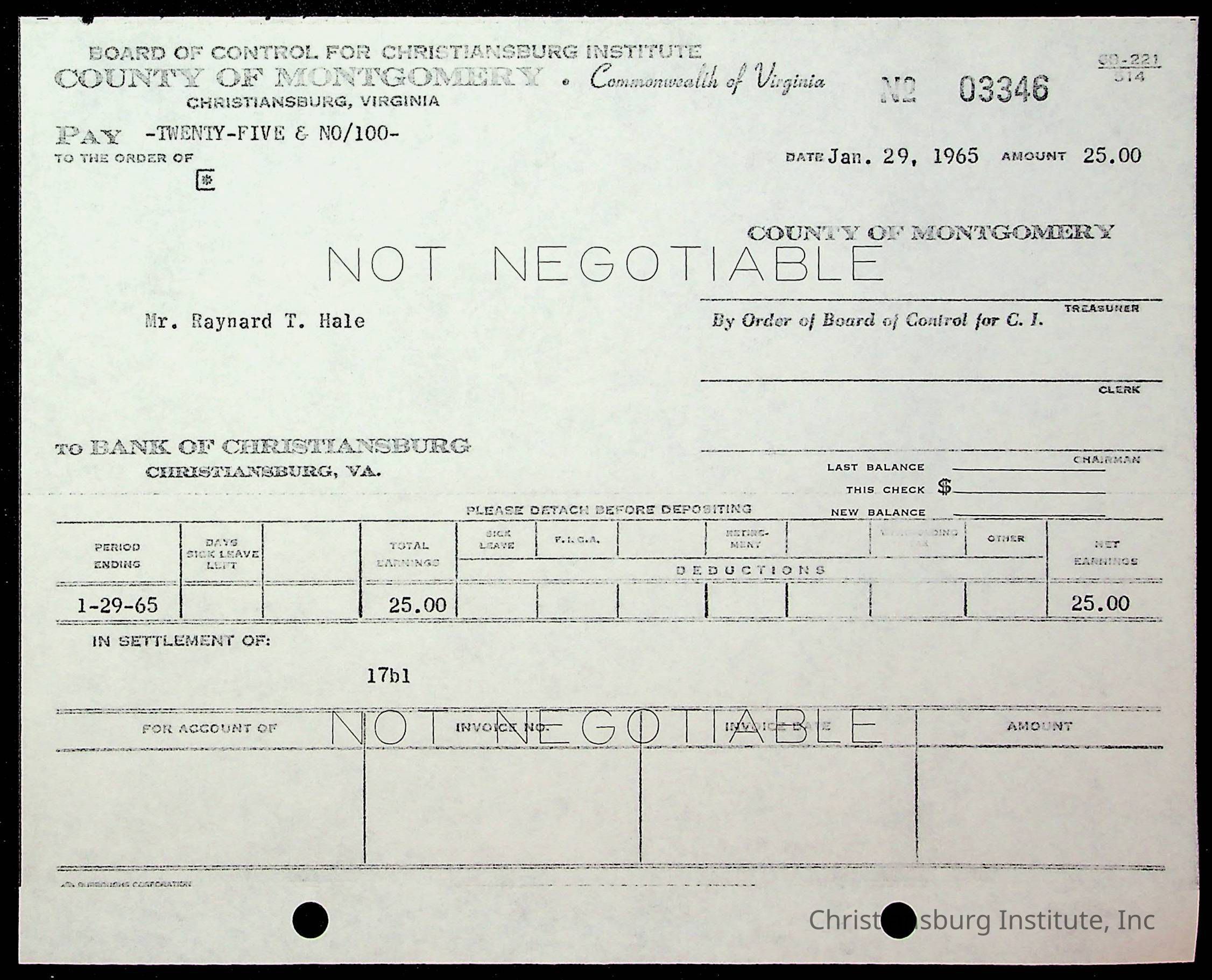 An archive of financial documents relating to the Board of Control for Christiansburg Institute dated 1964-1965. Documents include; bills, statements, and receipts.