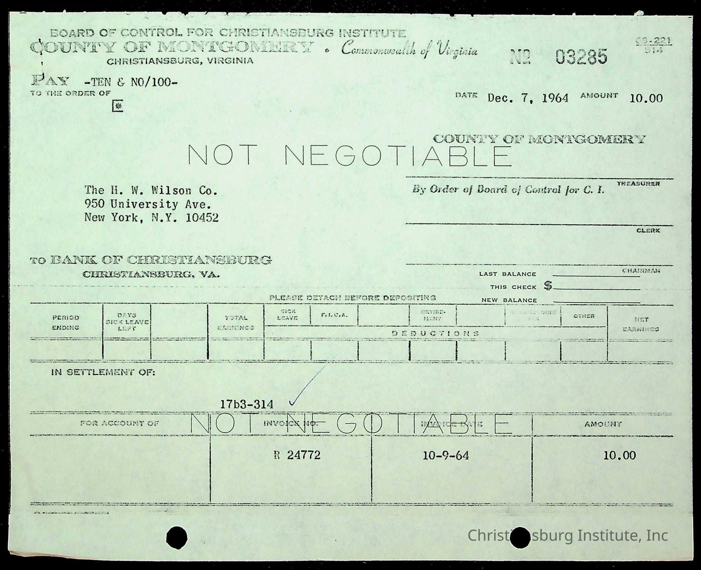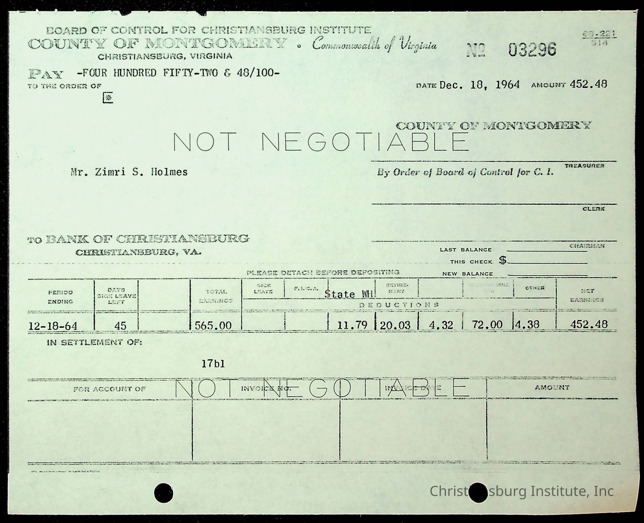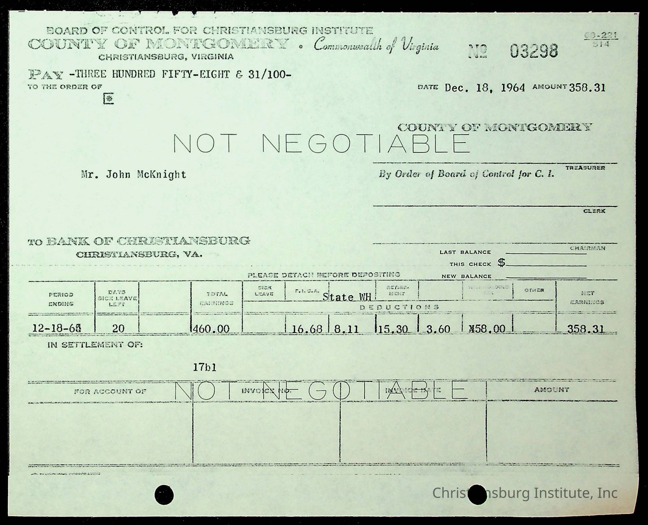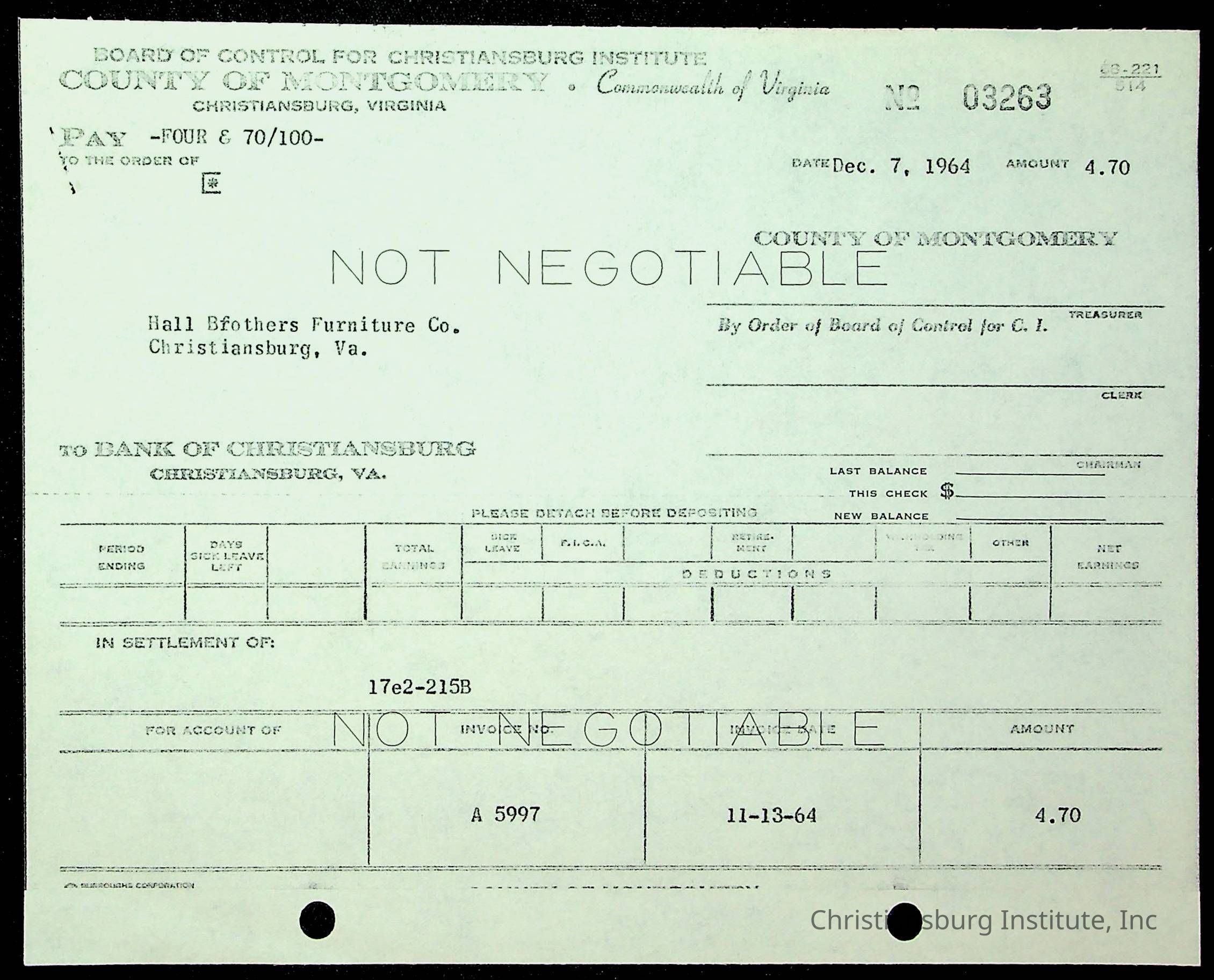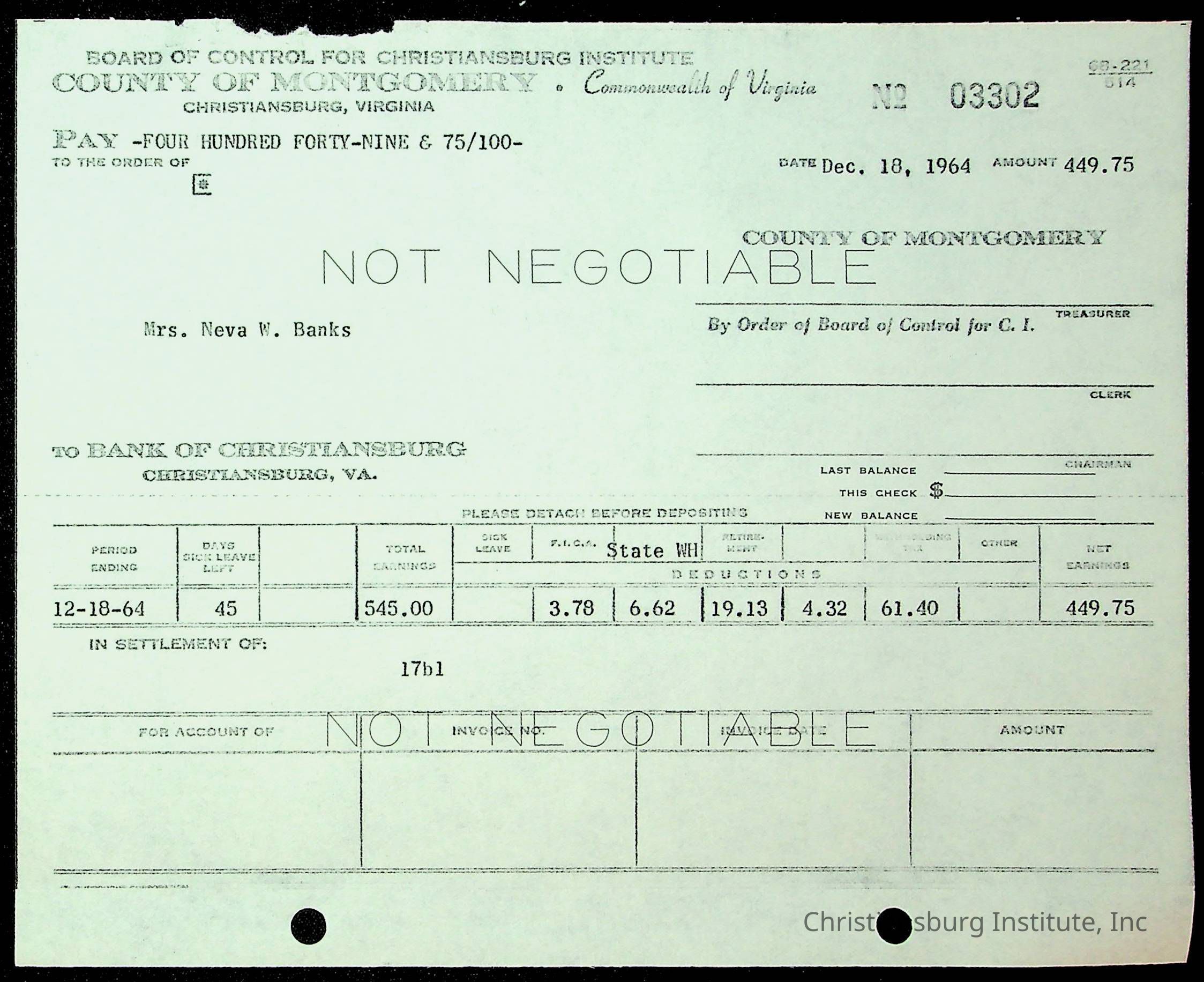 An archive of financial documents relating to the Board of Control for Christiansburg Institute dated 1964-1965. Documents include; bills, statements, and receipts.