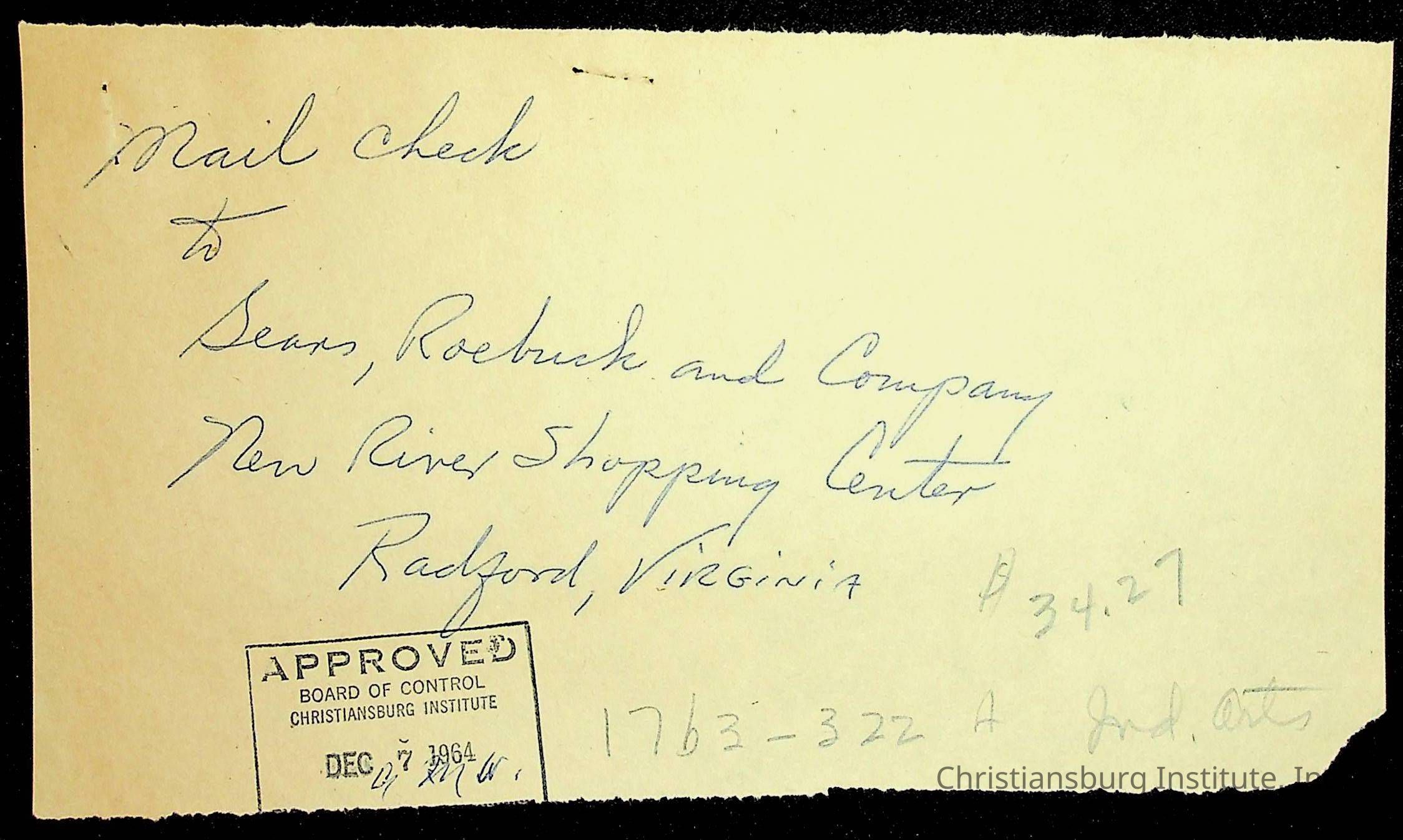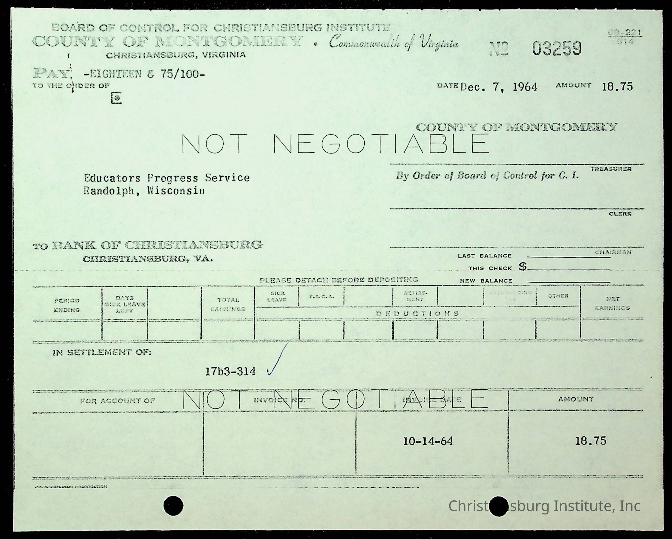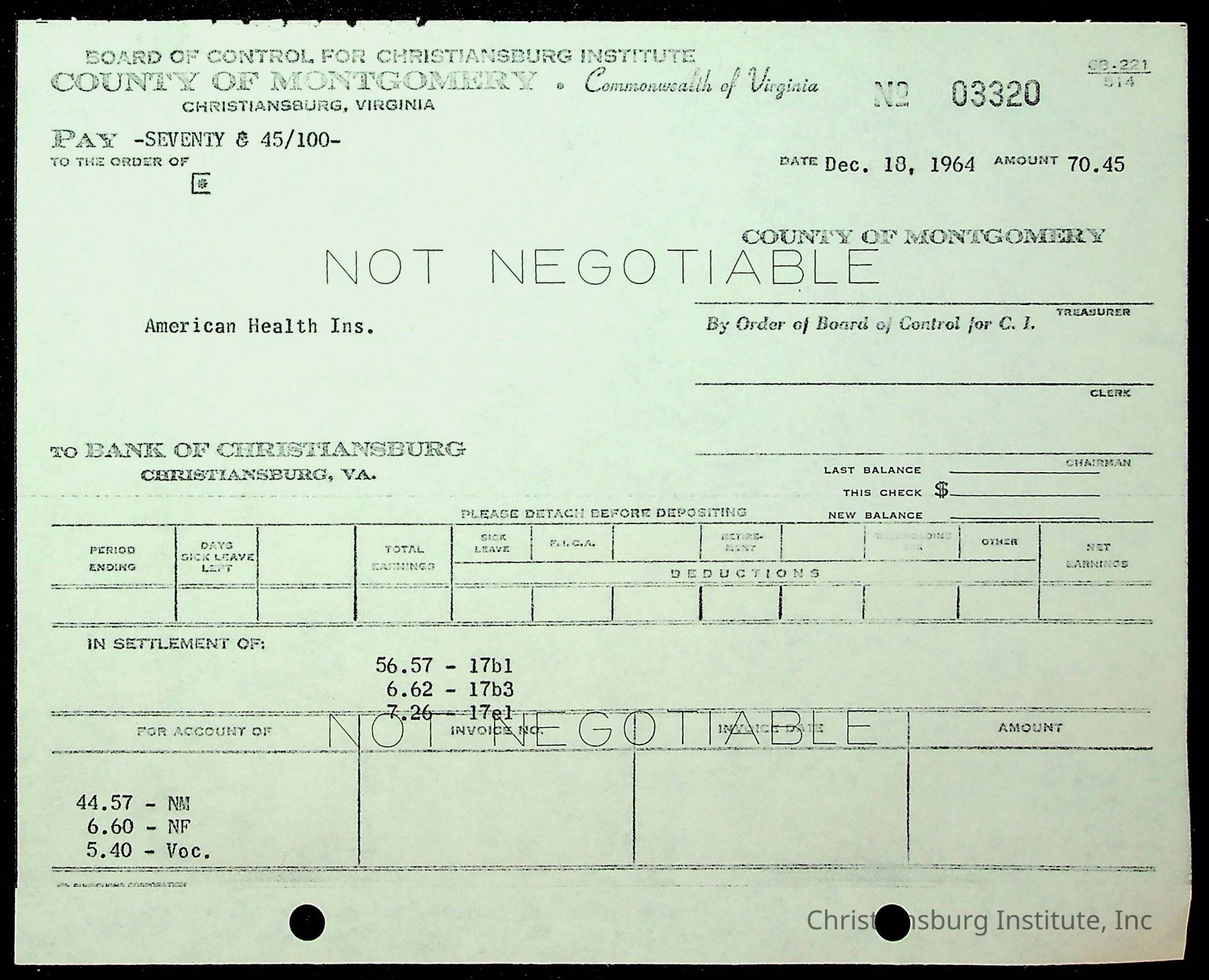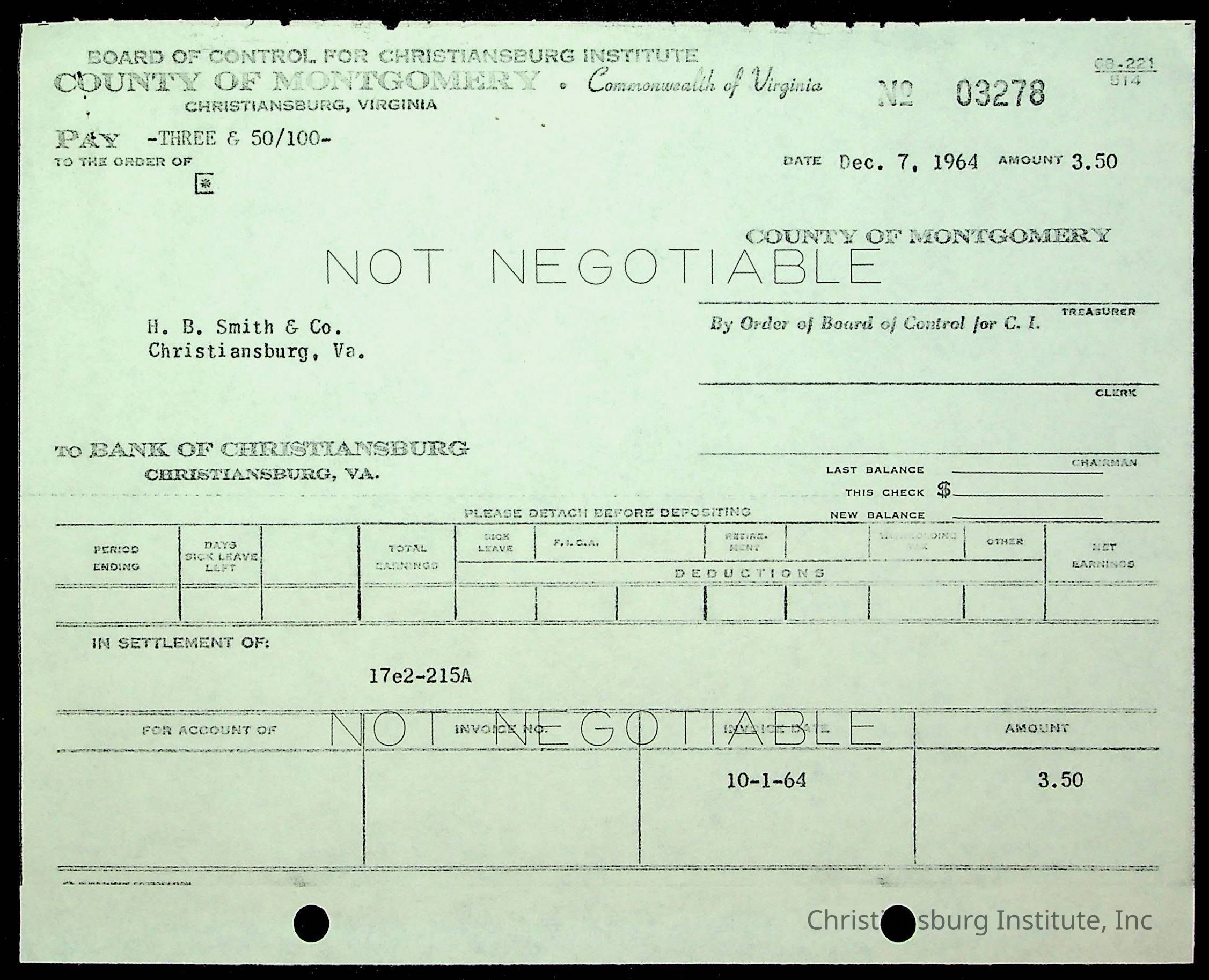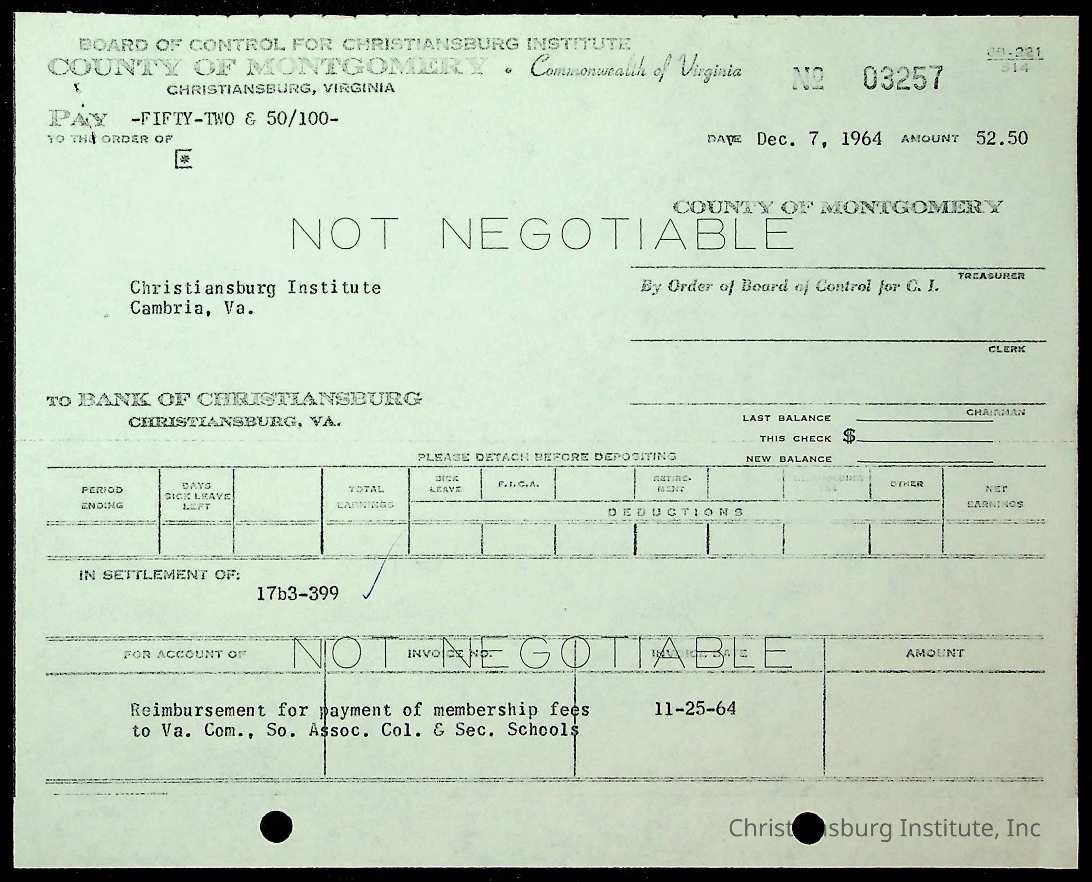 An archive of financial documents relating to the Board of Control for Christiansburg Institute dated 1964-1965. Documents include; bills, statements, and receipts.