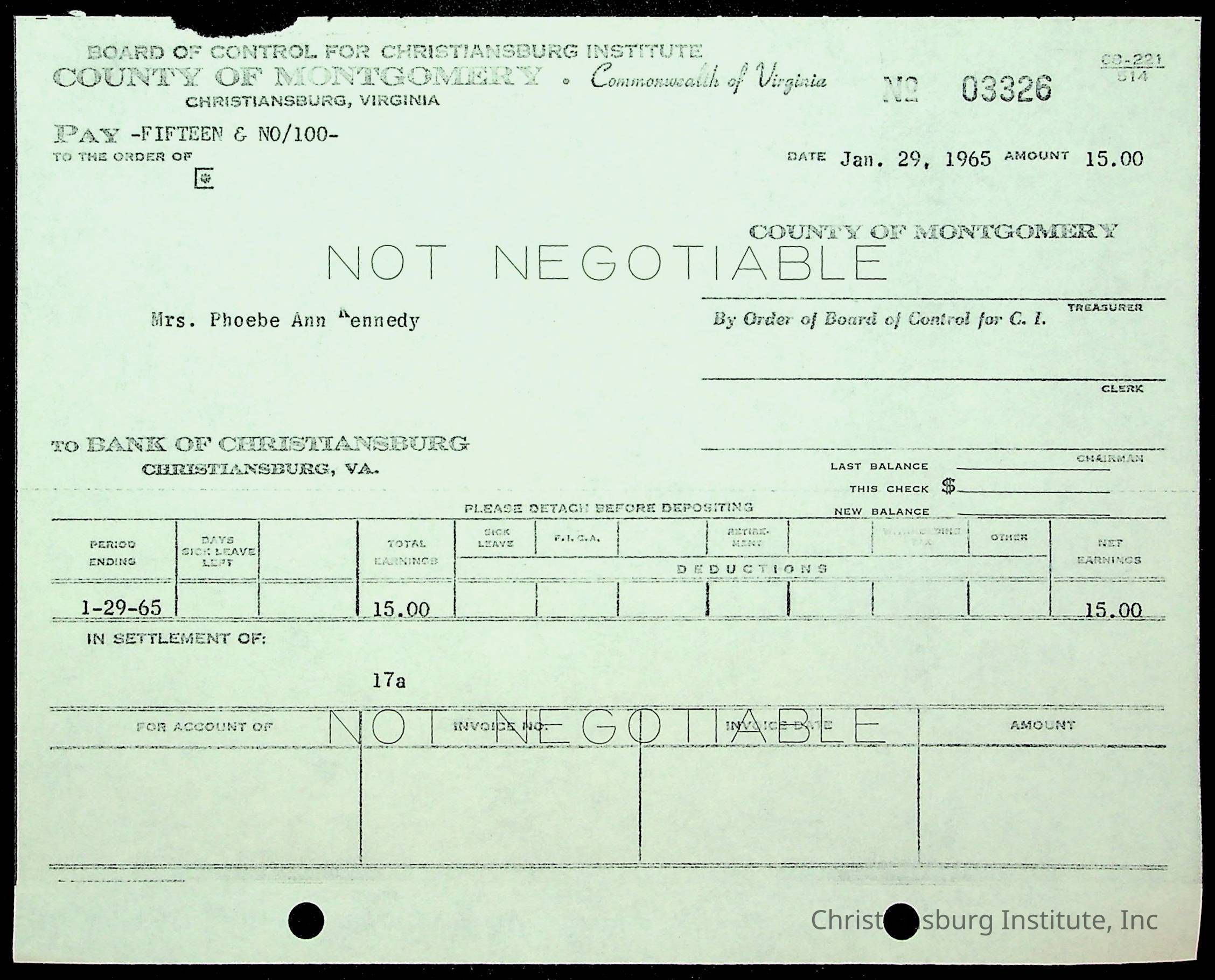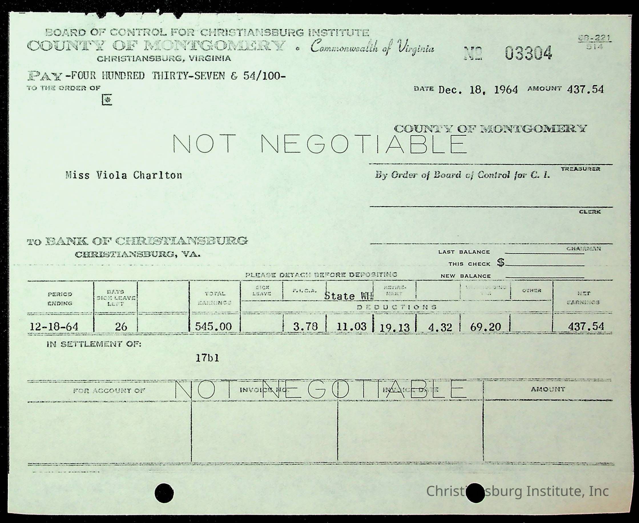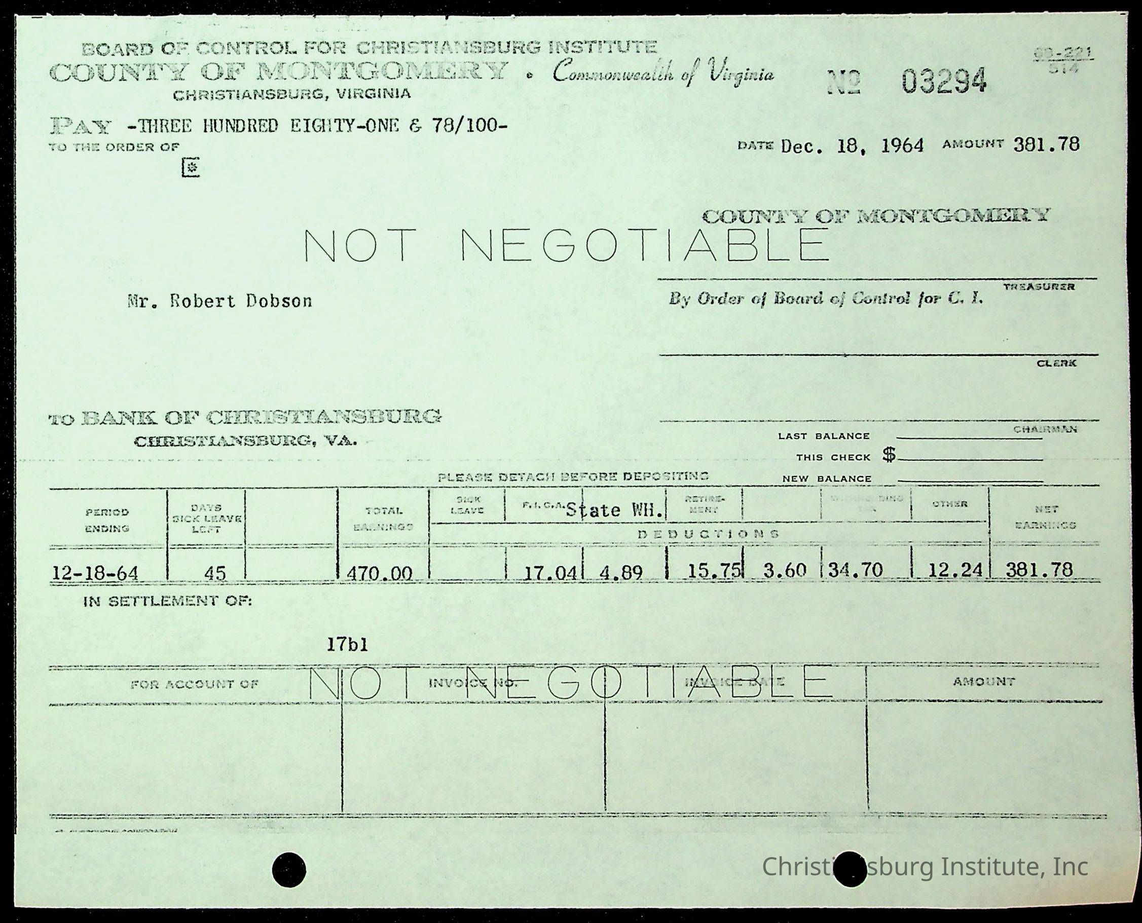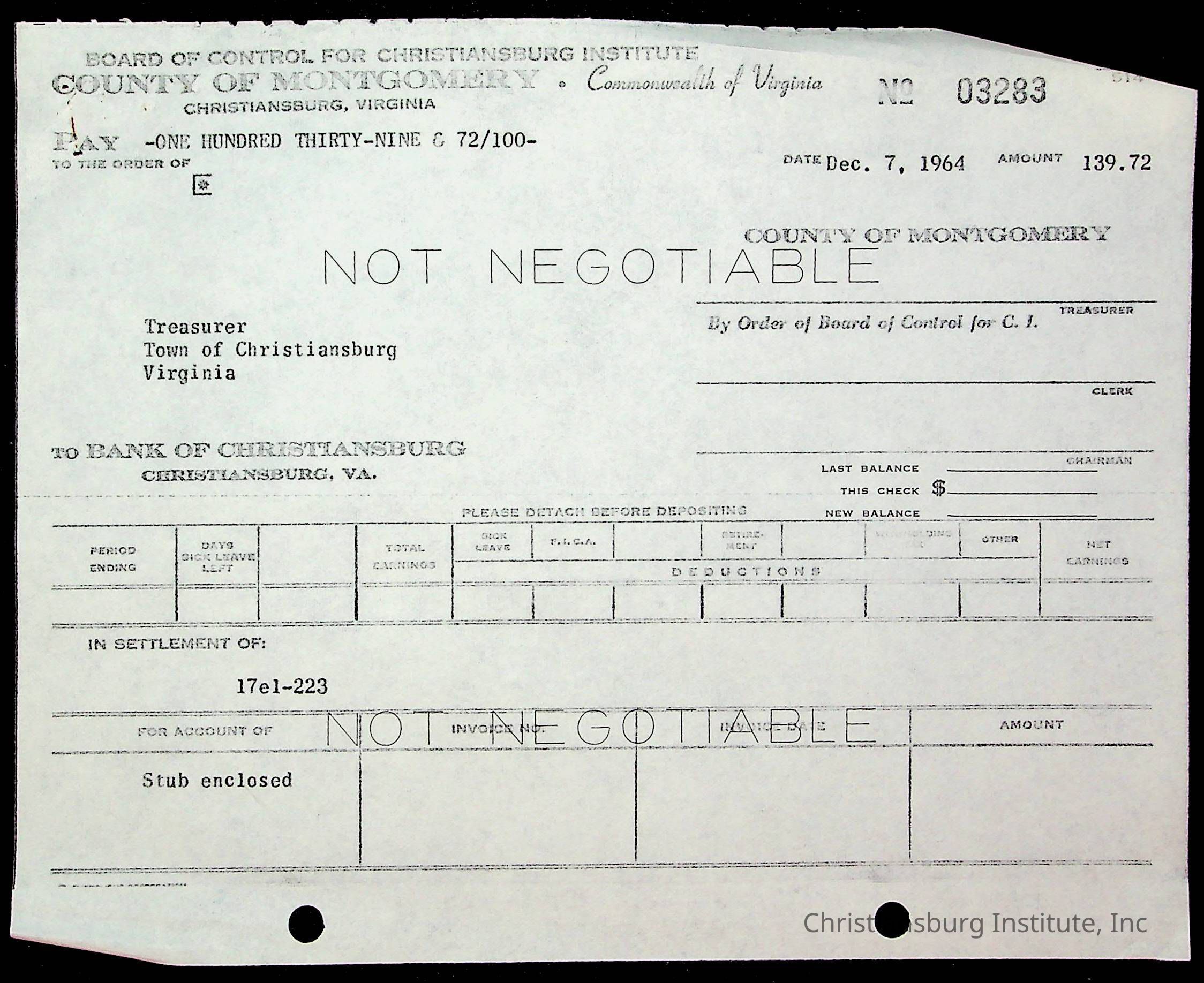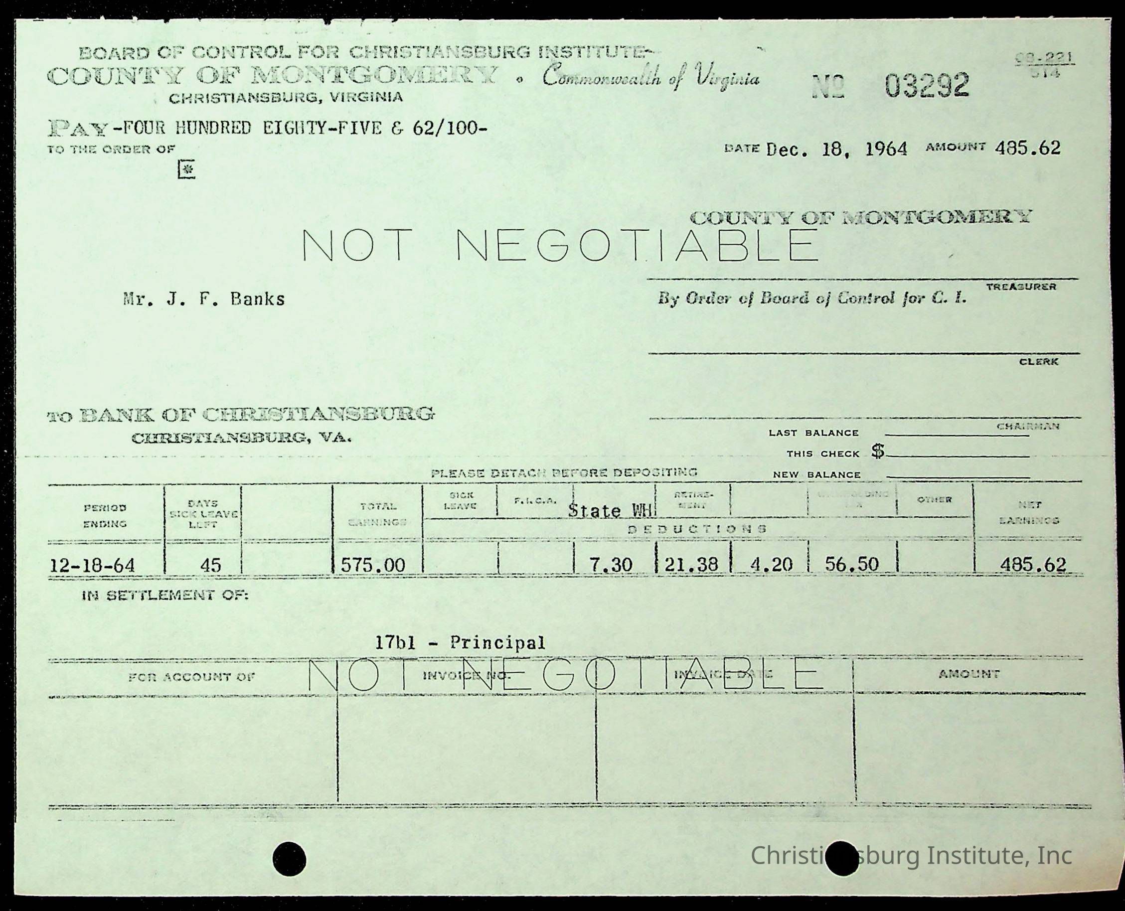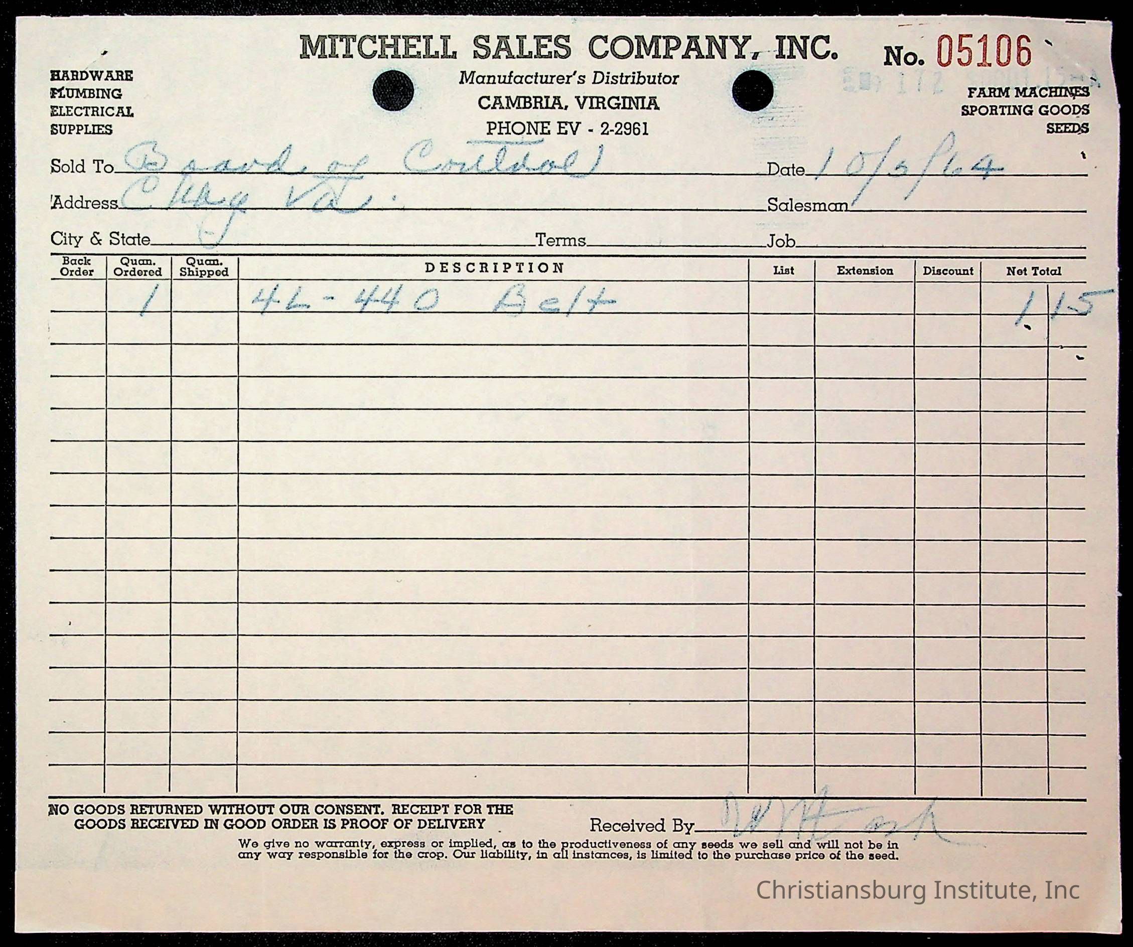 An archive of financial documents relating to the Board of Control for Christiansburg Institute dated 1964-1965. Documents include; bills, statements, and receipts.