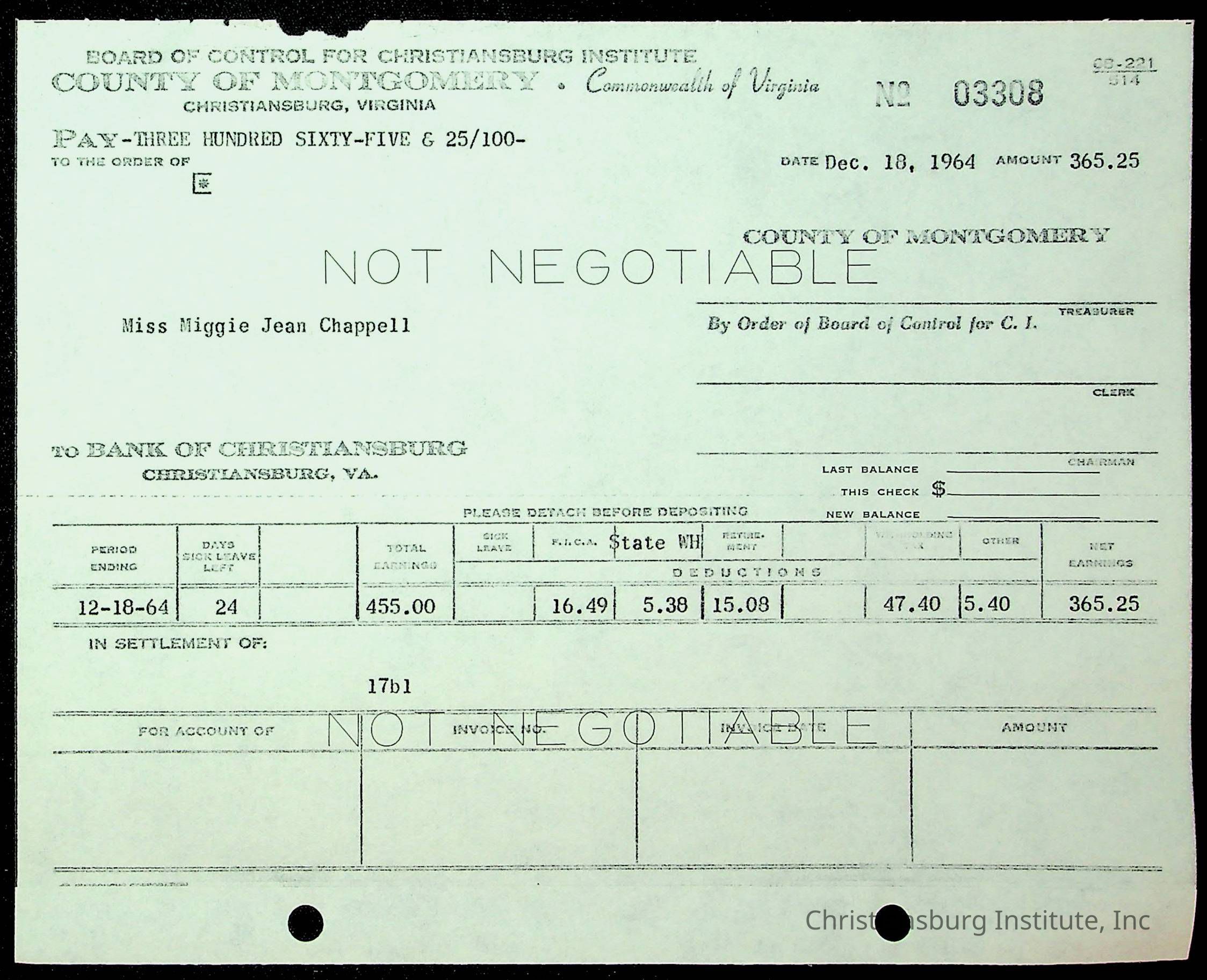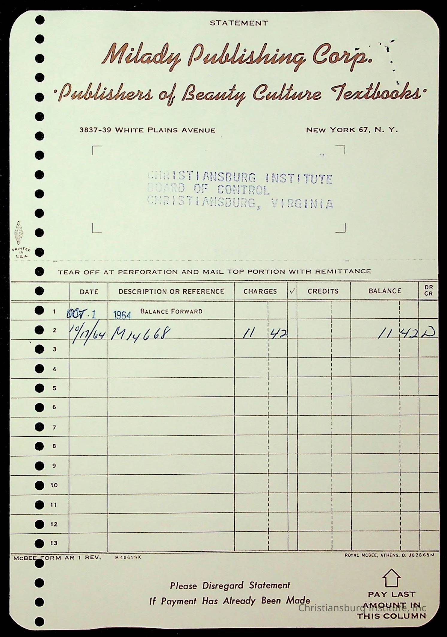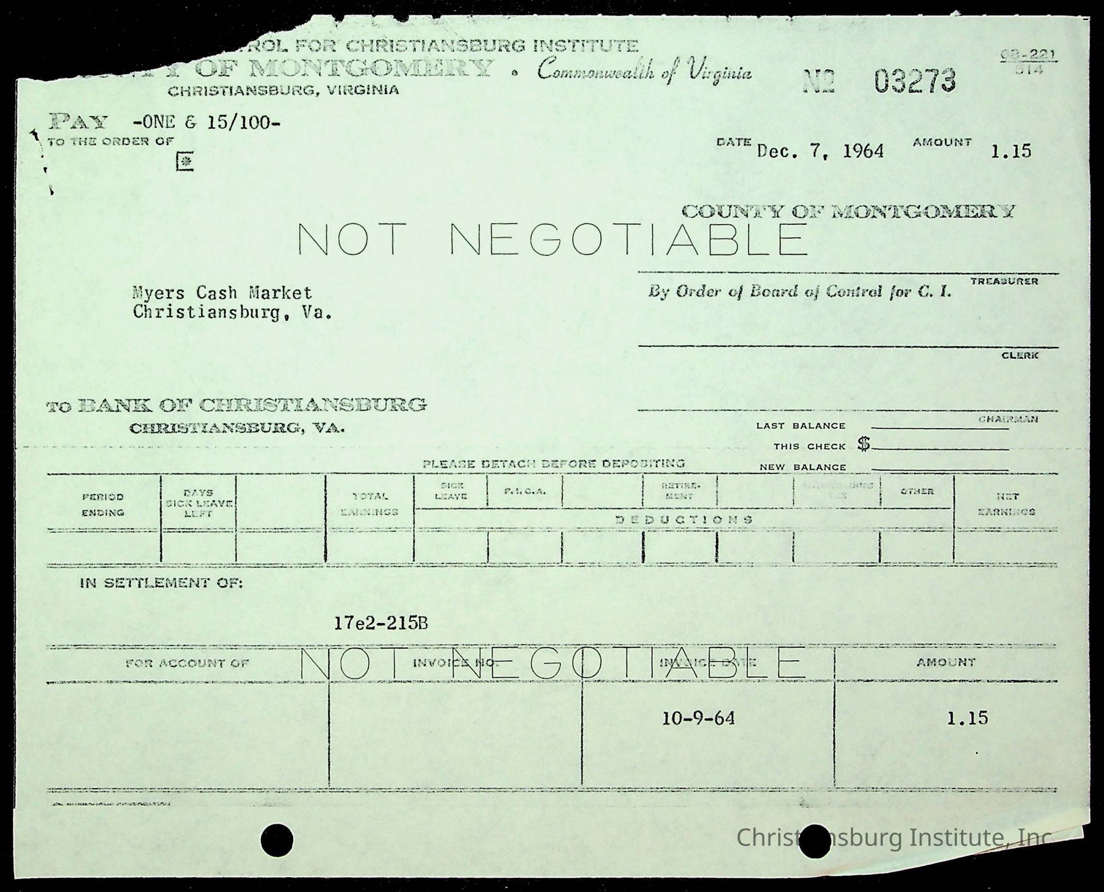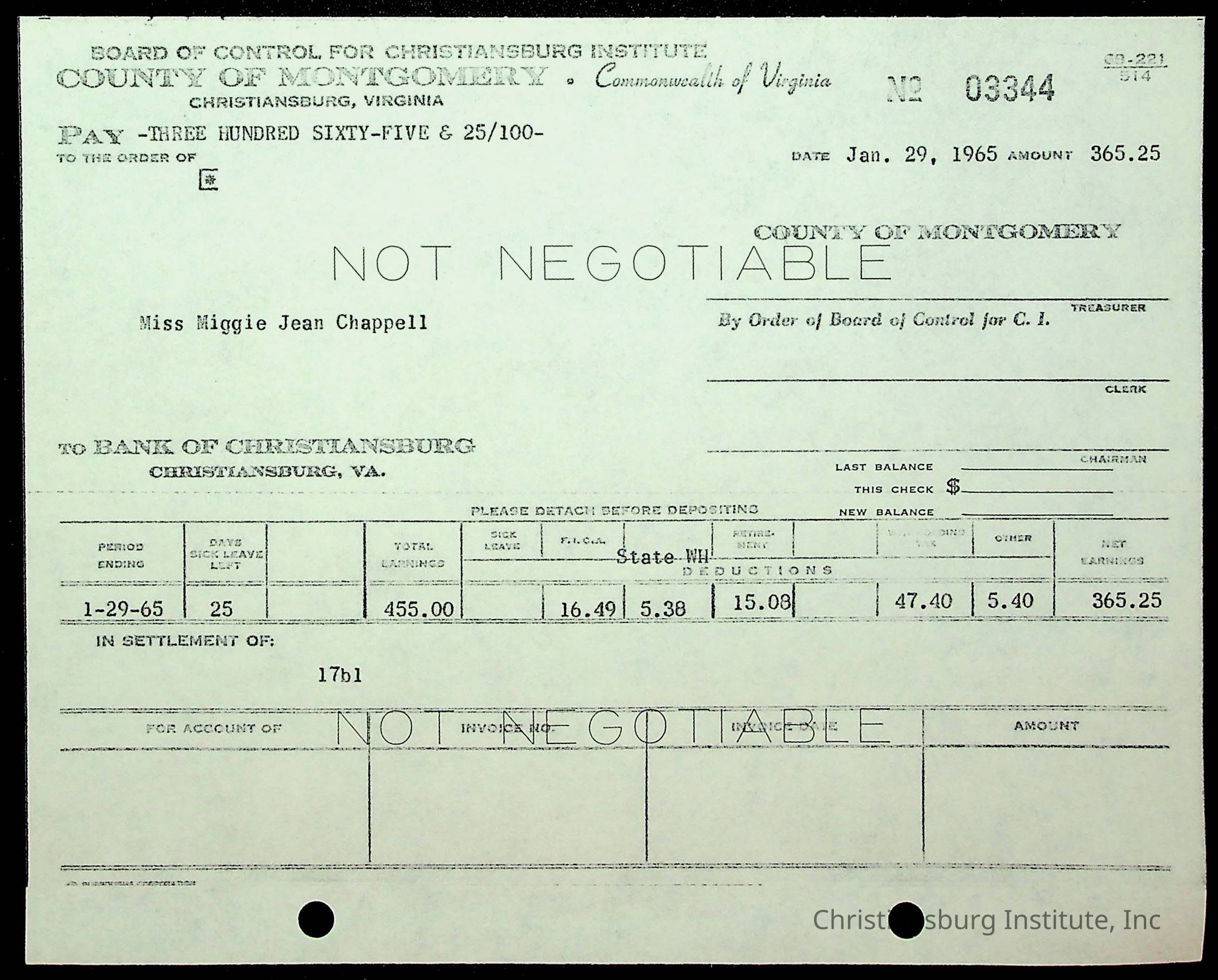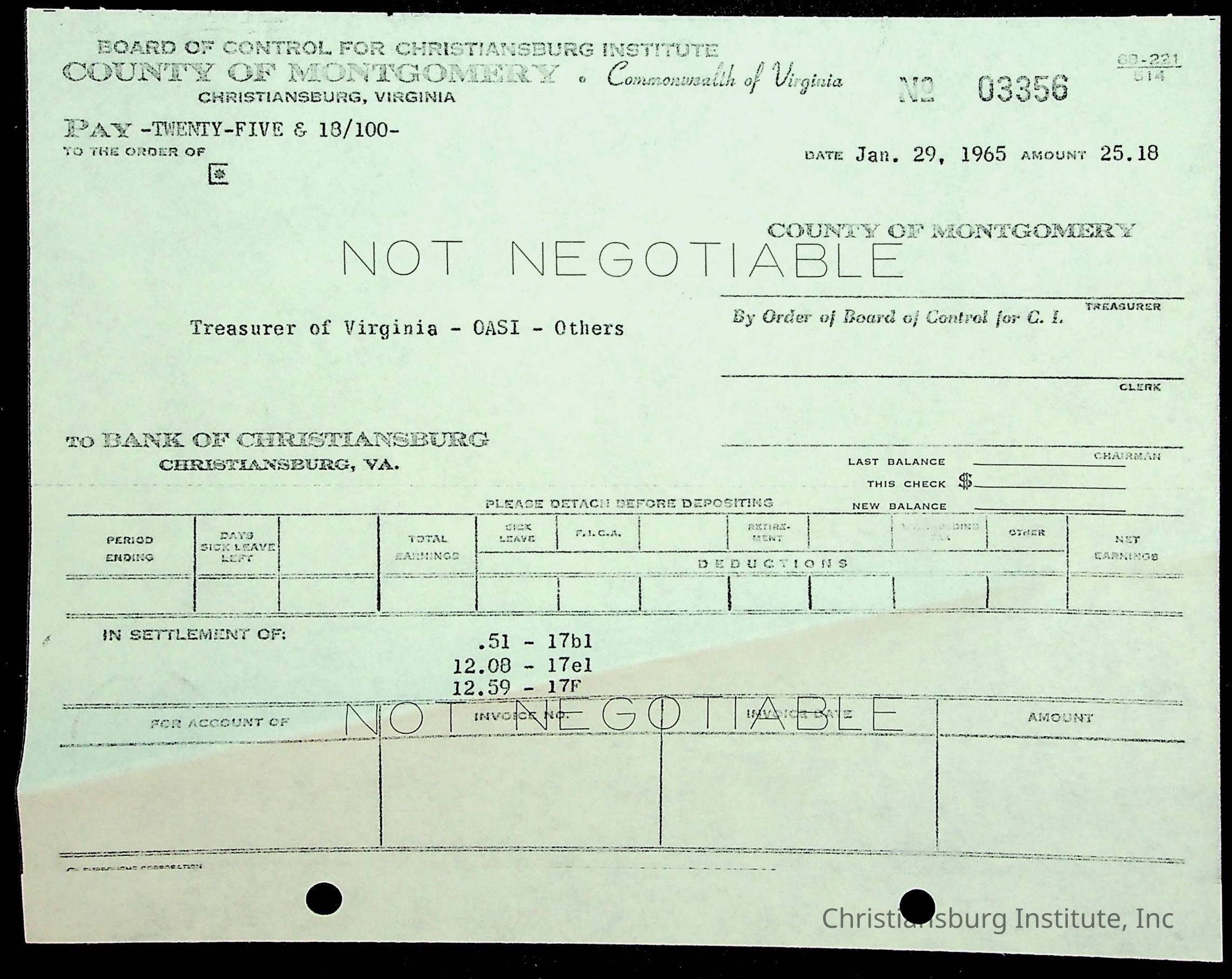 An archive of financial documents relating to the Board of Control for Christiansburg Institute dated 1964-1965. Documents include; bills, statements, and receipts.