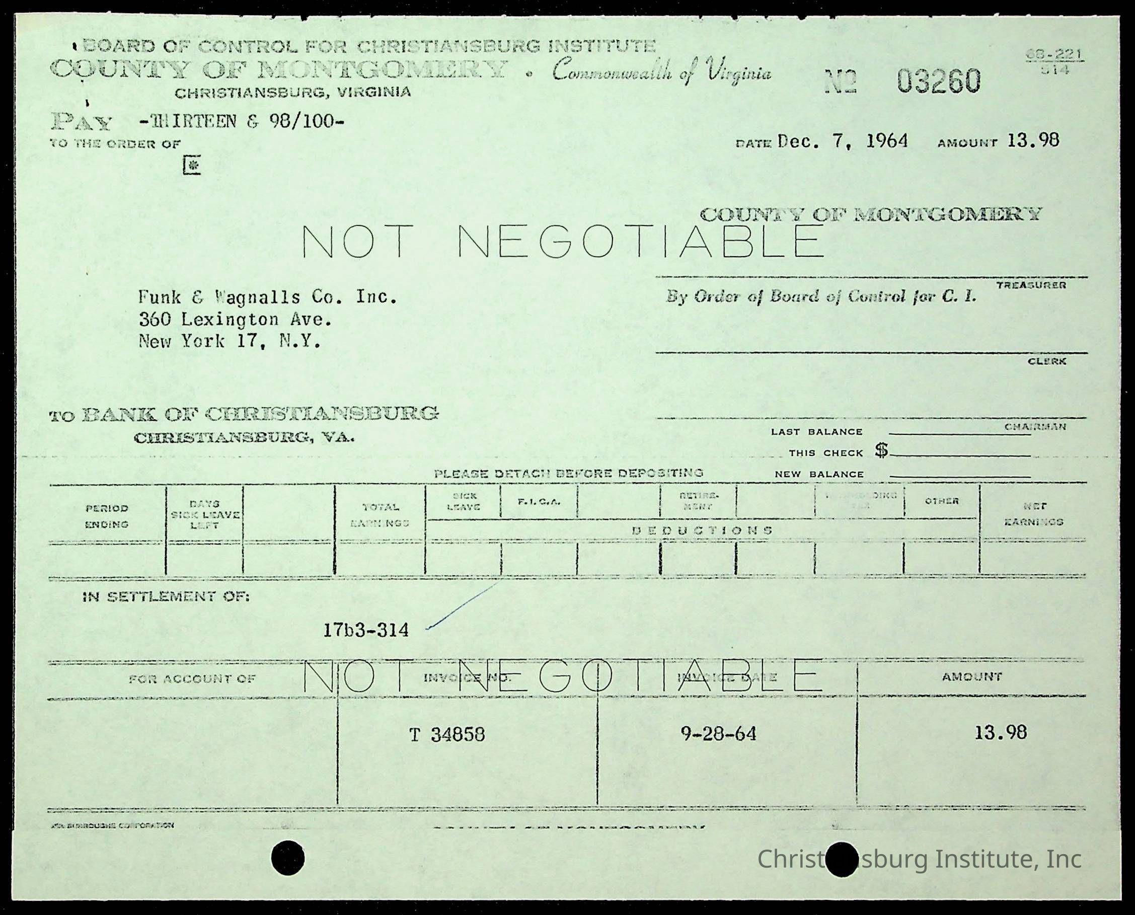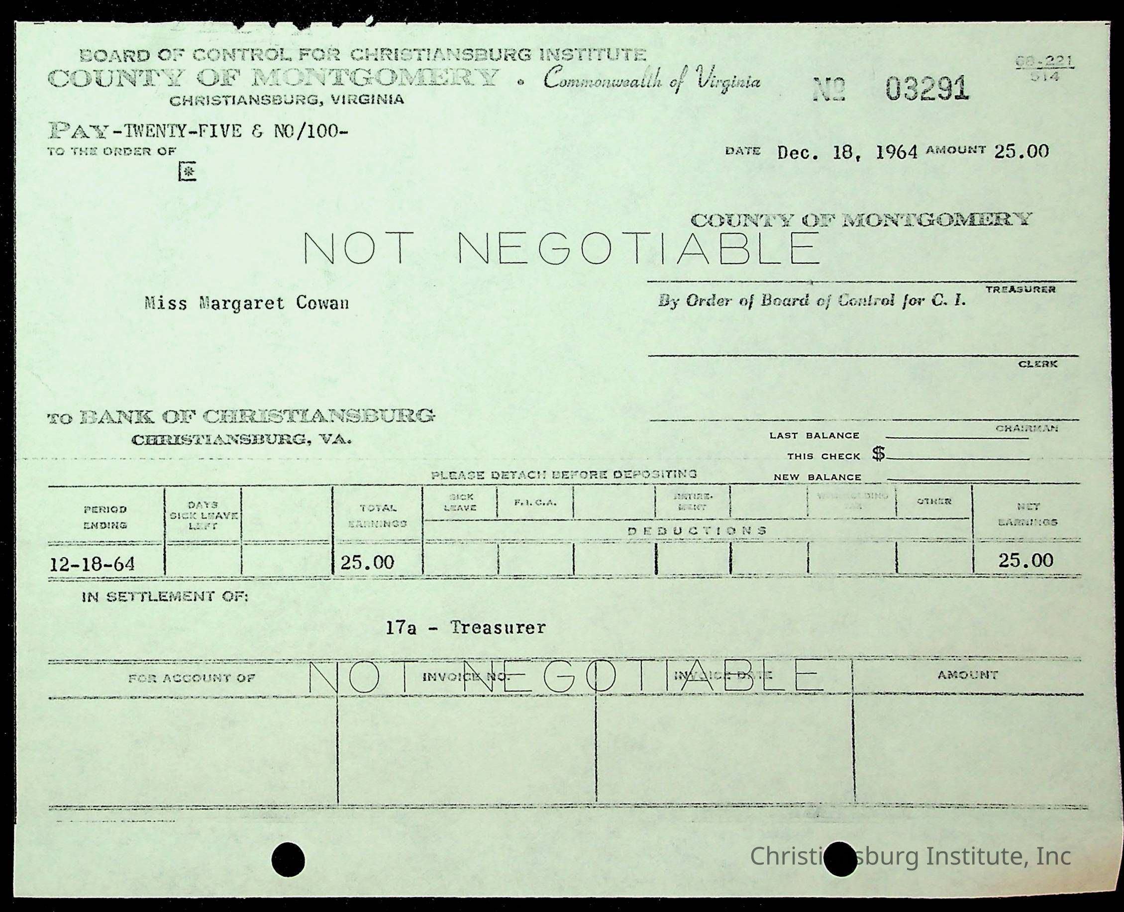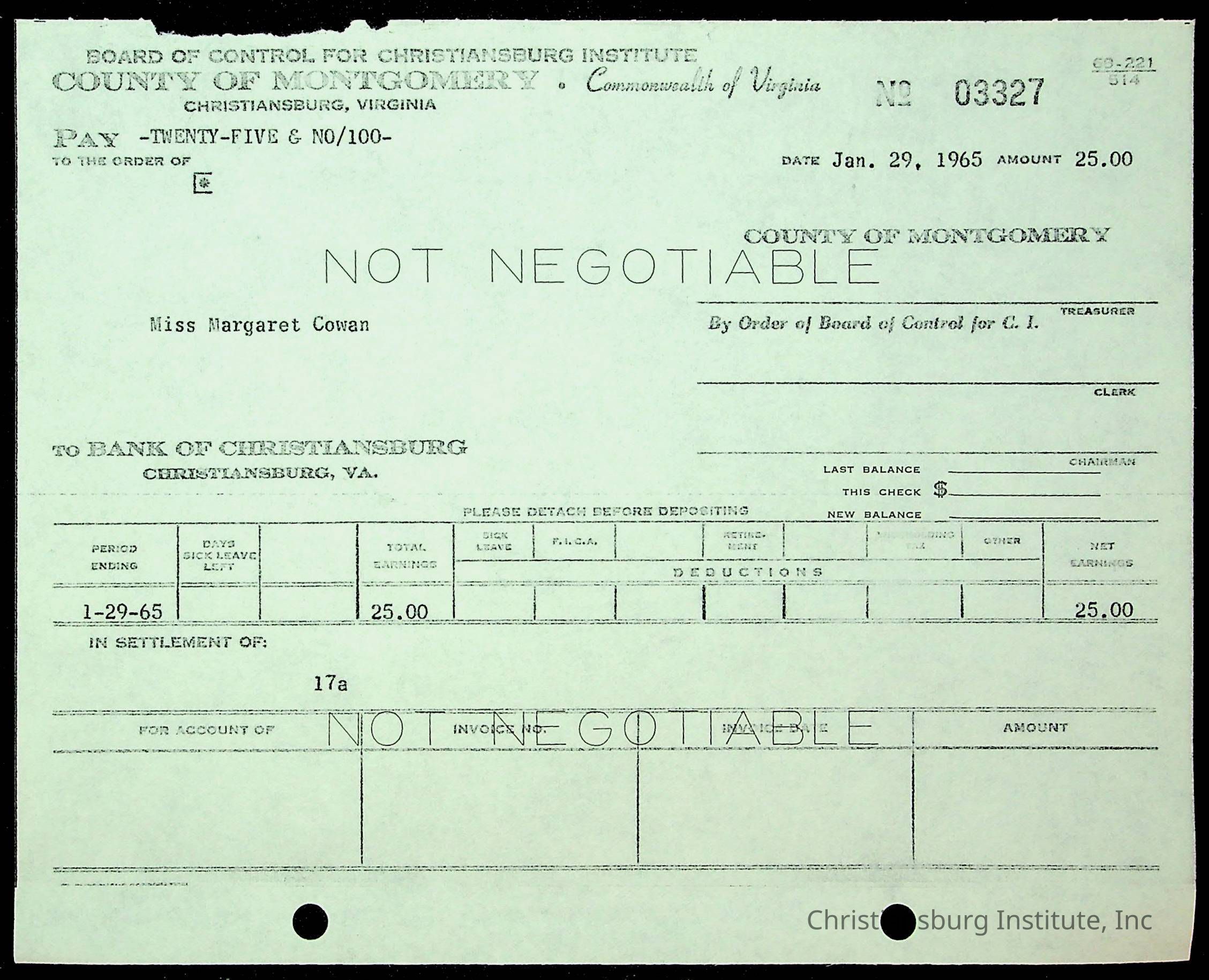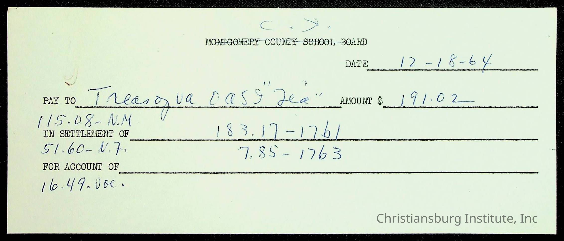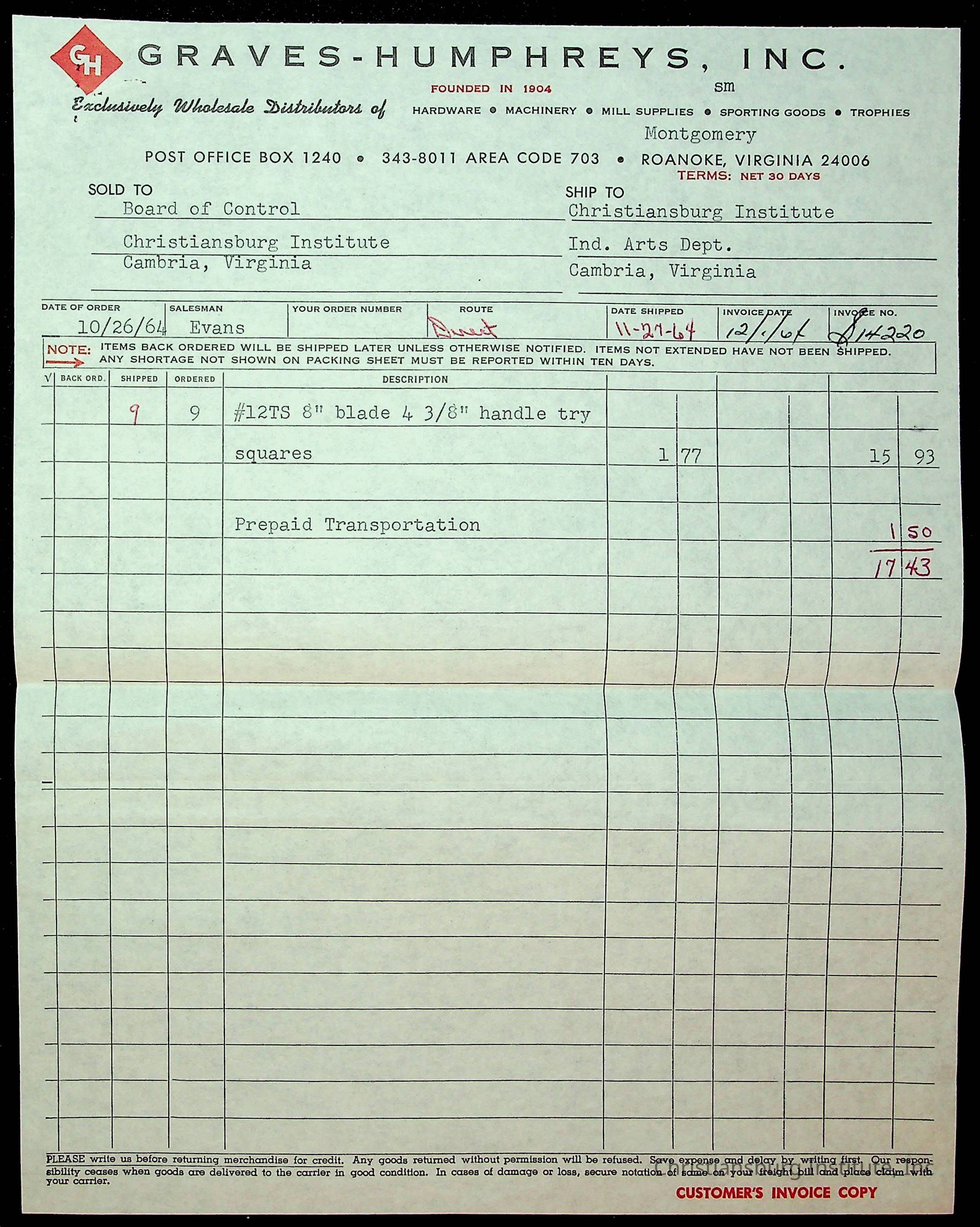 An archive of financial documents relating to the Board of Control for Christiansburg Institute dated 1964-1965. Documents include; bills, statements, and receipts.