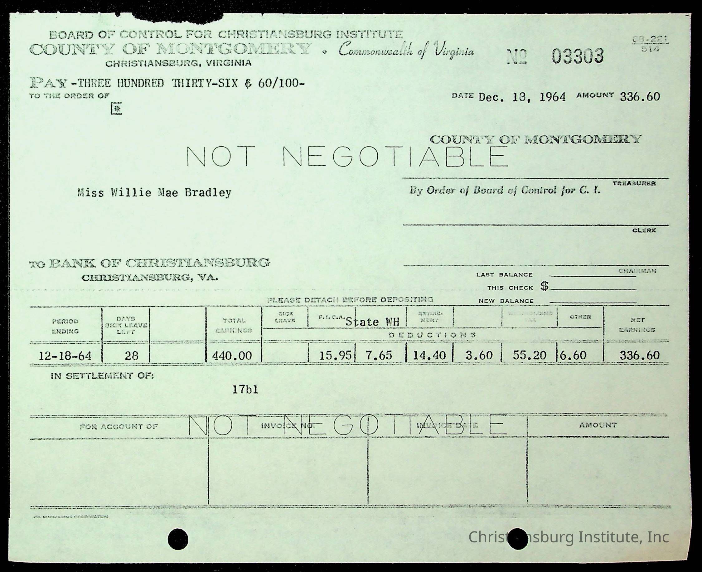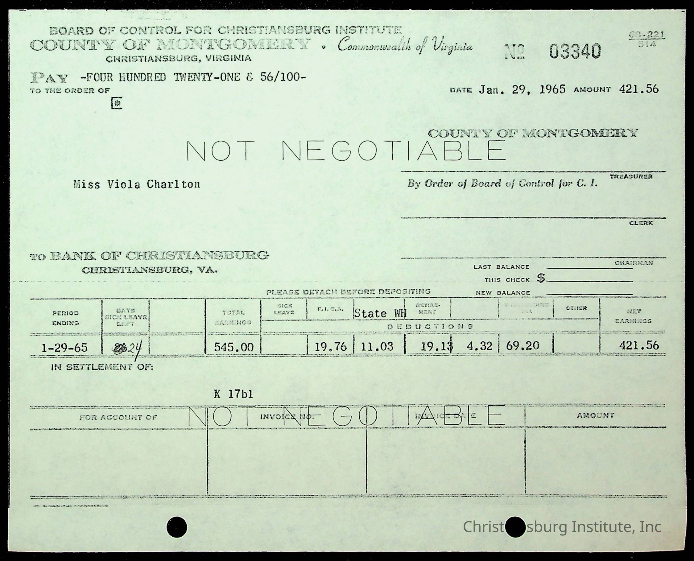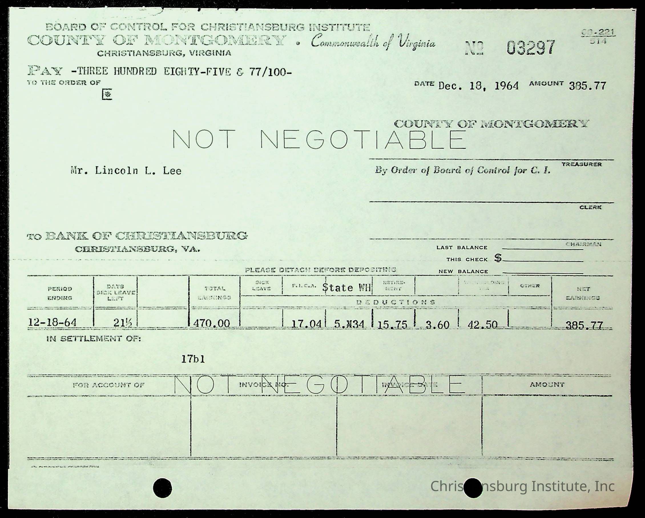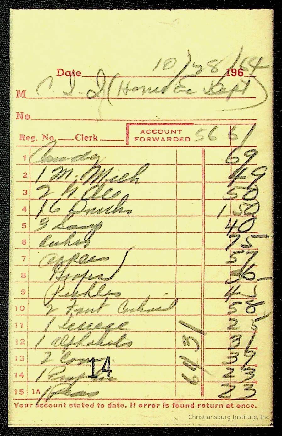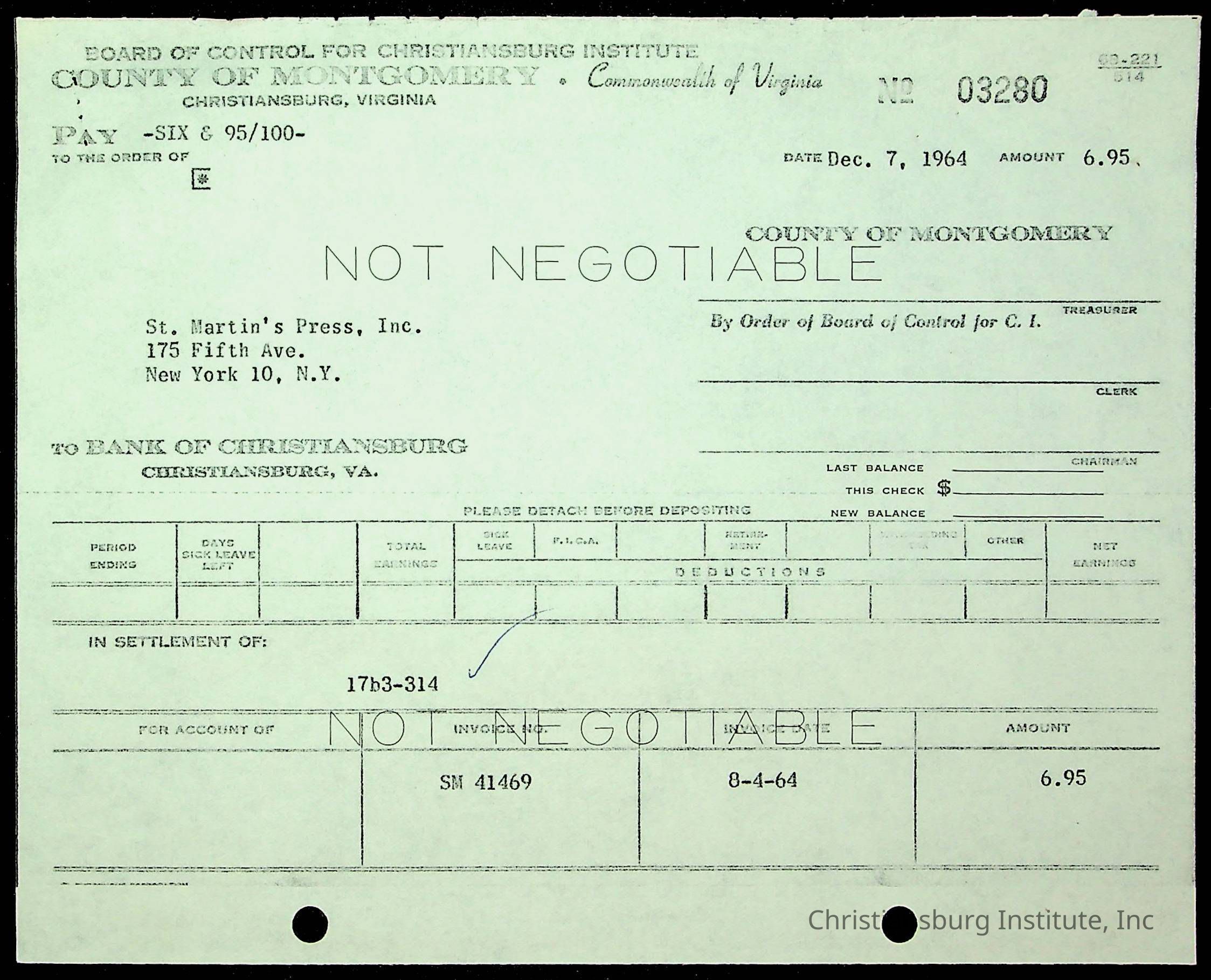 An archive of financial documents relating to the Board of Control for Christiansburg Institute dated 1964-1965. Documents include; bills, statements, and receipts.