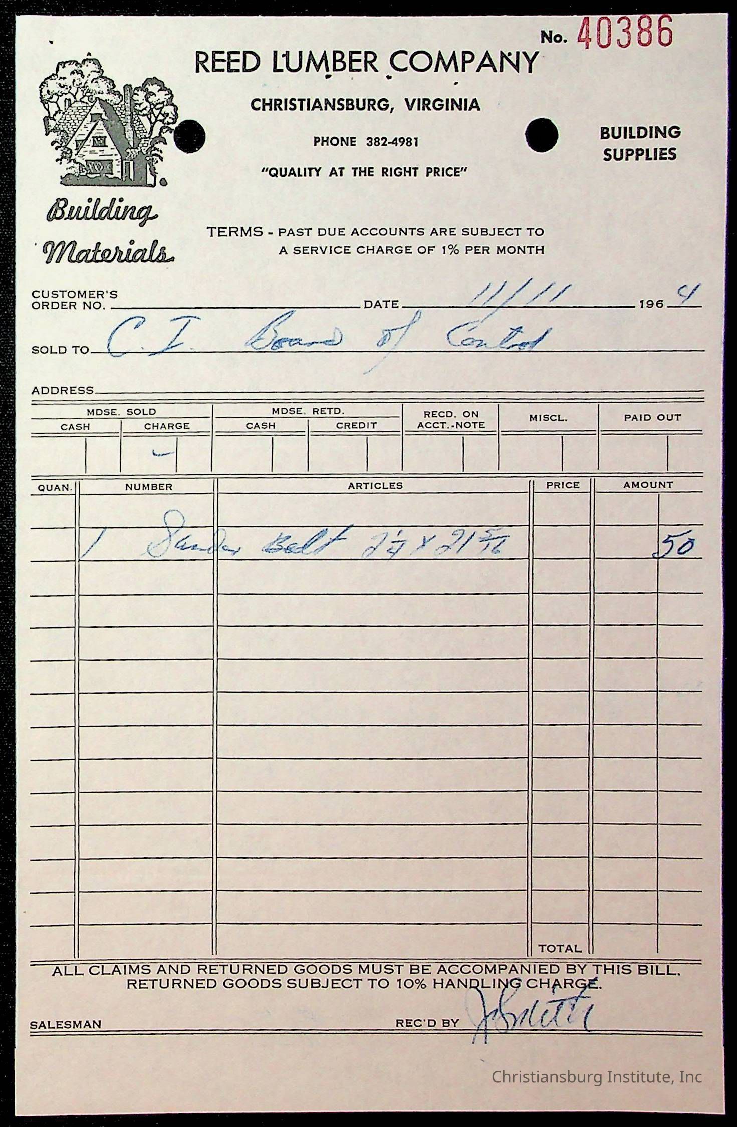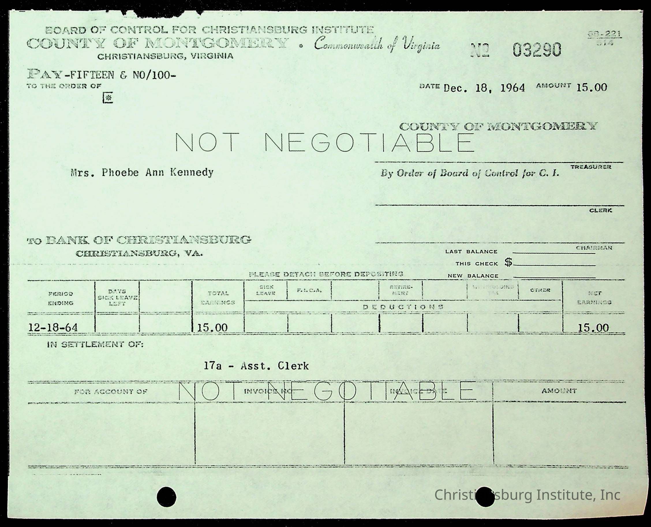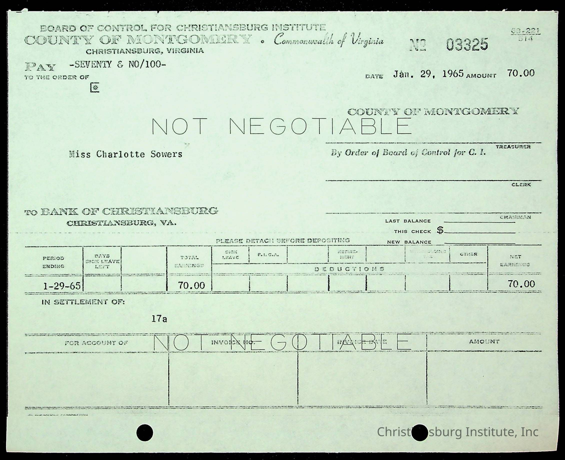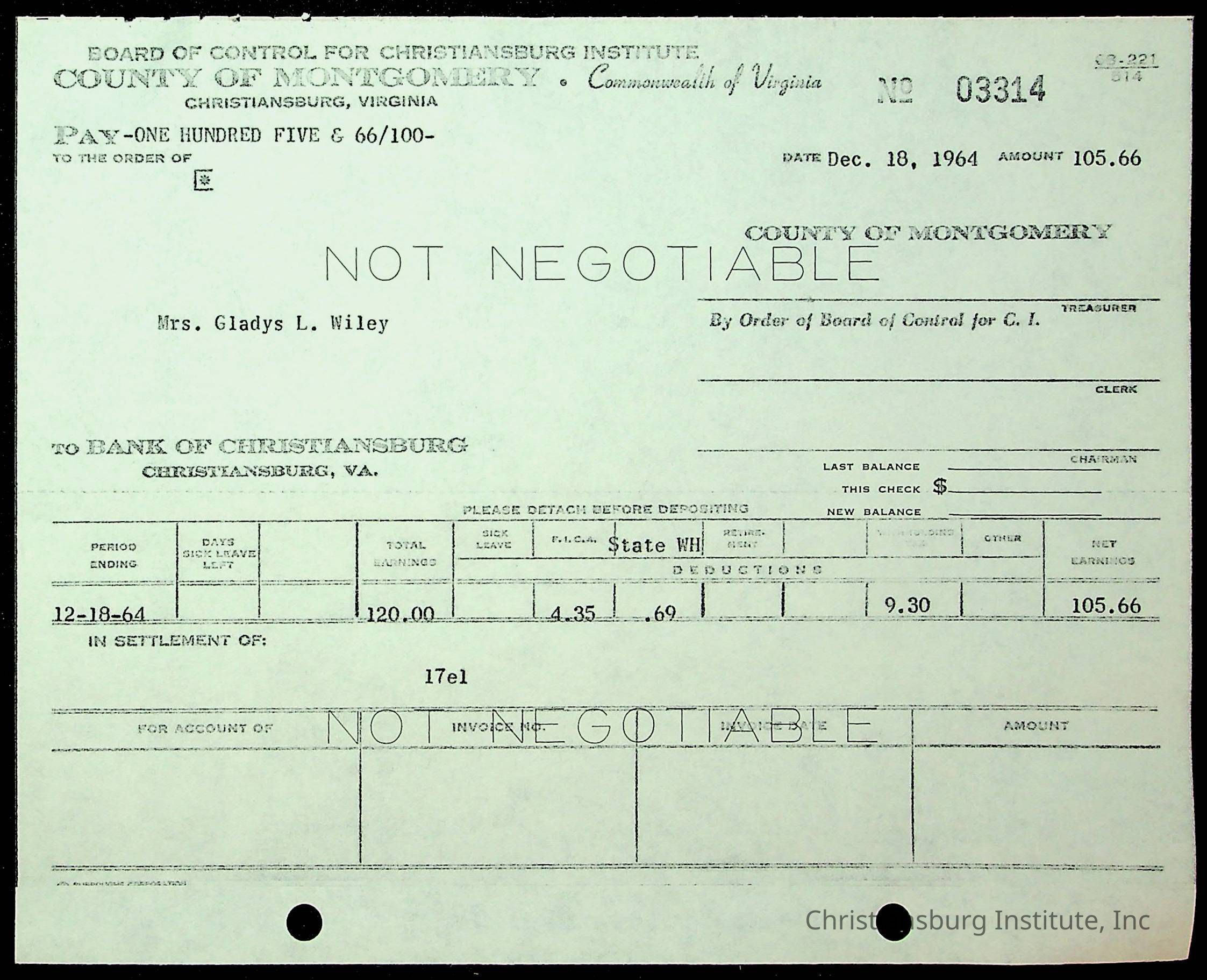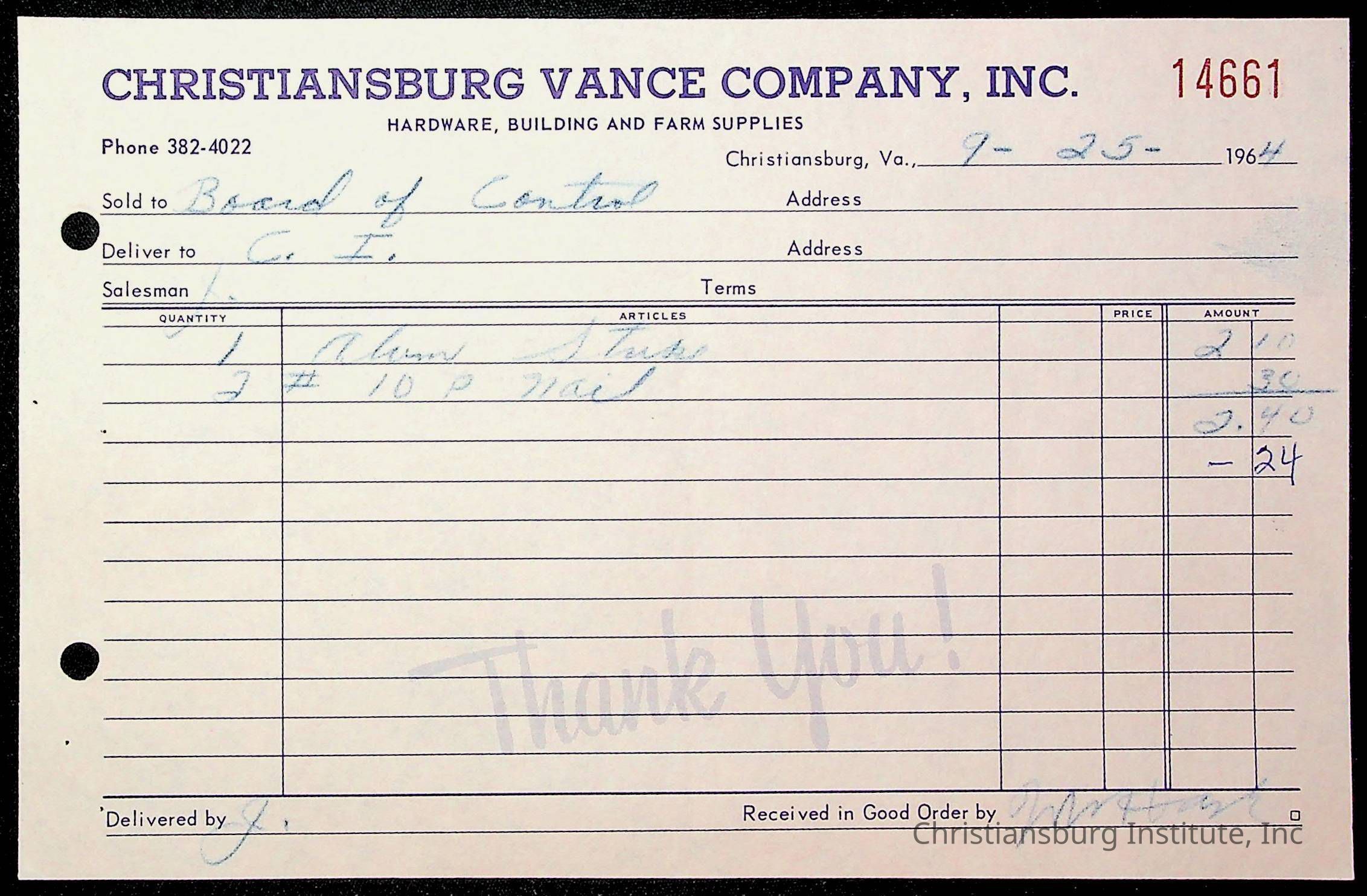 An archive of financial documents relating to the Board of Control for Christiansburg Institute dated 1964-1965. Documents include; bills, statements, and receipts.
