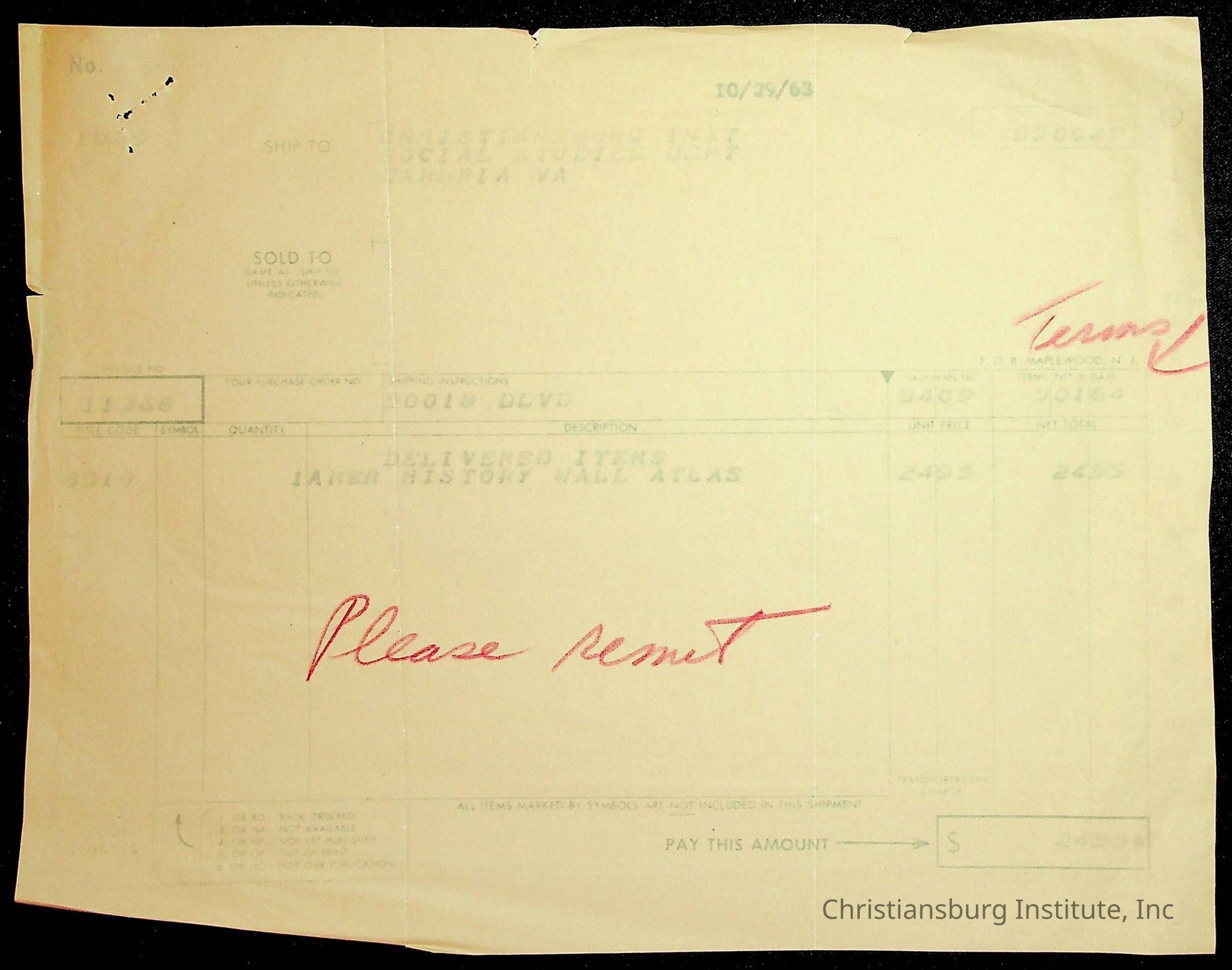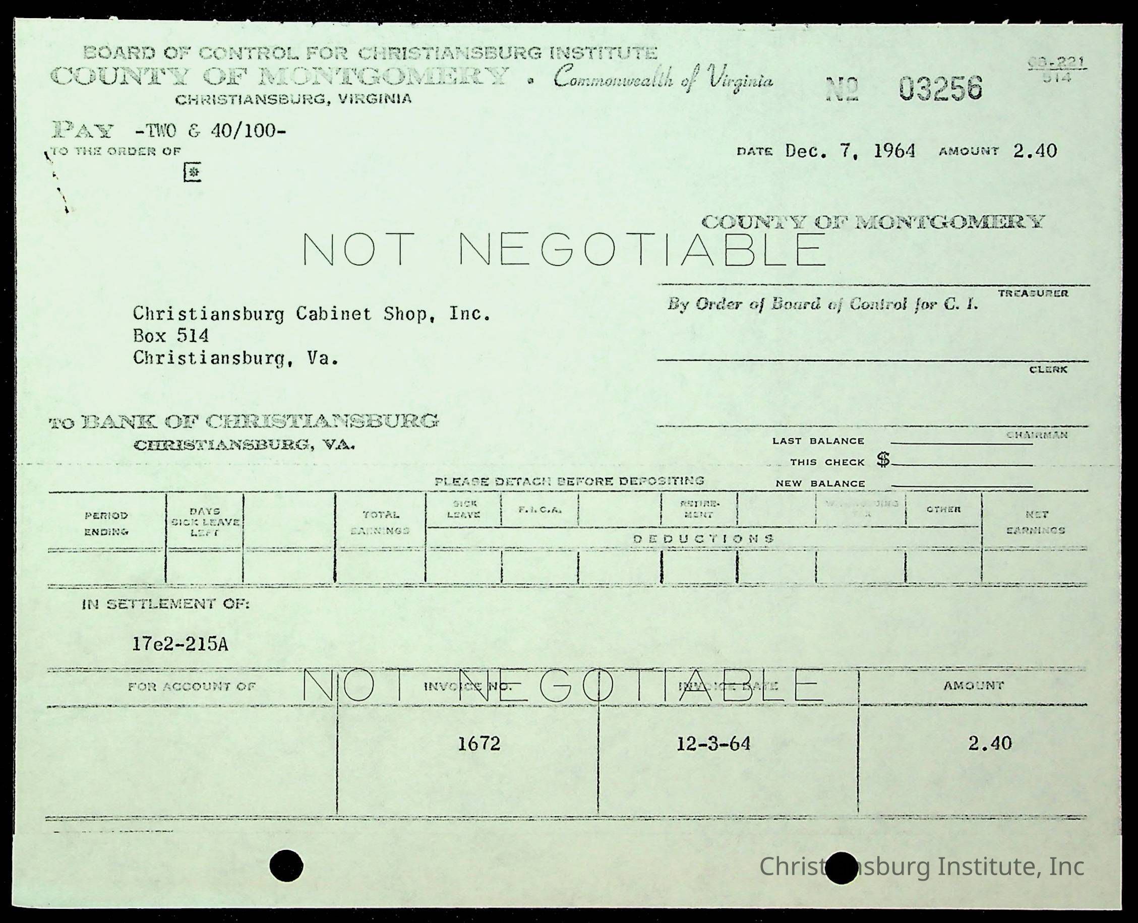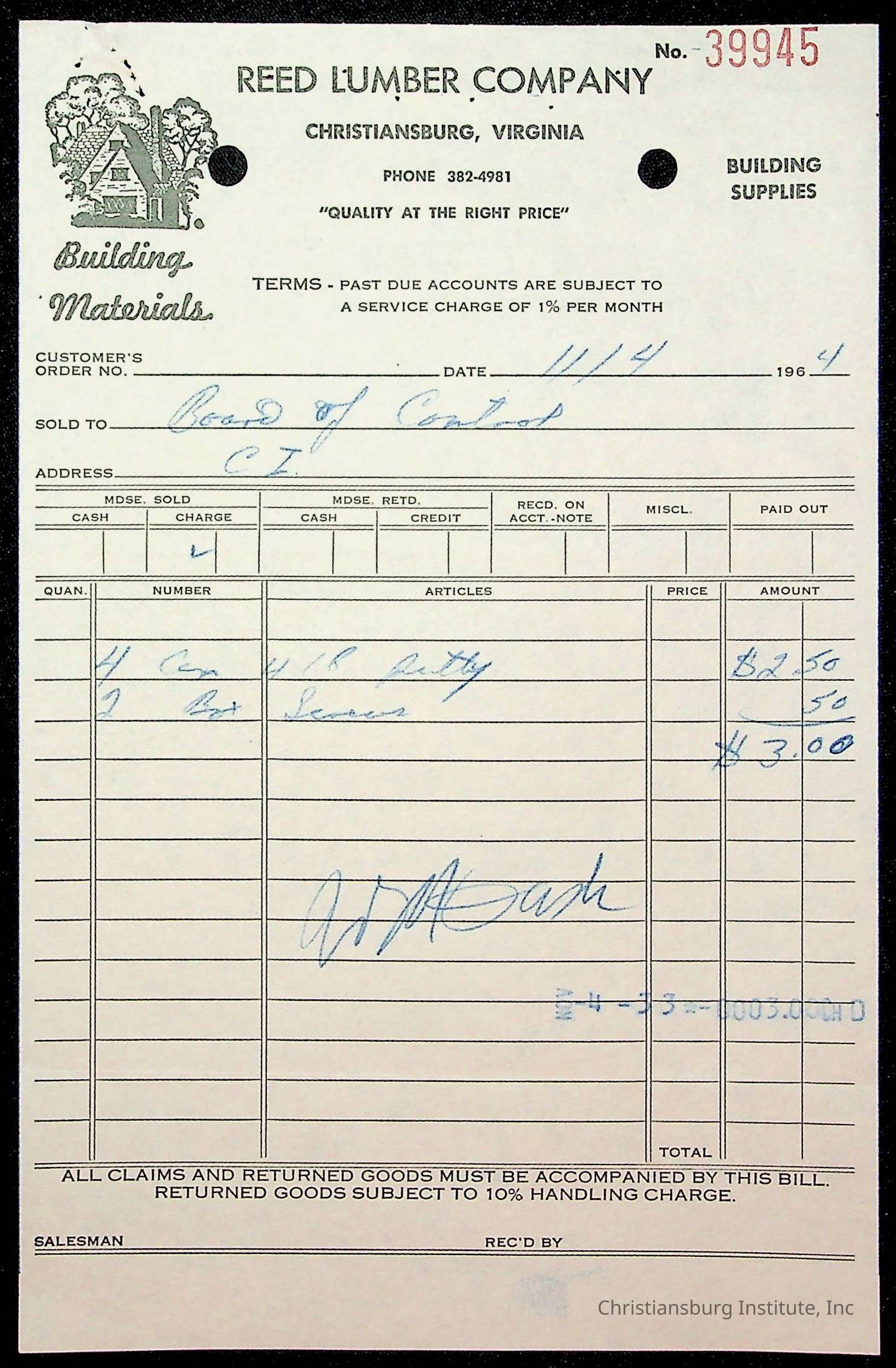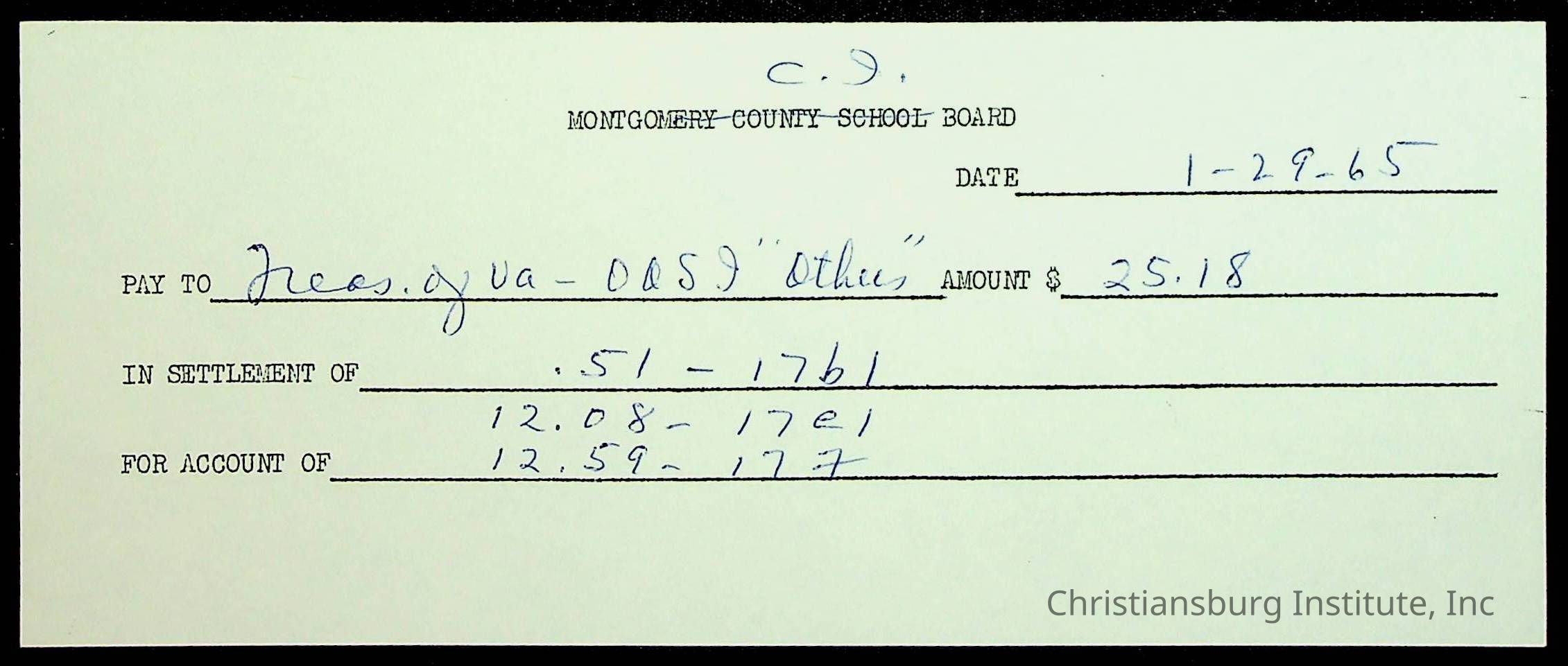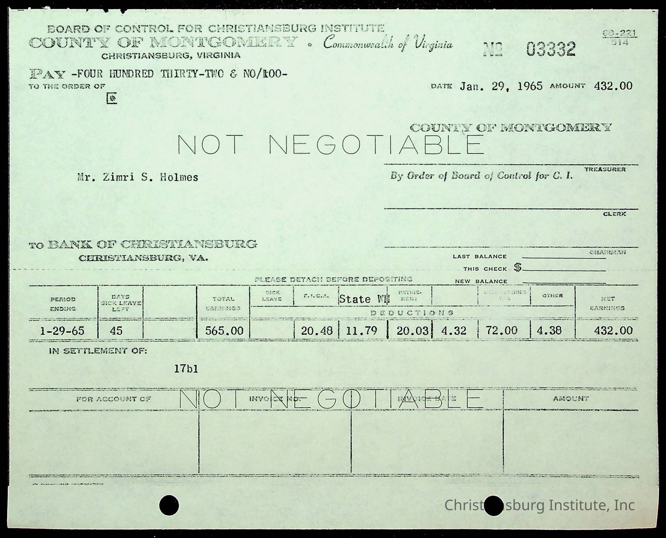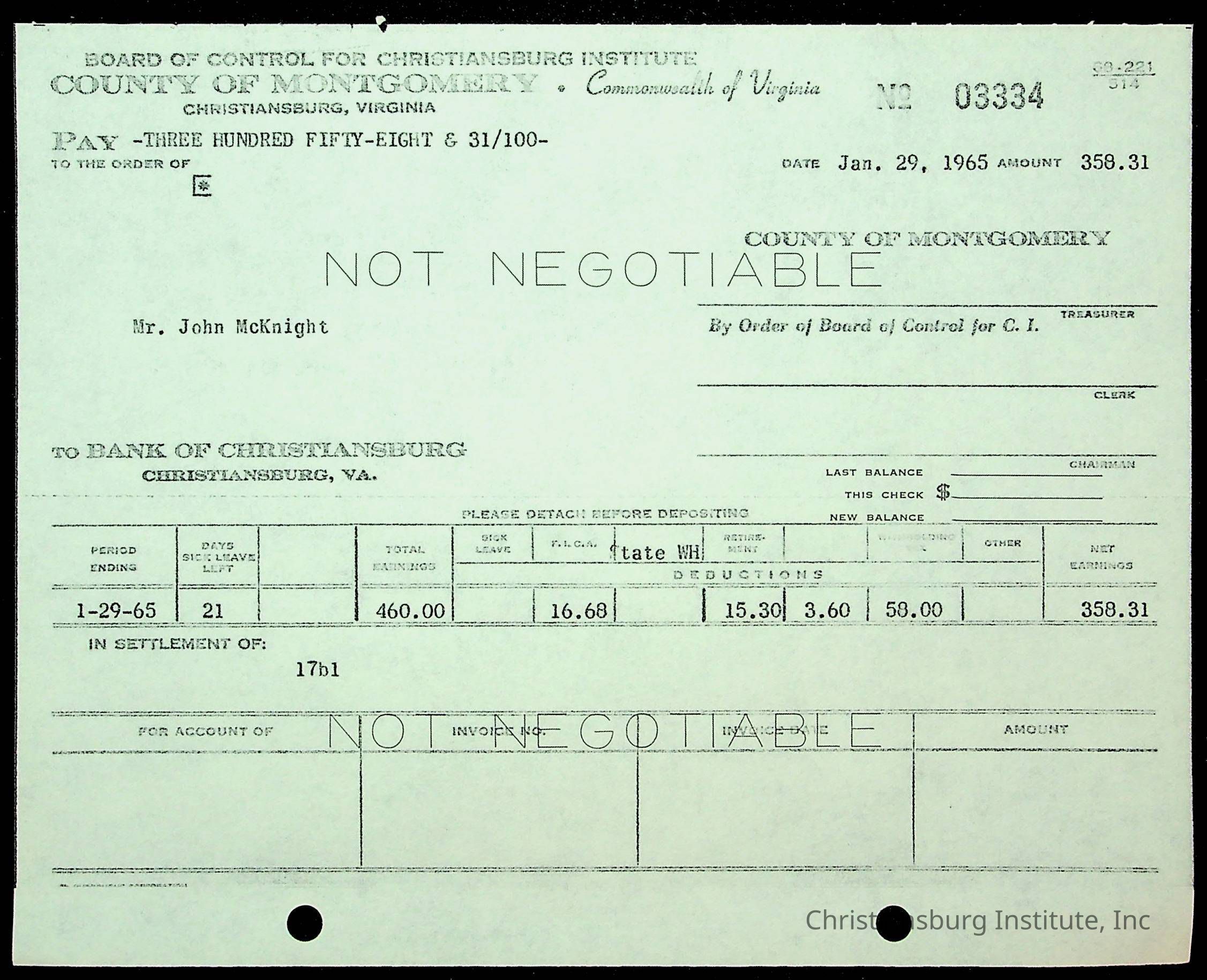 An archive of financial documents relating to the Board of Control for Christiansburg Institute dated 1964-1965. Documents include; bills, statements, and receipts.