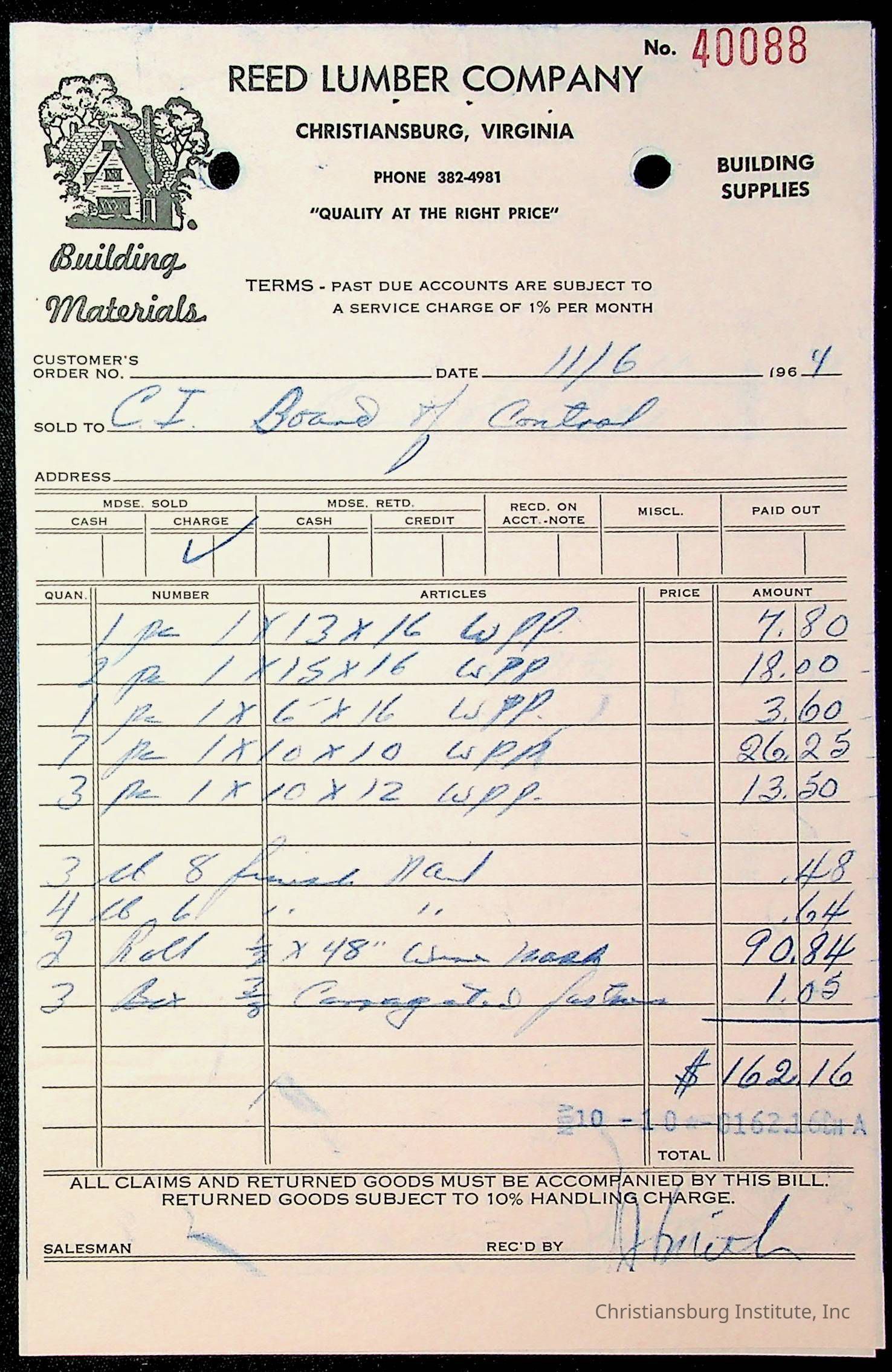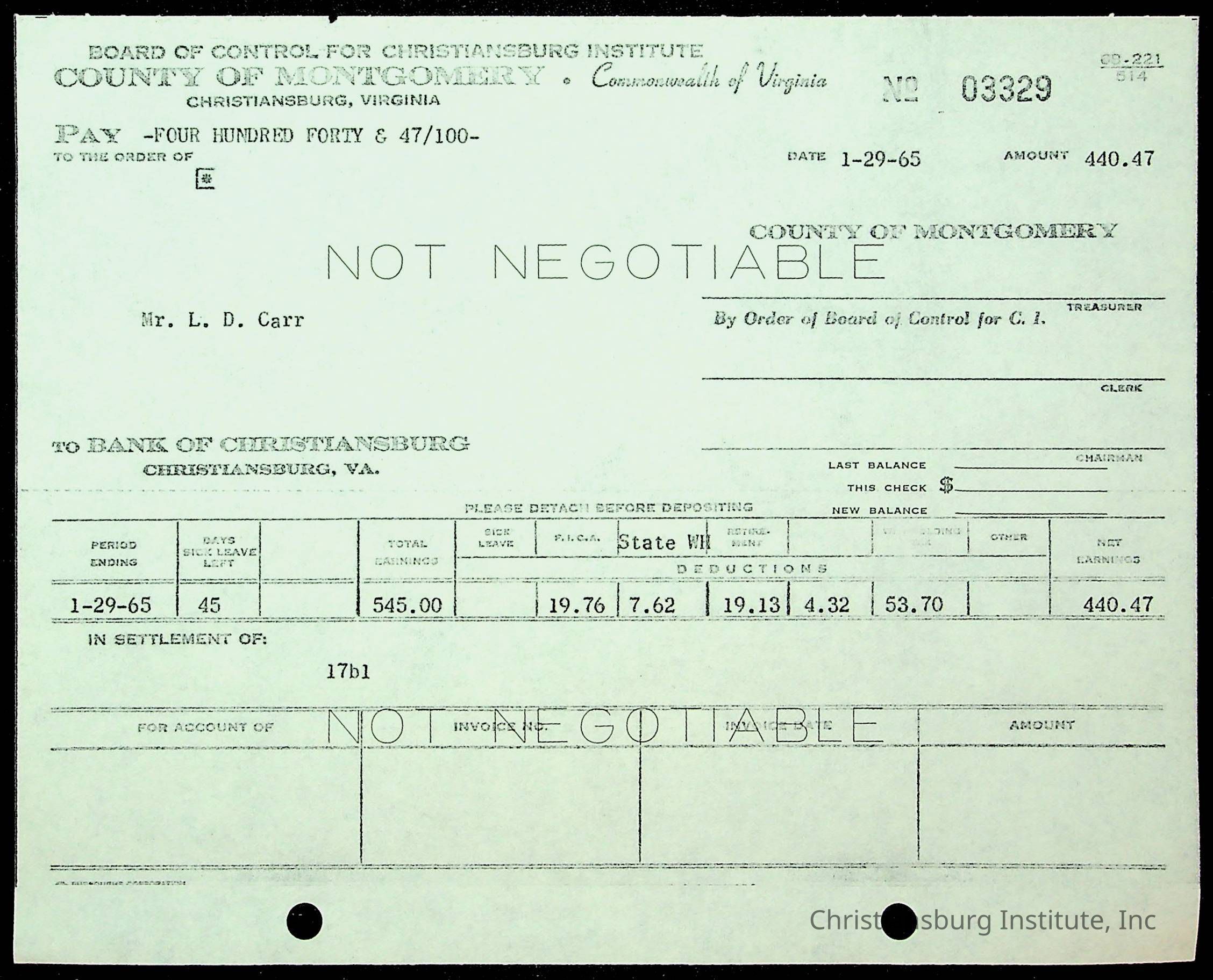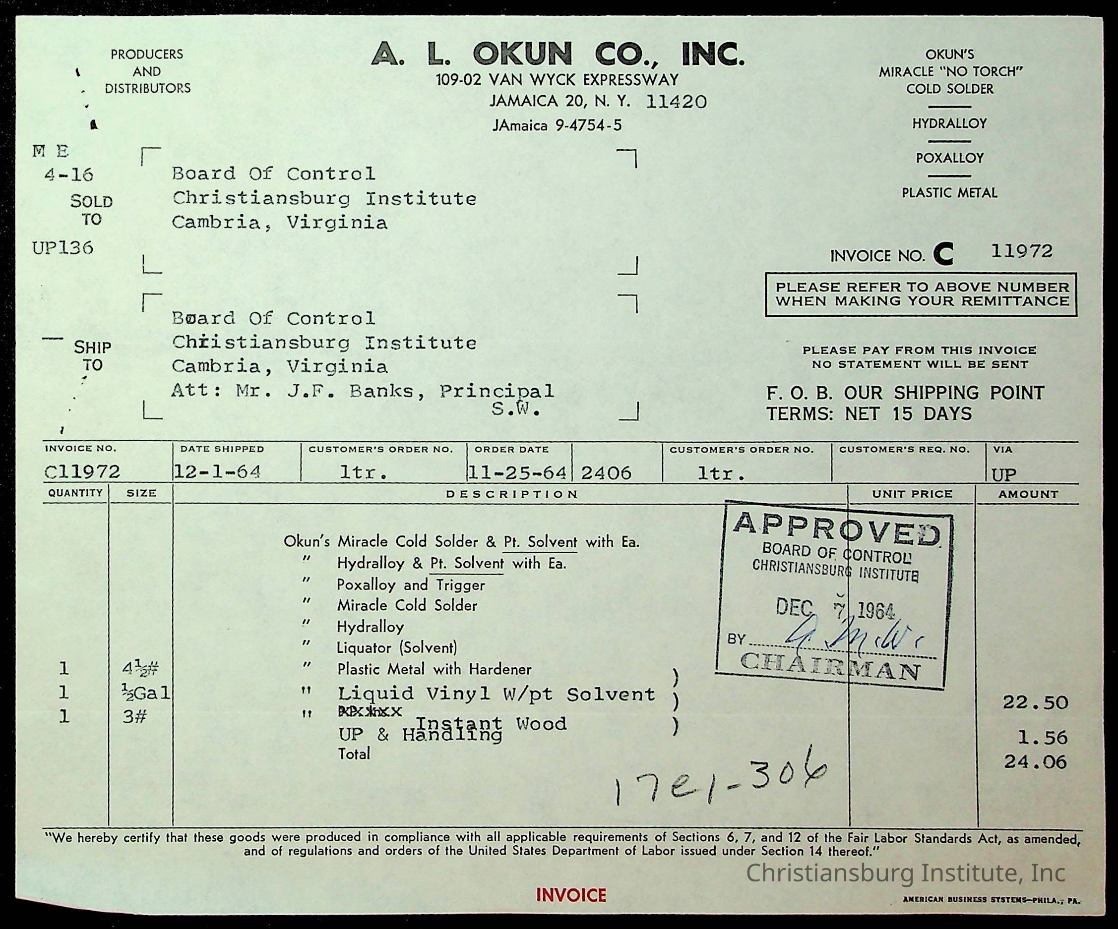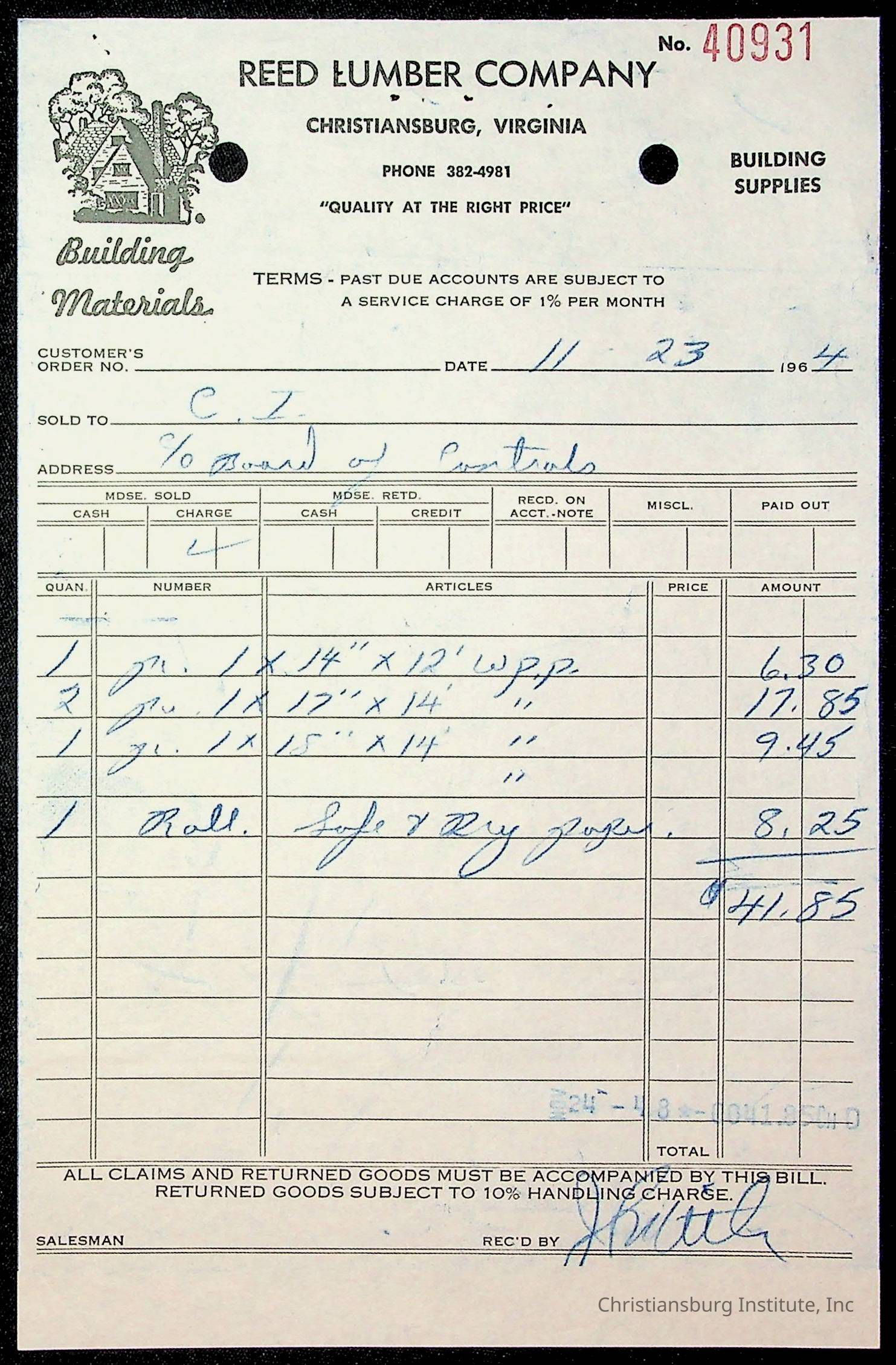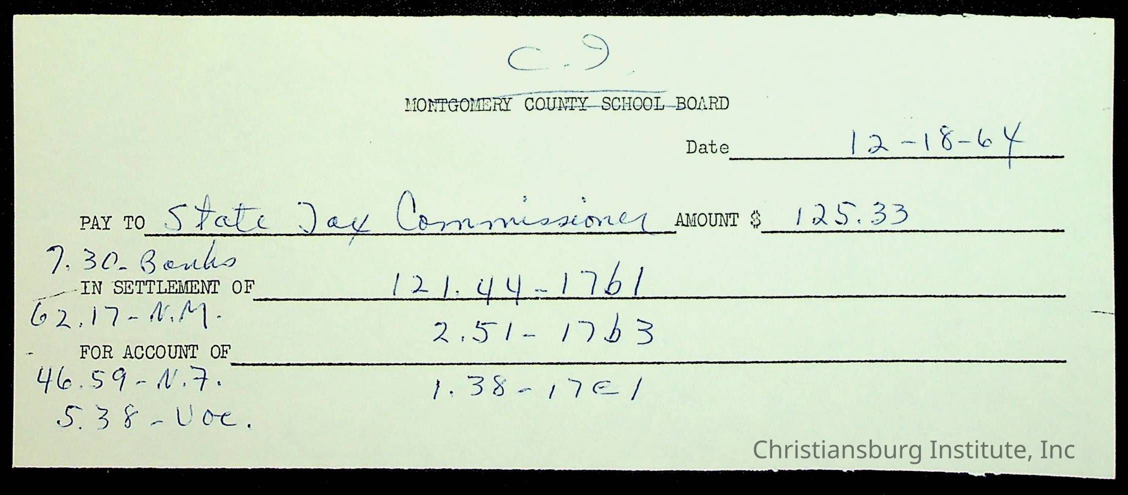An archive of financial documents relating to the Board of Control for Christiansburg Institute dated 1964-1965. Documents include; bills, statements, and receipts.