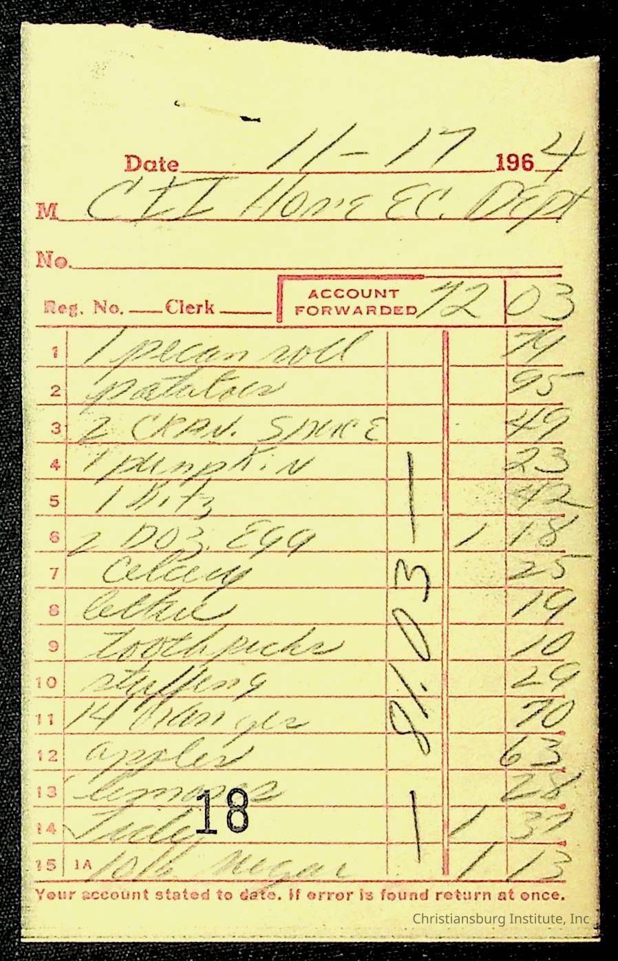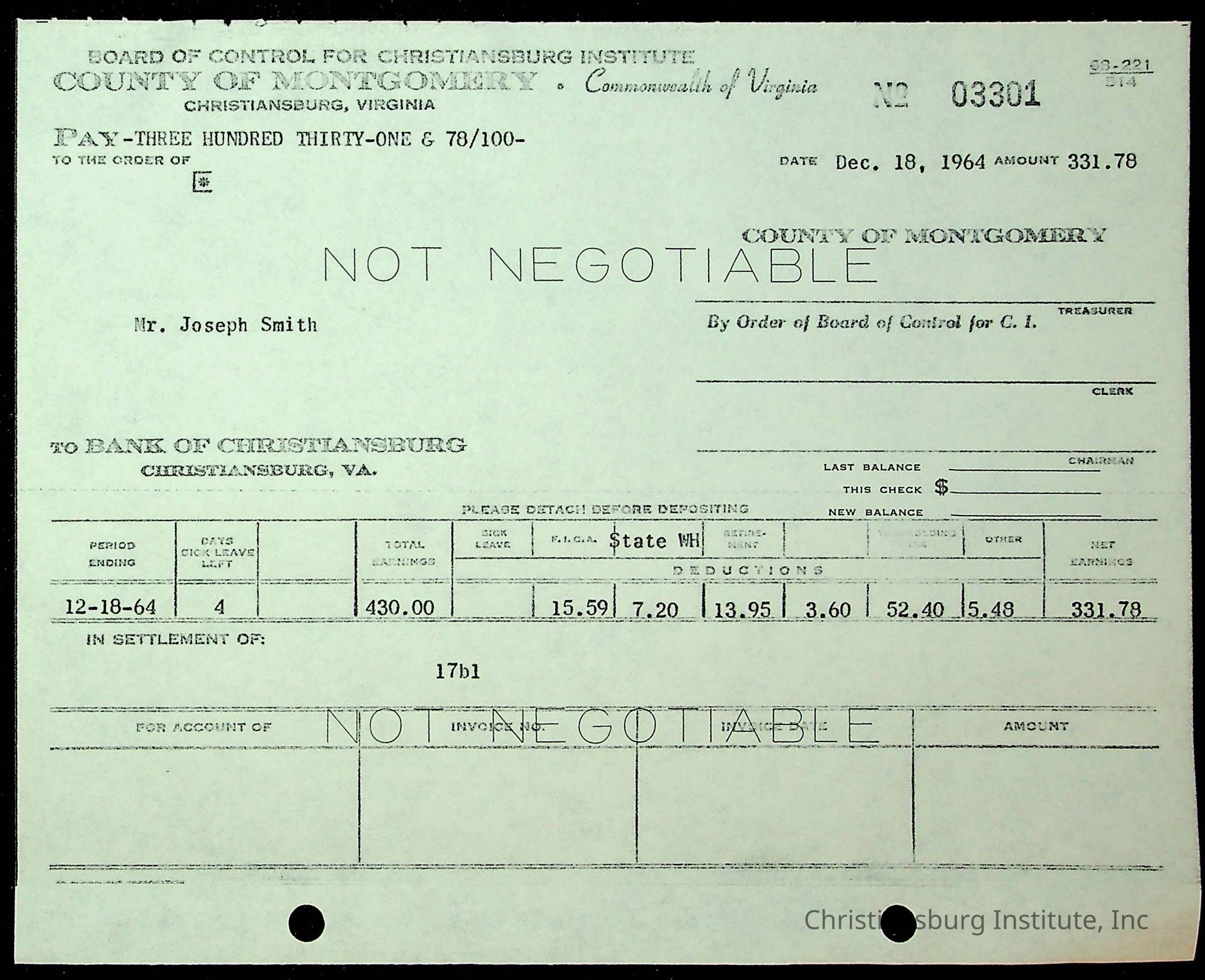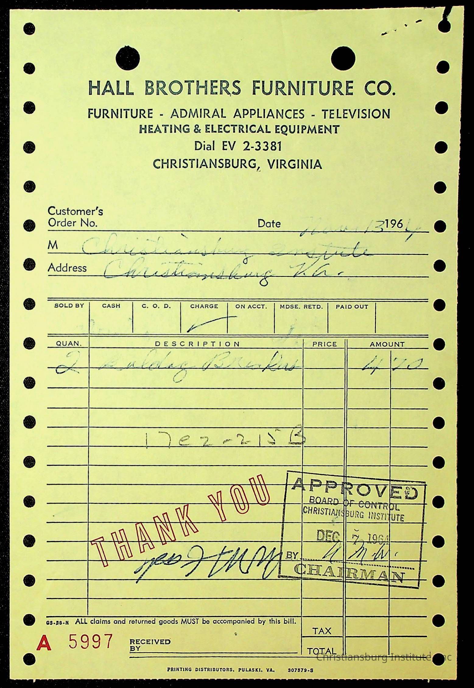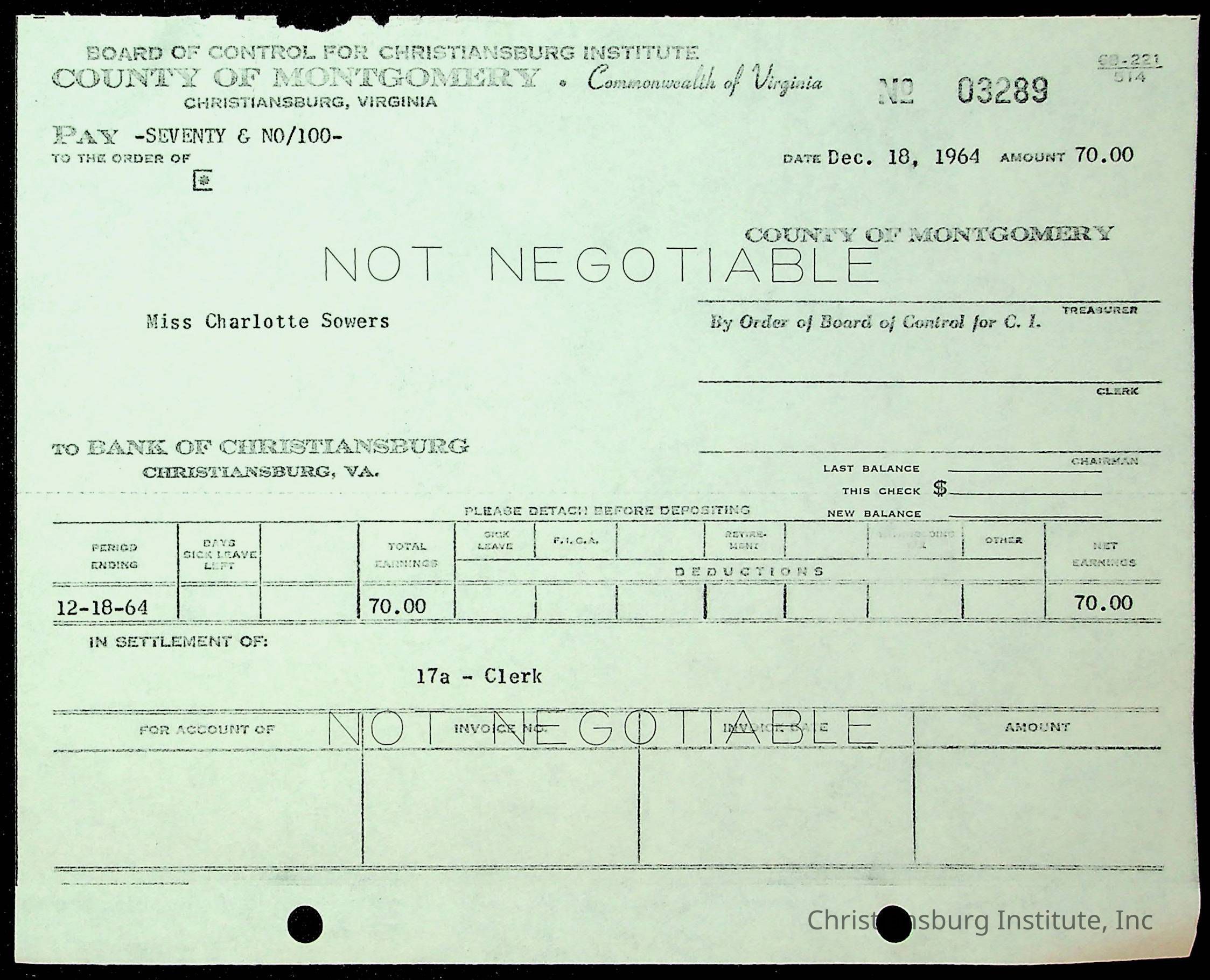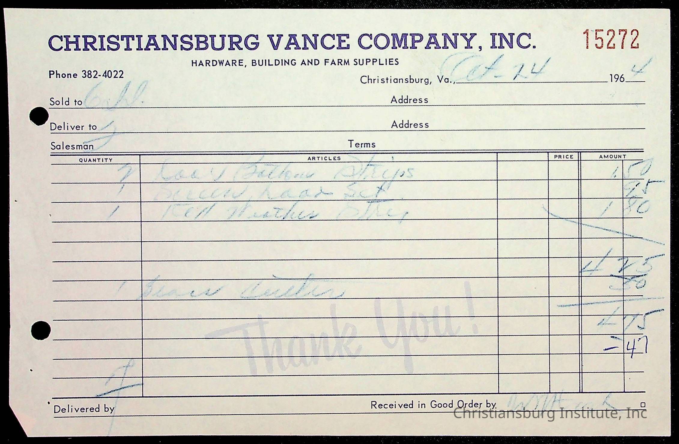 An archive of financial documents relating to the Board of Control for Christiansburg Institute dated 1964-1965. Documents include; bills, statements, and receipts.