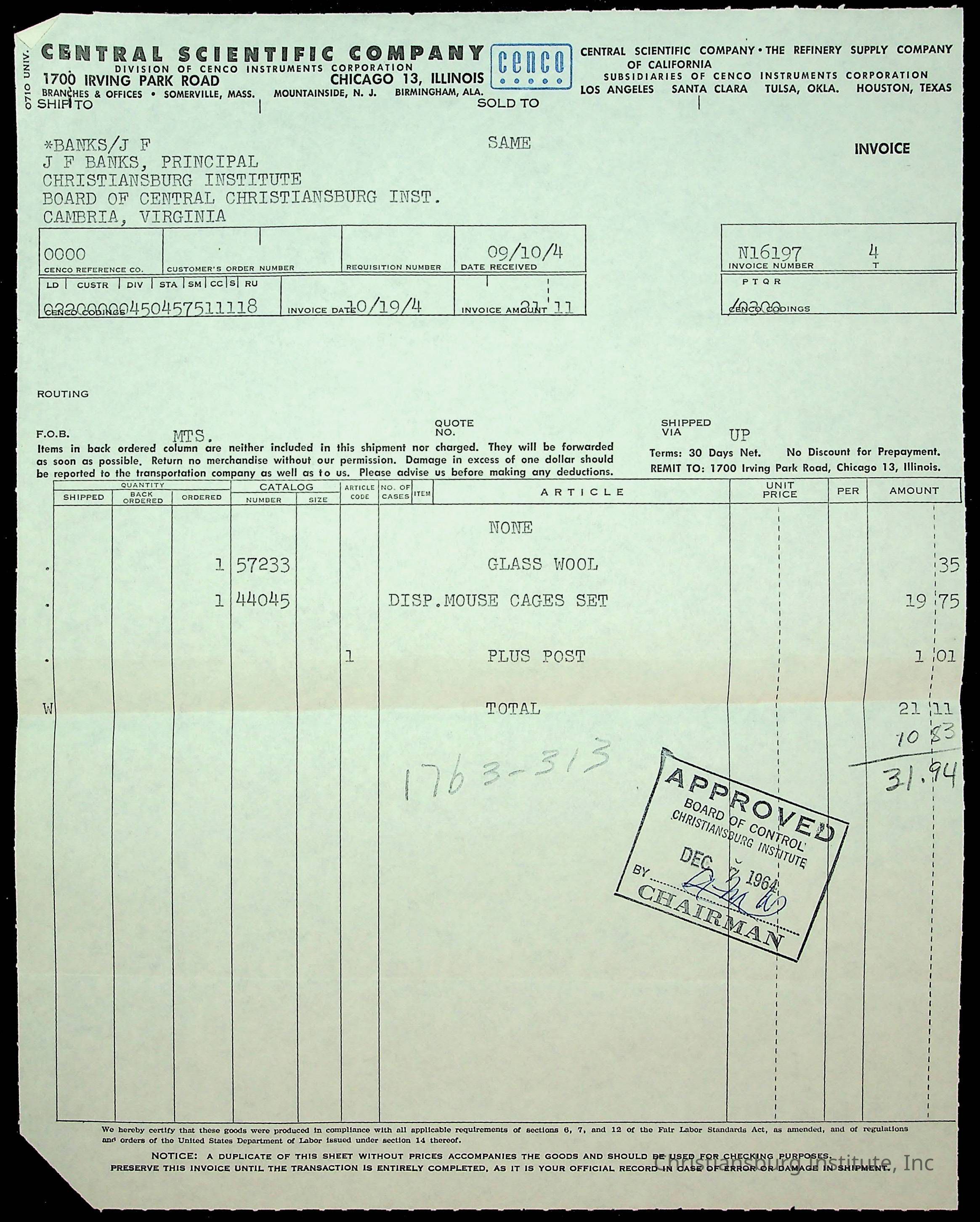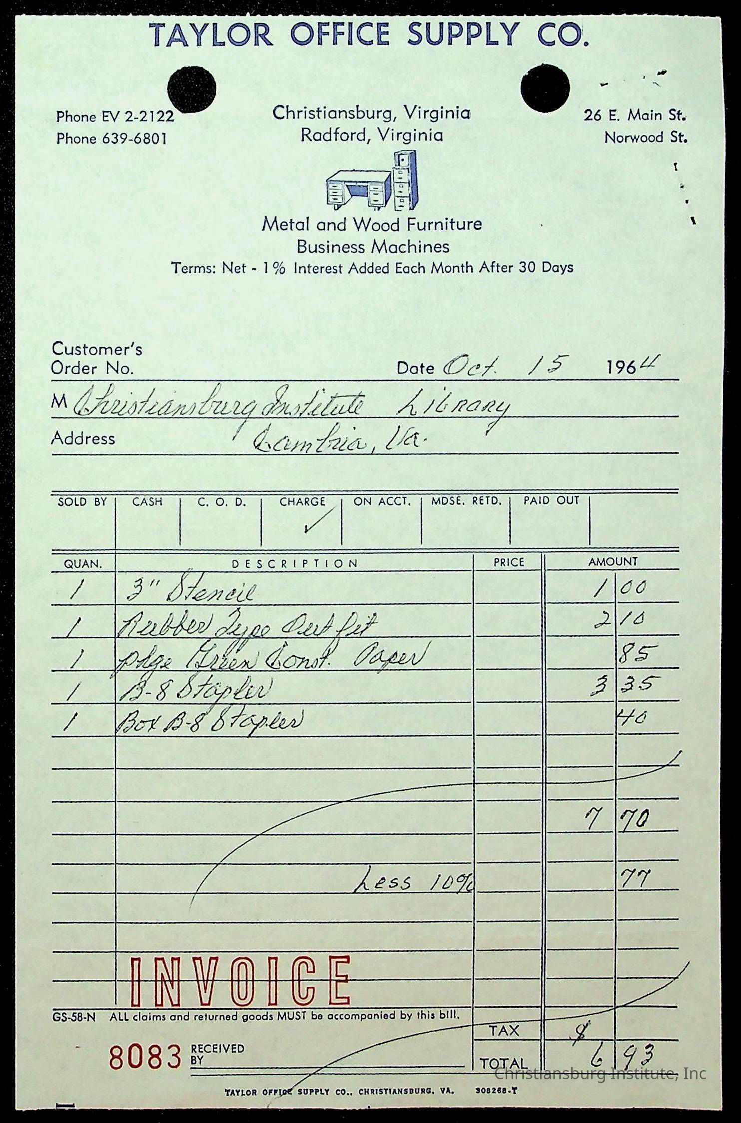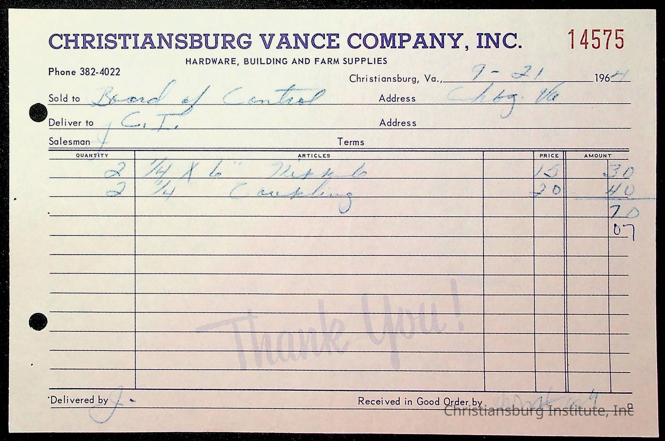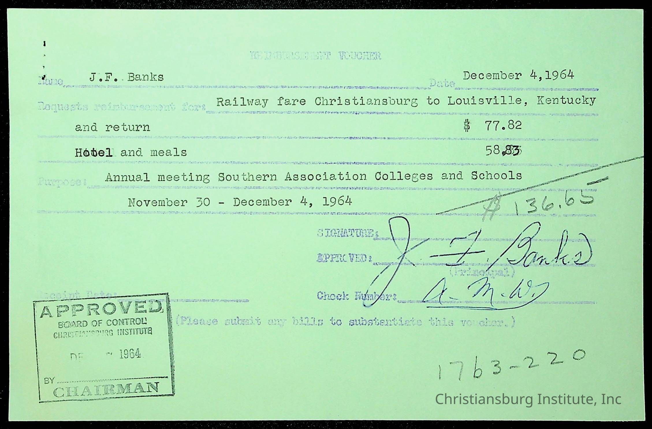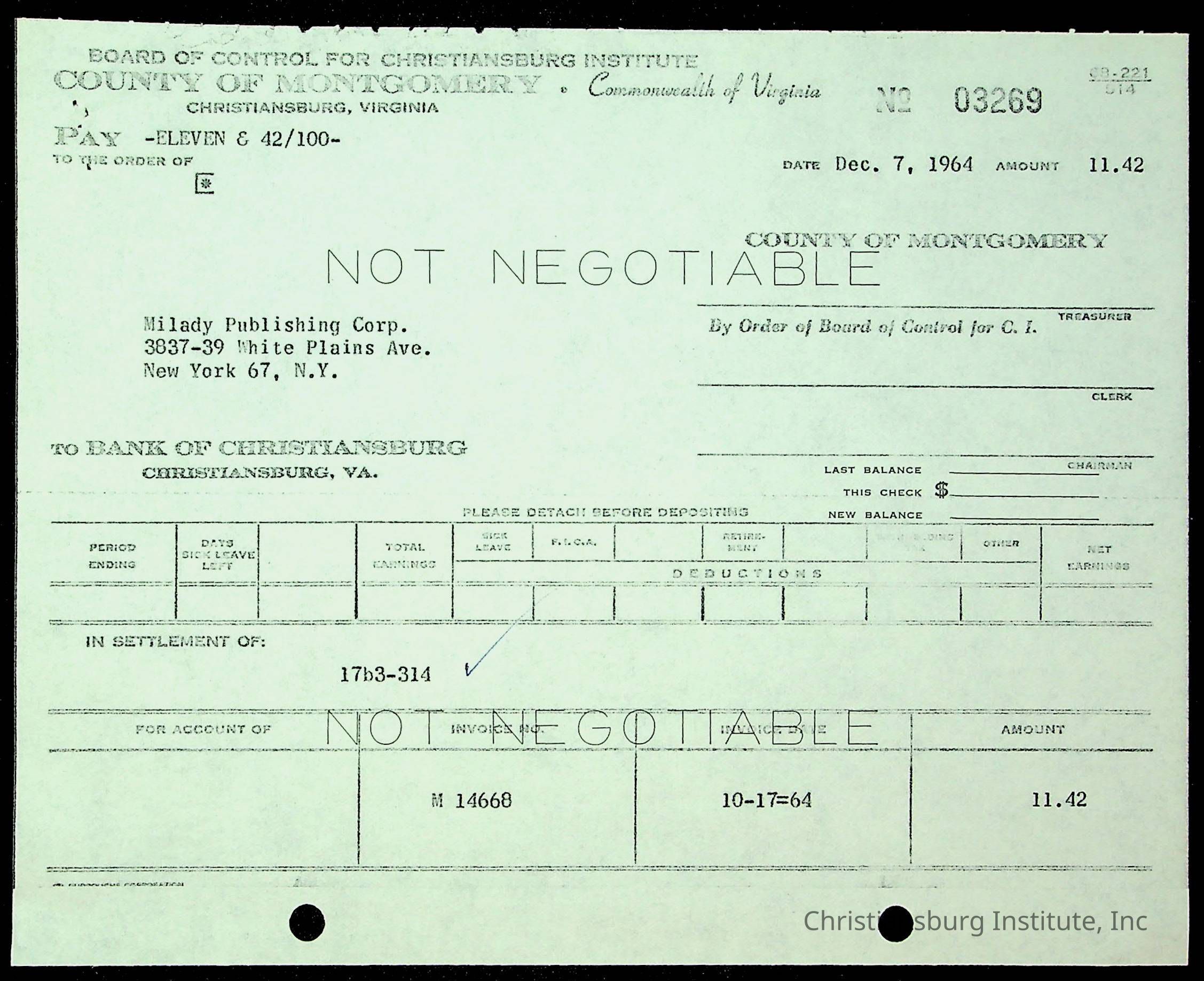 An archive of financial documents relating to the Board of Control for Christiansburg Institute dated 1964-1965. Documents include; bills, statements, and receipts.