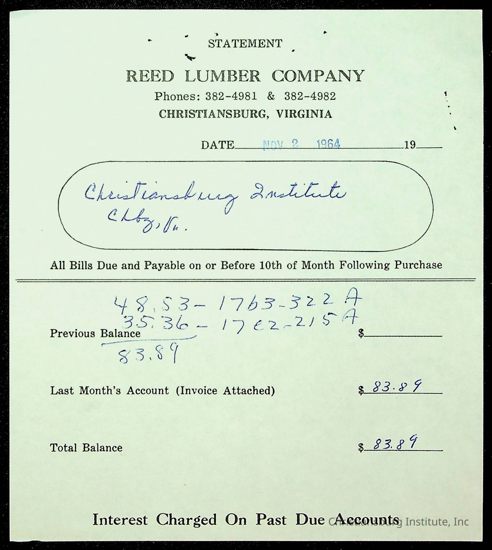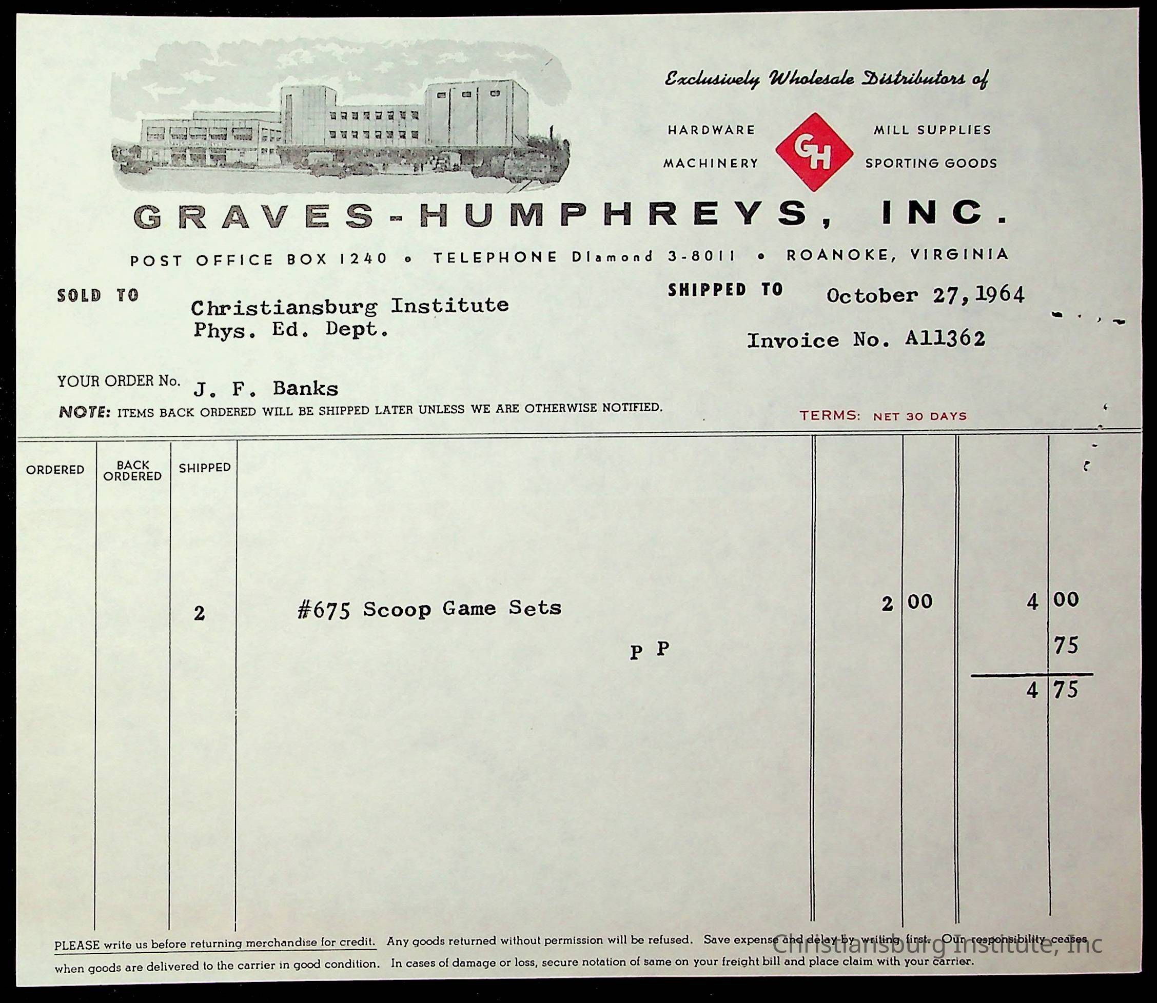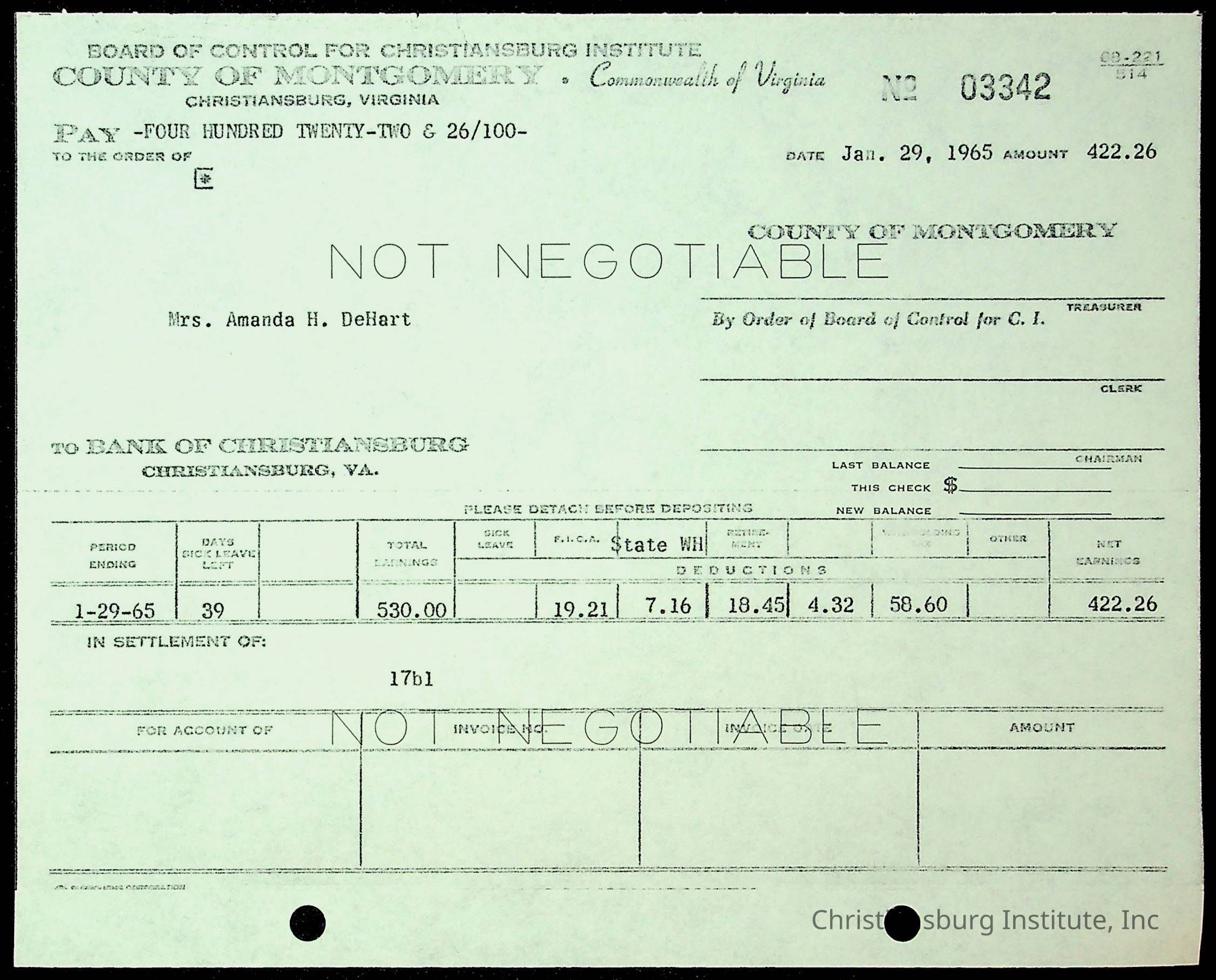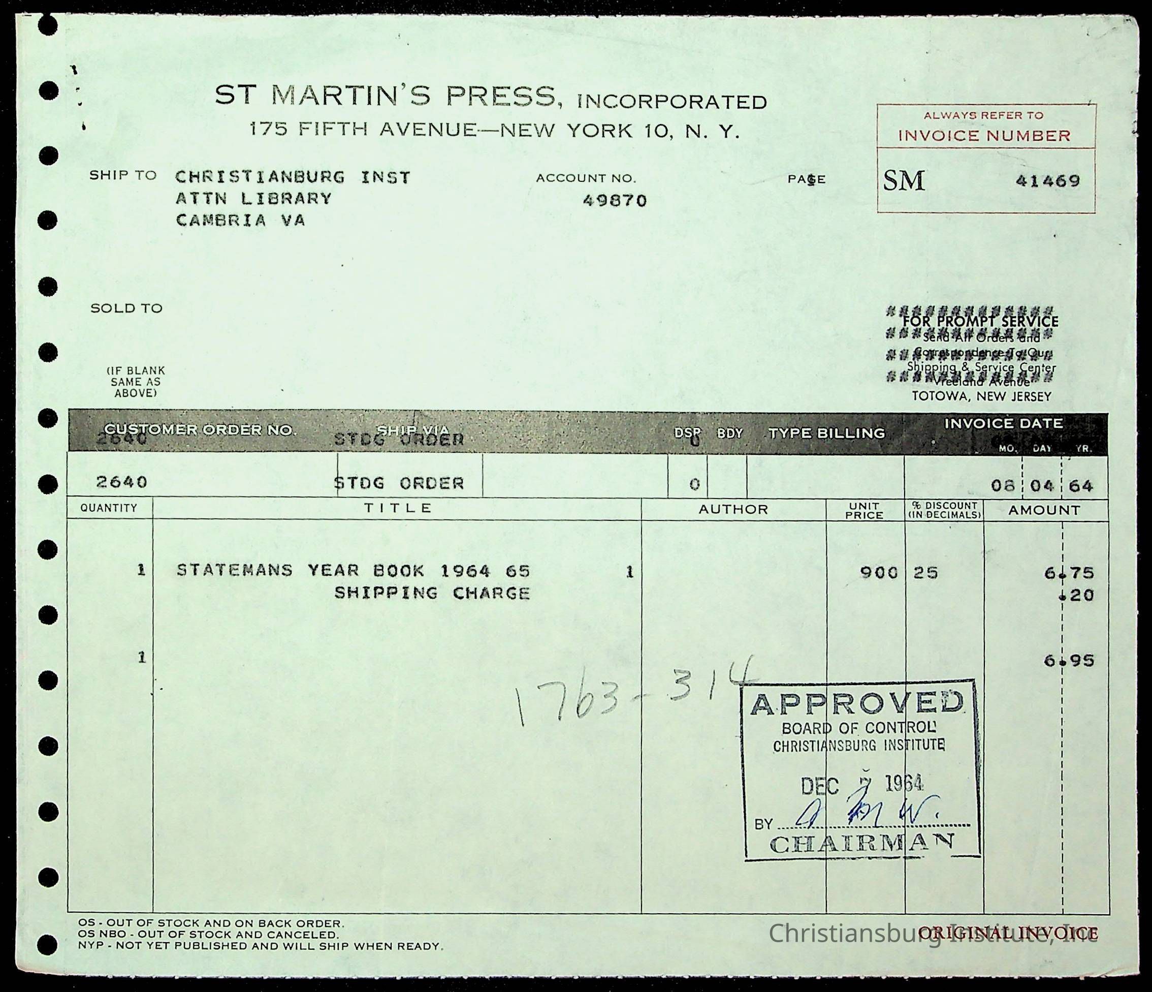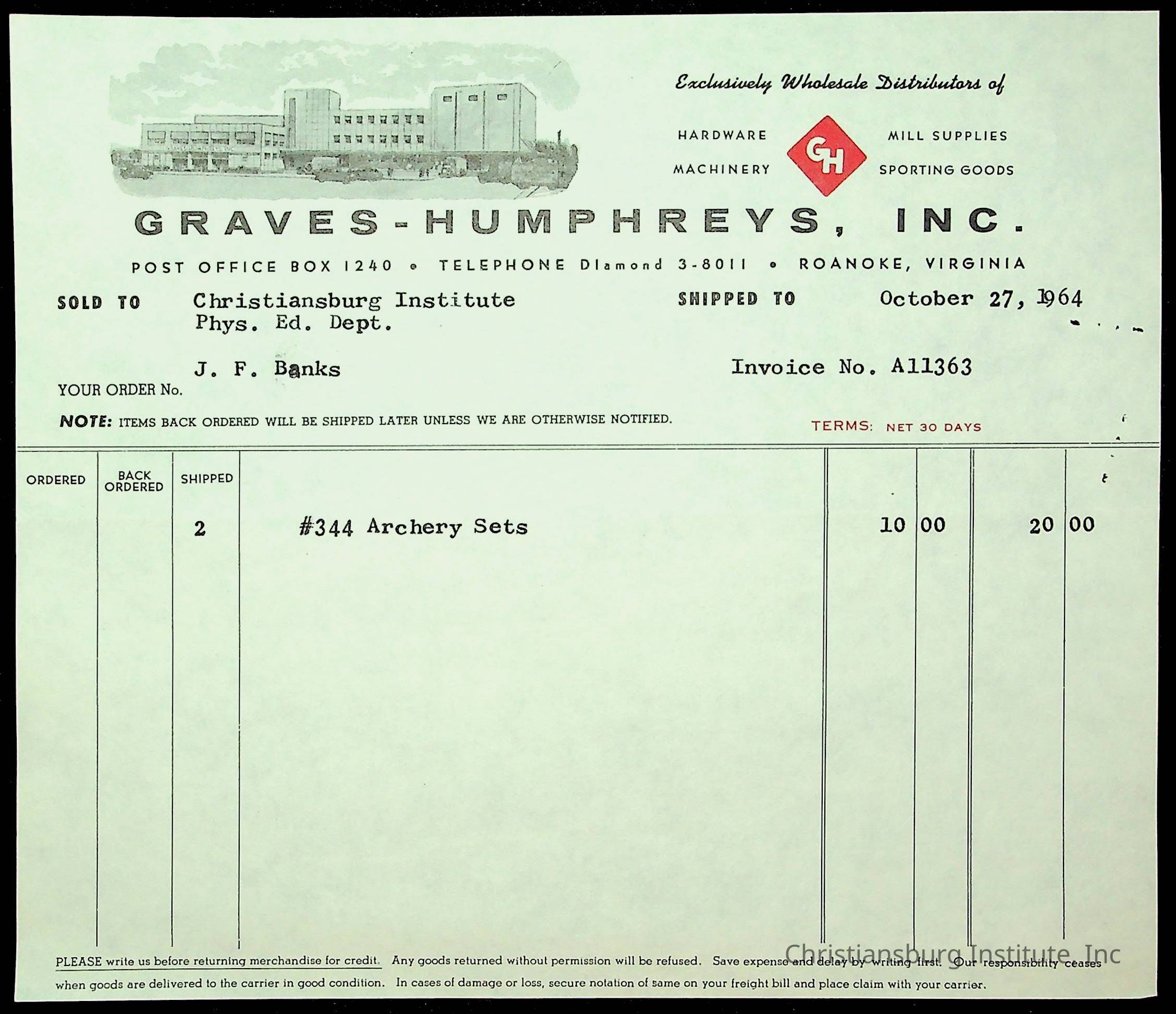 An archive of financial documents relating to the Board of Control for Christiansburg Institute dated 1964-1965. Documents include; bills, statements, and receipts.