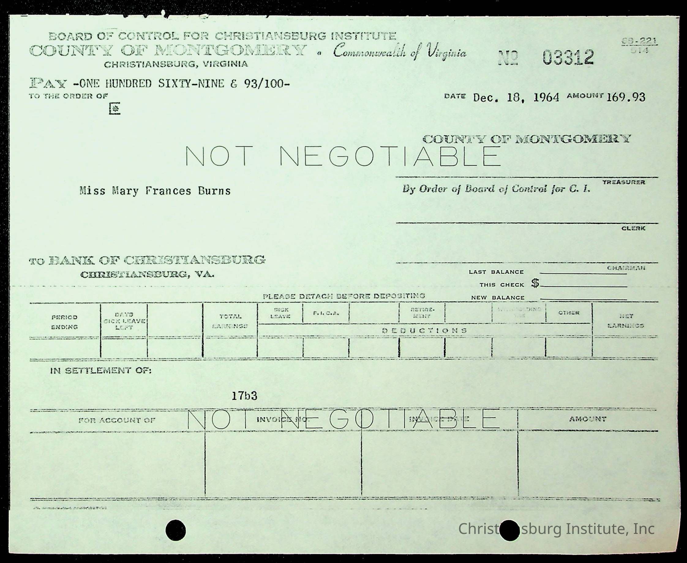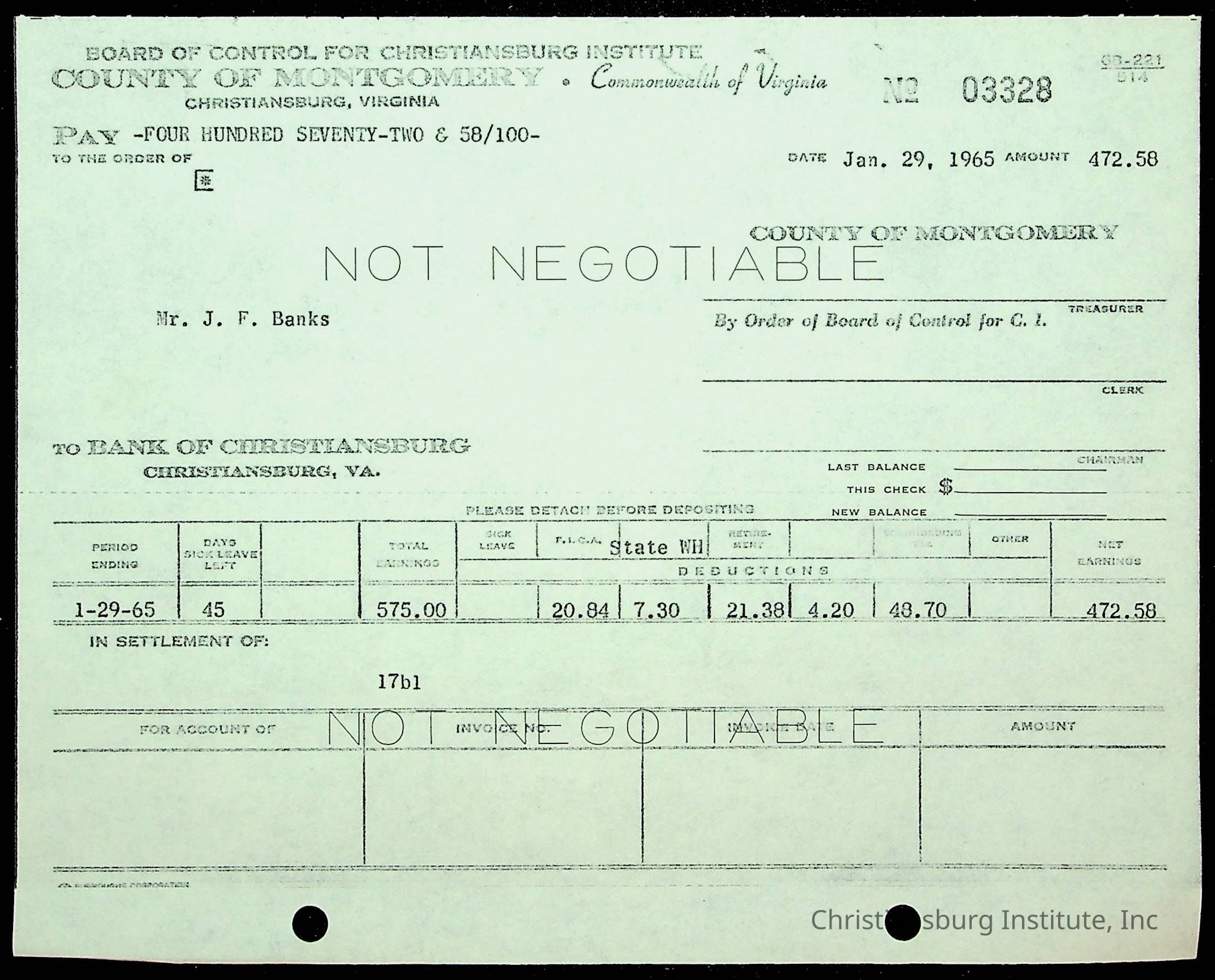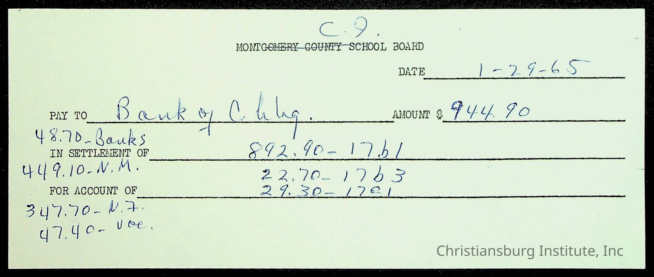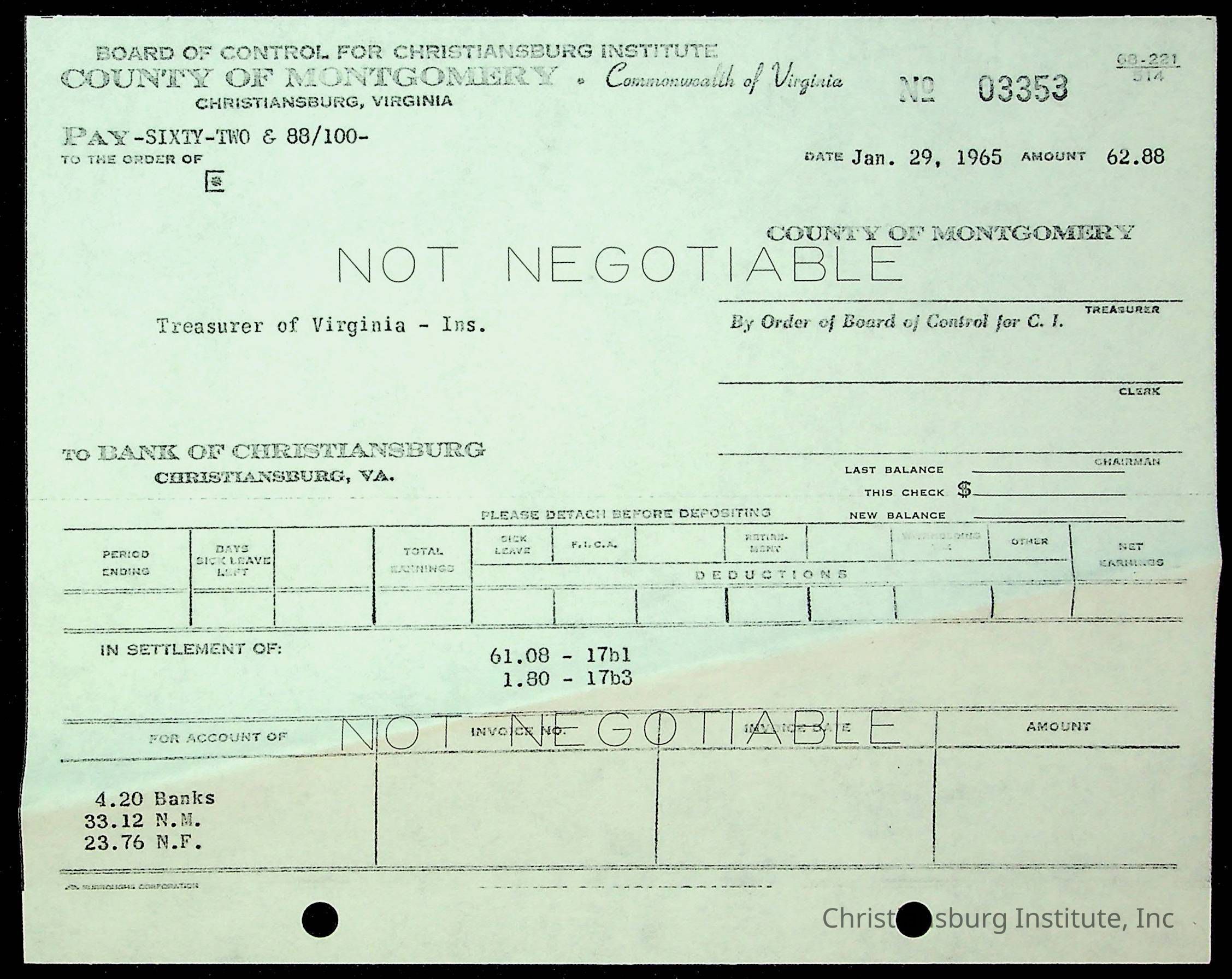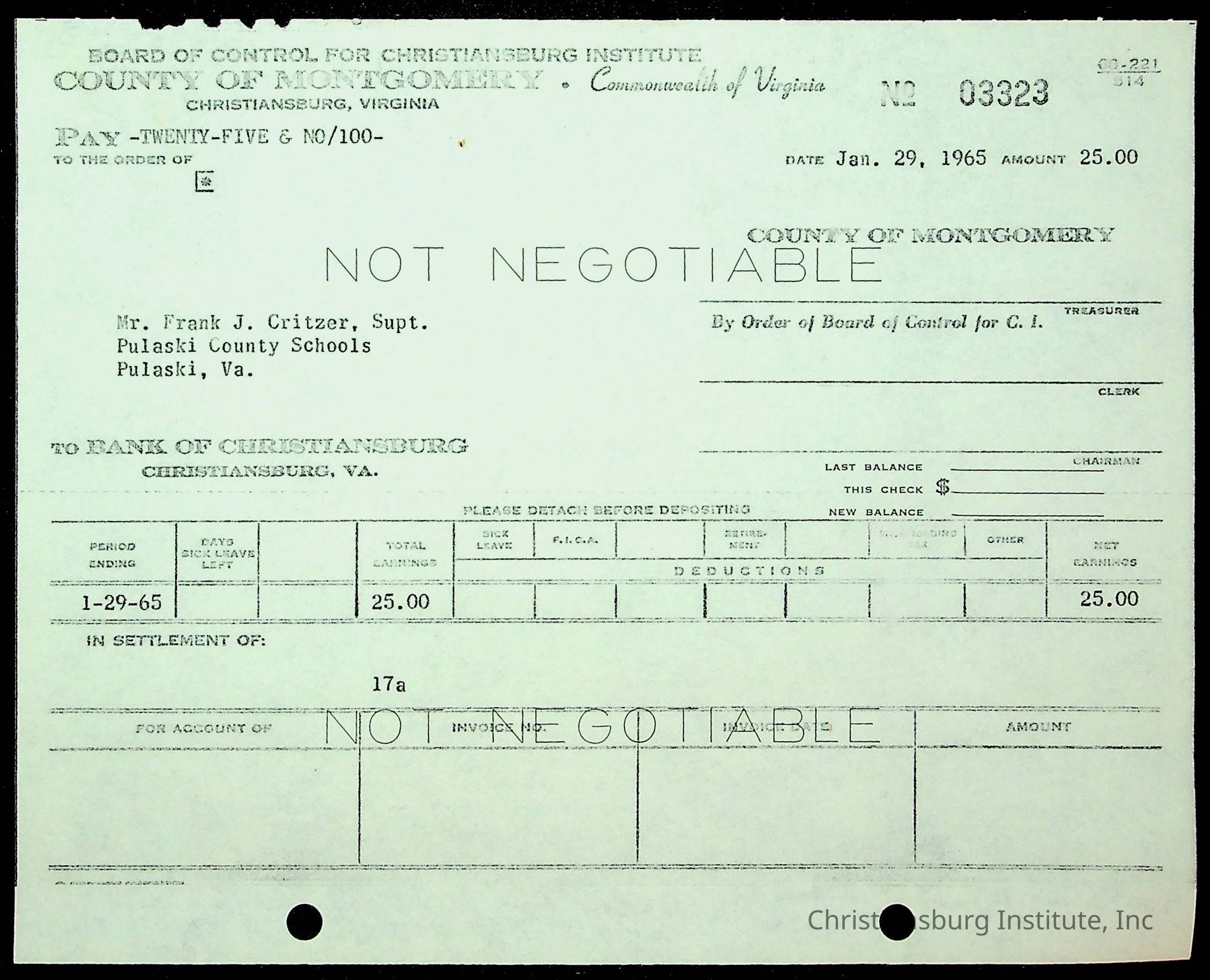 Christiansburg Institute, The Board of Control, Bank of Christiansburg, Montgomery County School Board
