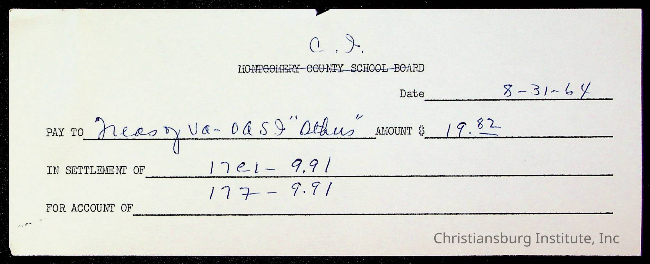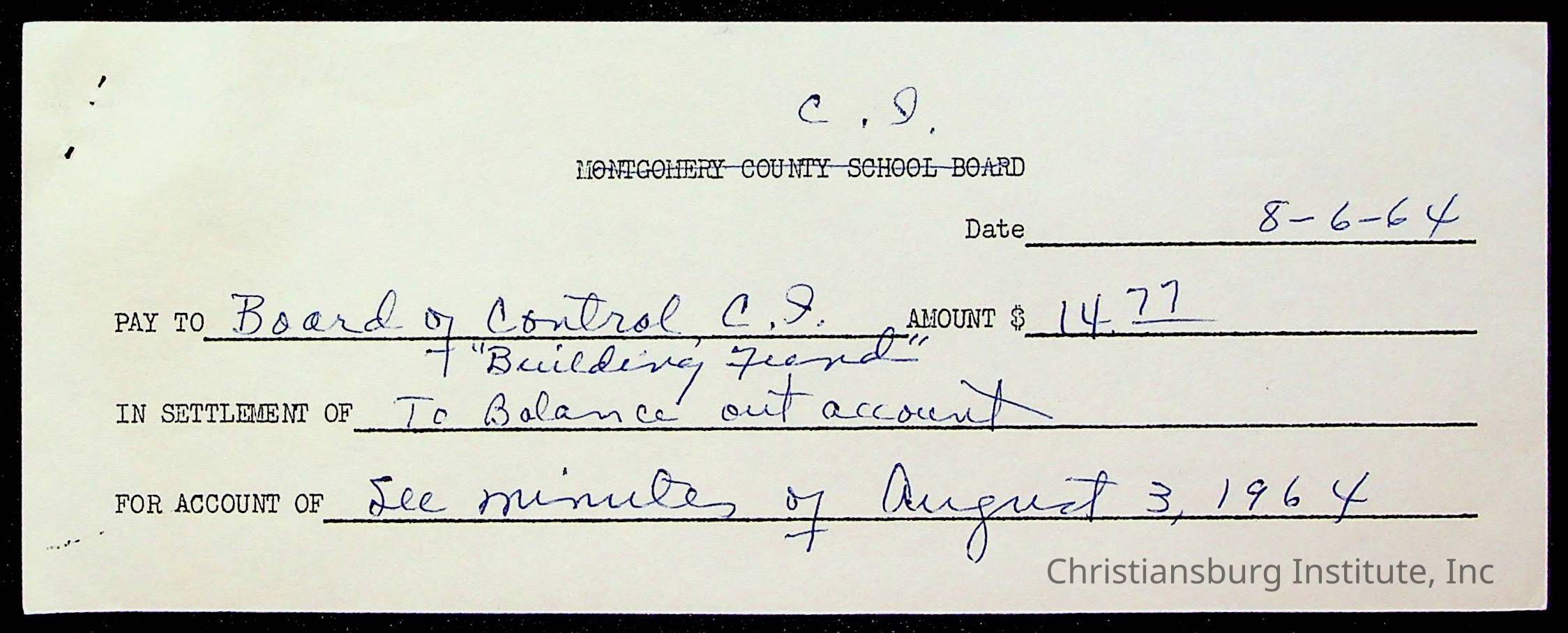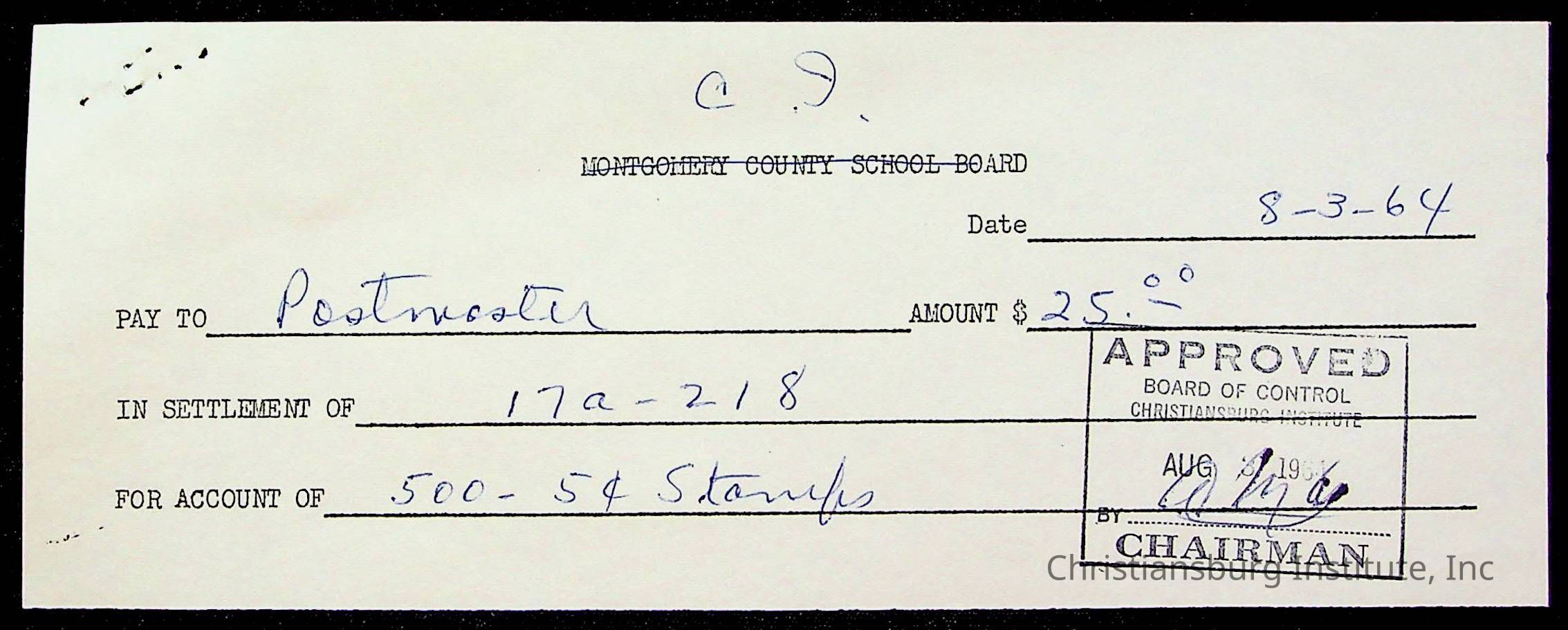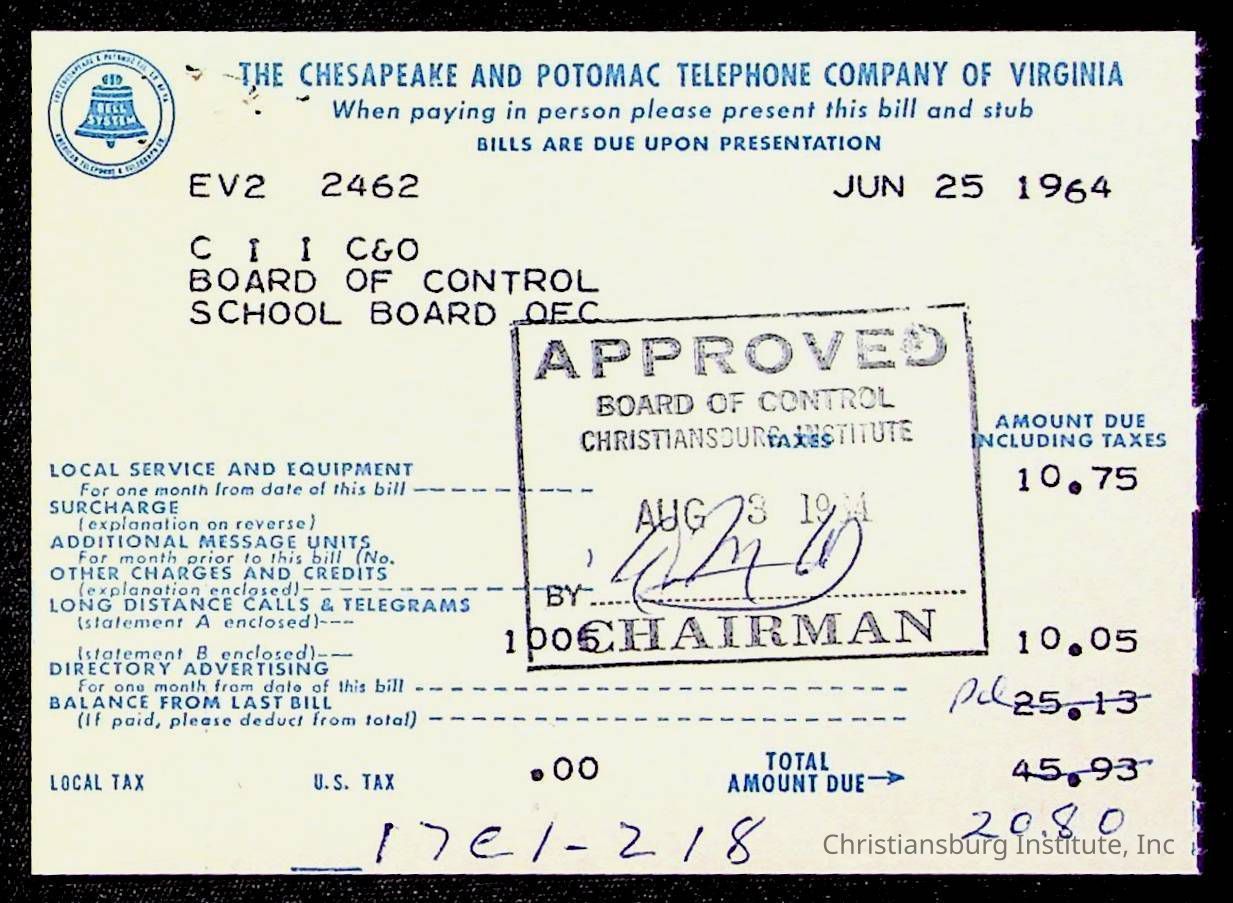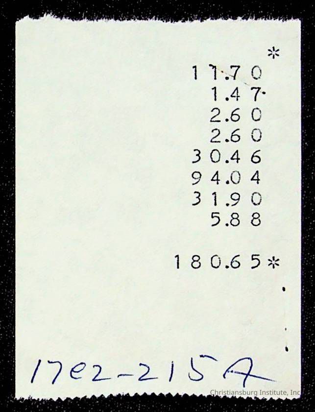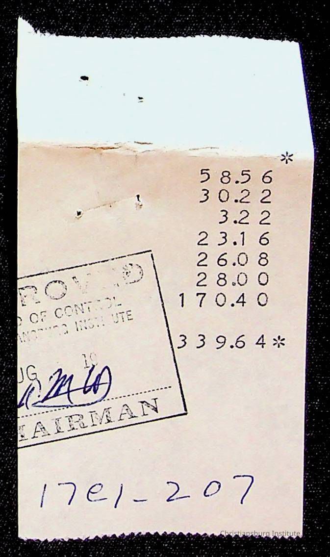 An archive of bills and receipts for the Board of Control of Christiansburg Institute and the Montgomery County School Board, circa 1960s.