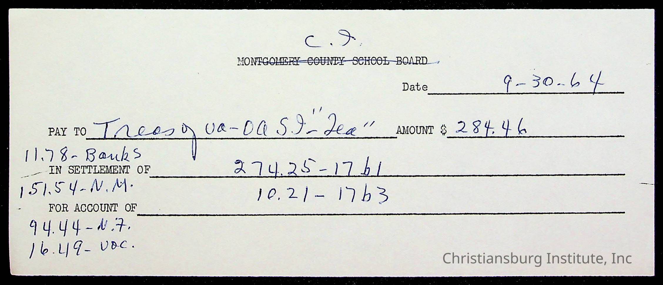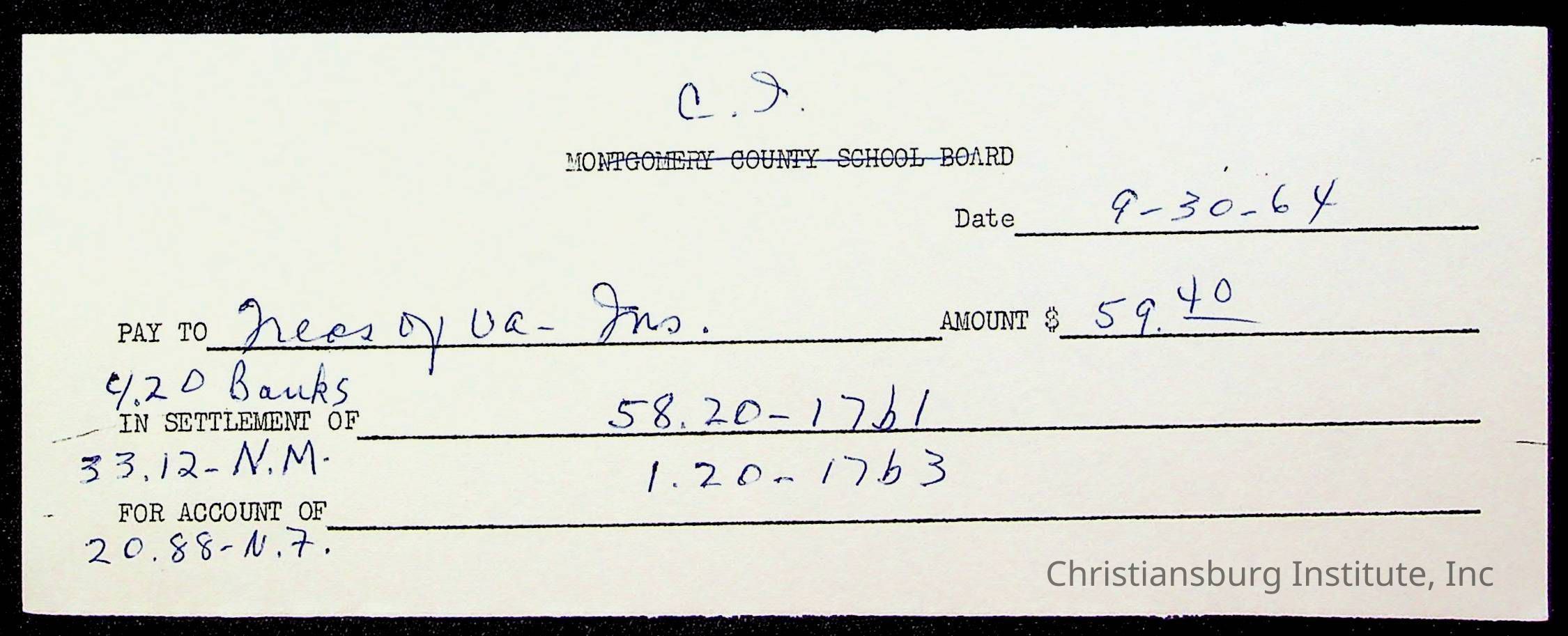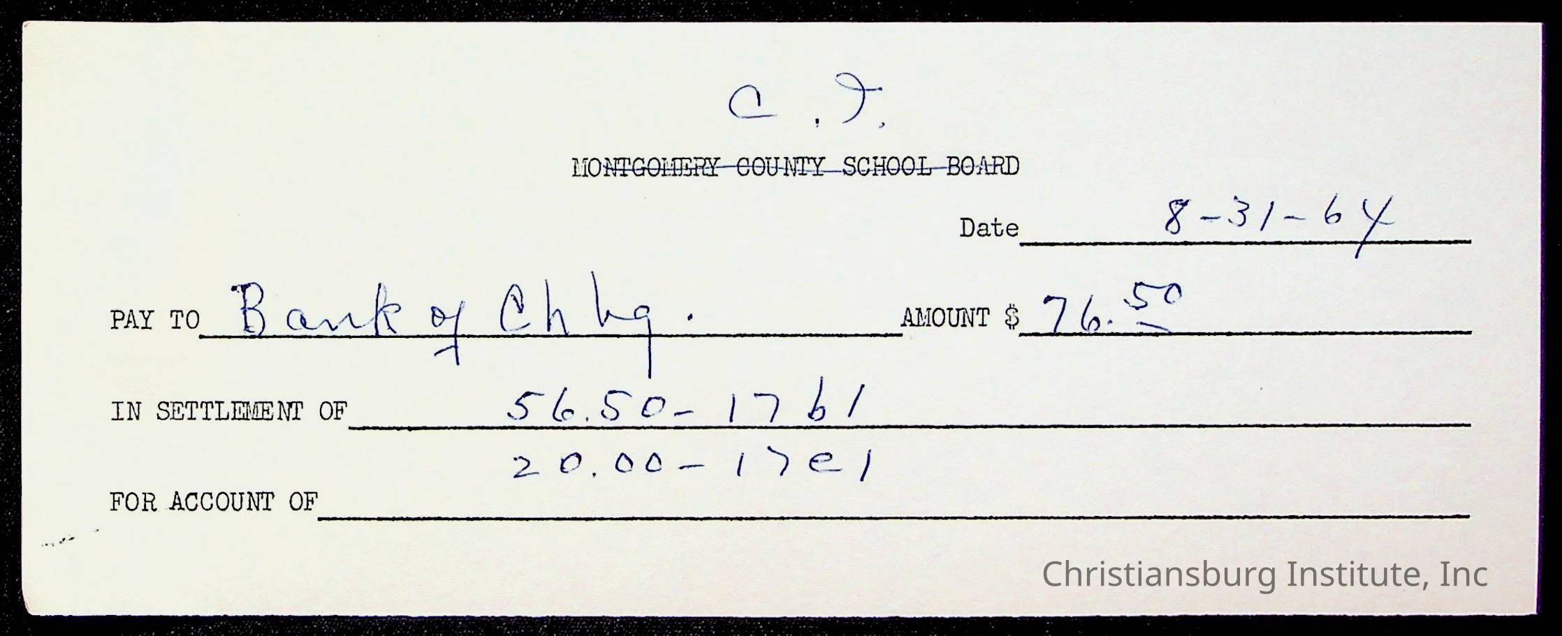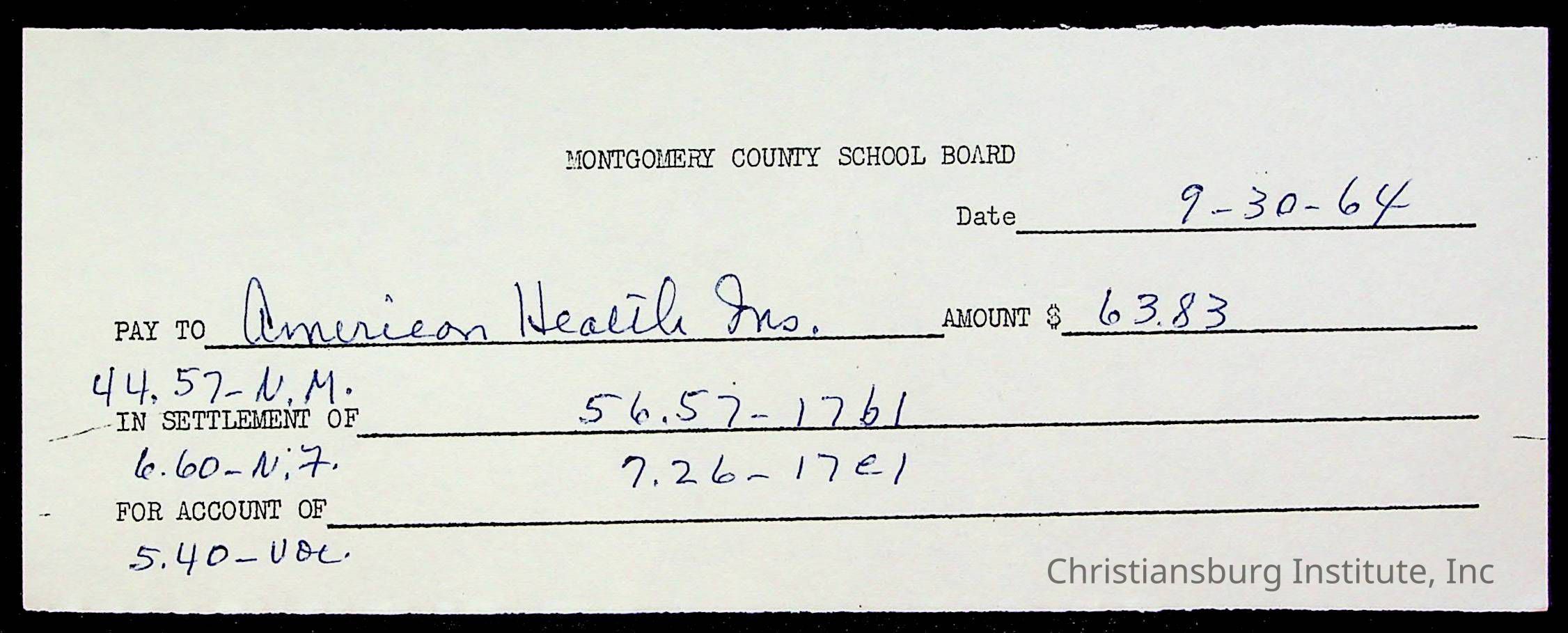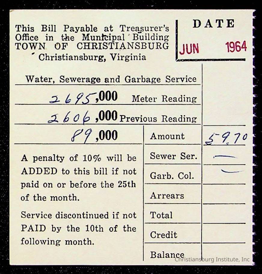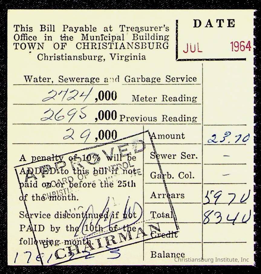 An archive of bills and receipts for the Board of Control of Christiansburg Institute and the Montgomery County School Board, circa 1960s.
