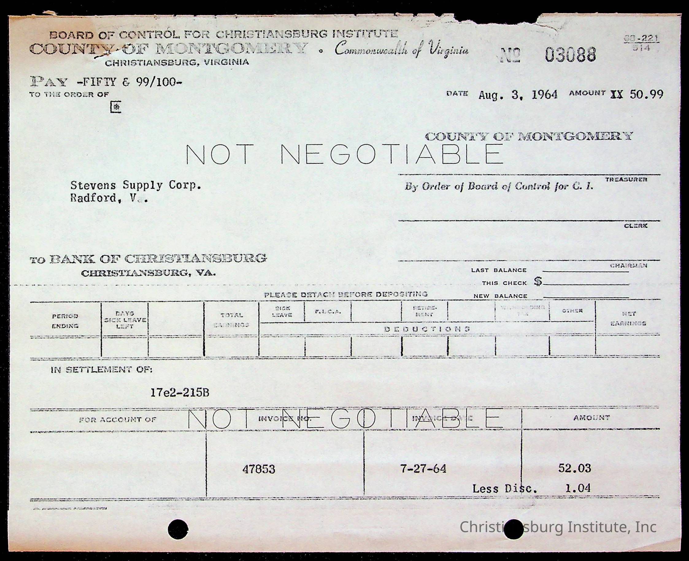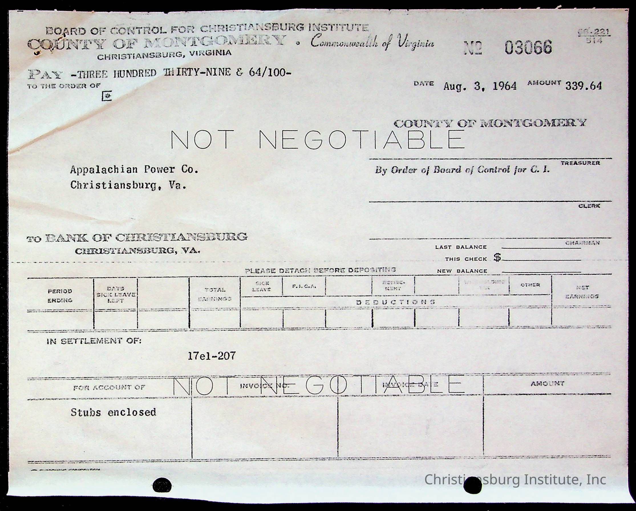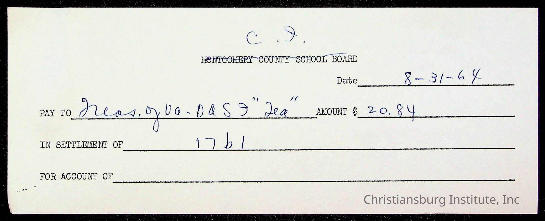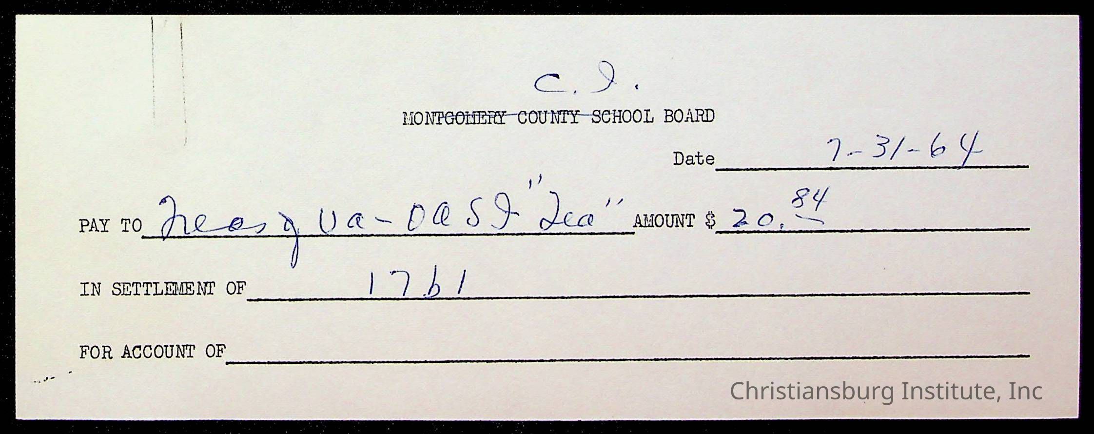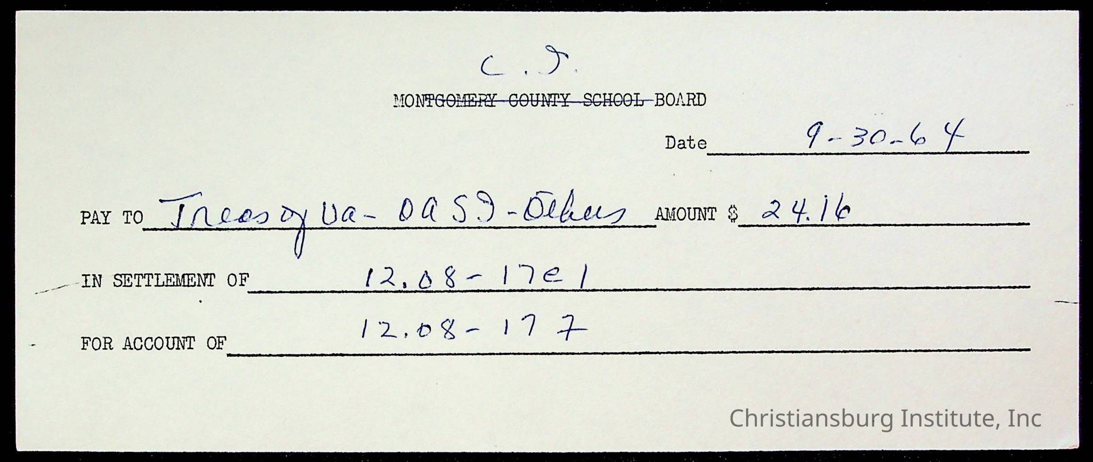An archive of bills and receipts for the Board of Control of Christiansburg Institute and the Montgomery County School Board, circa 1960s.