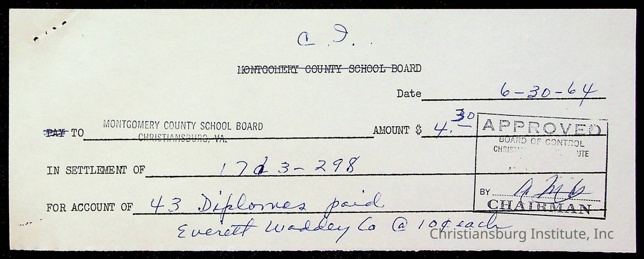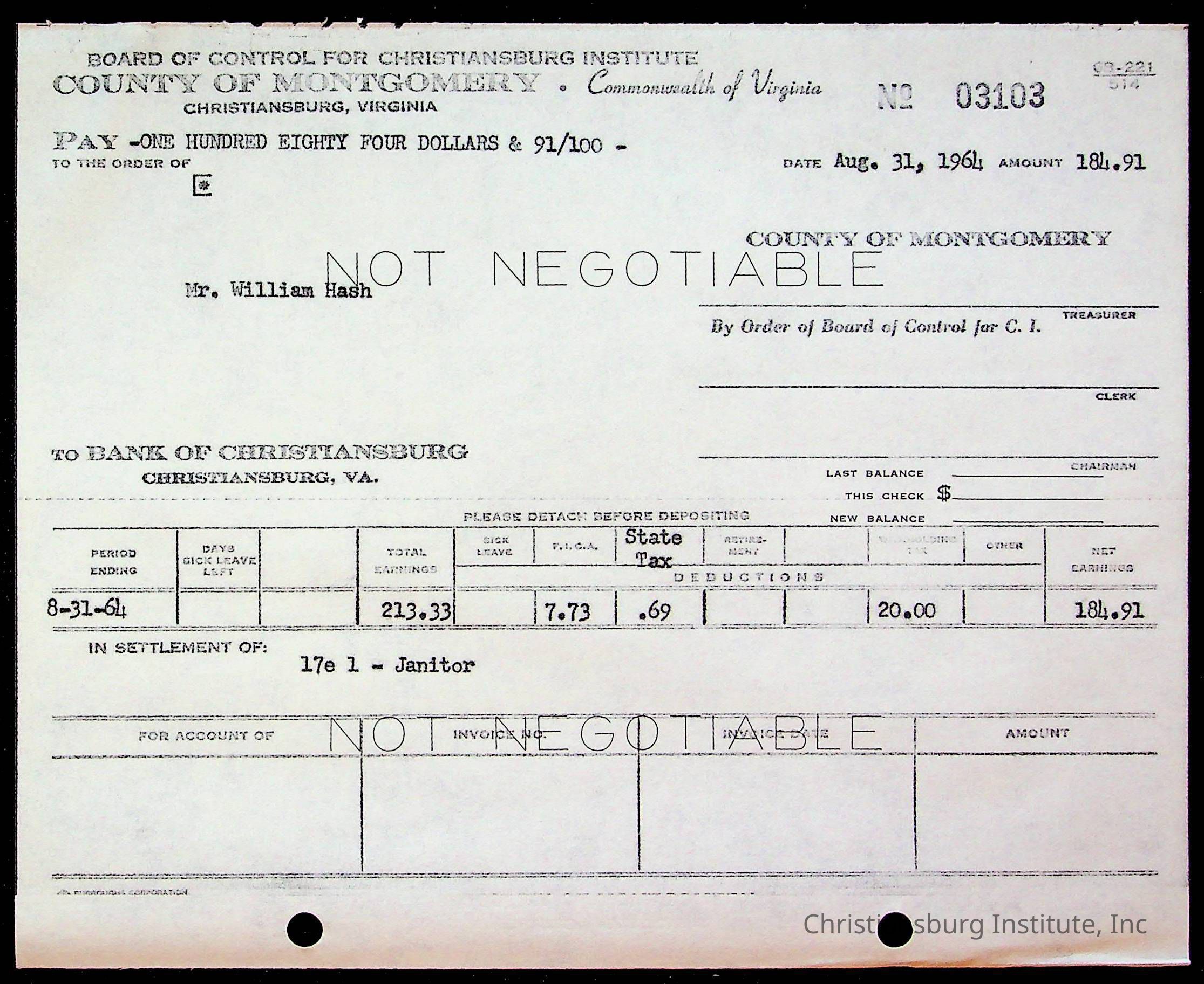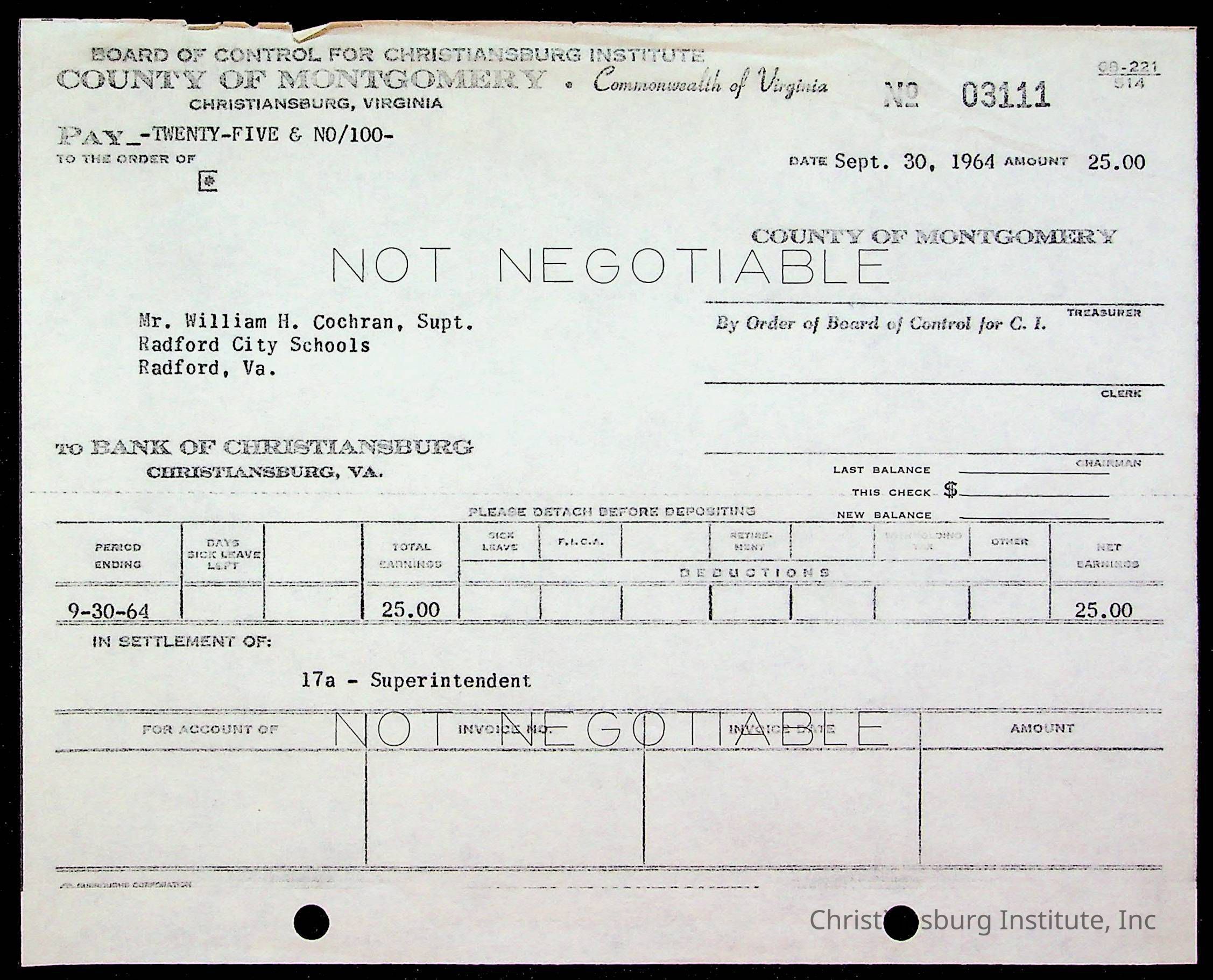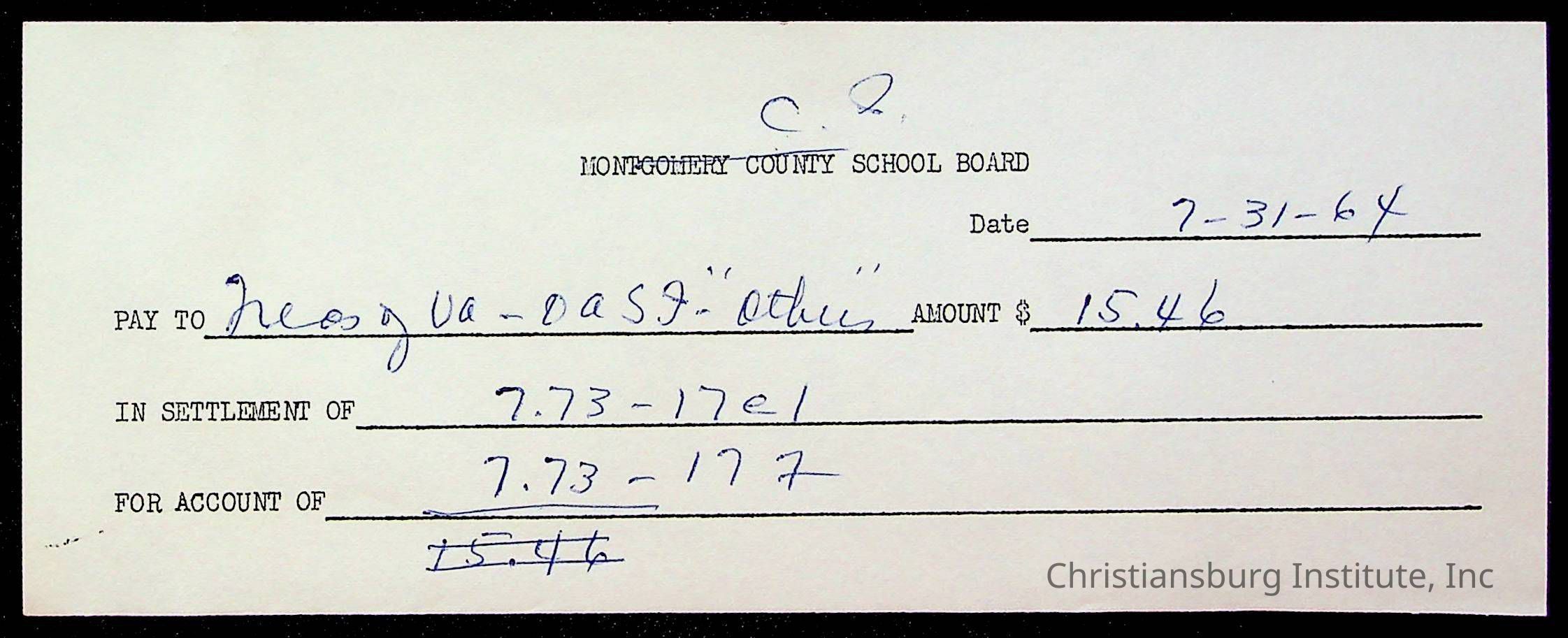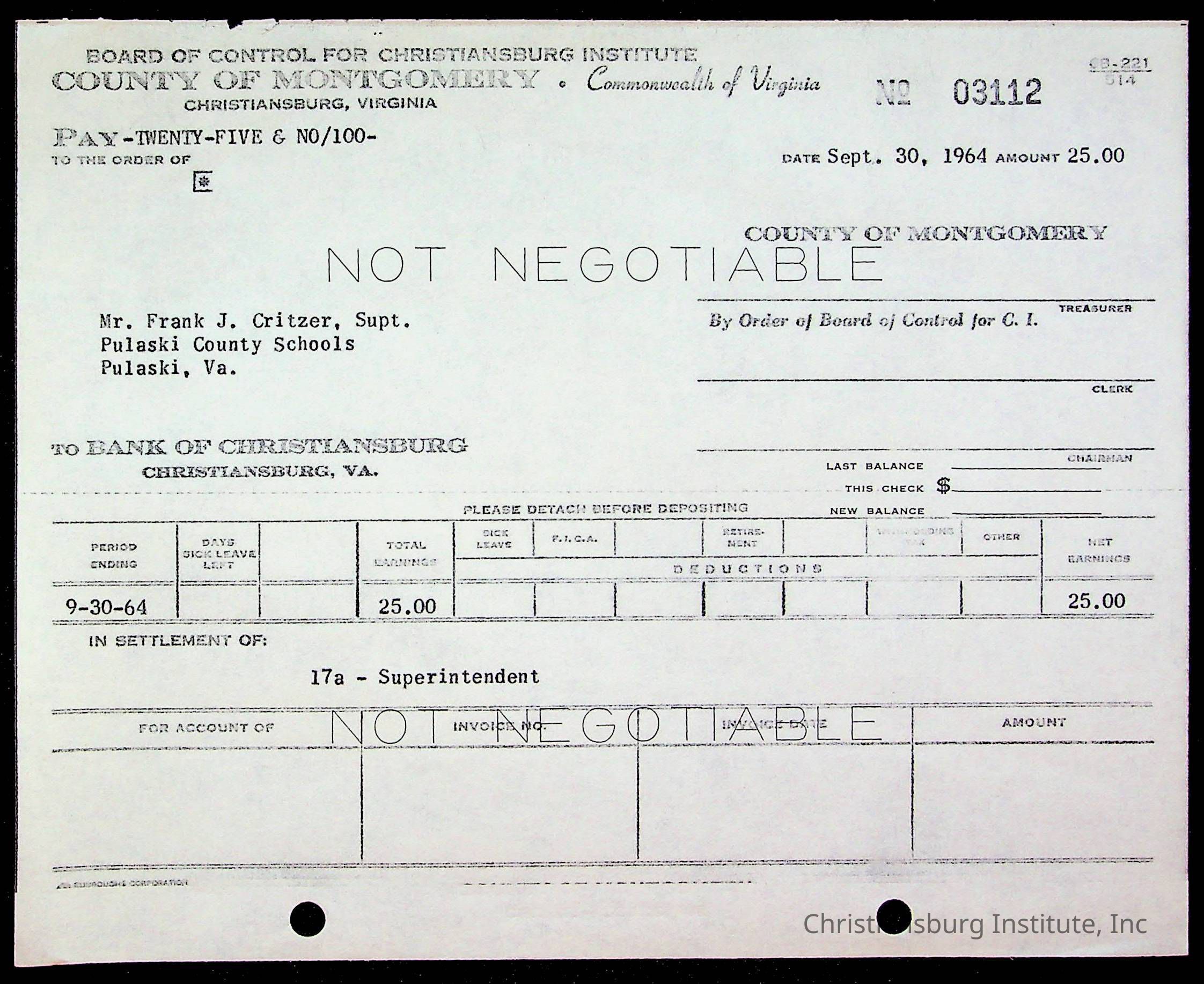 An archive of bills and receipts for the Board of Control of Christiansburg Institute and the Montgomery County School Board, circa 1960s.