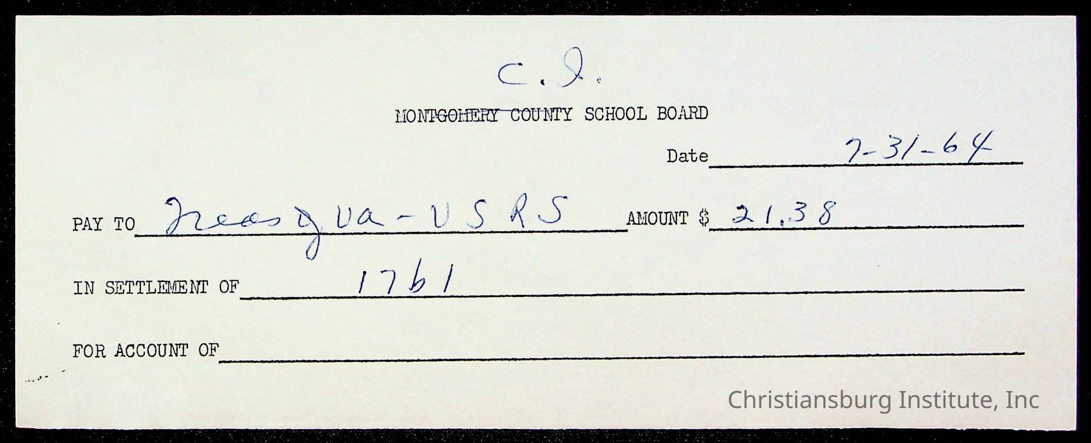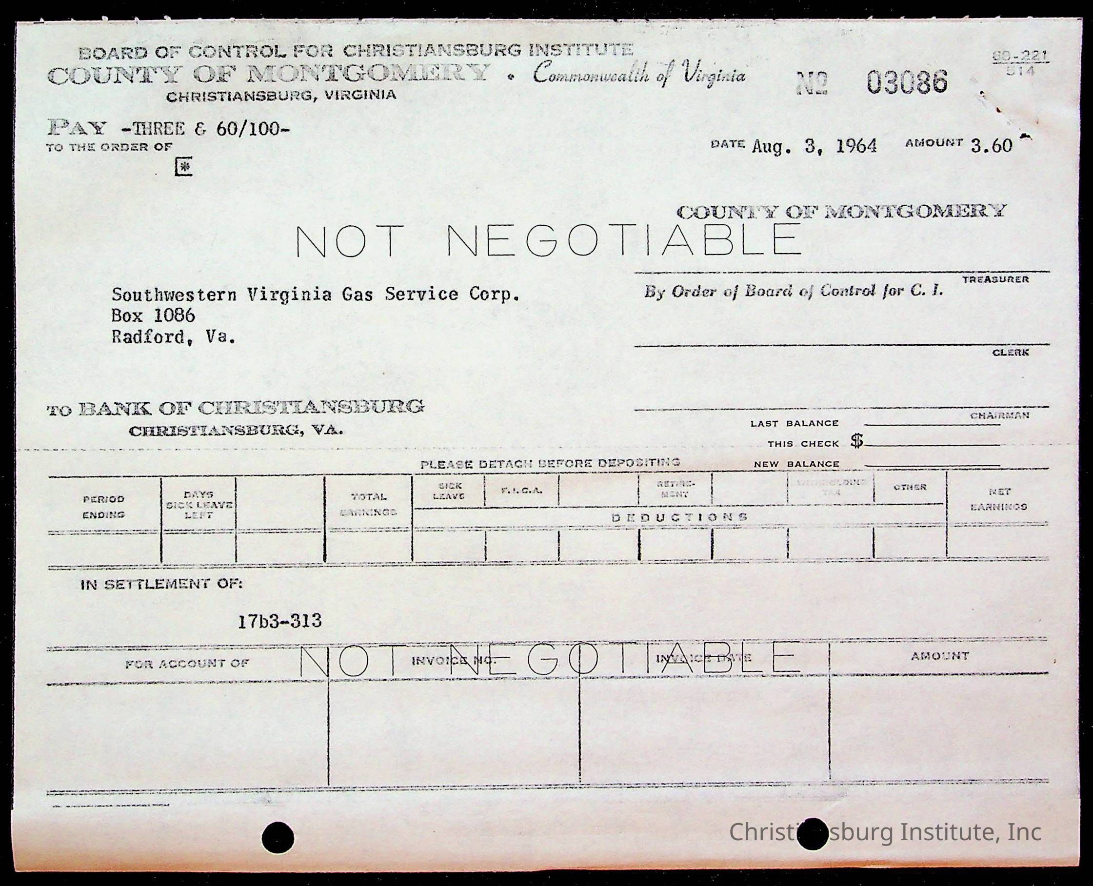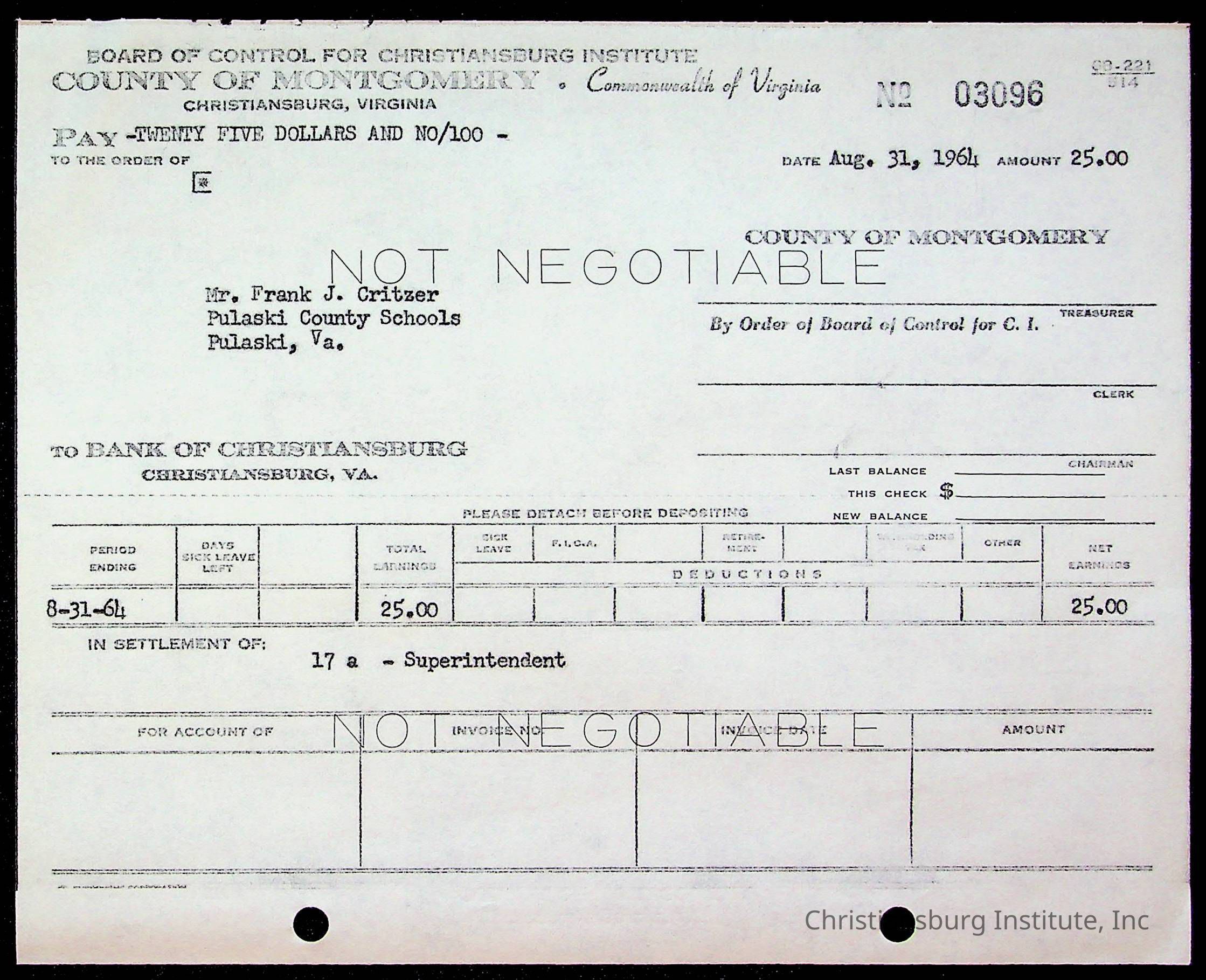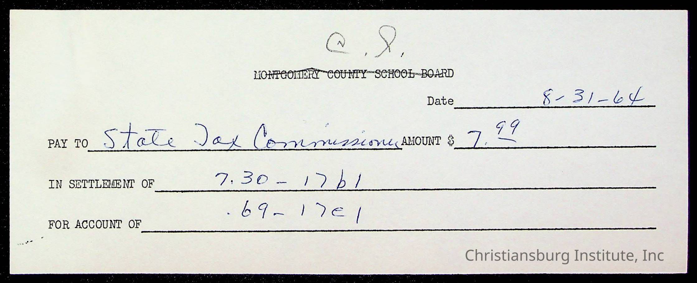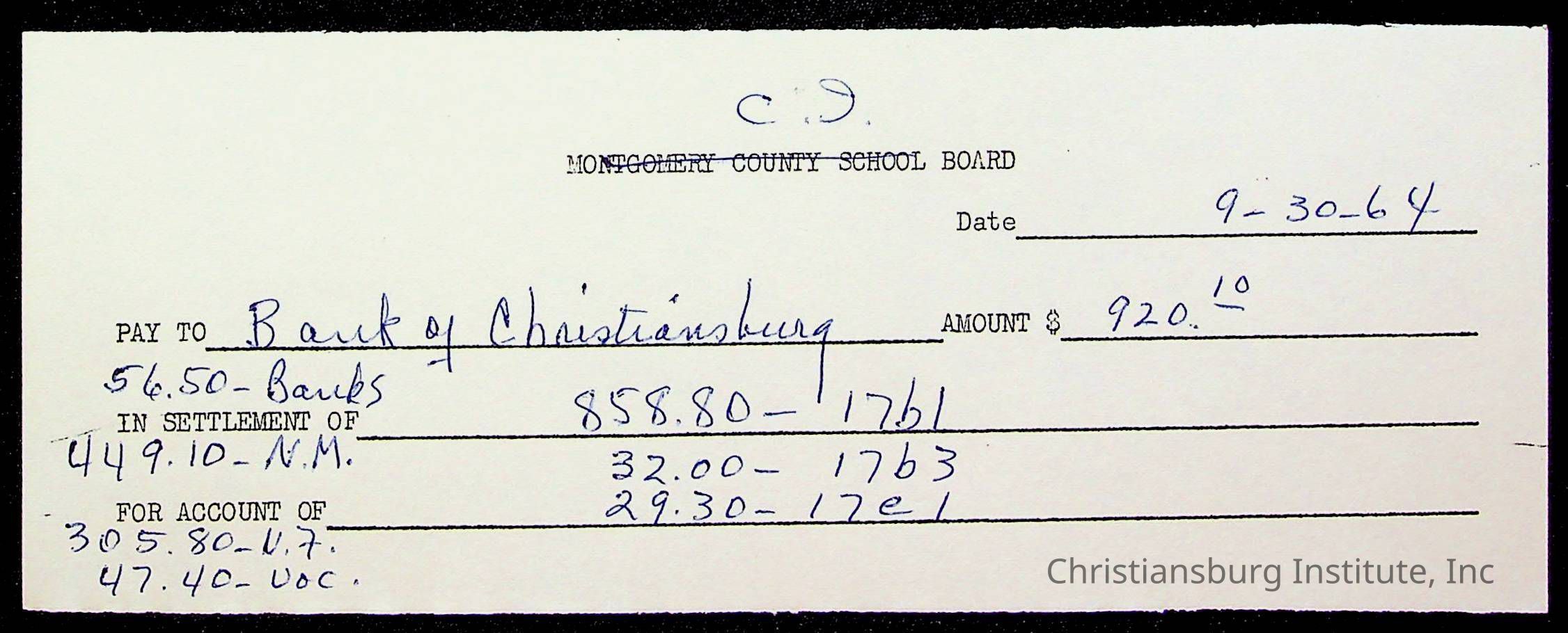 An archive of bills and receipts for the Board of Control of Christiansburg Institute and the Montgomery County School Board, circa 1960s.