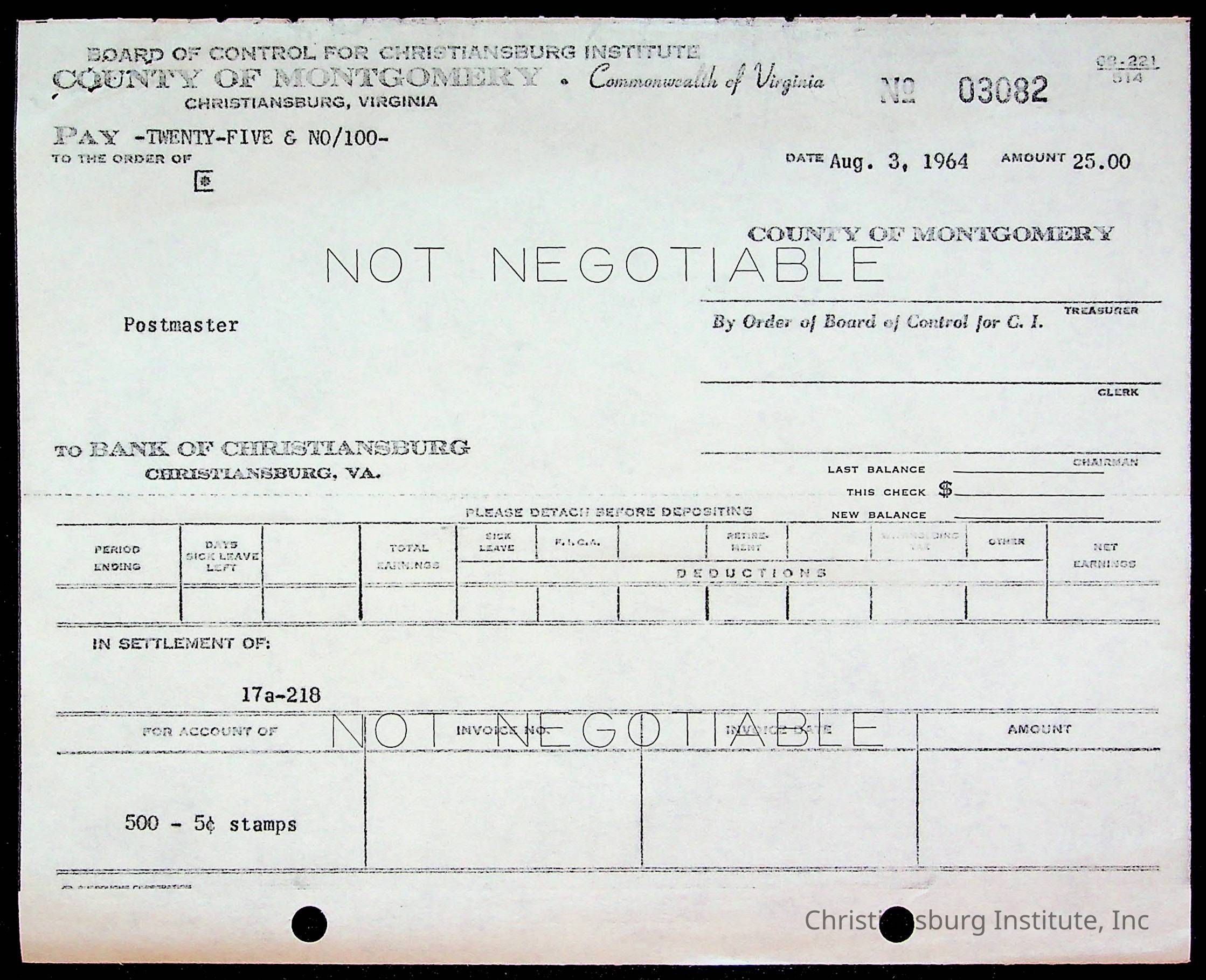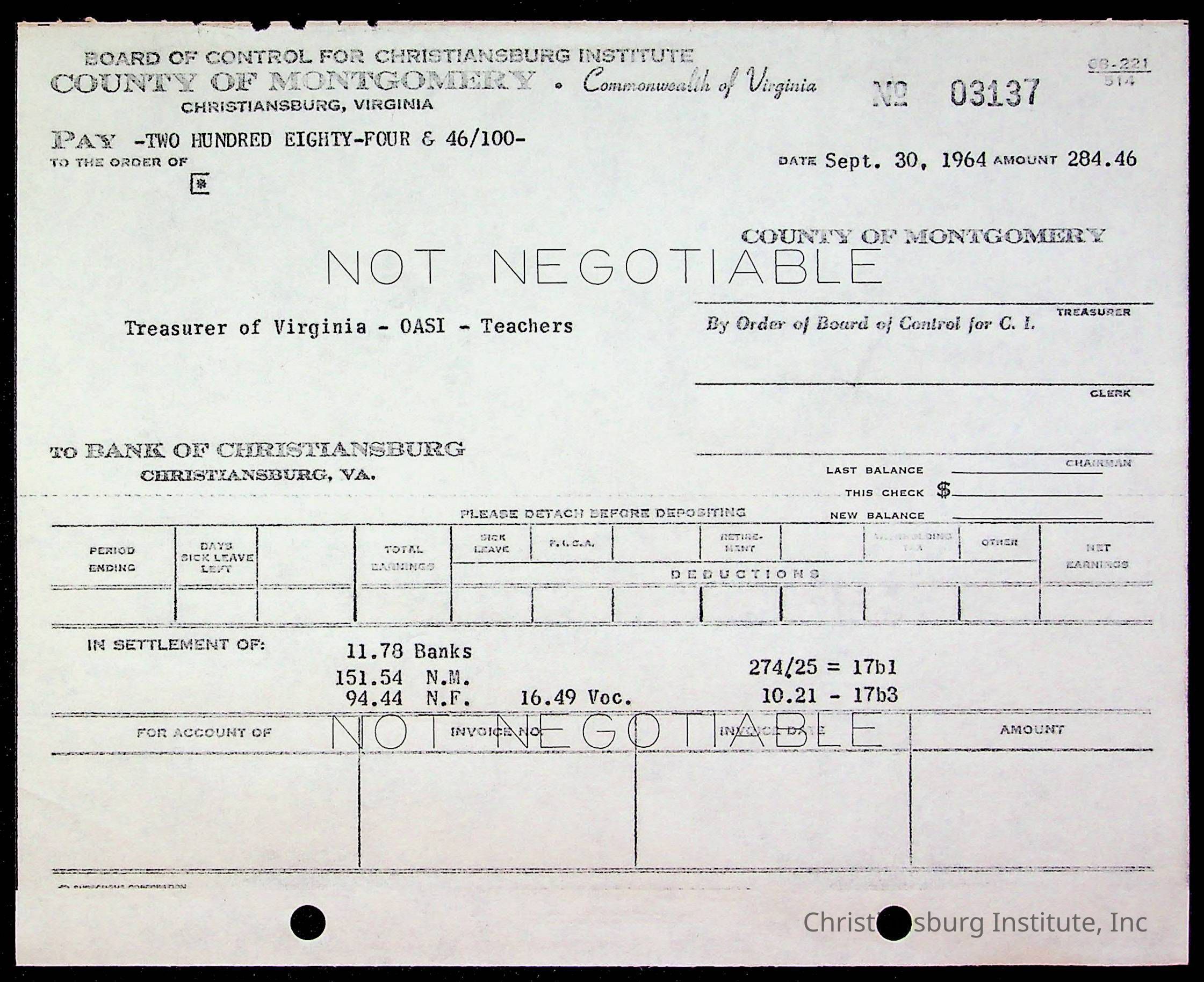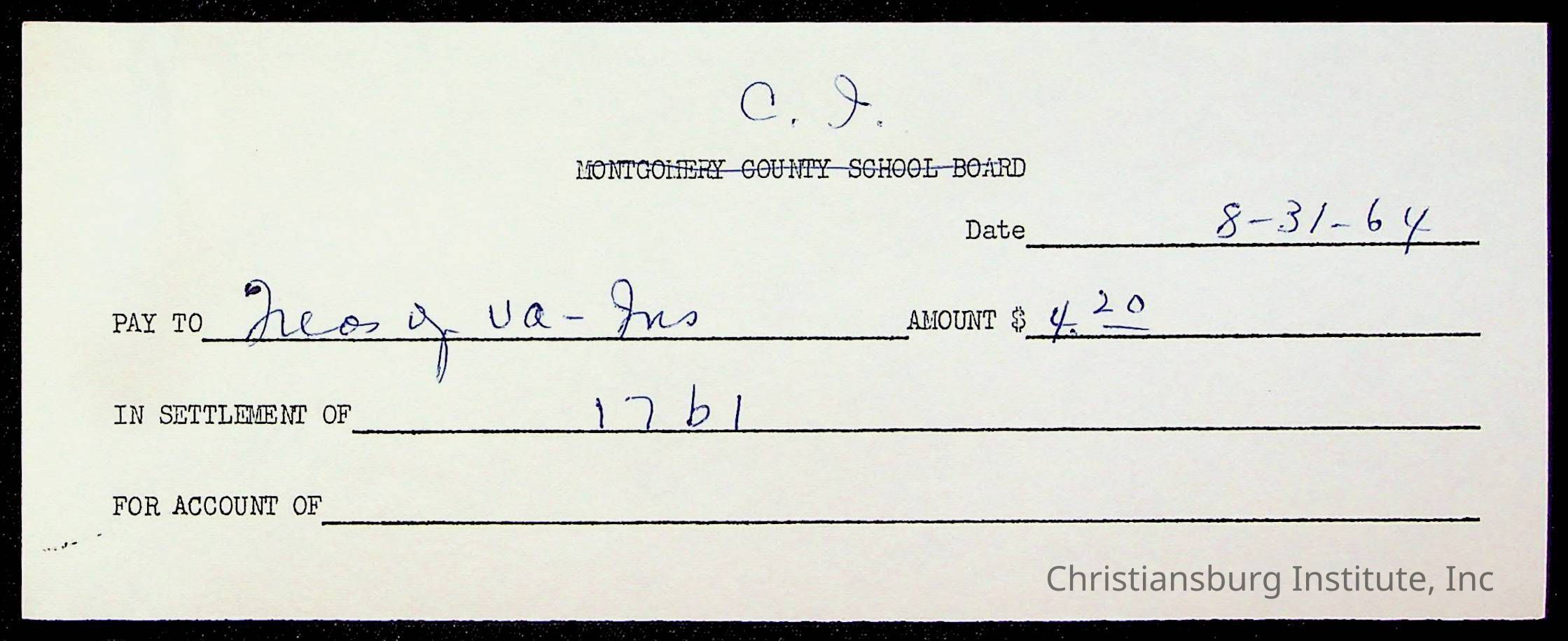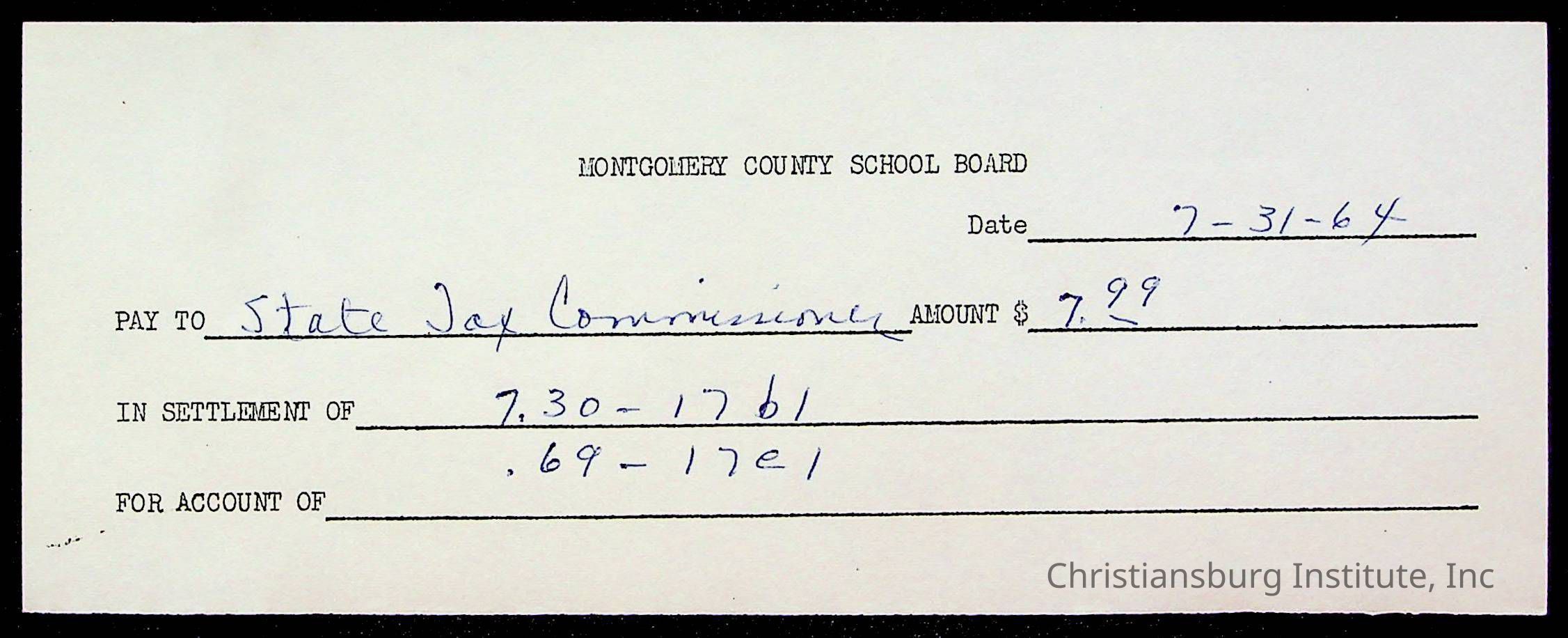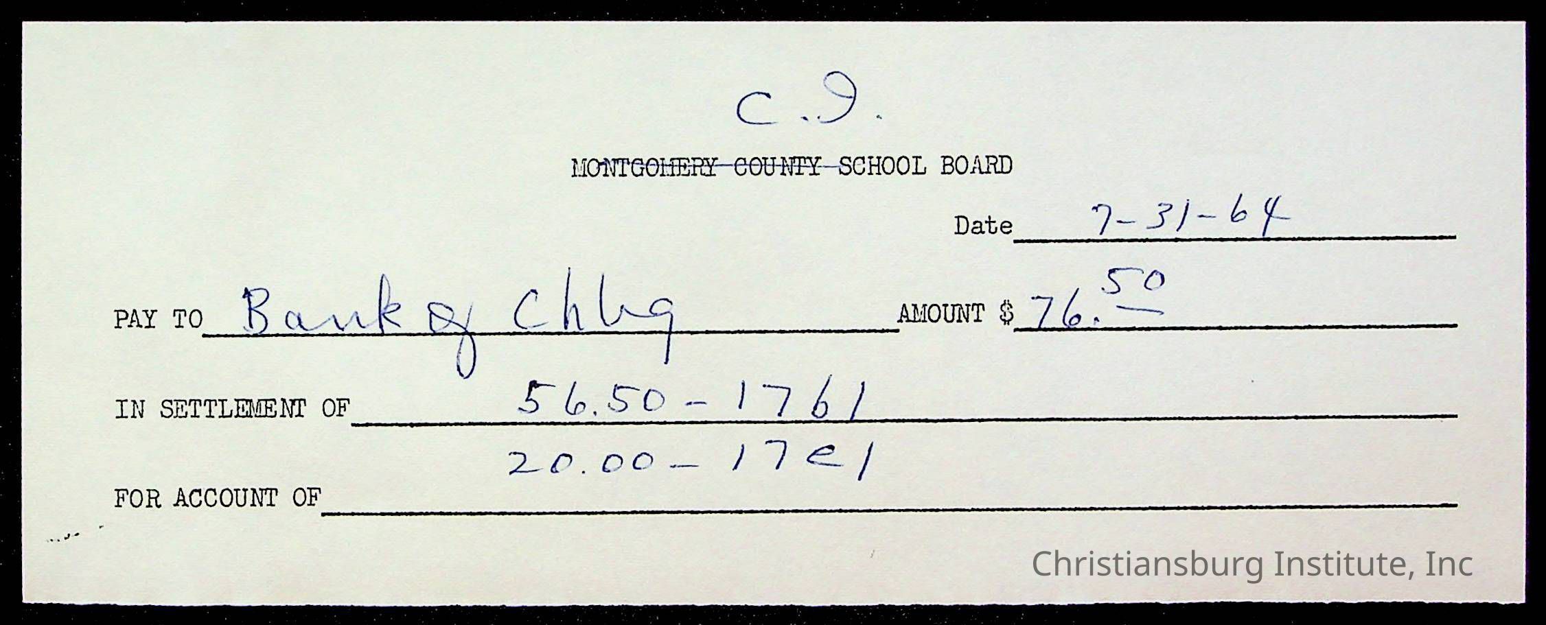 An archive of bills and receipts for the Board of Control of Christiansburg Institute and the Montgomery County School Board, circa 1960s.