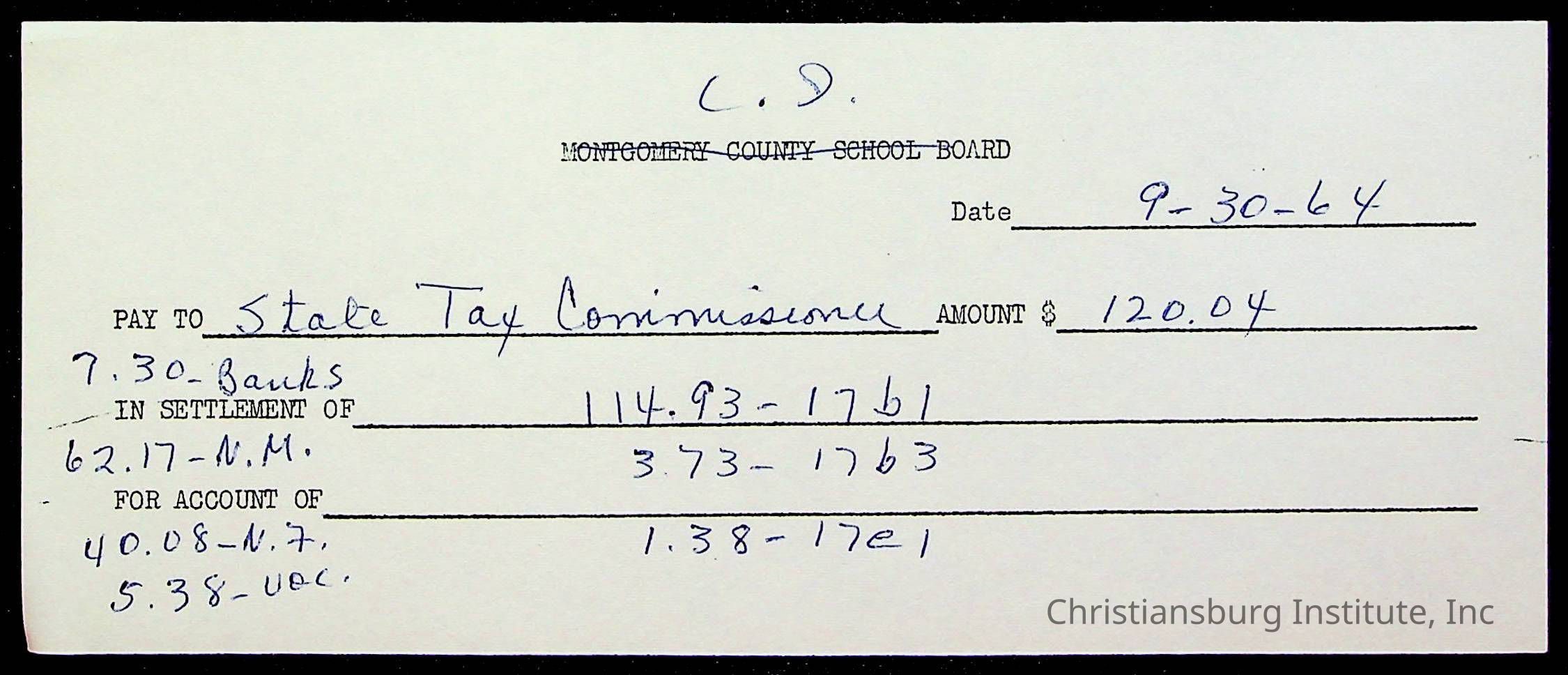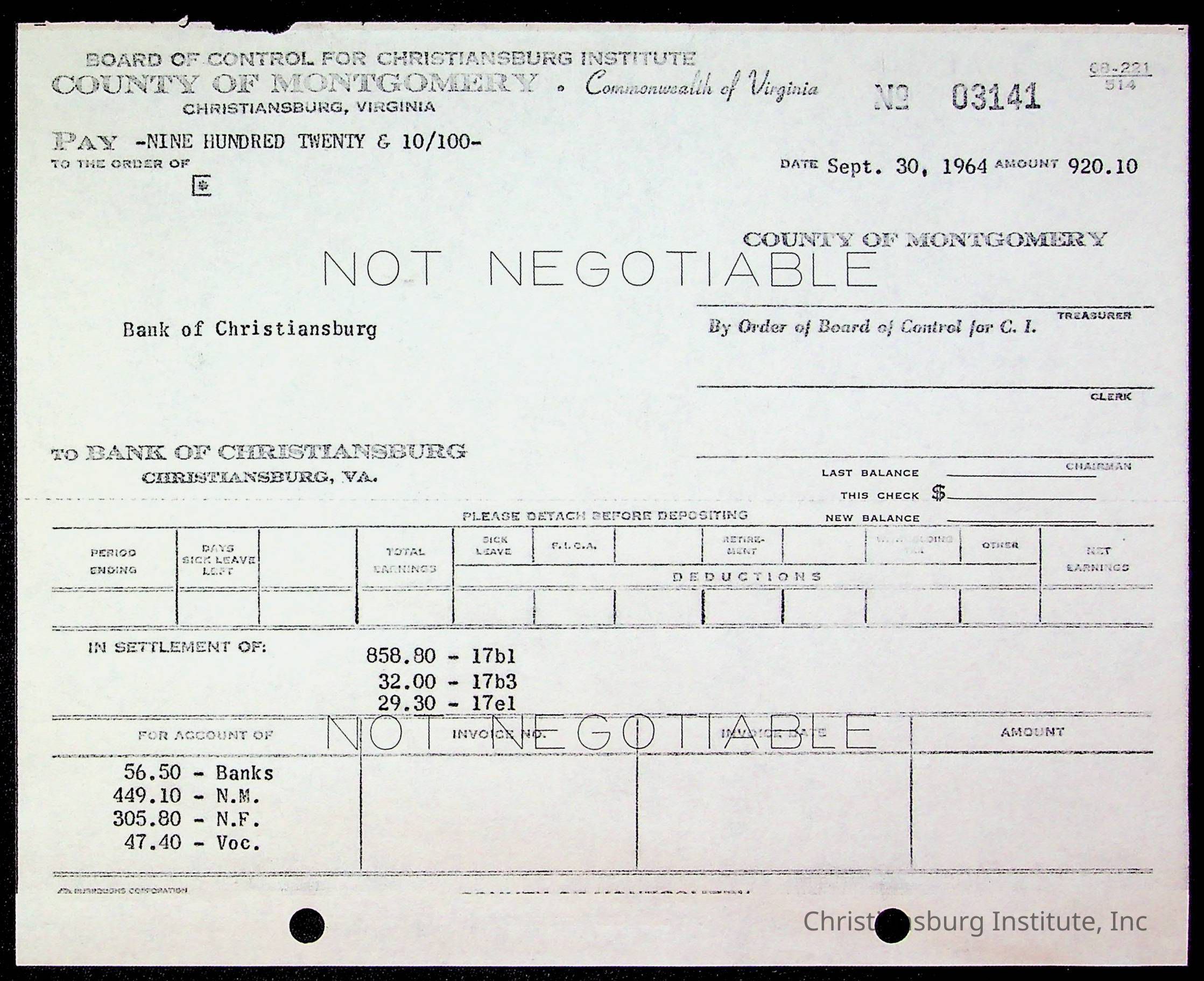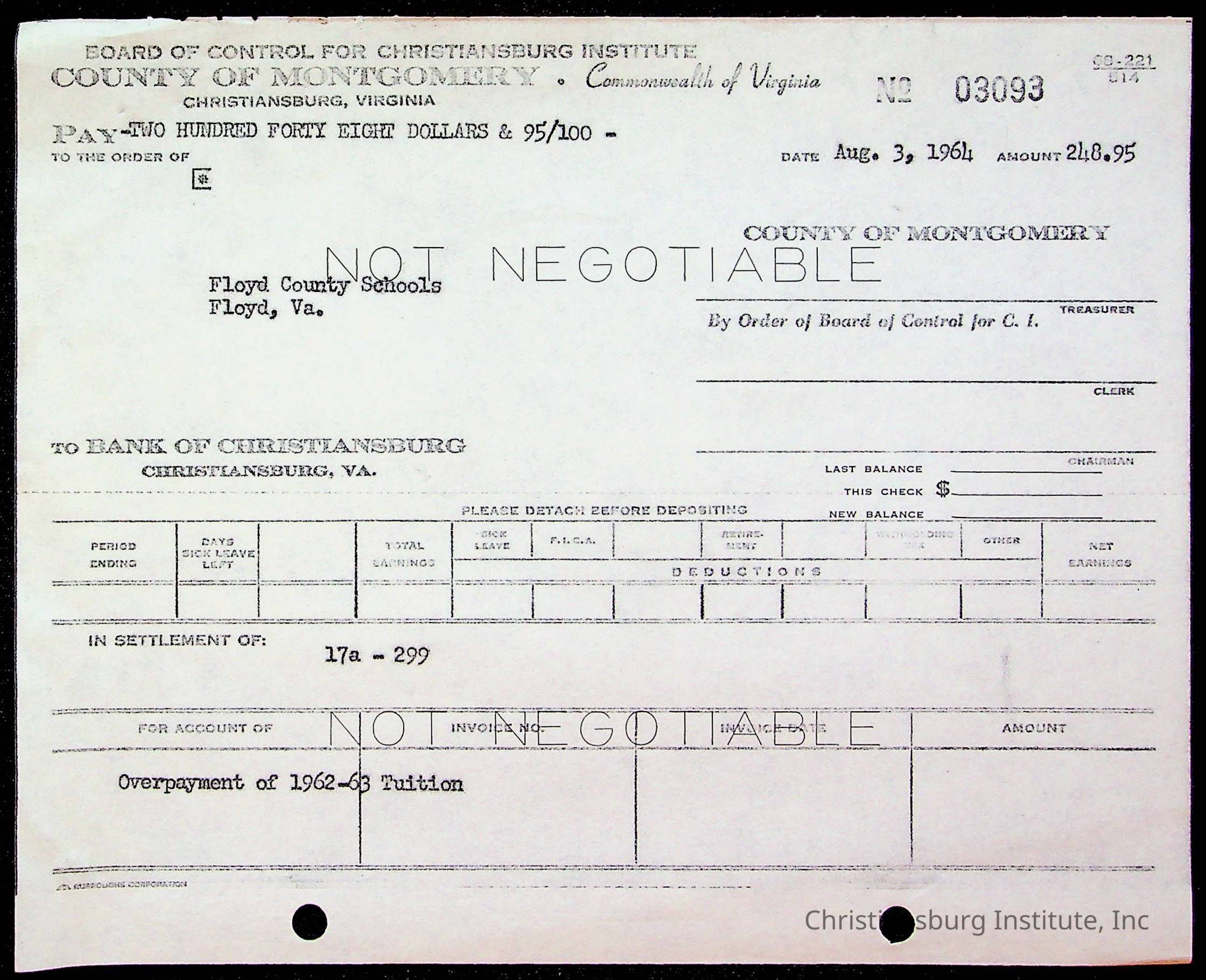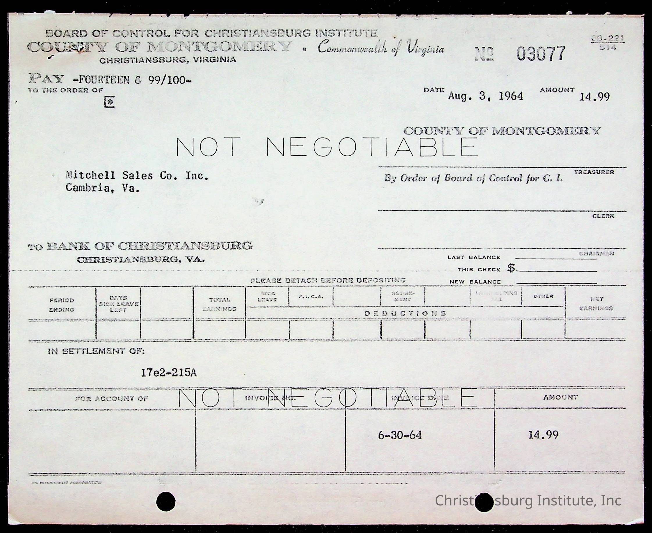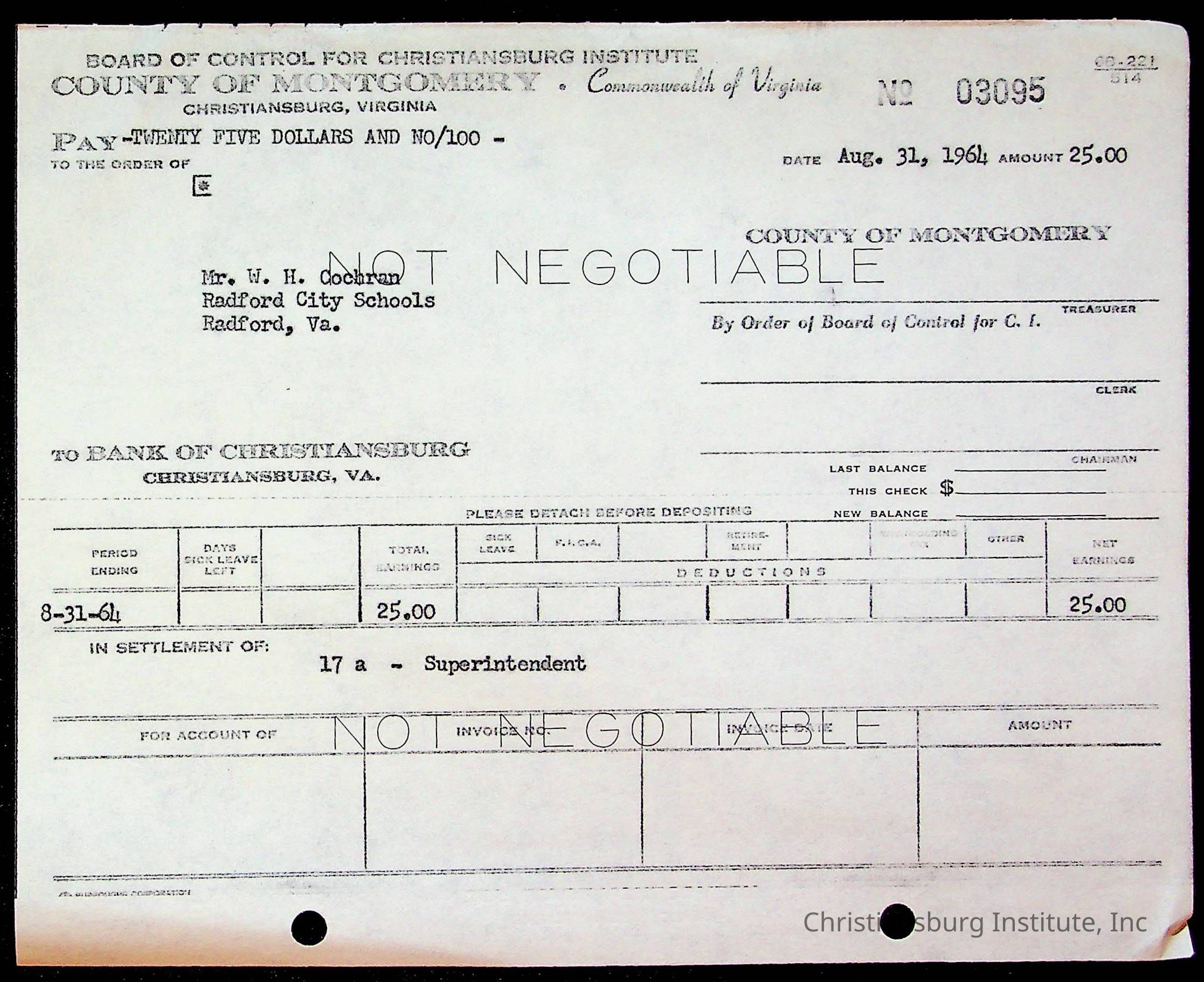 An archive of bills and receipts for the Board of Control of Christiansburg Institute and the Montgomery County School Board, circa 1960s.